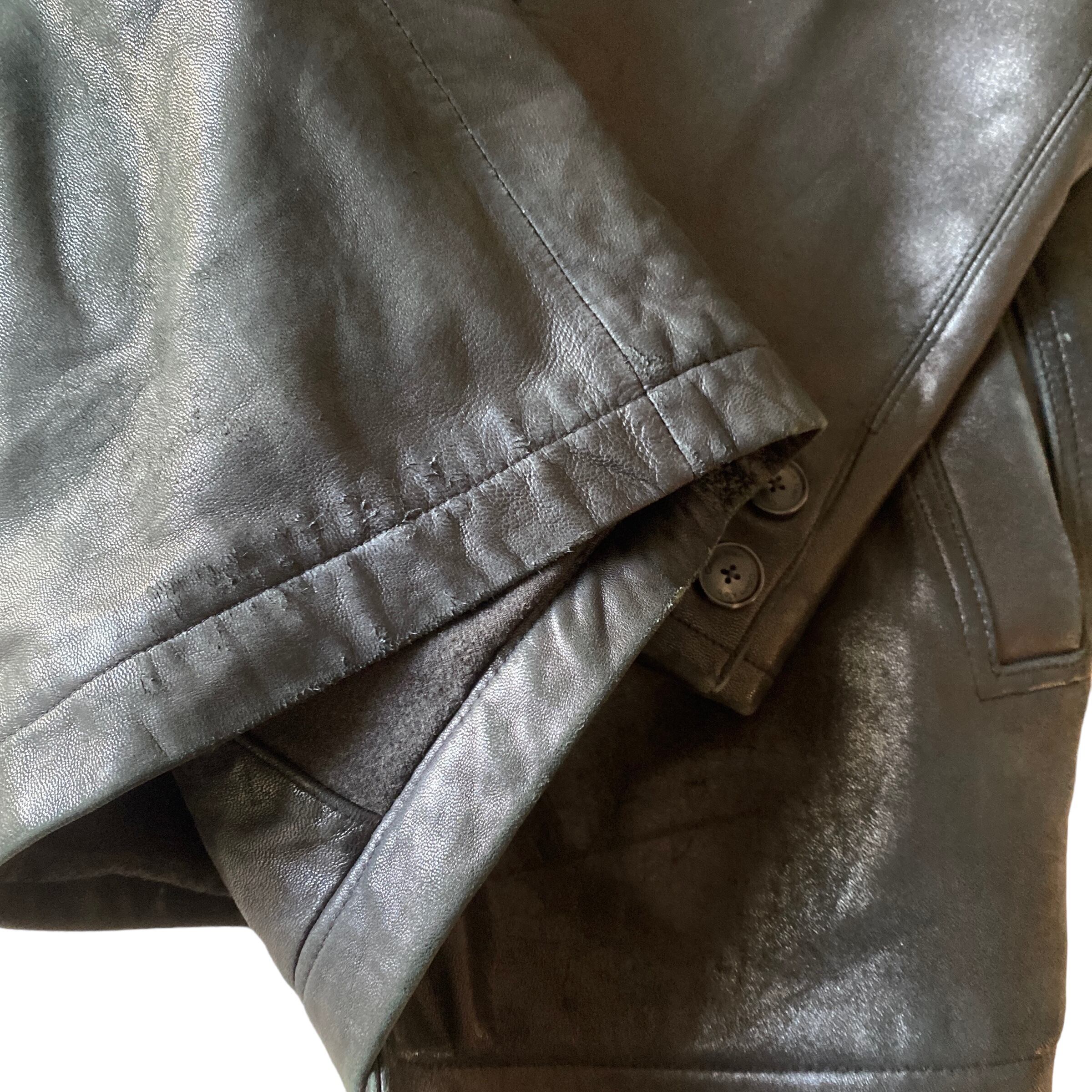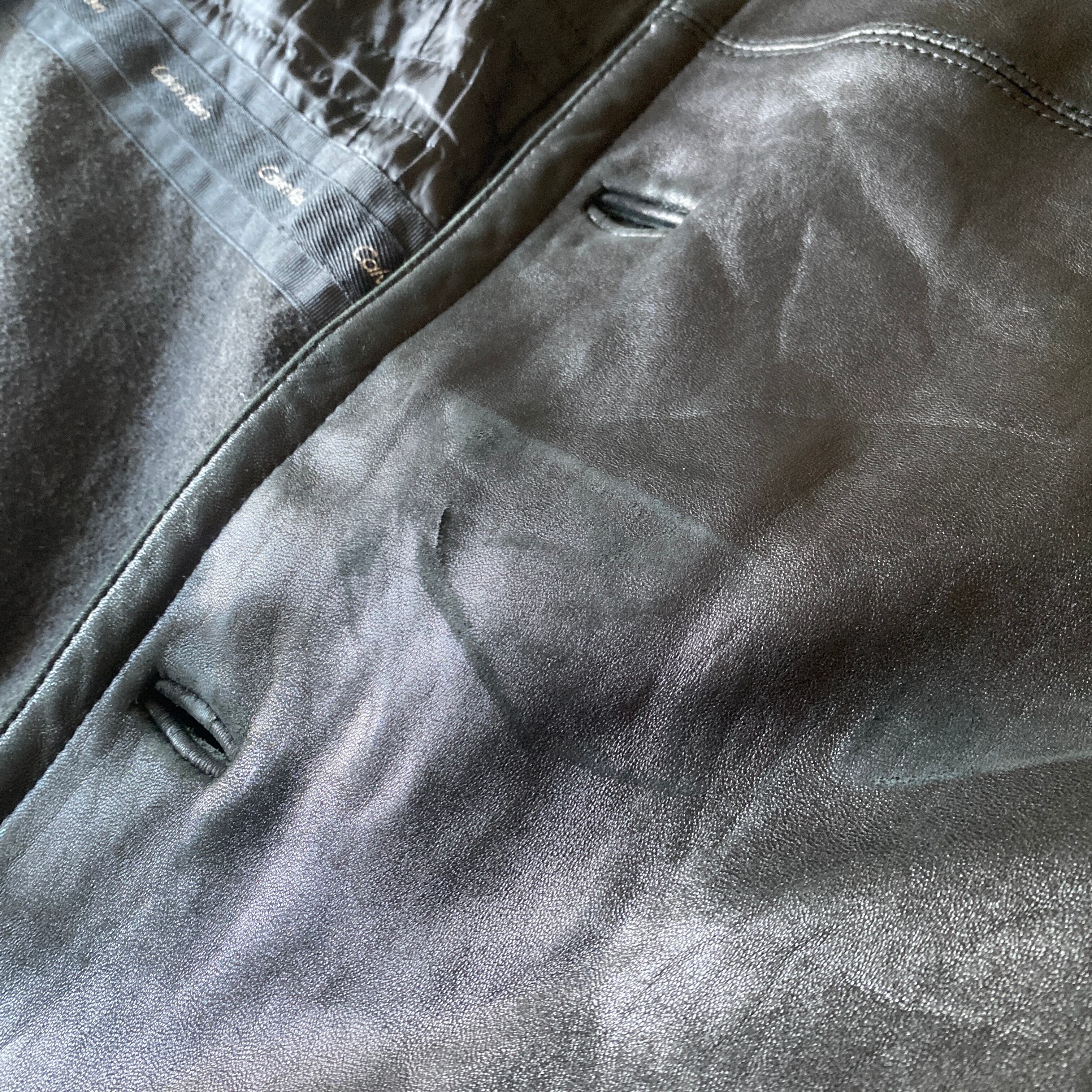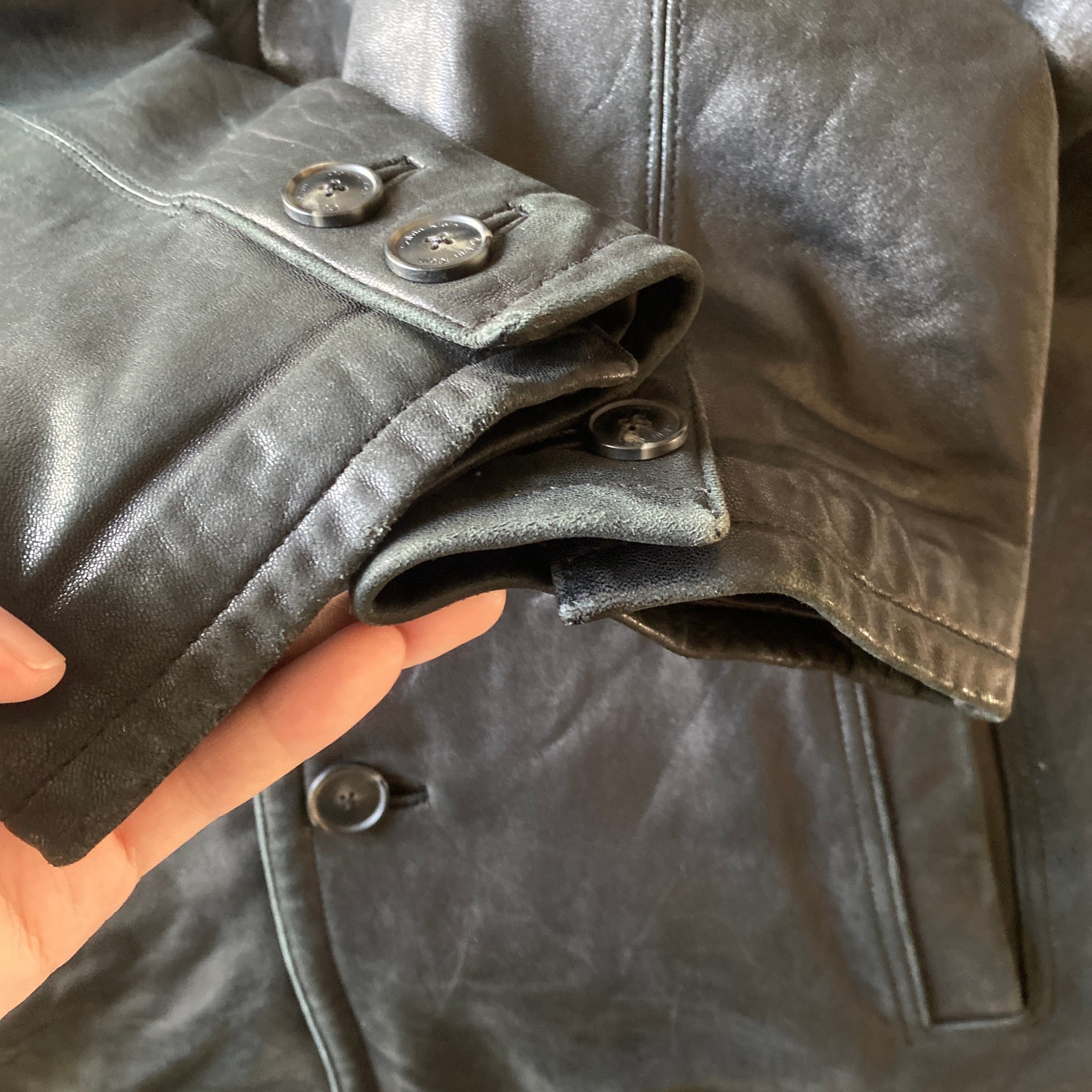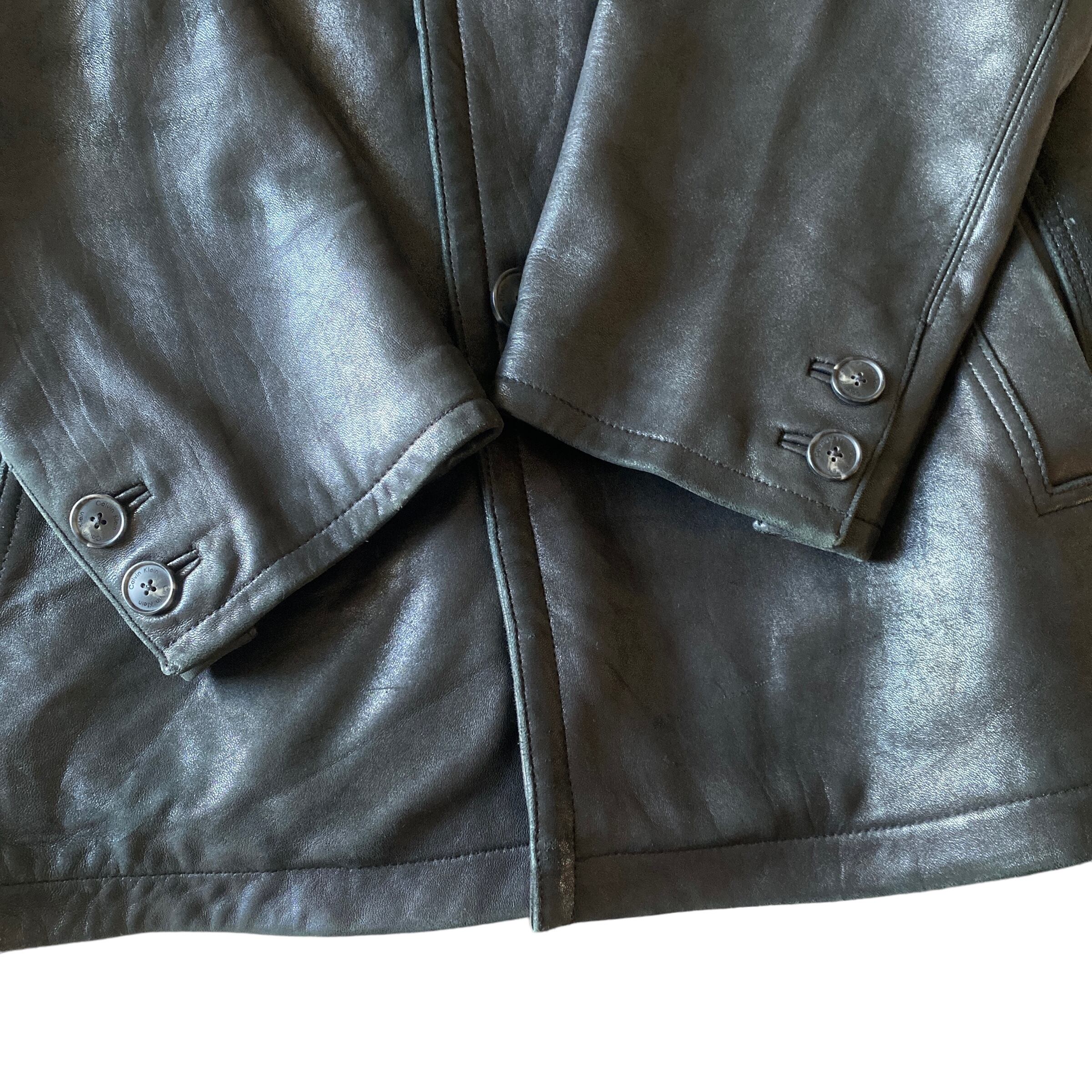 ブラックカラーの非常に柔らかで上質なラムレザーを使用し、シンプルなカーコートスタイルに仕立てられた一着。