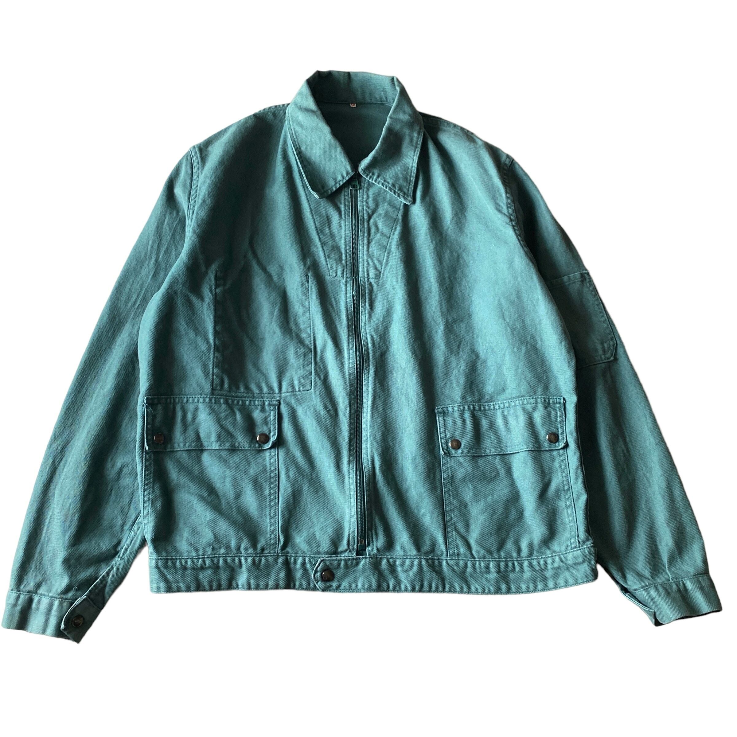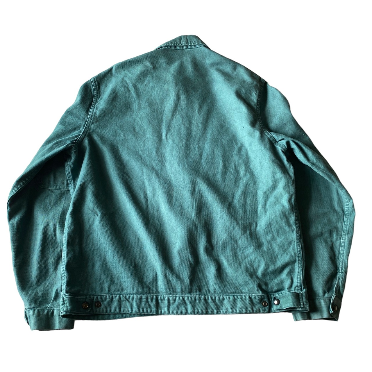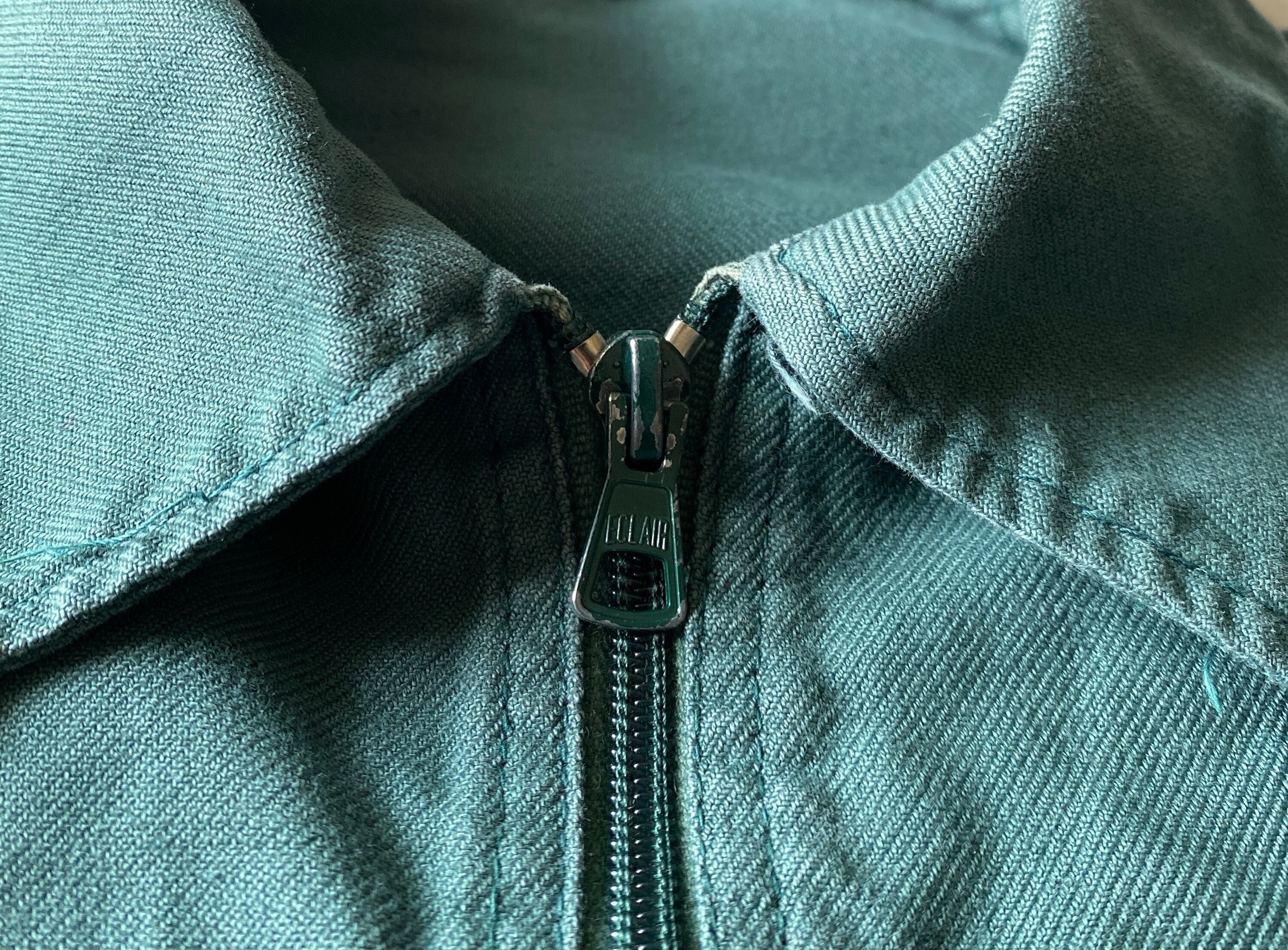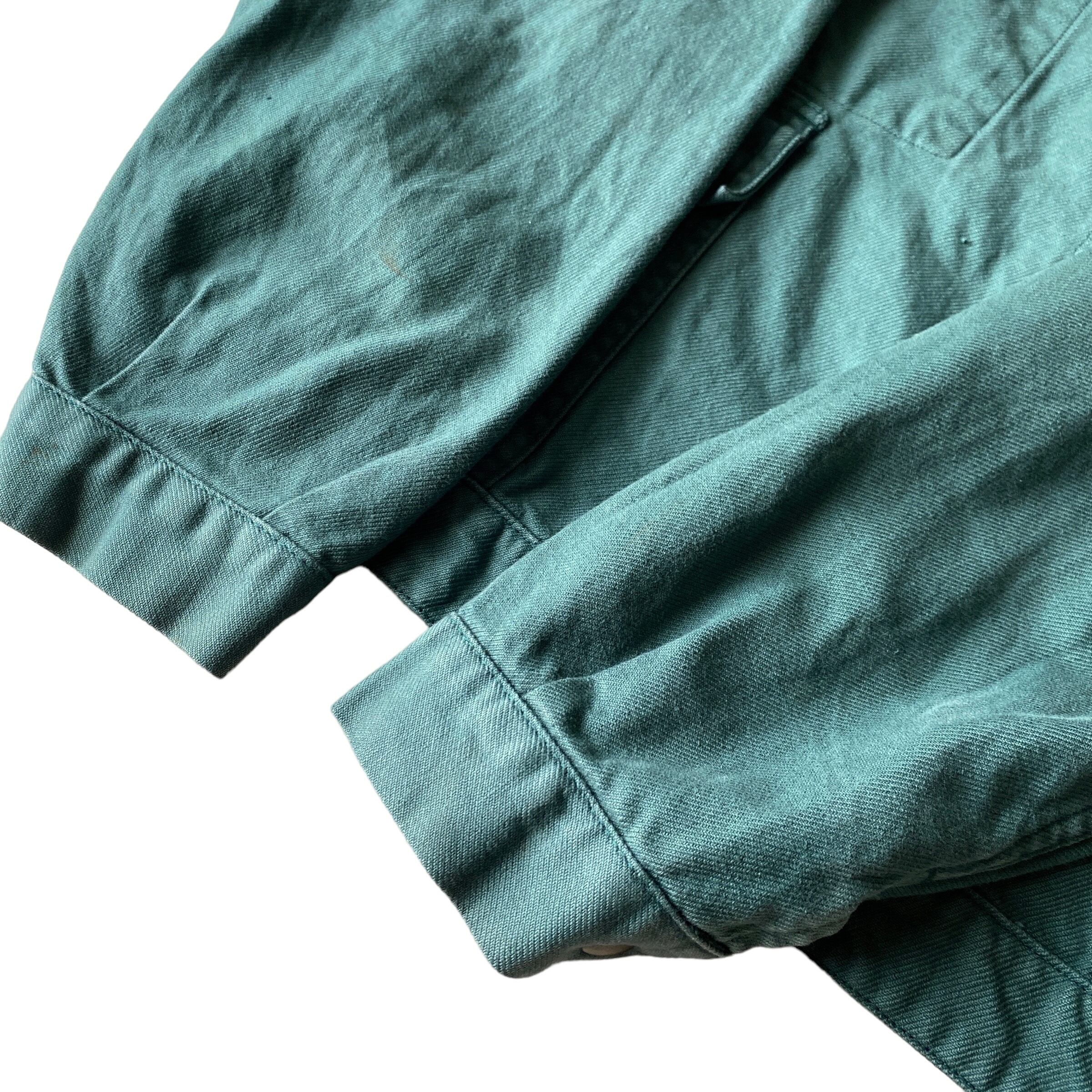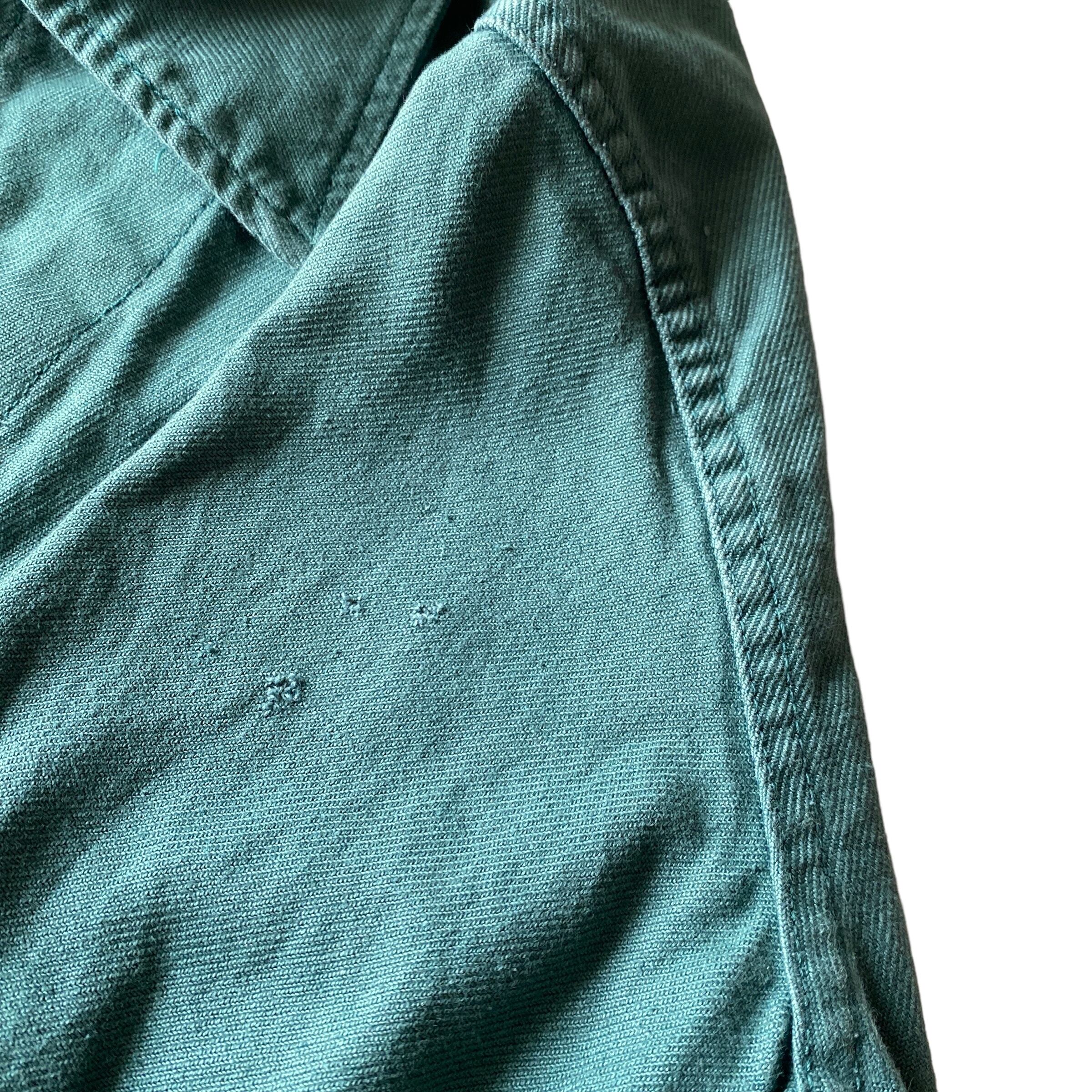 くすんだエメラルドグリーンのような(画像12が一番近いかと)絶妙な色目に、フレンチワークらしい目の詰まったコットンツイルの風合い、短丈ボックスシルエットが非常に格好良い一着。