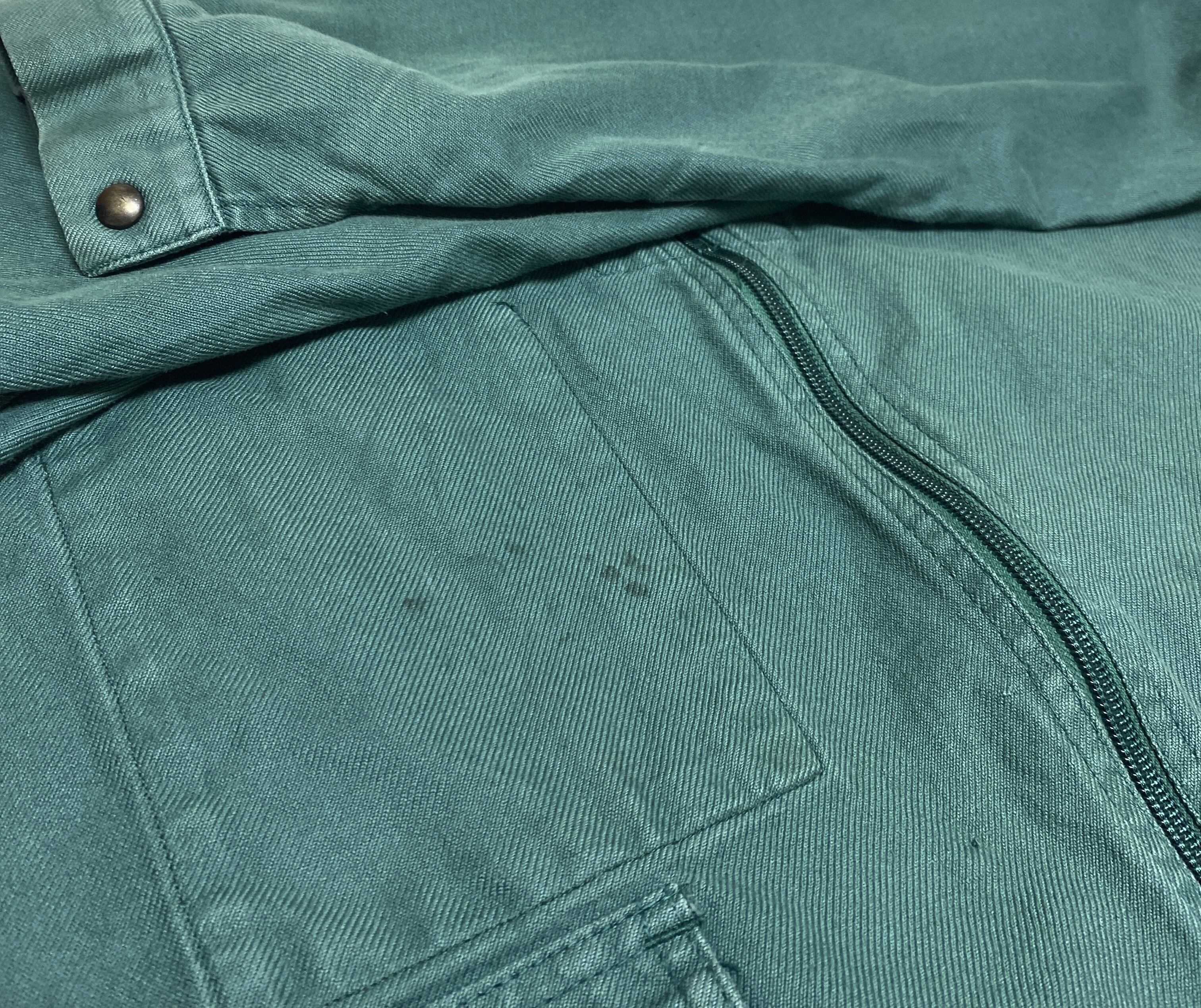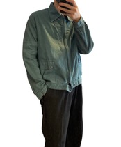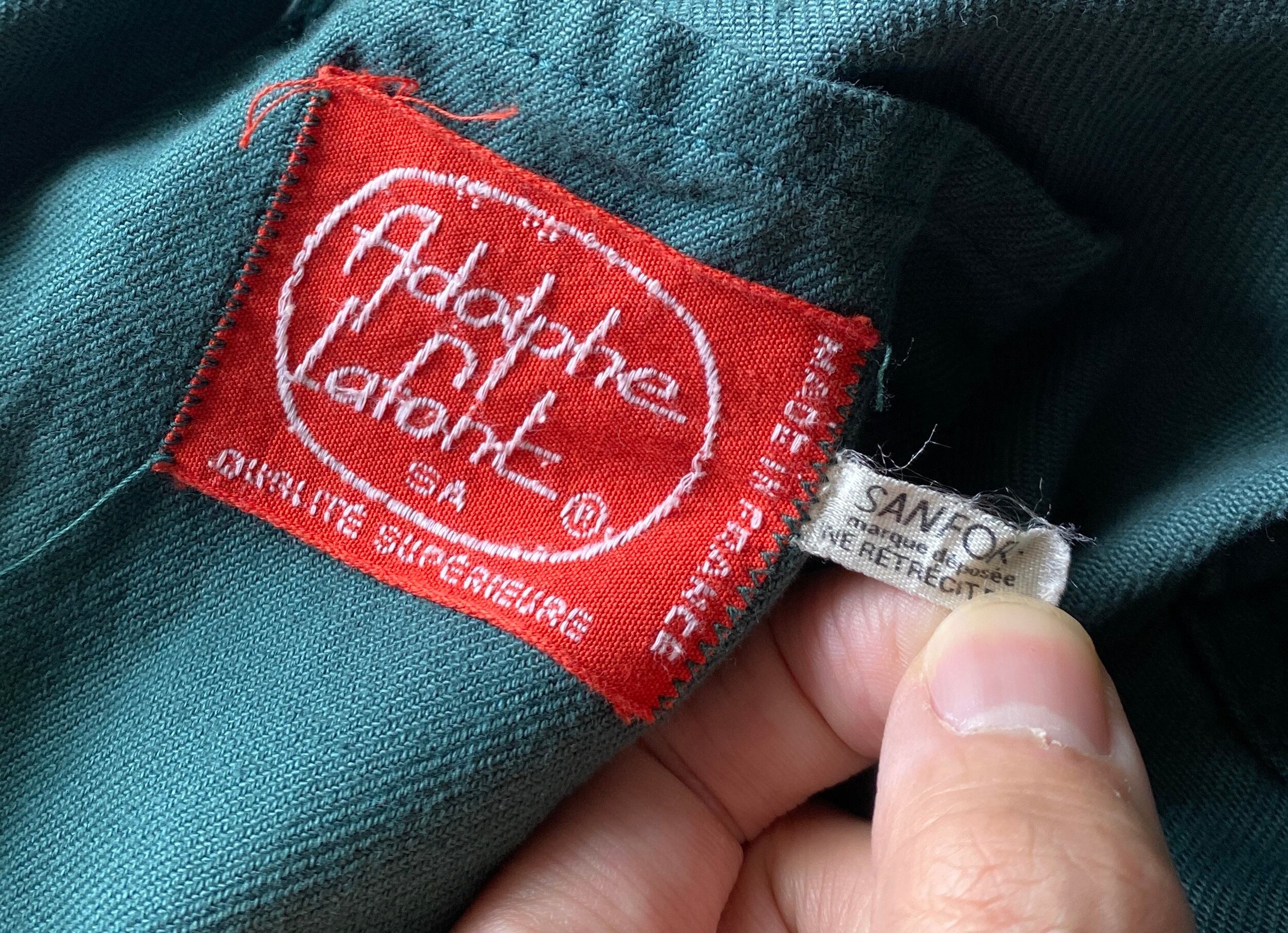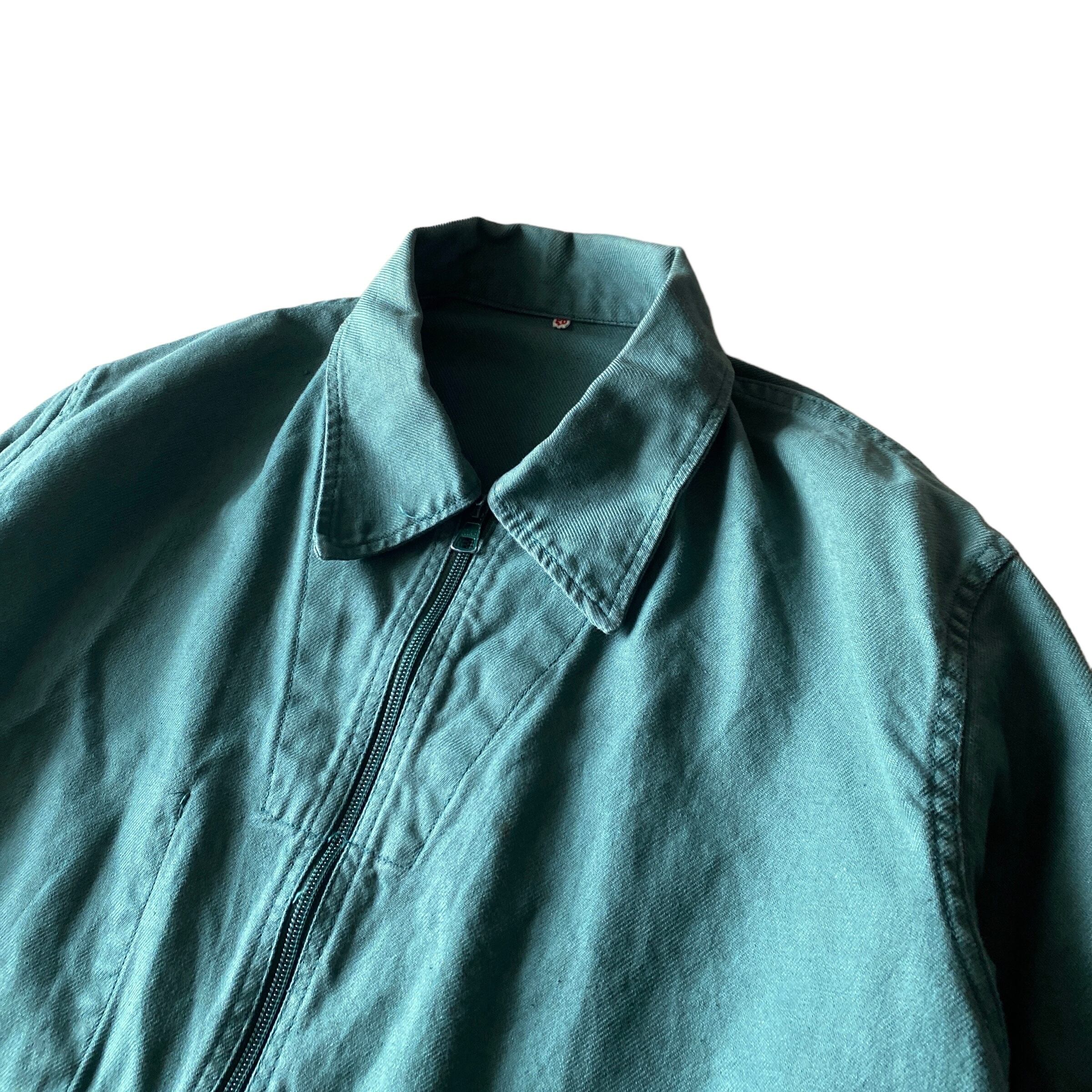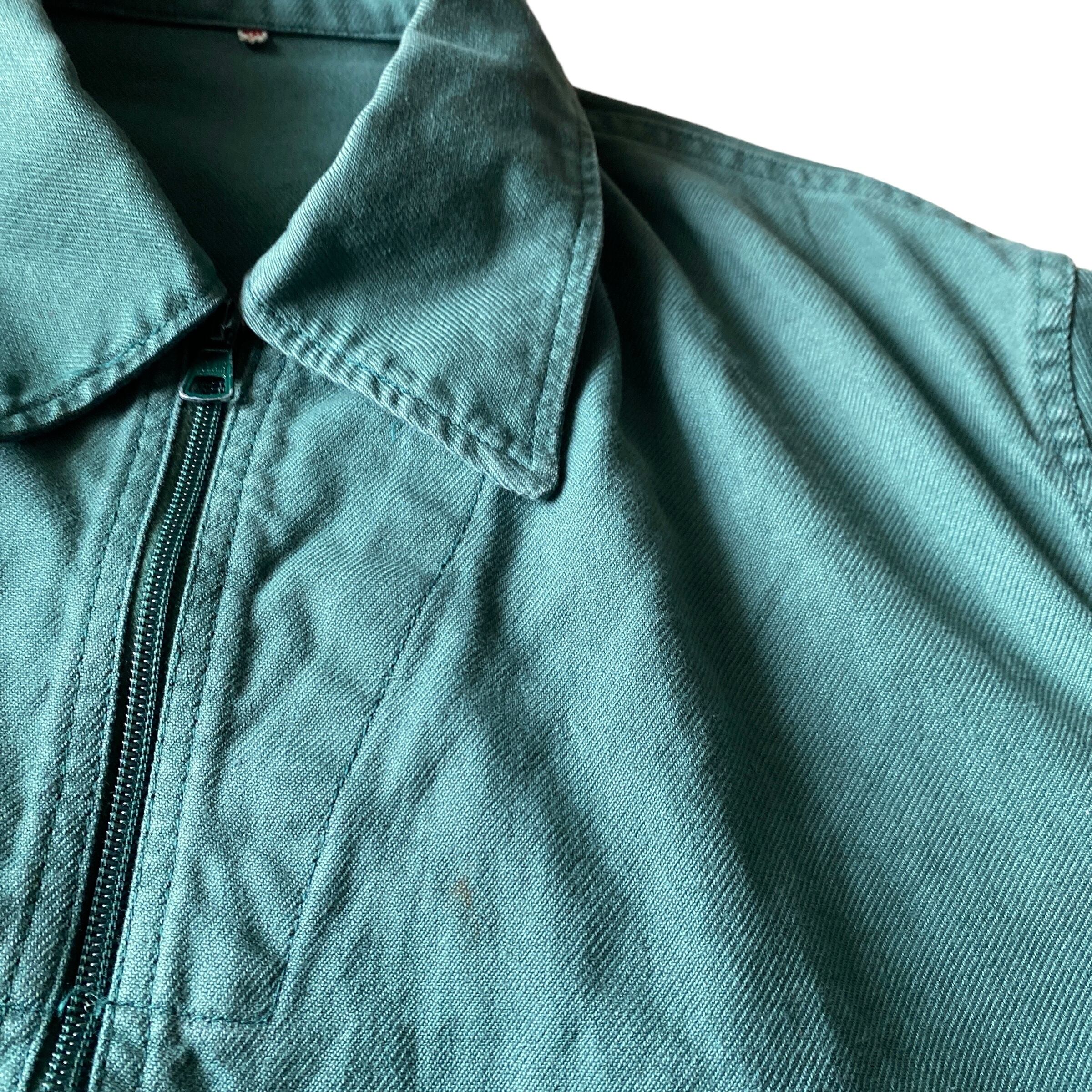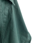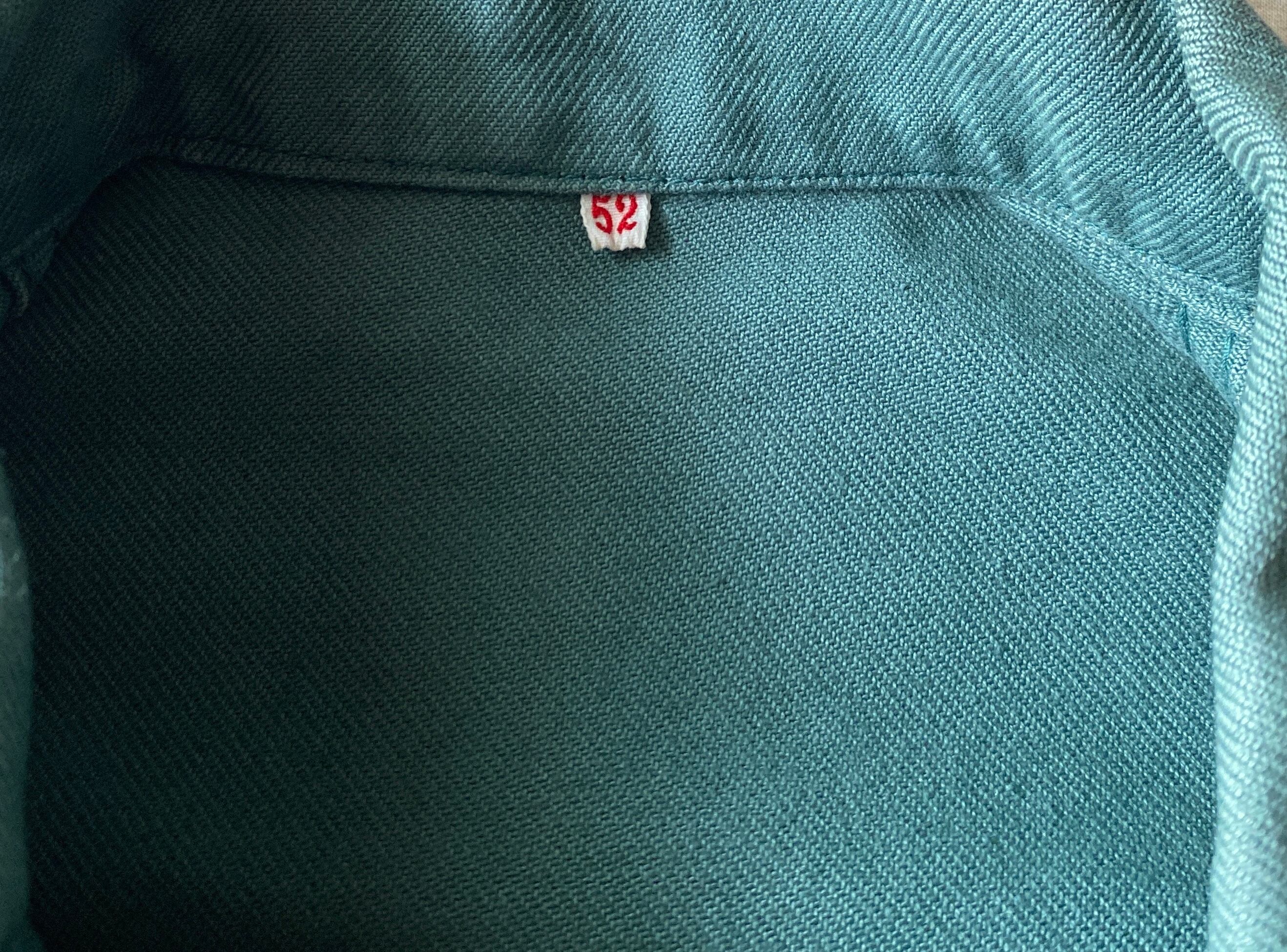 くすんだエメラルドグリーンのような(画像12が一番近いかと)絶妙な色目に、フレンチワークらしい目の詰まったコットンツイルの風合い、短丈ボックスシルエットが非常に格好良い一着。