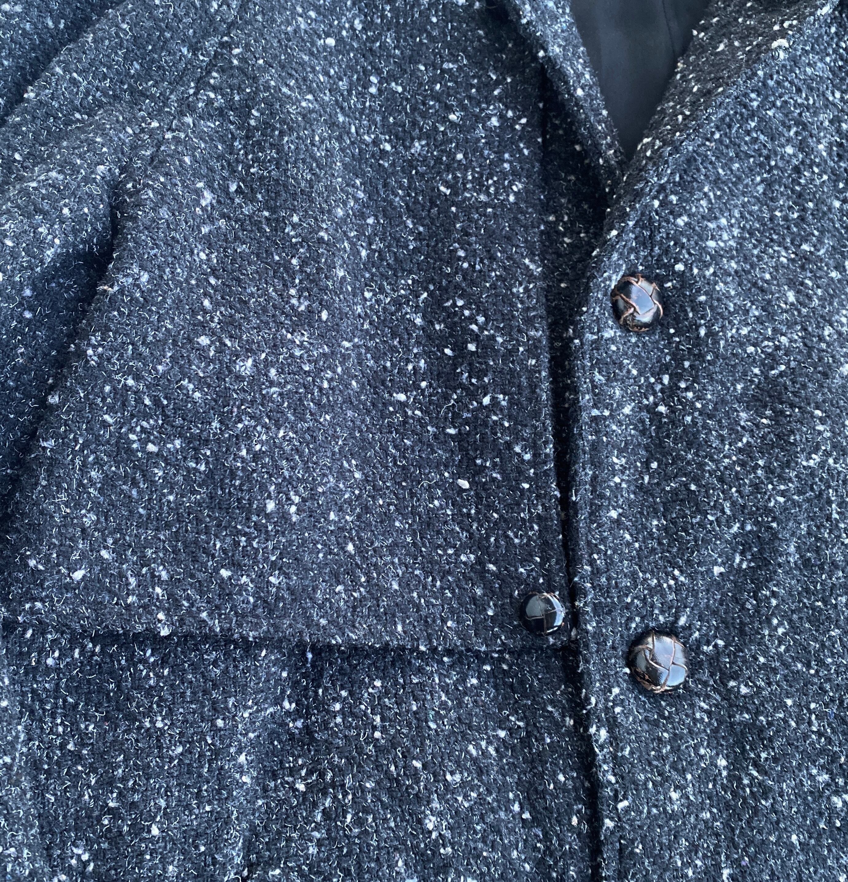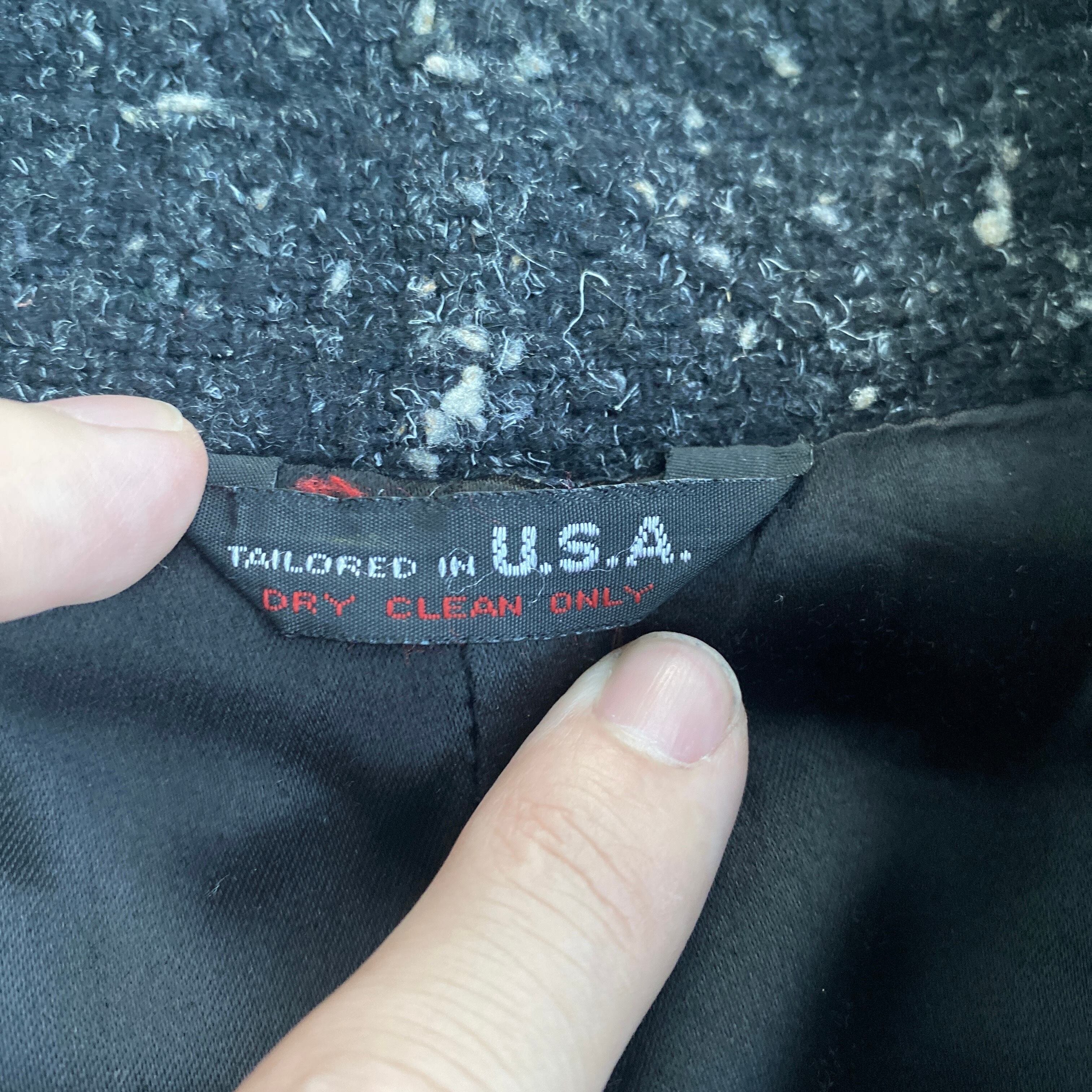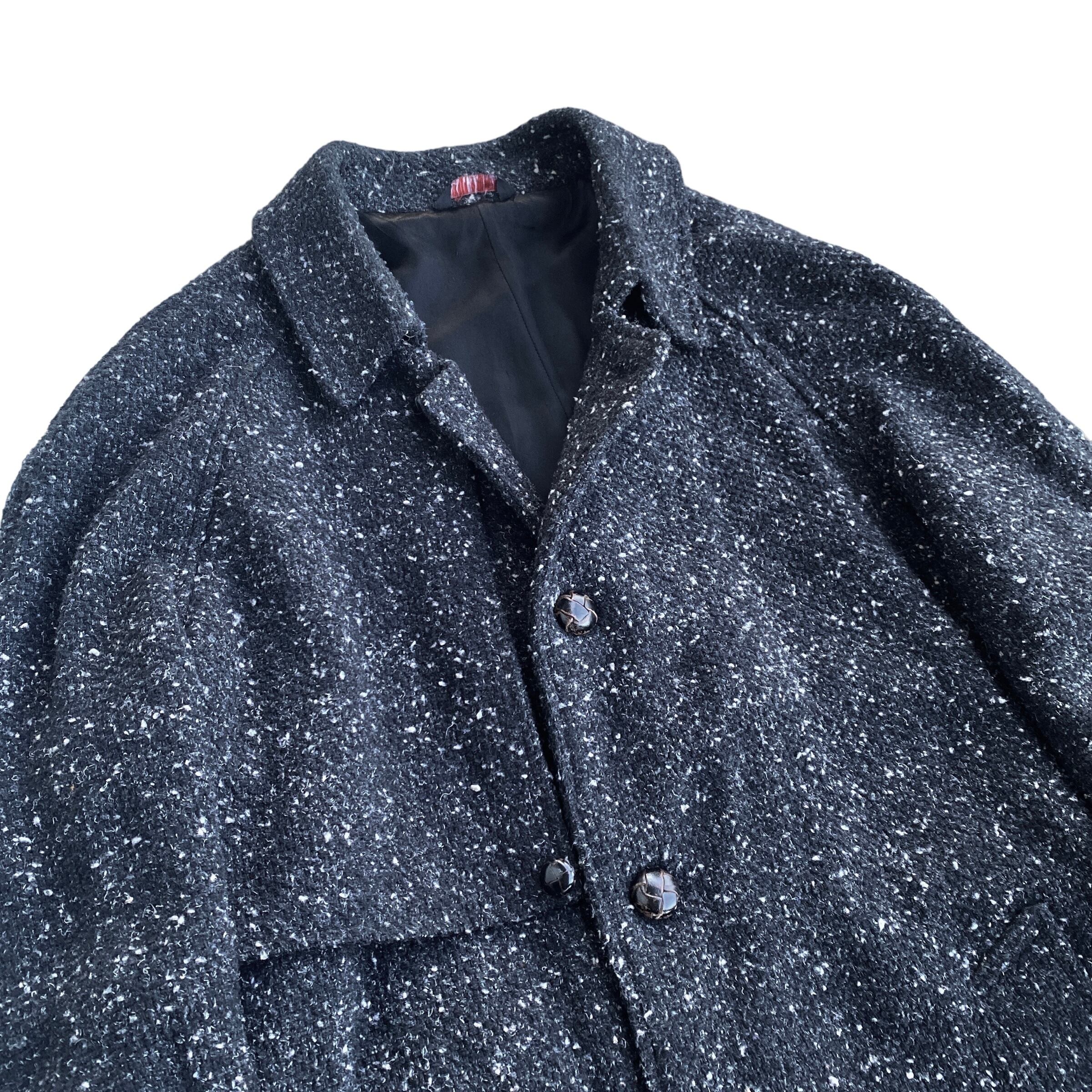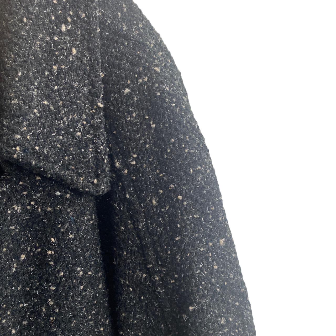 ブラックに近いダークグレー(画像14参照)をベースとした、イタリア製の風合いの良いループツイード生地を使用し、アメリカでコートとして仕立てられた雰囲気抜群な一着。