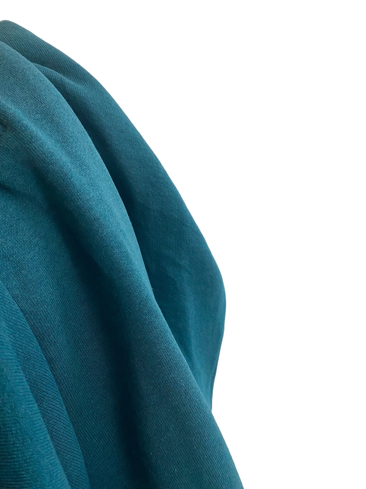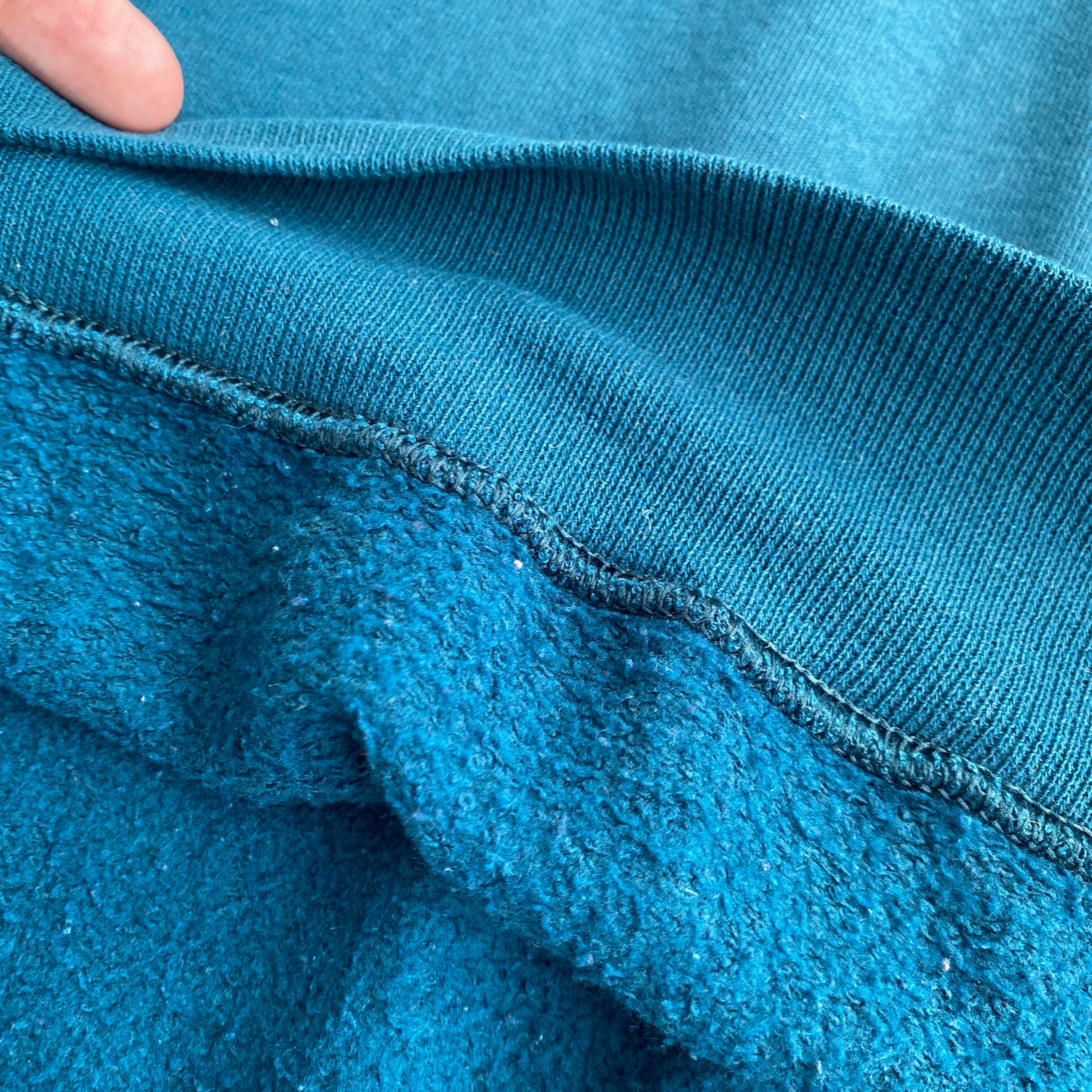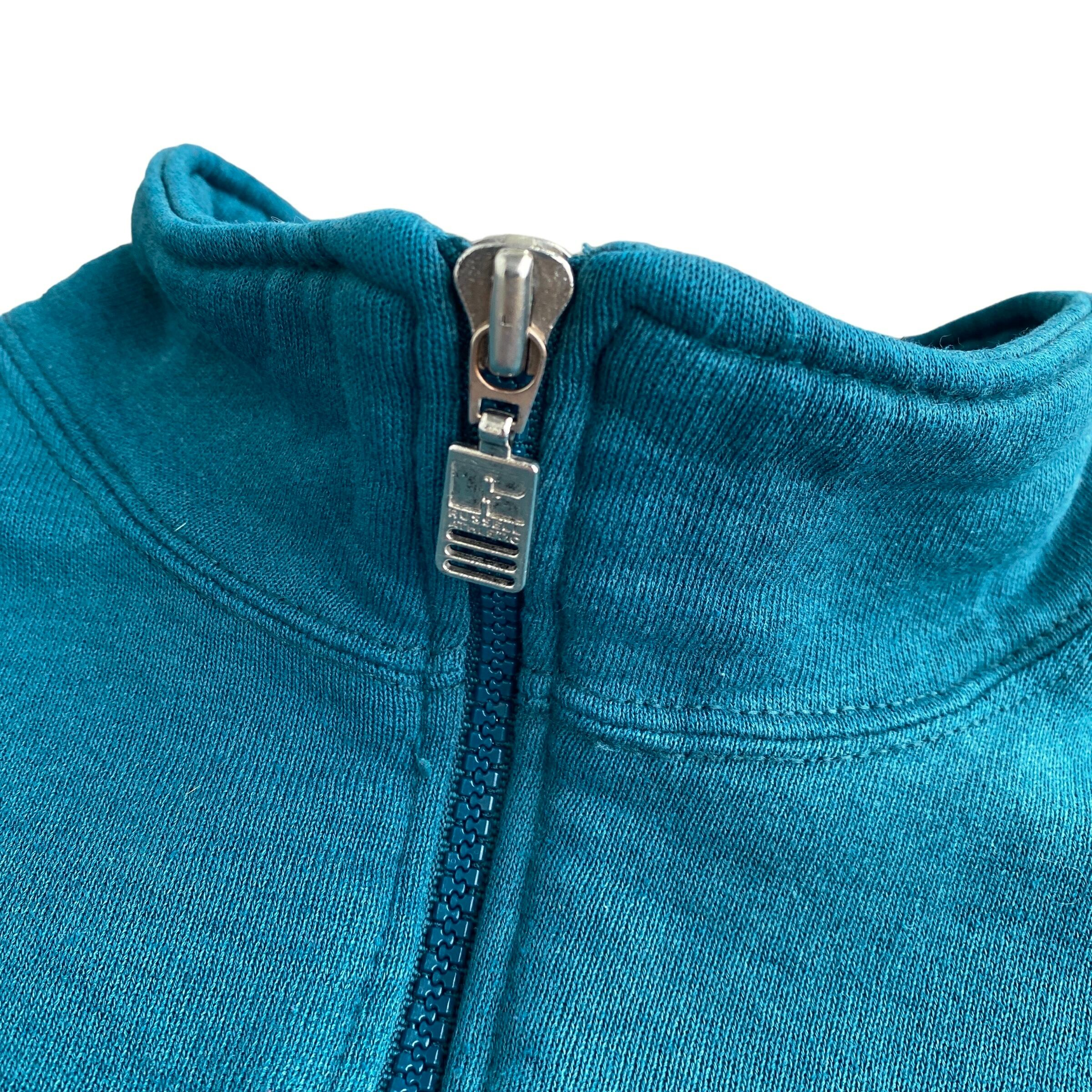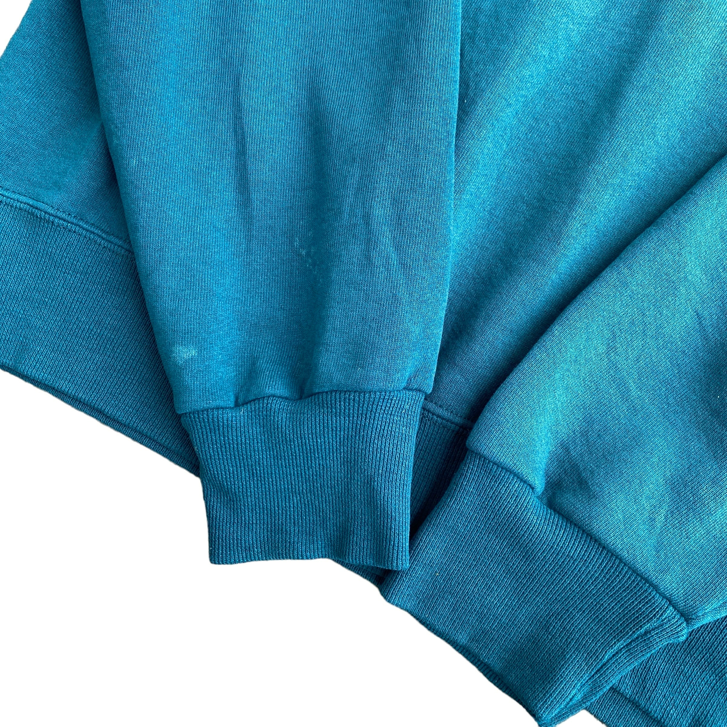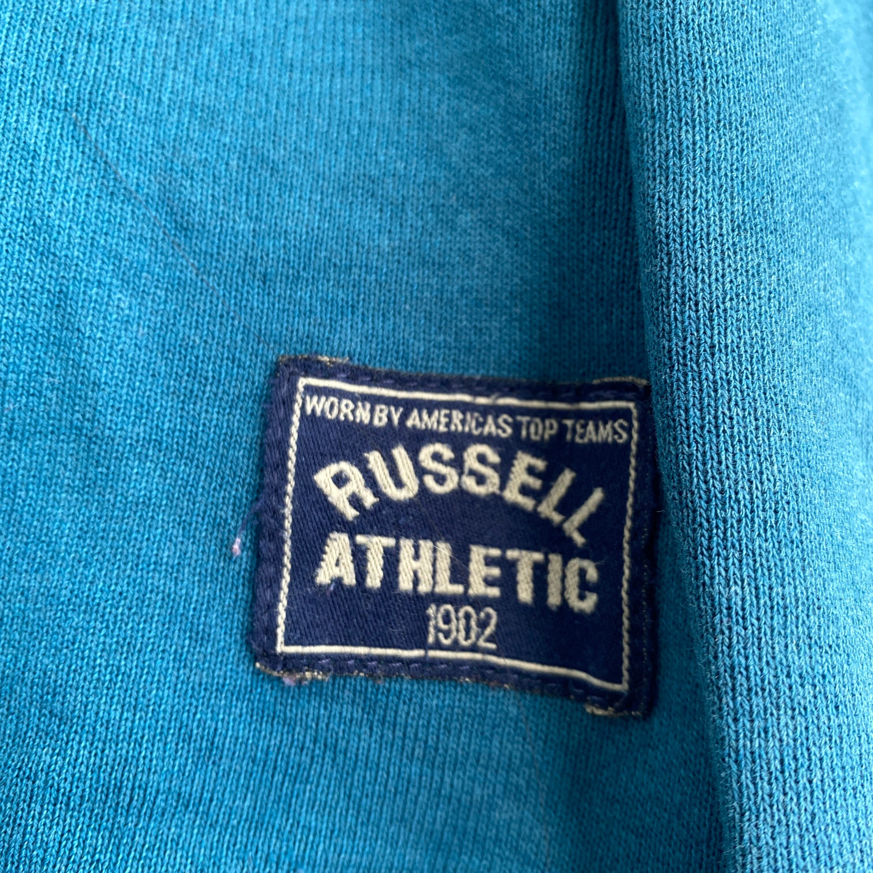 ラッセル特有の肉厚なコットンポリ素材に、程よくフェードした暗めのエメラルドグリーン?の色目(画像8が近いです)、短丈ボックスなシルエットが雰囲気抜群な一着。