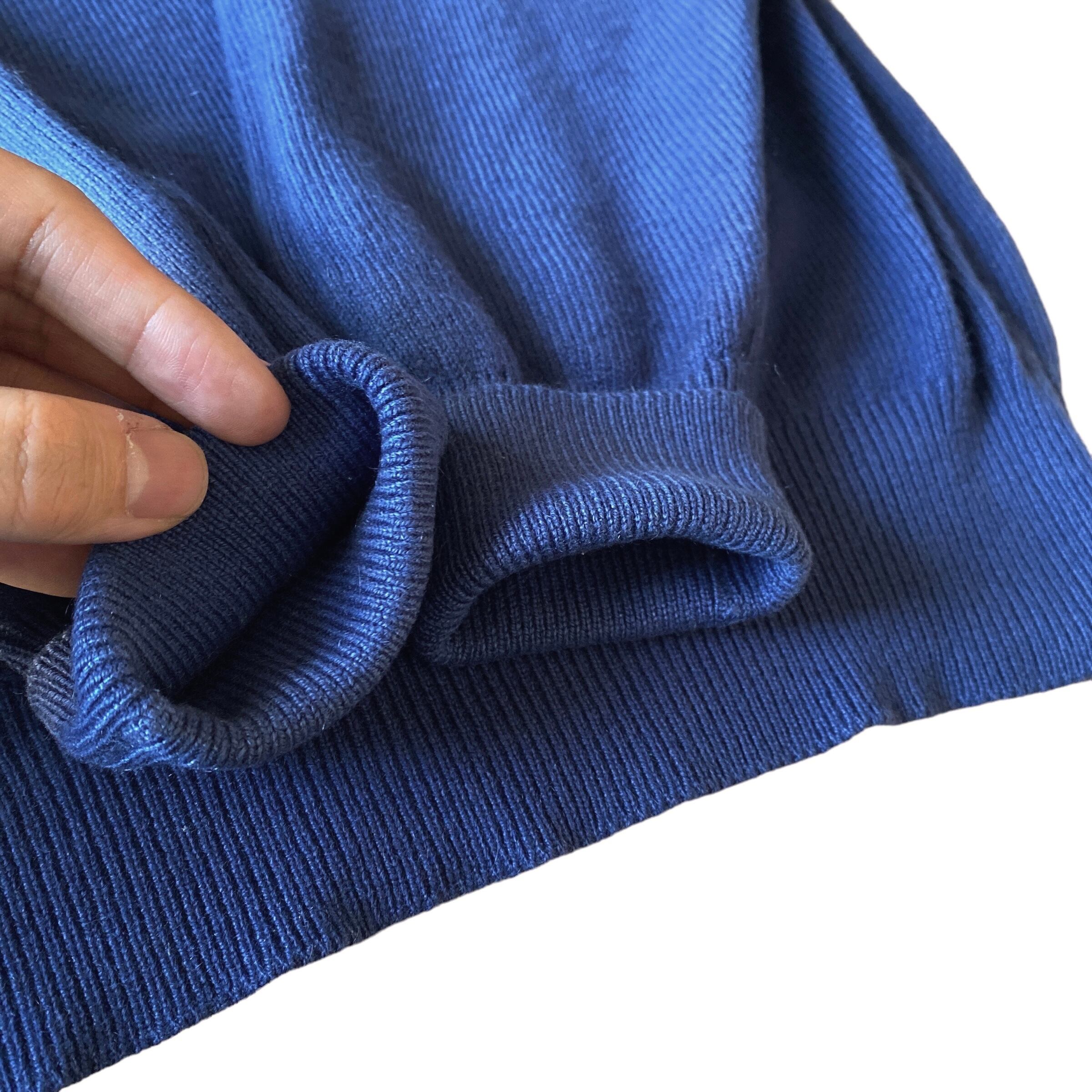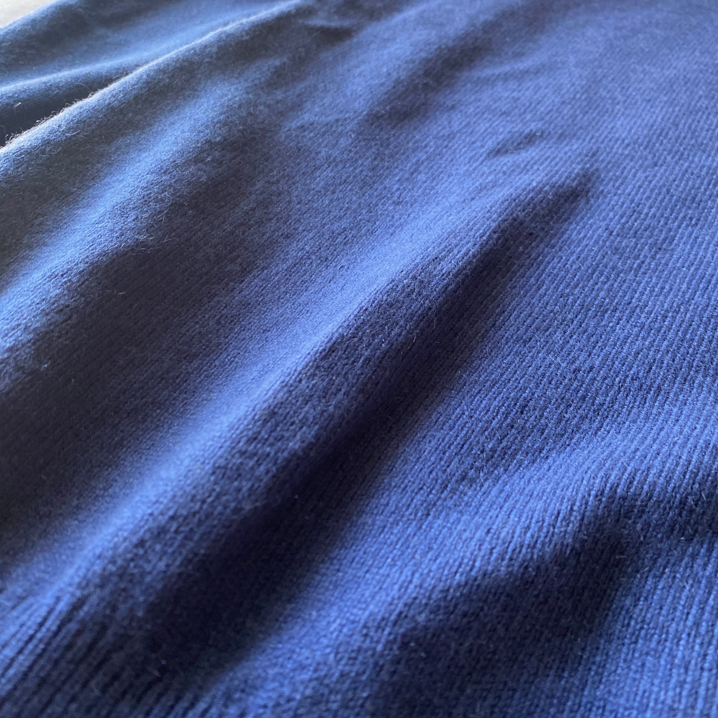 3plyの太めの糸が使用された、目の詰まった硬さのある(とはいえもちろんしなやかです)肉厚な質感に、上品なくすみブルーカラー(私のカメラでは画像7が限界ですが、もう少し綺麗な色目です)が素晴らしい一着。