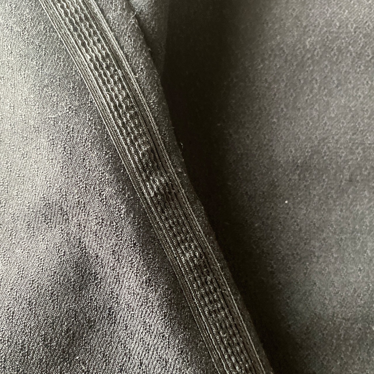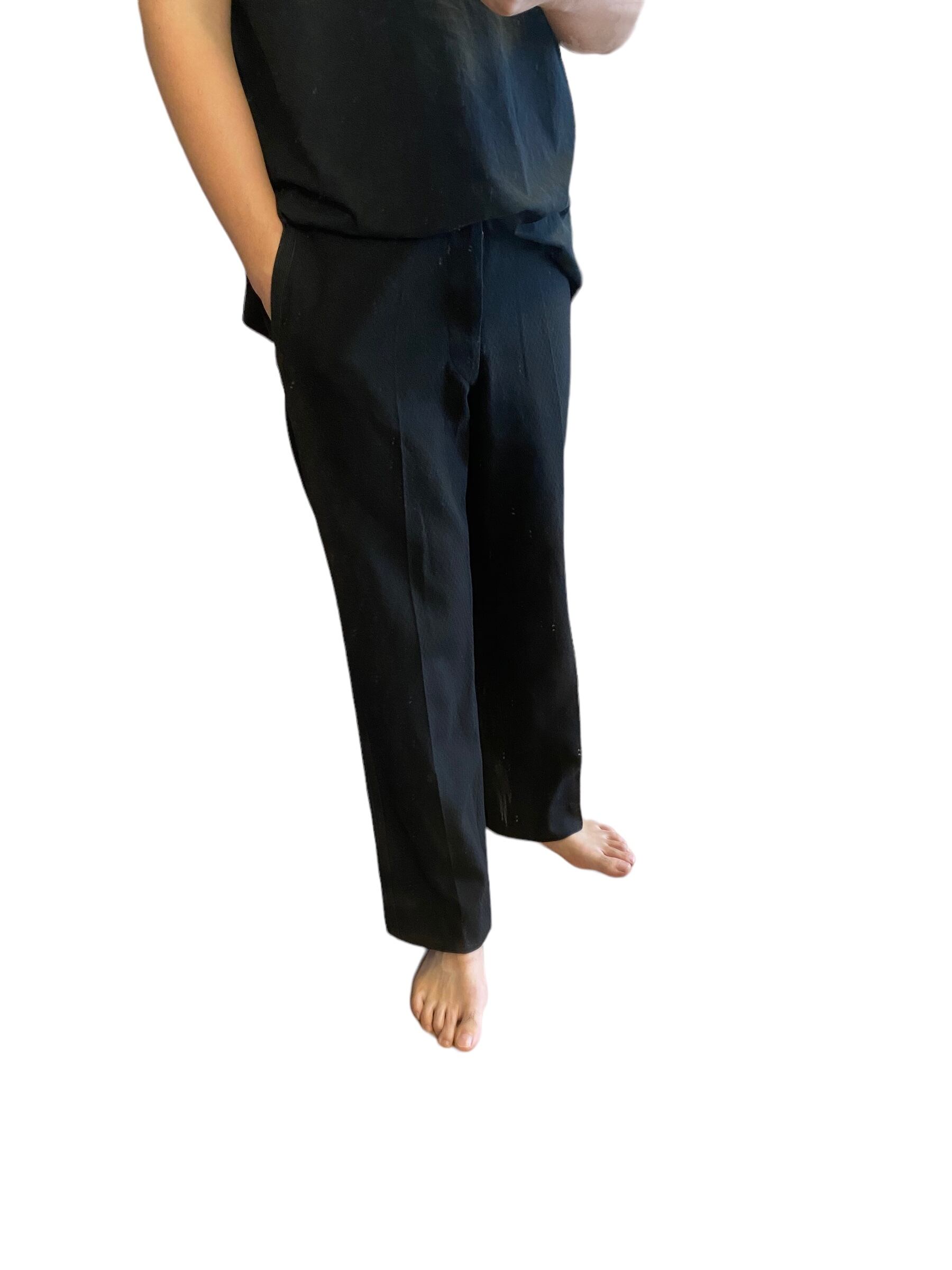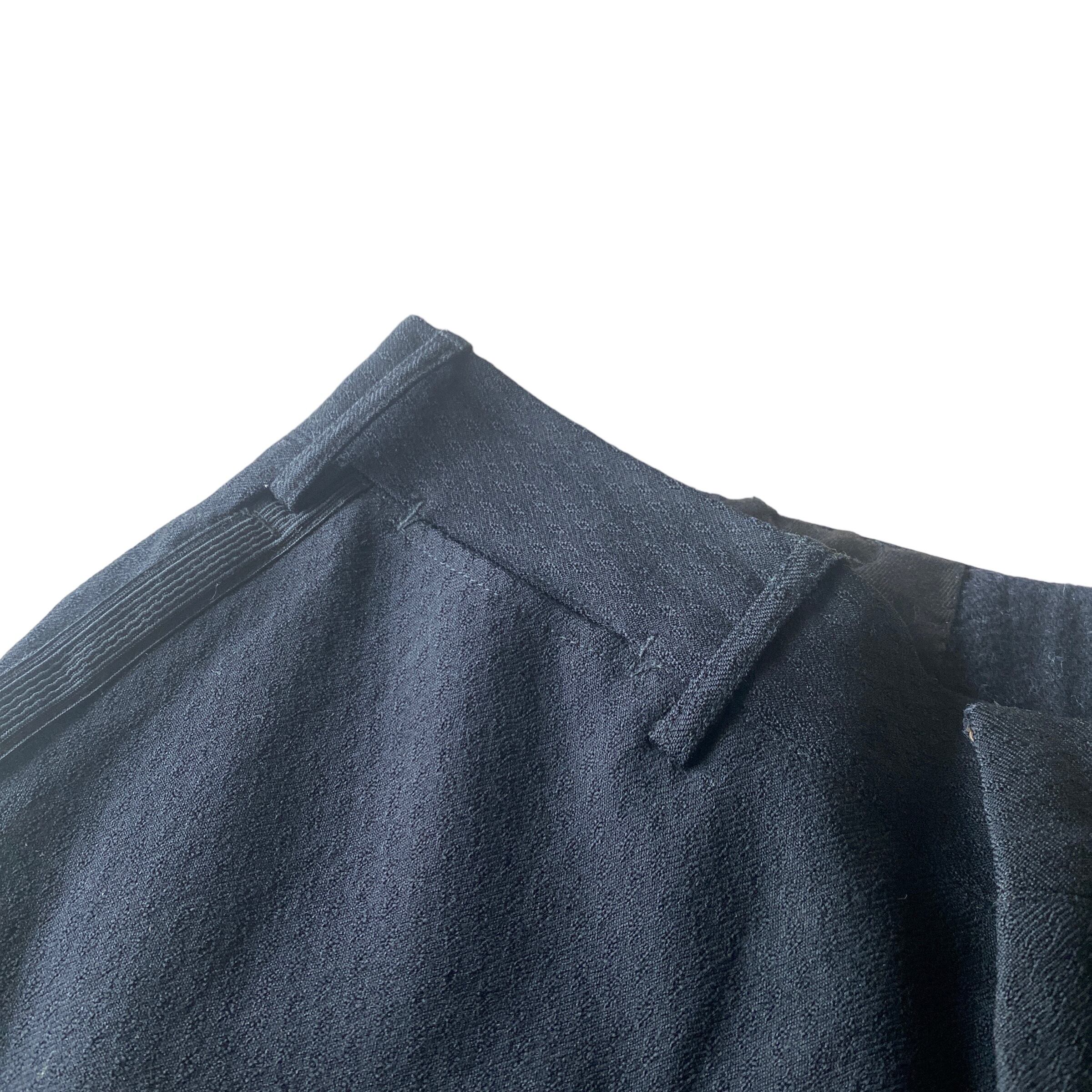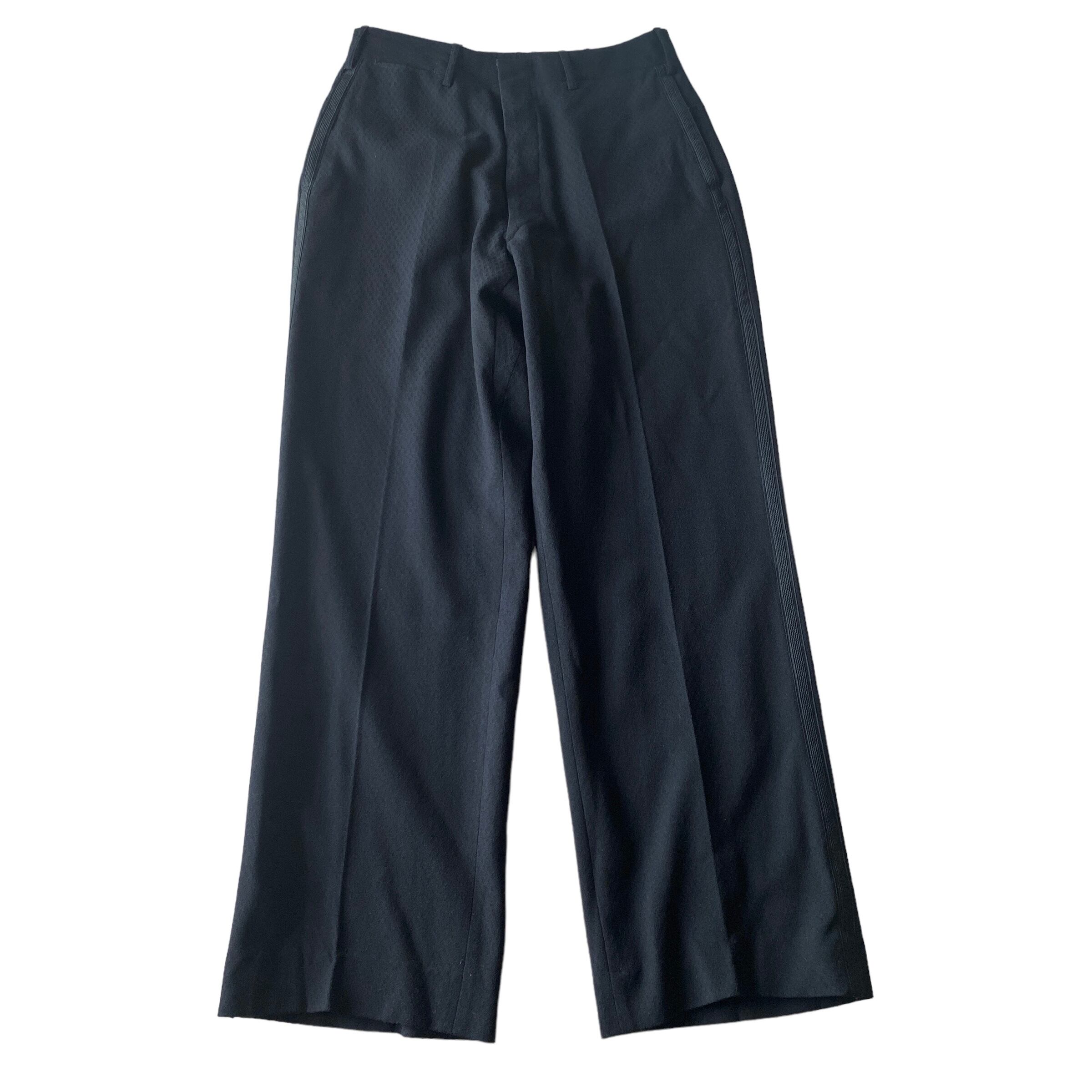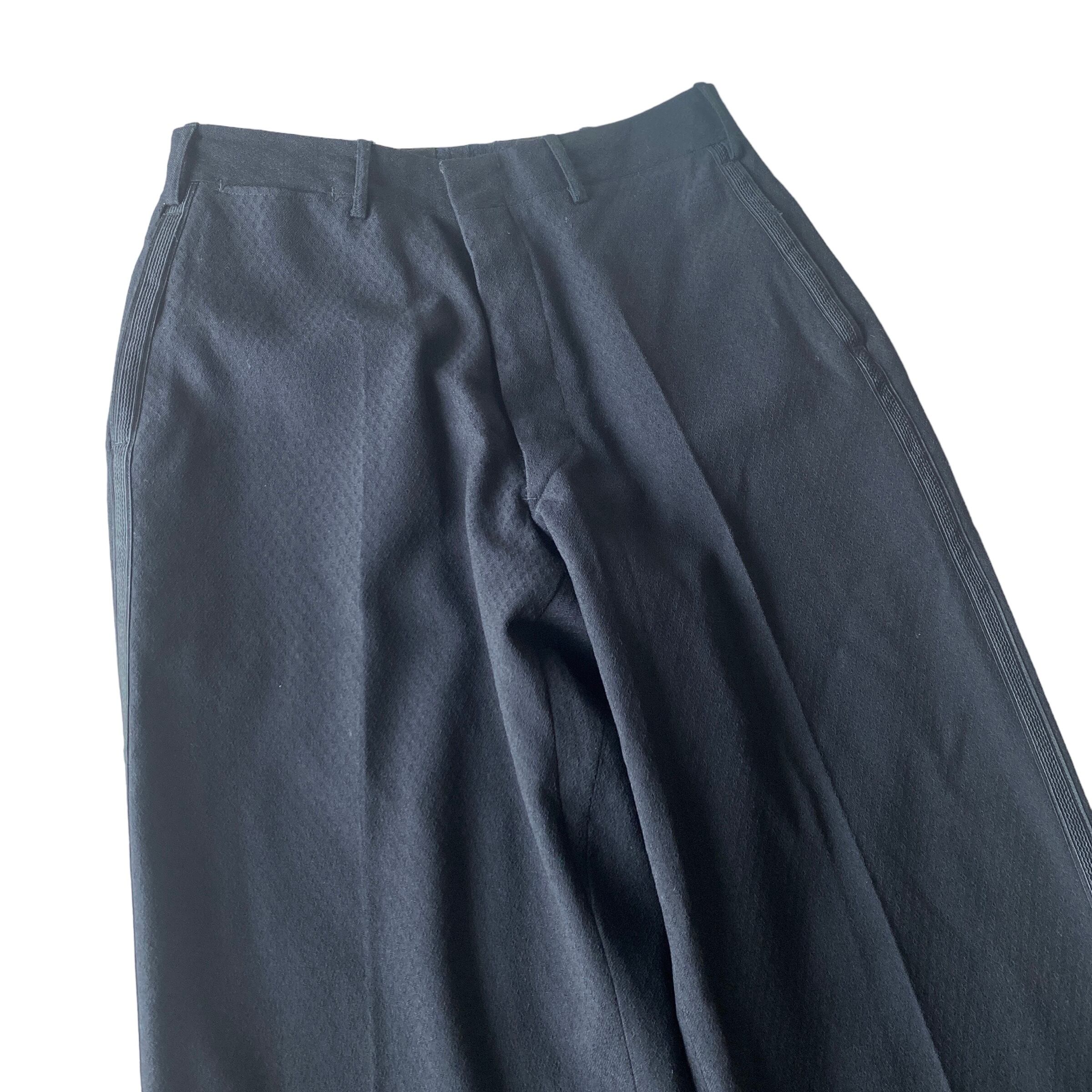深いブラックの程よく肉厚な織総柄生地に、同色のサイドライン、ノータックでストンと落ちるセミワイドのストレートシルエットが非常に格好良い一着。