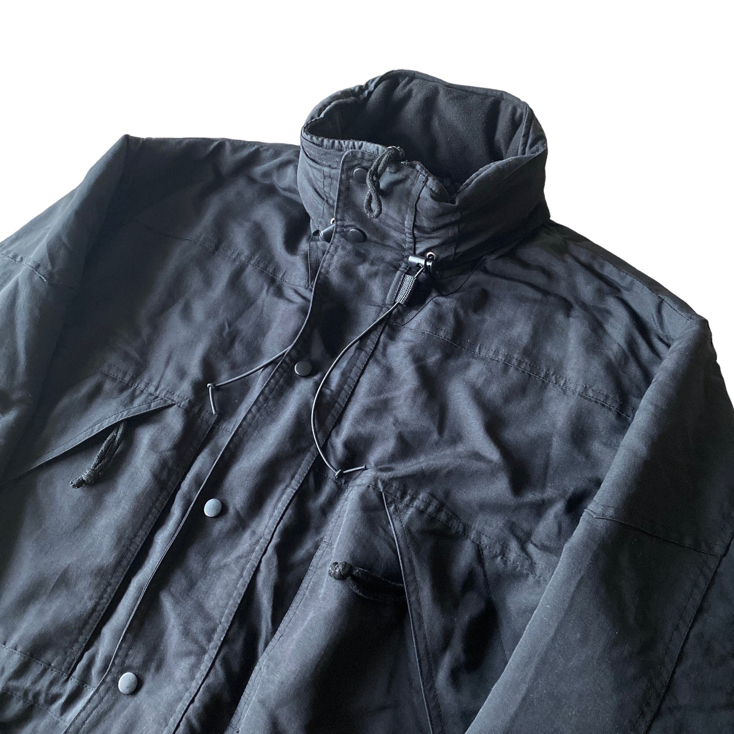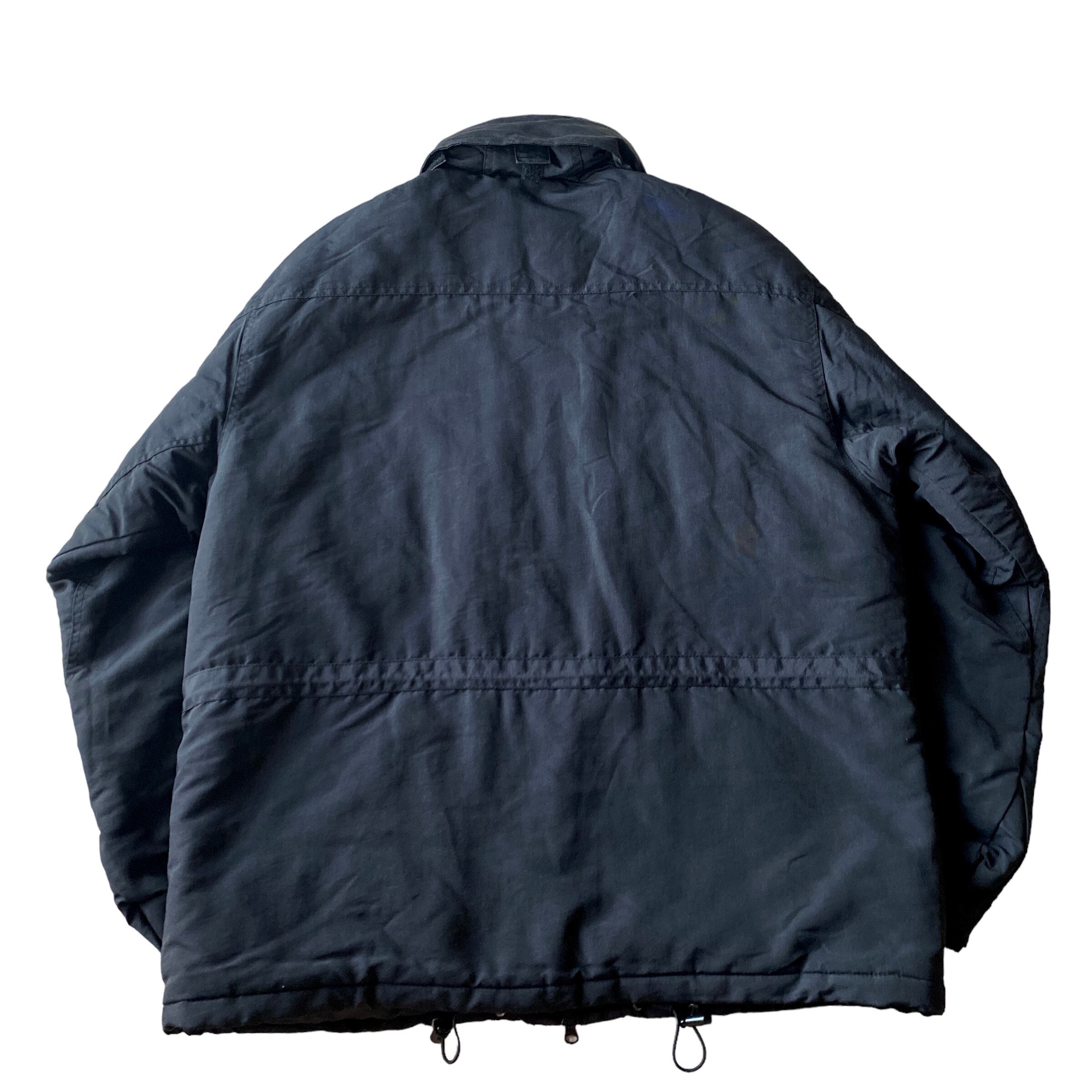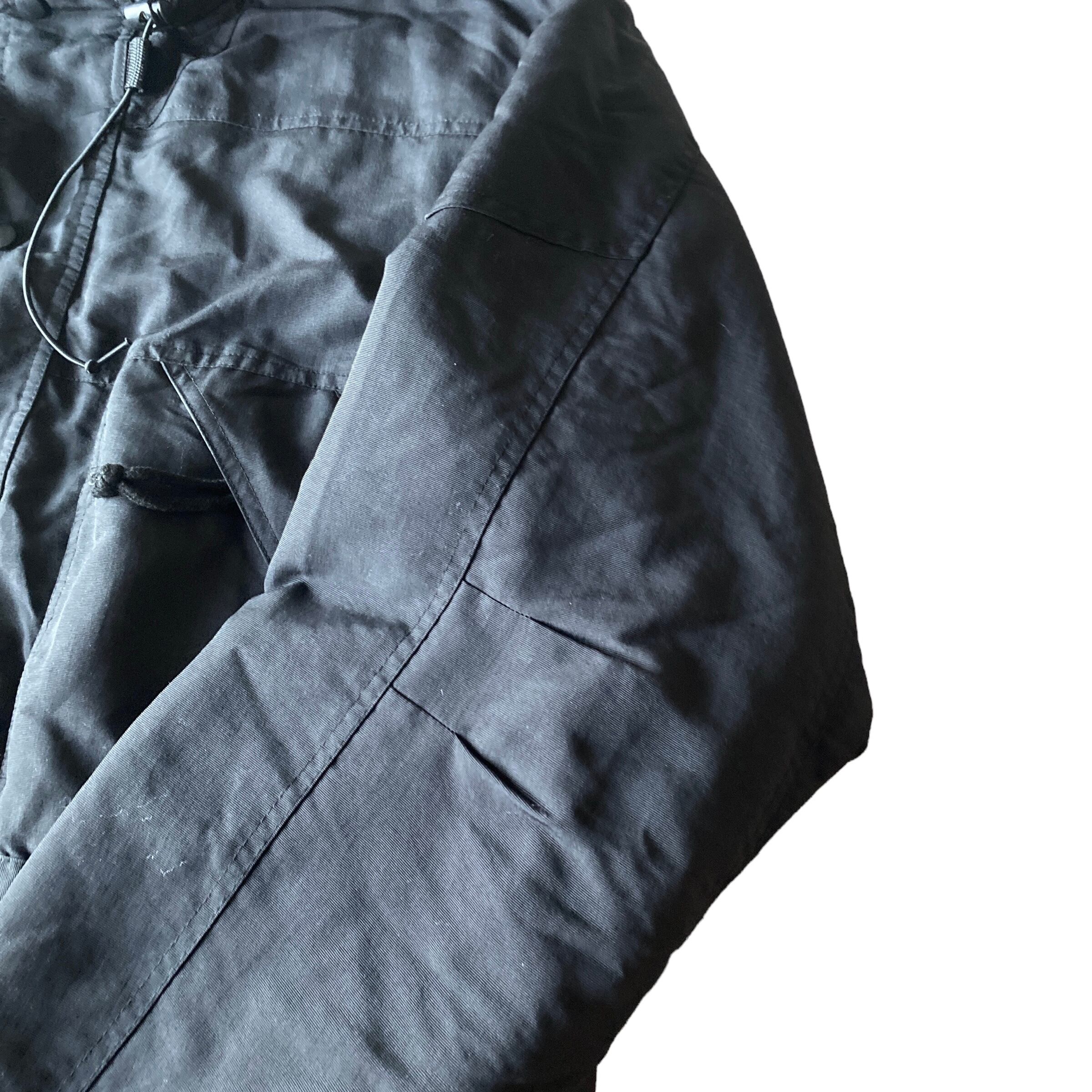中綿入りの立ち襟(フードが格納されています)でブラックナイロン素材と、秋冬にヘビロテ間違いなしな一着。