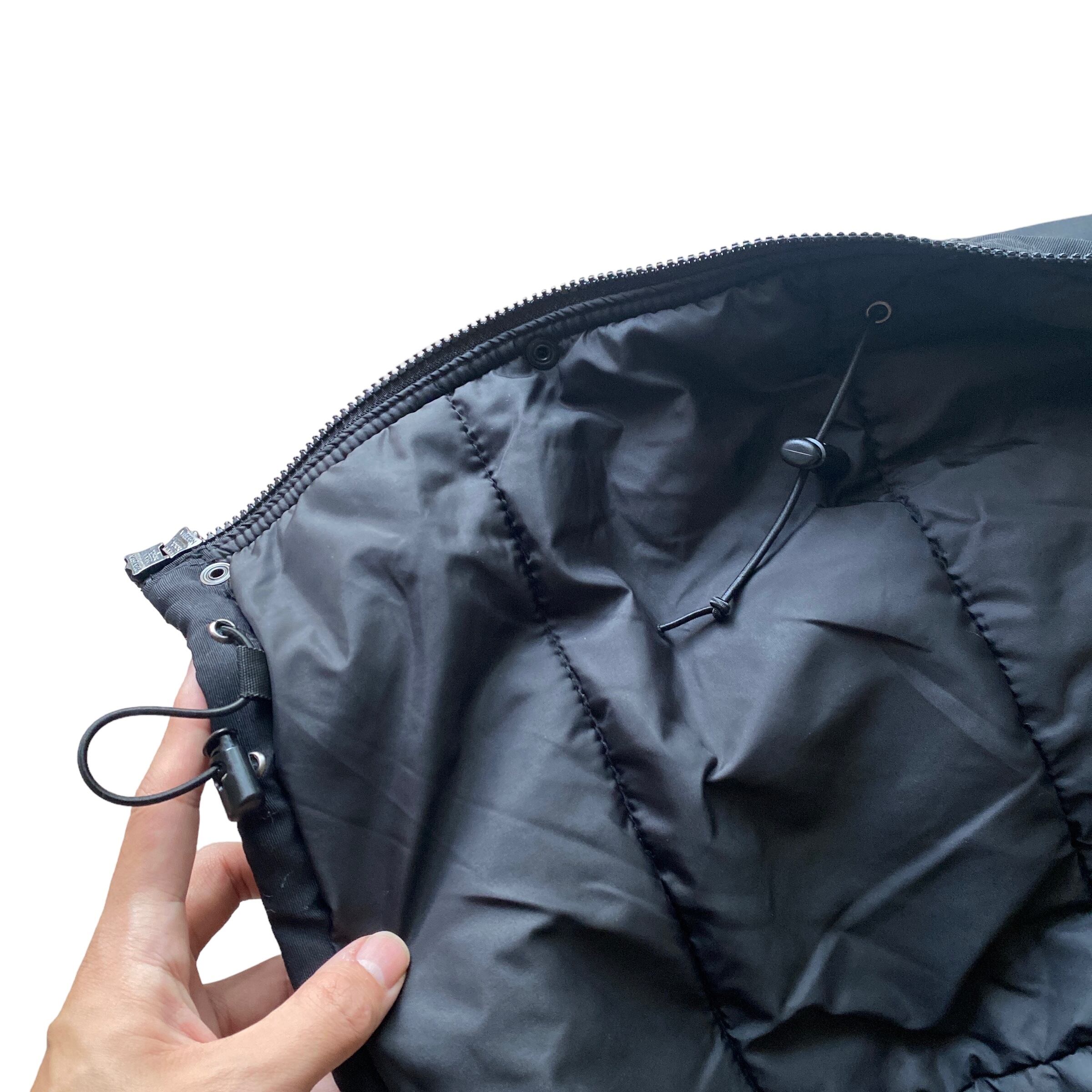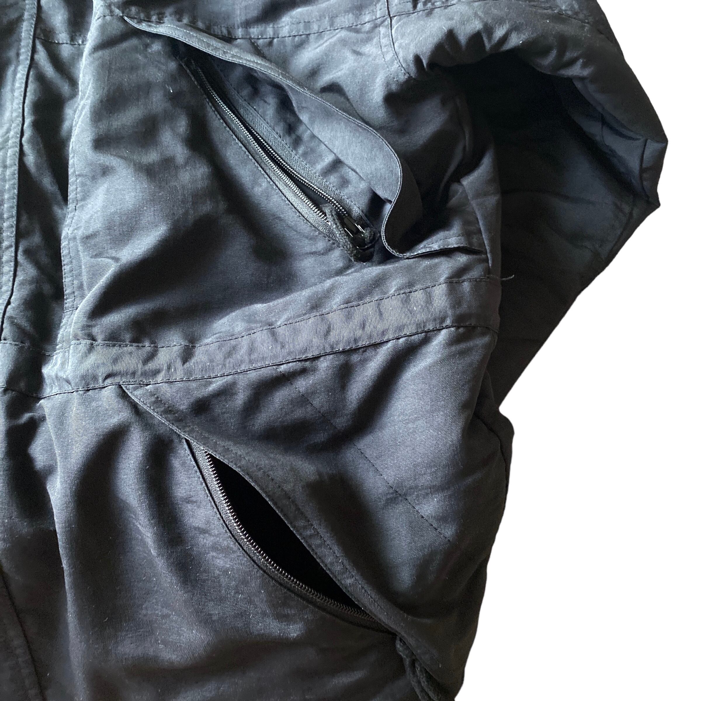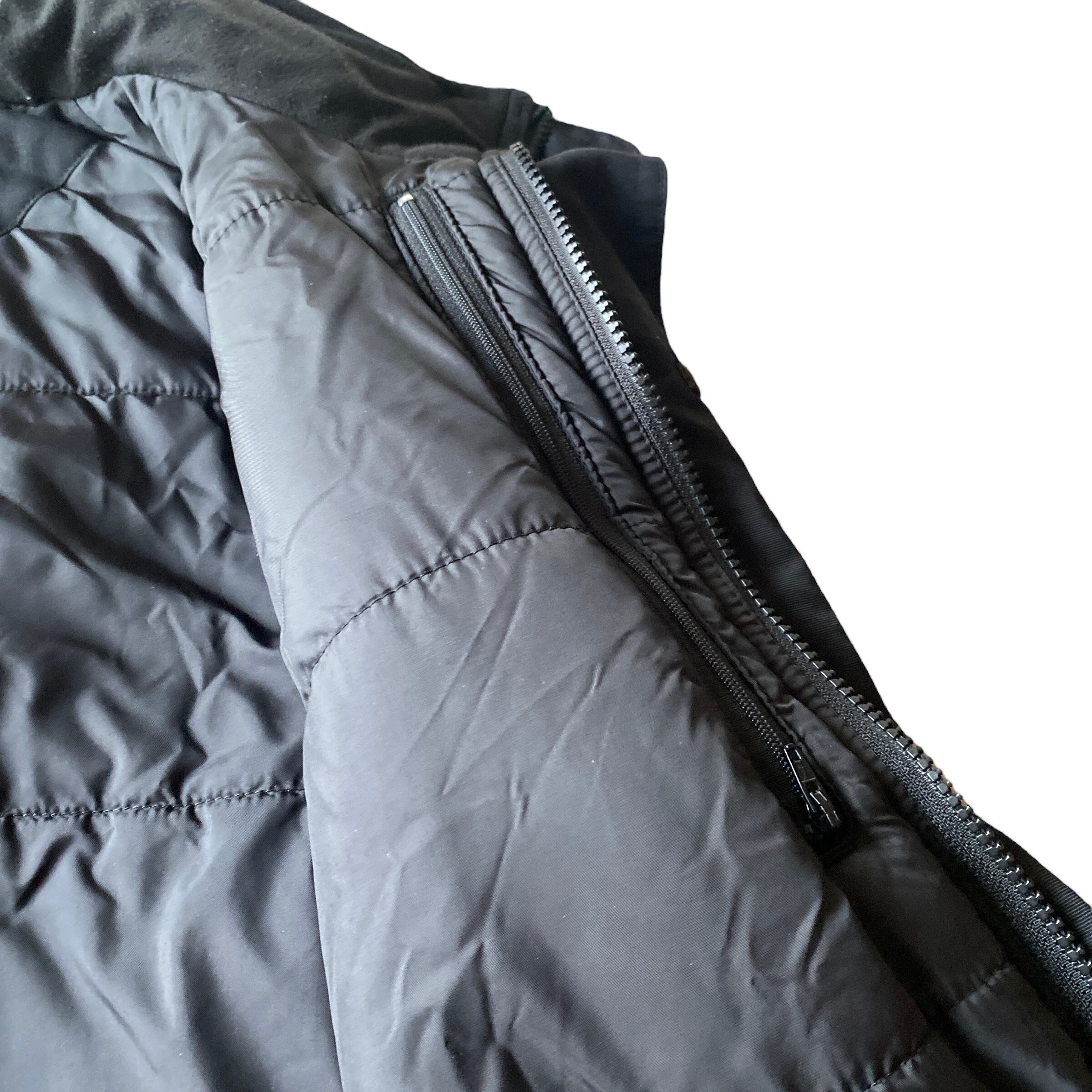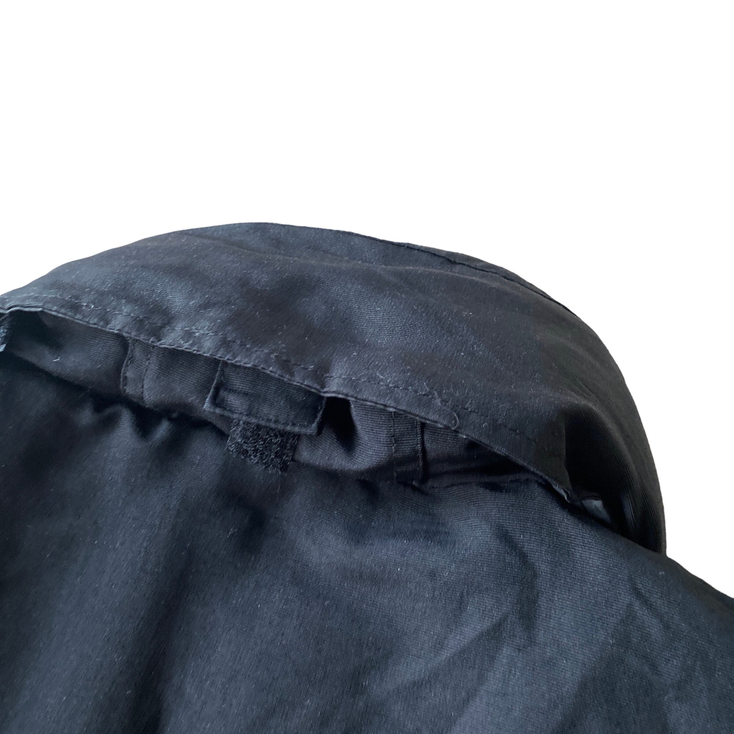 中綿入りの立ち襟(フードが格納されています)でブラックナイロン素材と、秋冬にヘビロテ間違いなしな一着。