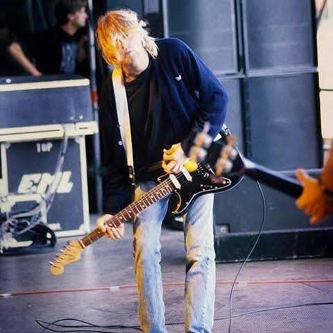 カートコベイン着用でアクリルカーディガンの中でも一際人気の高い一着。(カートはネイビー)