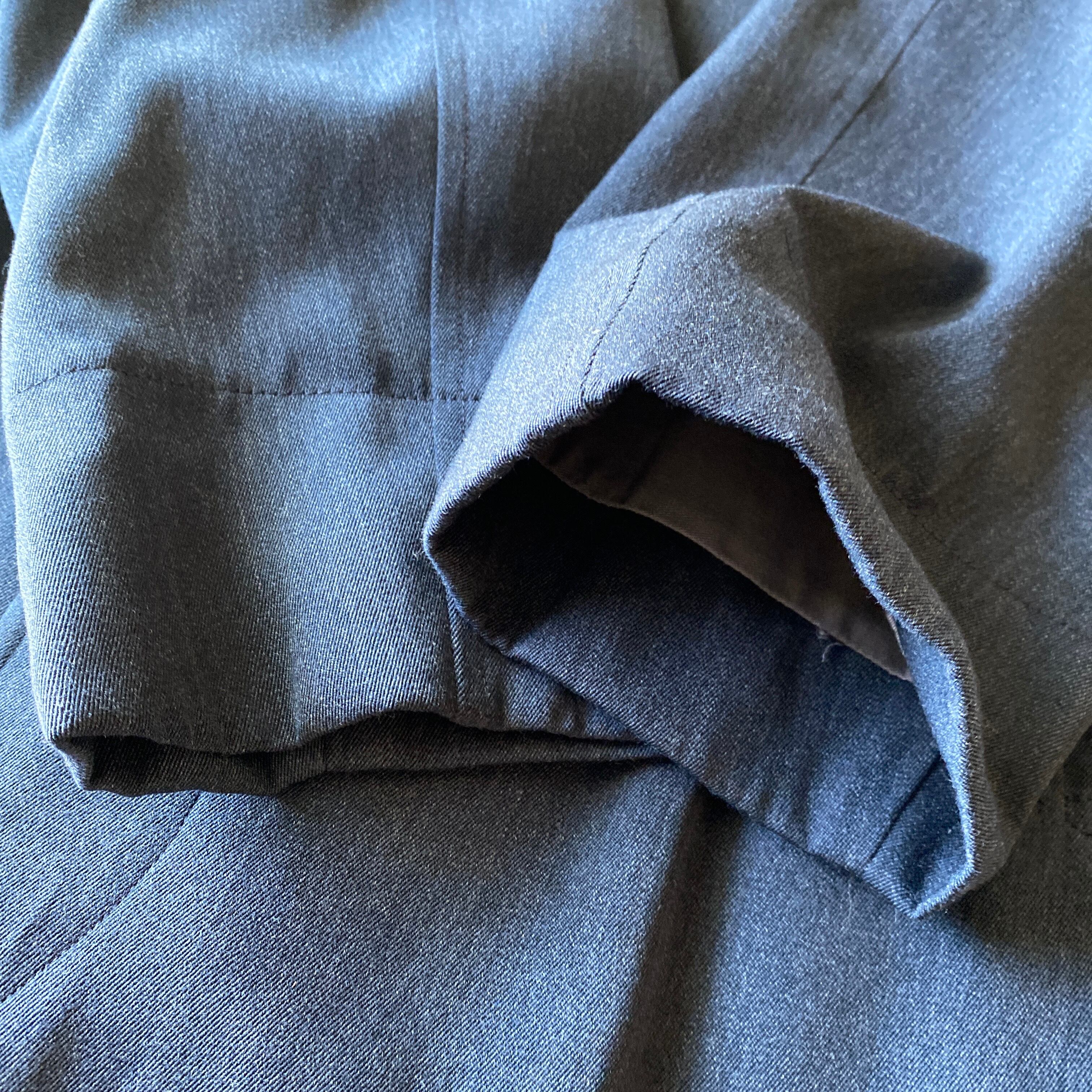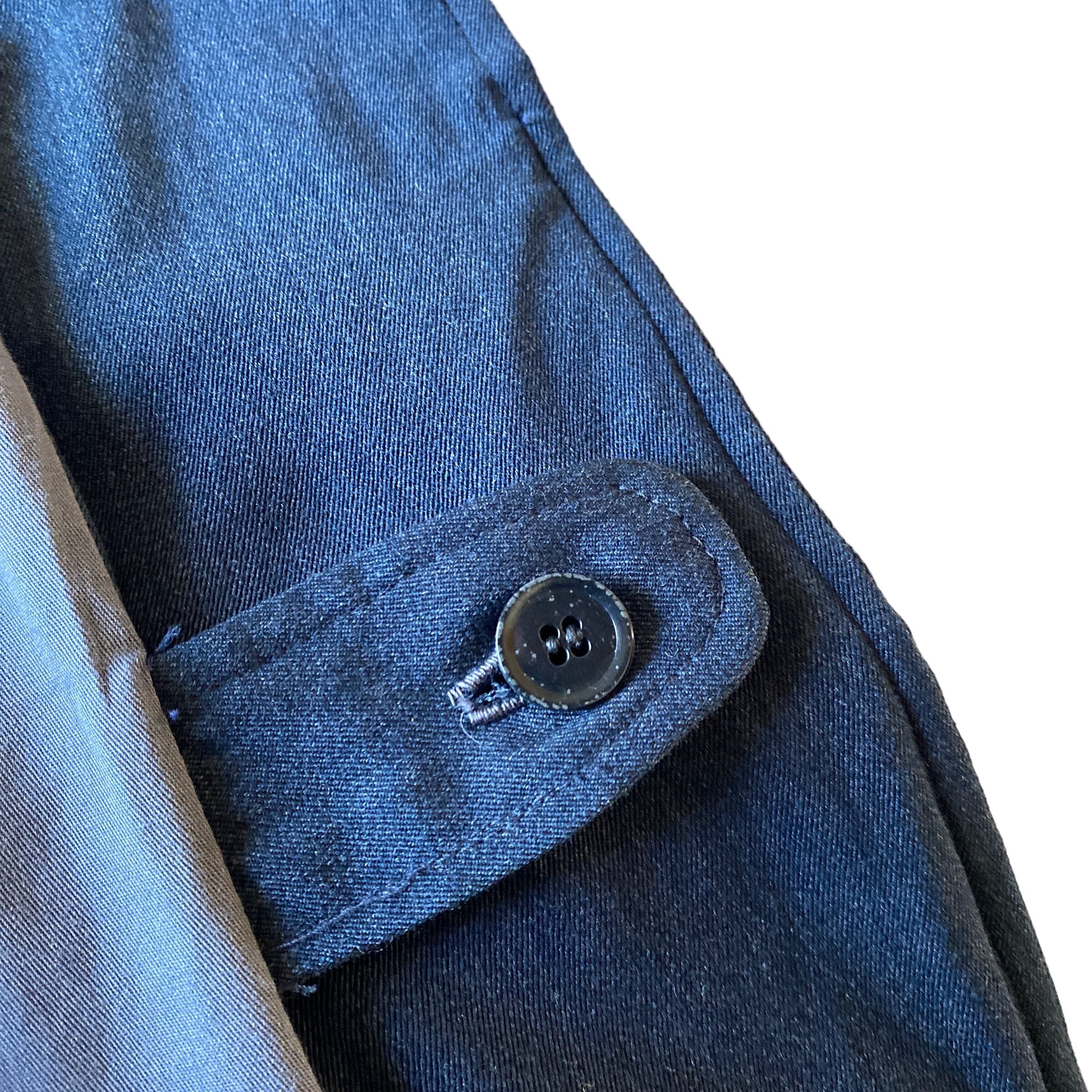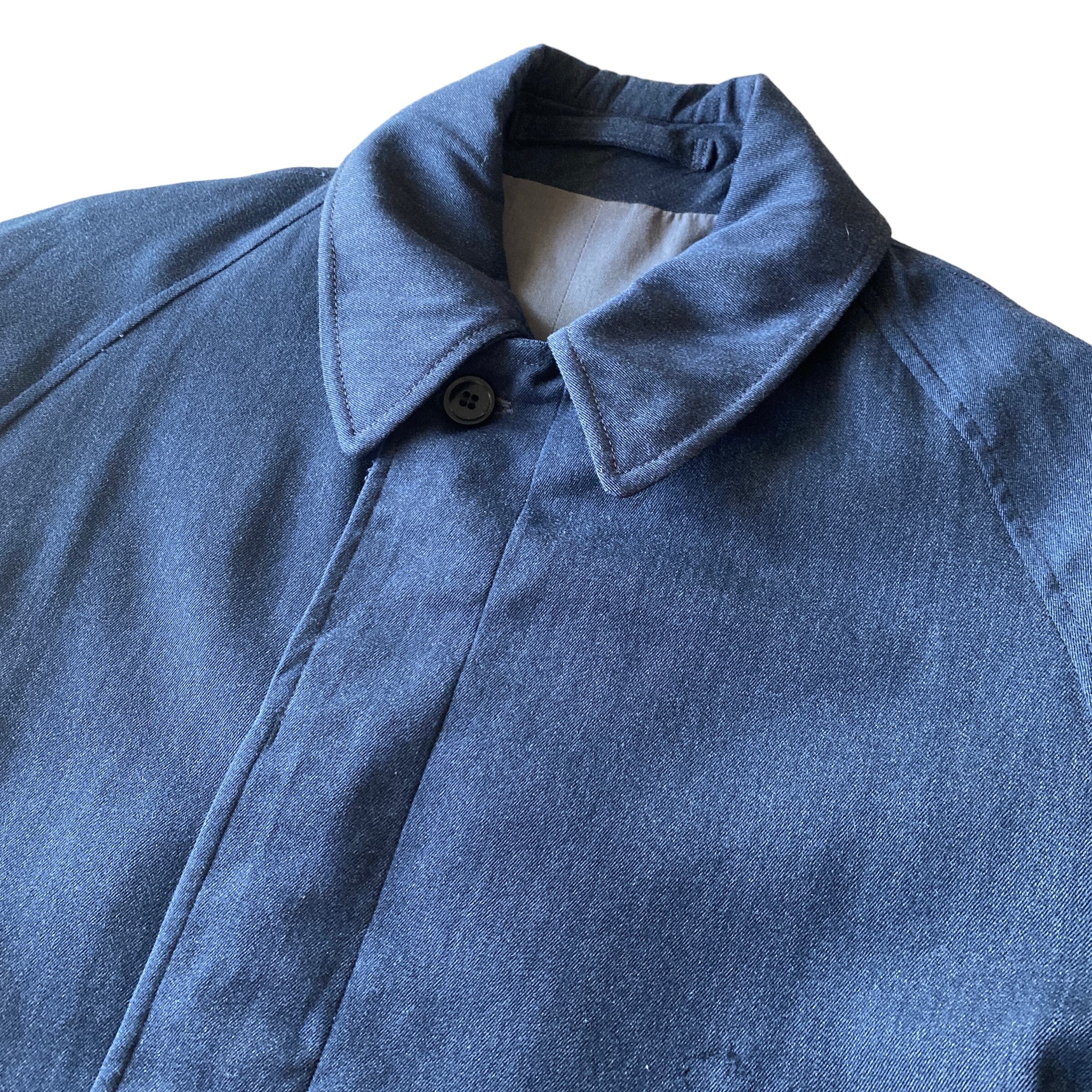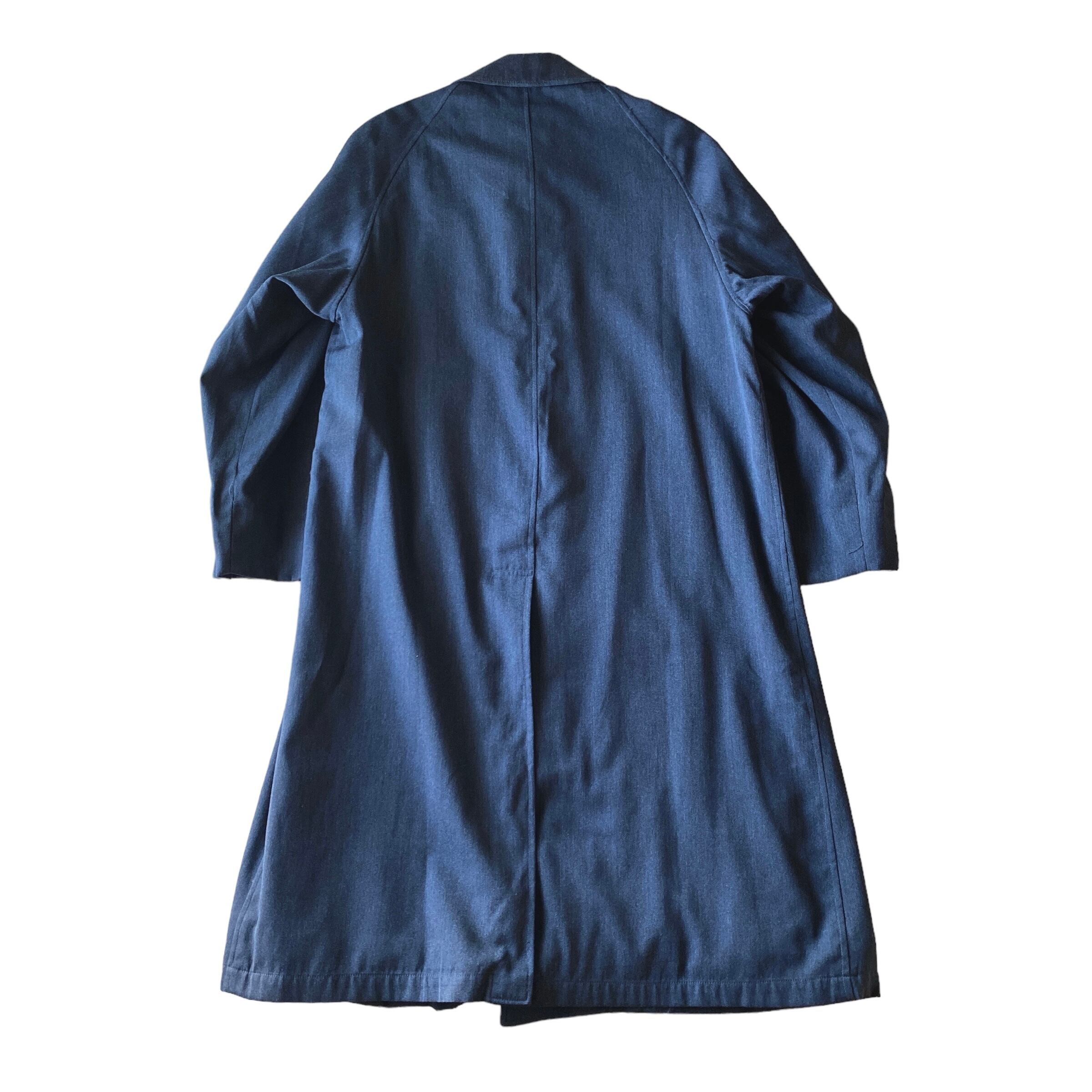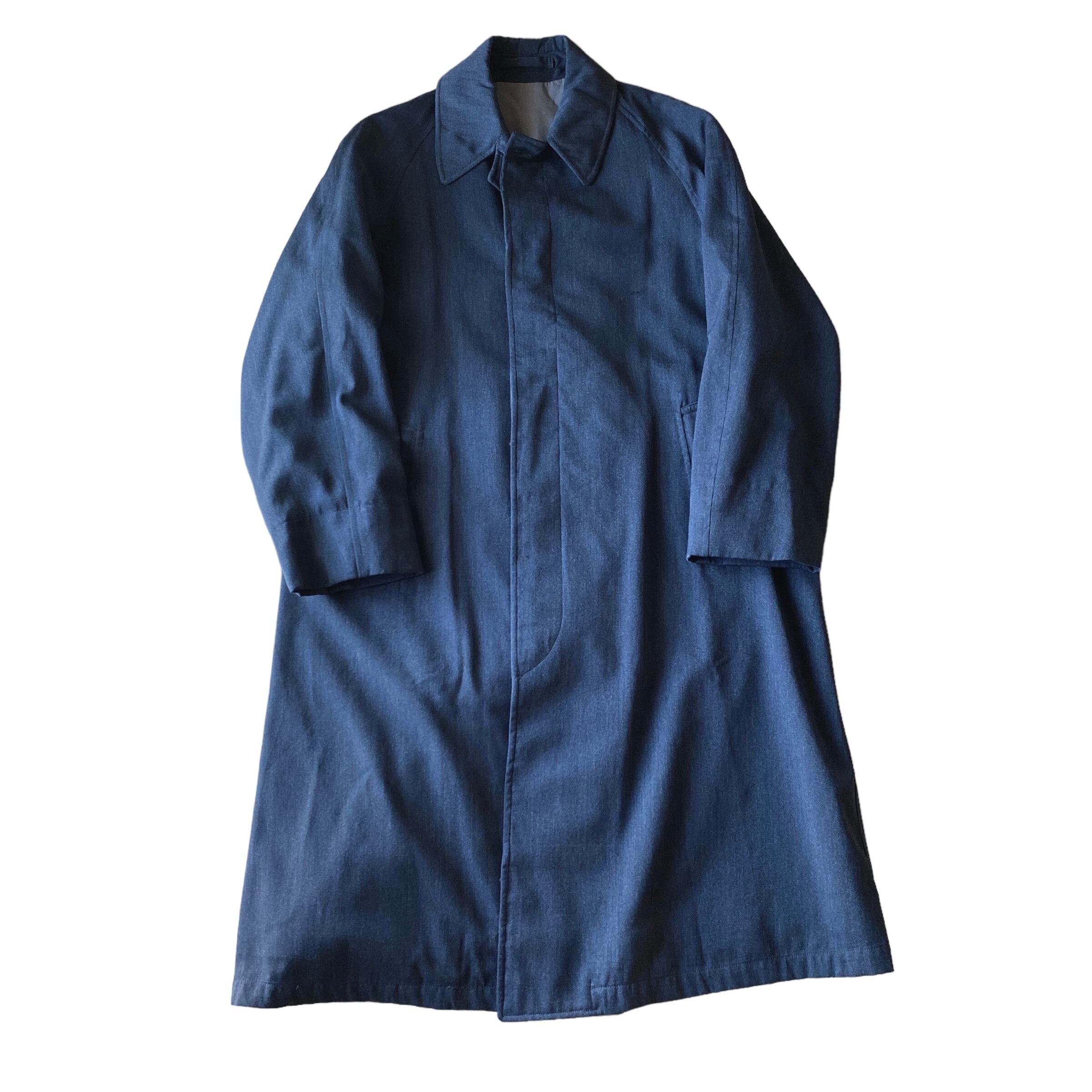 暗めのブルーにグレーを混ぜたような、中々珍しい杢ブルーカラー(着画が近いです)に、古いレインコートによくある、ギュッと目の詰まった上質なウールギャバ素材が素晴らしい一着。