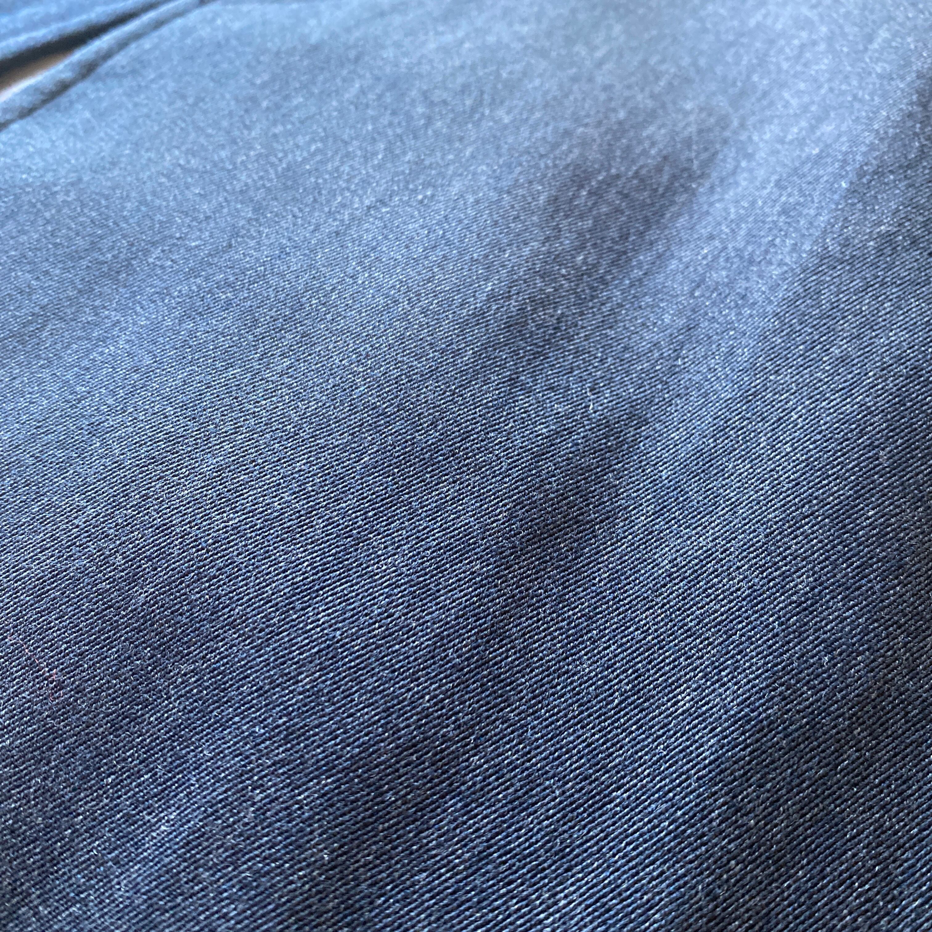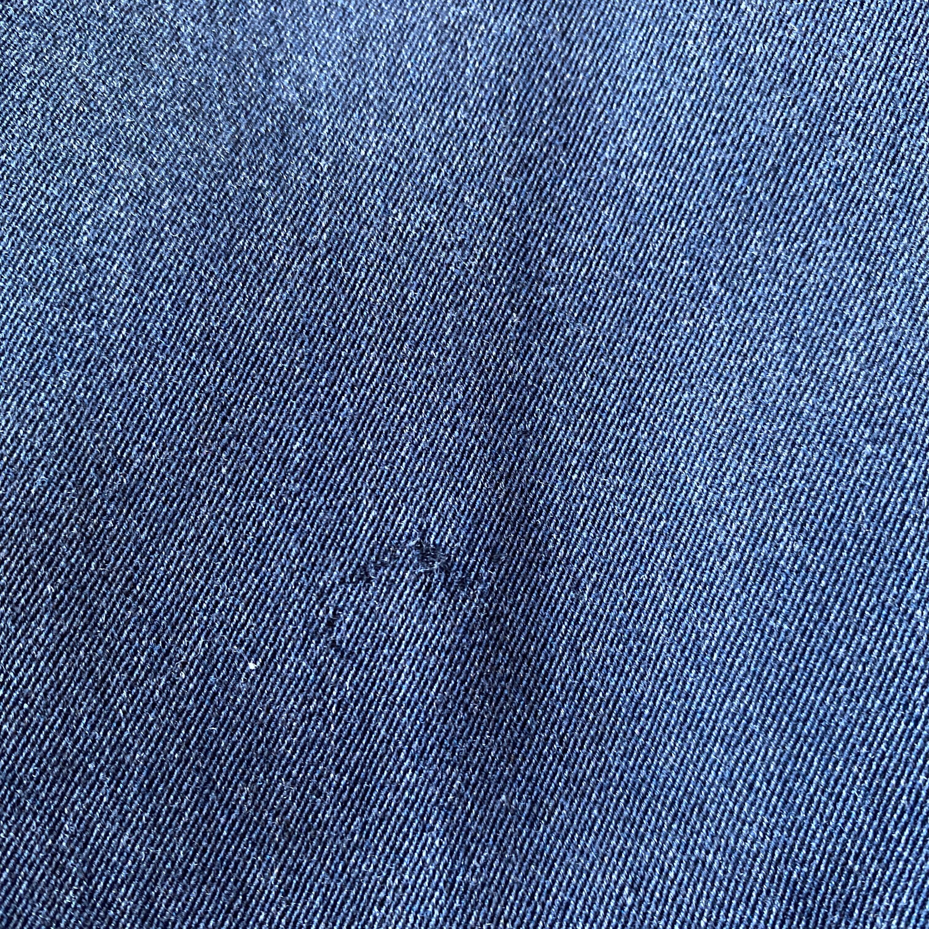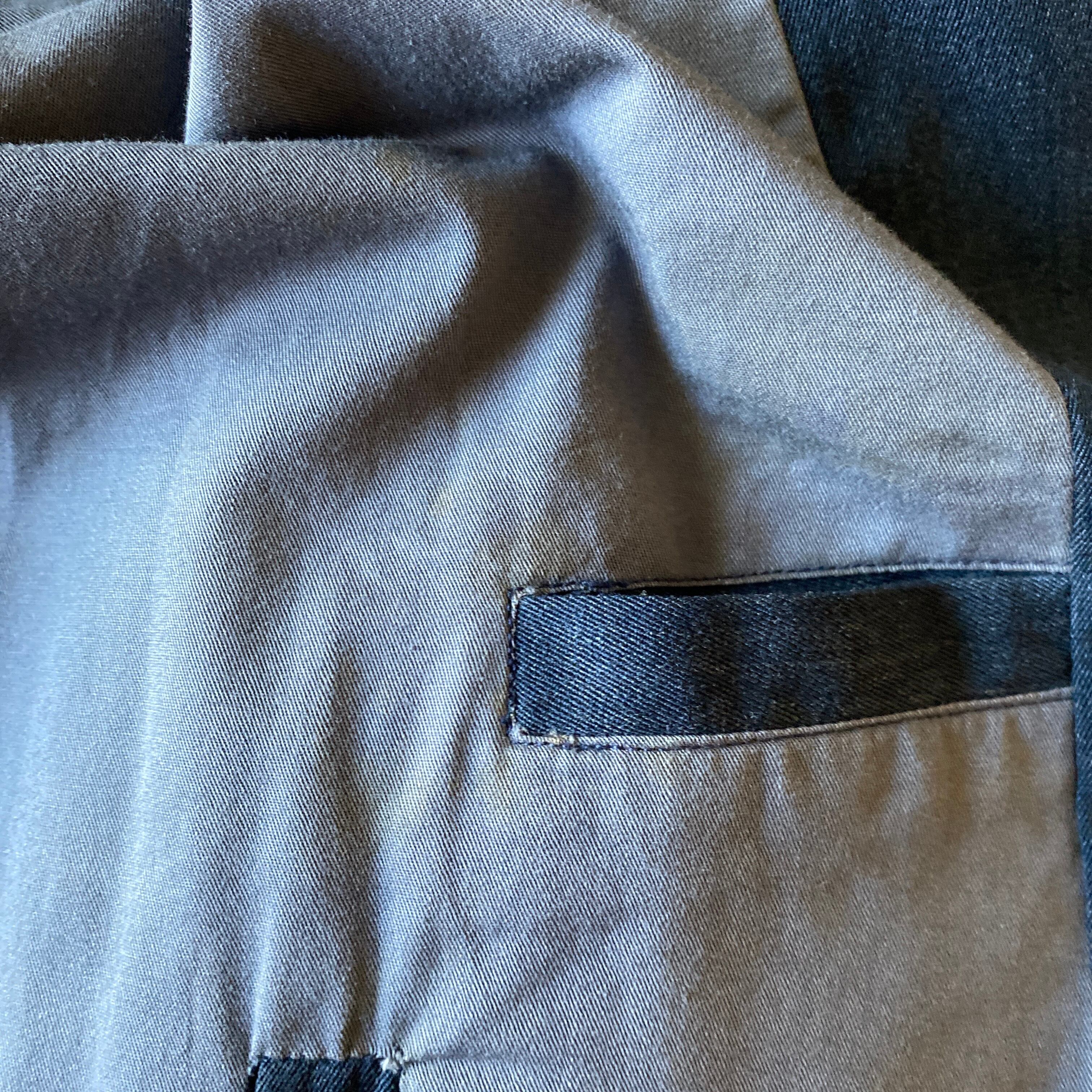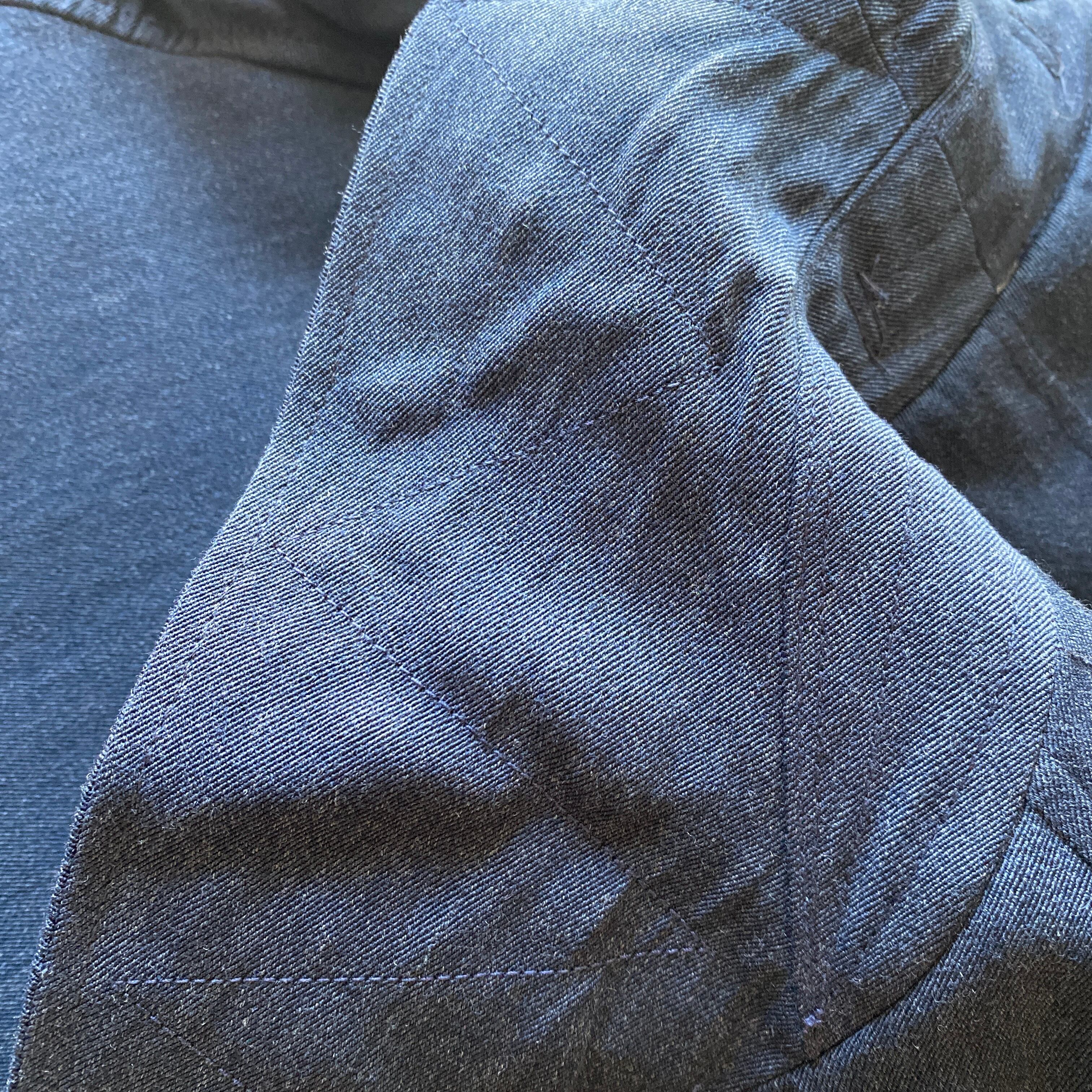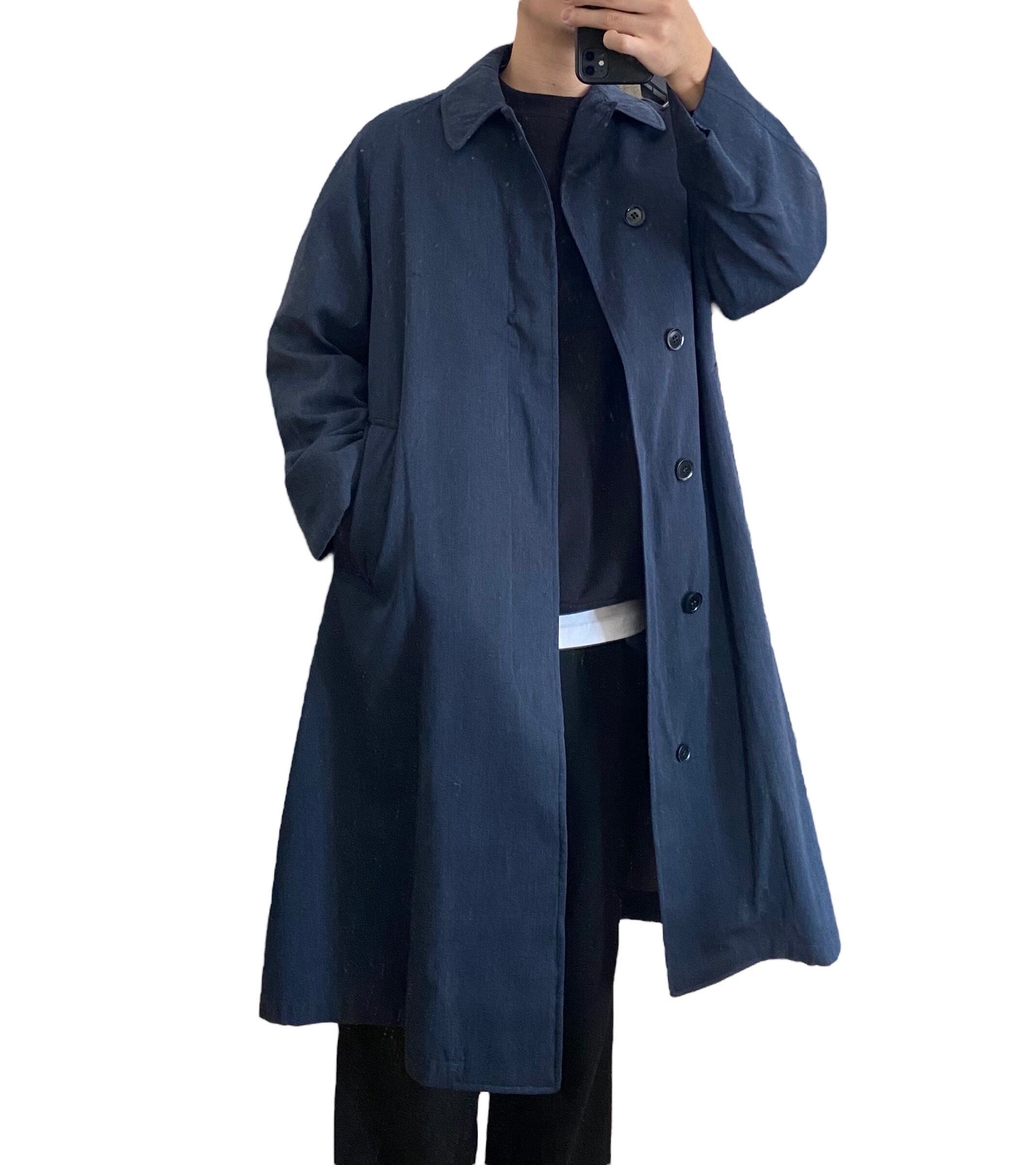 暗めのブルーにグレーを混ぜたような、中々珍しい杢ブルーカラー(着画が近いです)に、古いレインコートによくある、ギュッと目の詰まった上質なウールギャバ素材が素晴らしい一着。