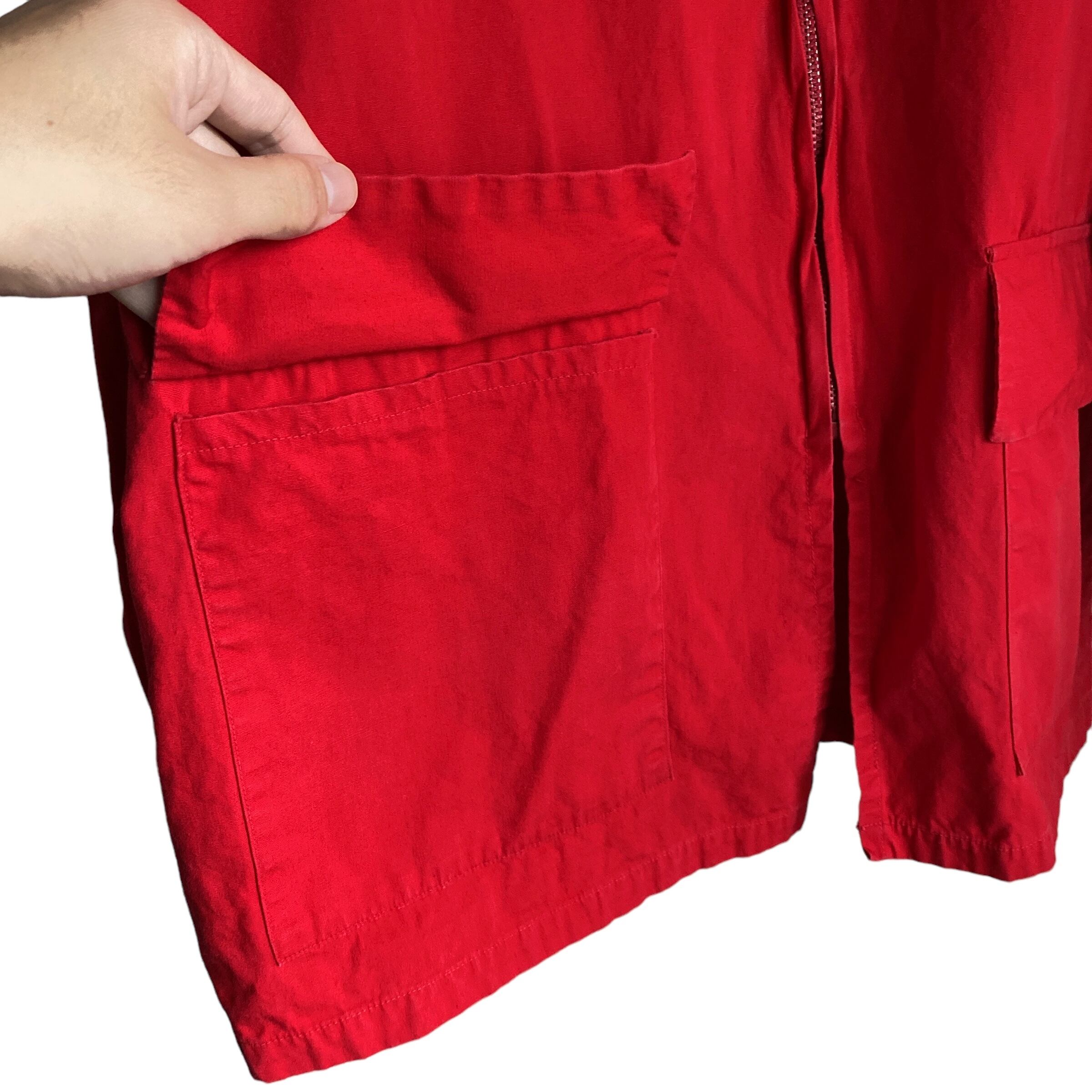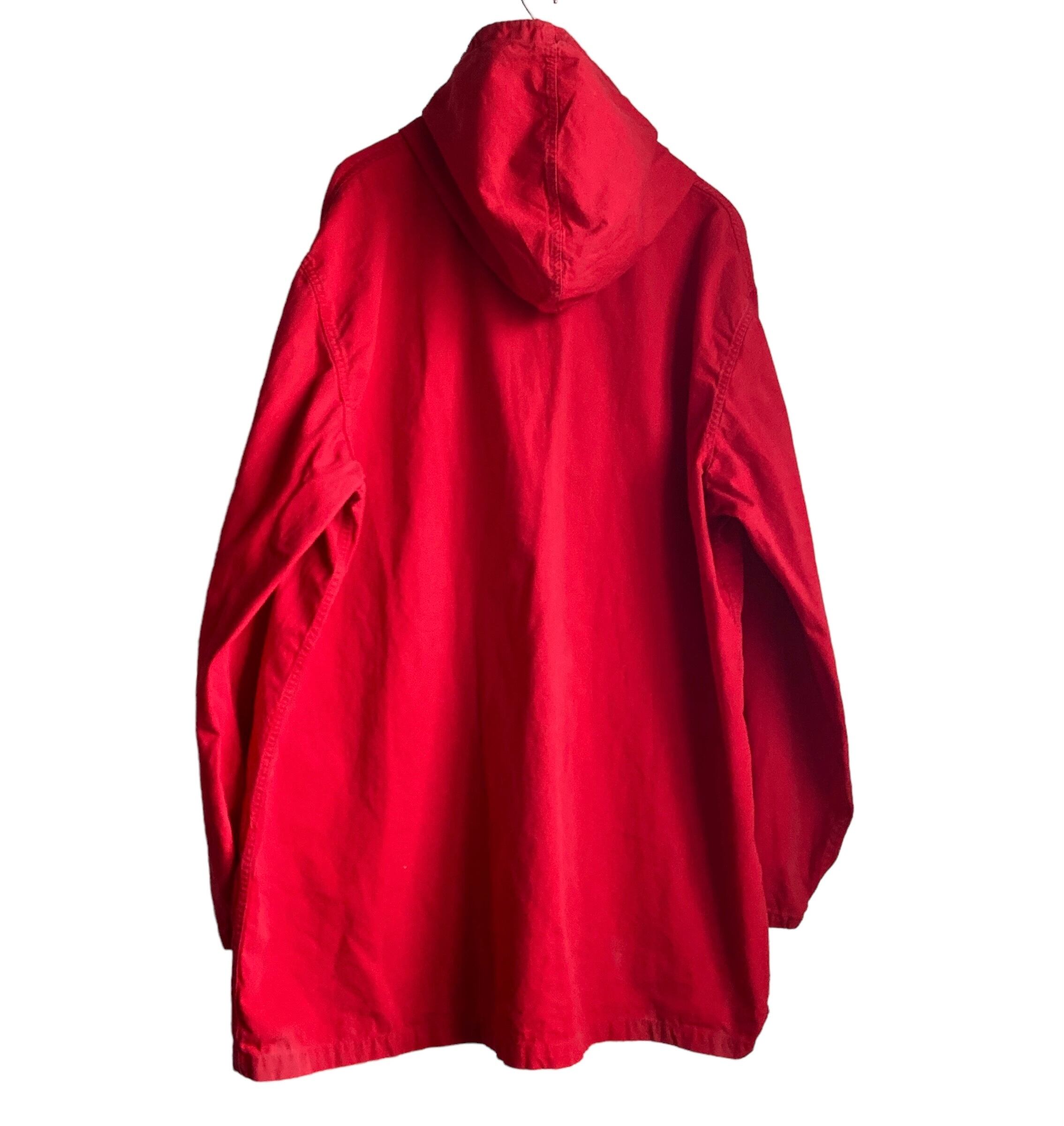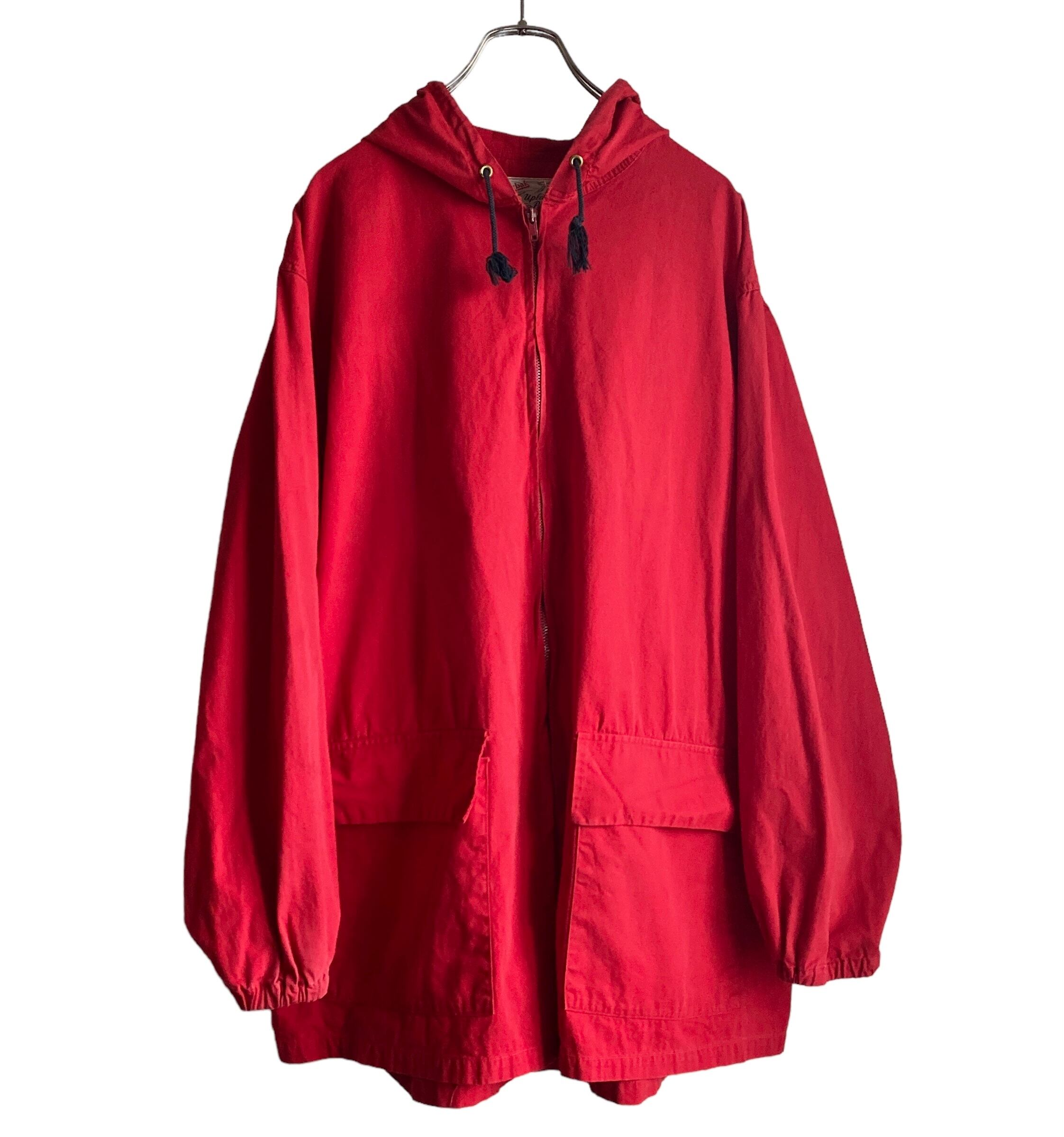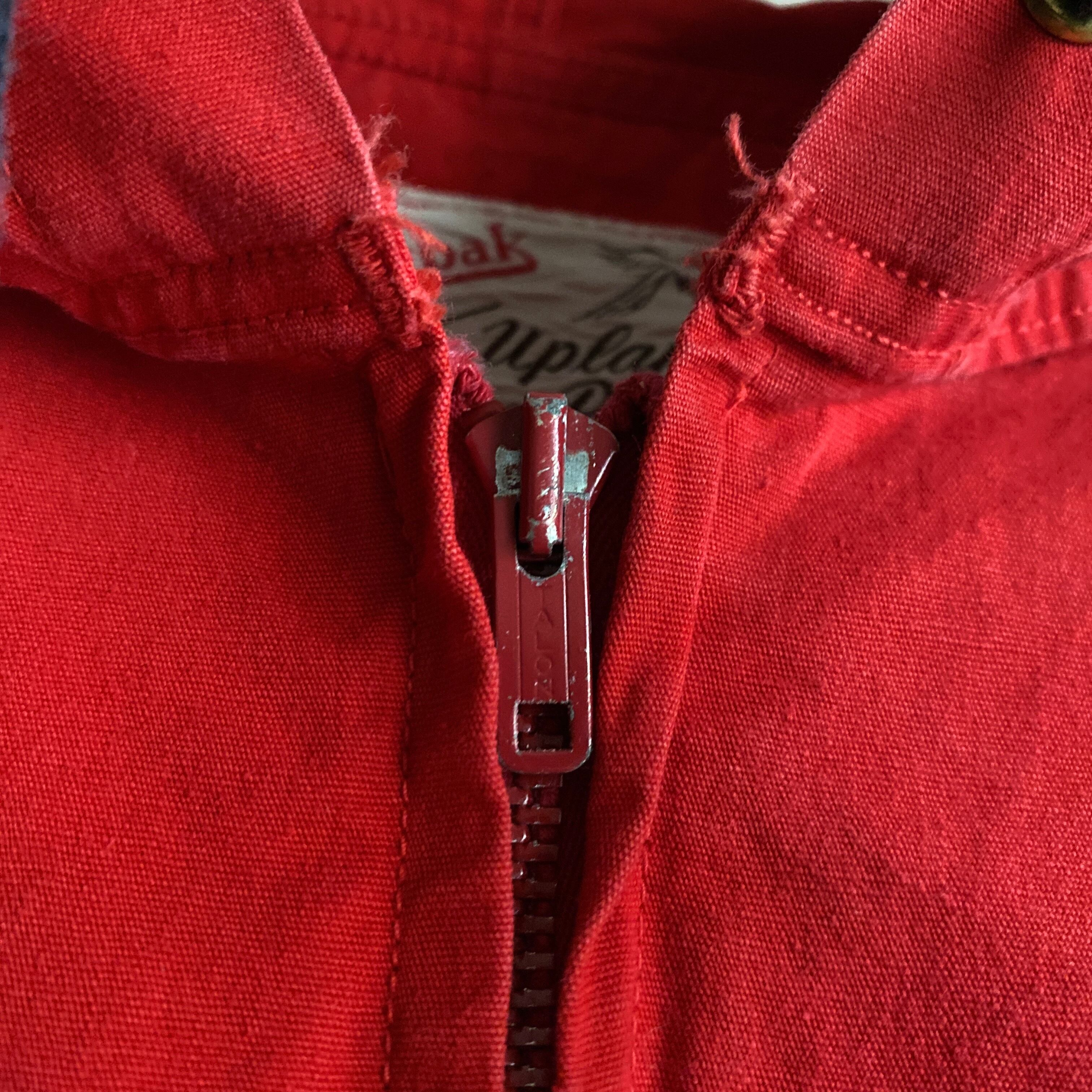 この年代特有のやや黒みがかったレッドが程よくフェードした雰囲気抜群の色目に(写真よりいくらかパキッとしてないです。ジッパー写真の感じが近いような)、アップランドポプリンというduxbakでは有名な目の詰まったコットン生地、珍しいフルジップタイプデザインが非常に格好良い一着。