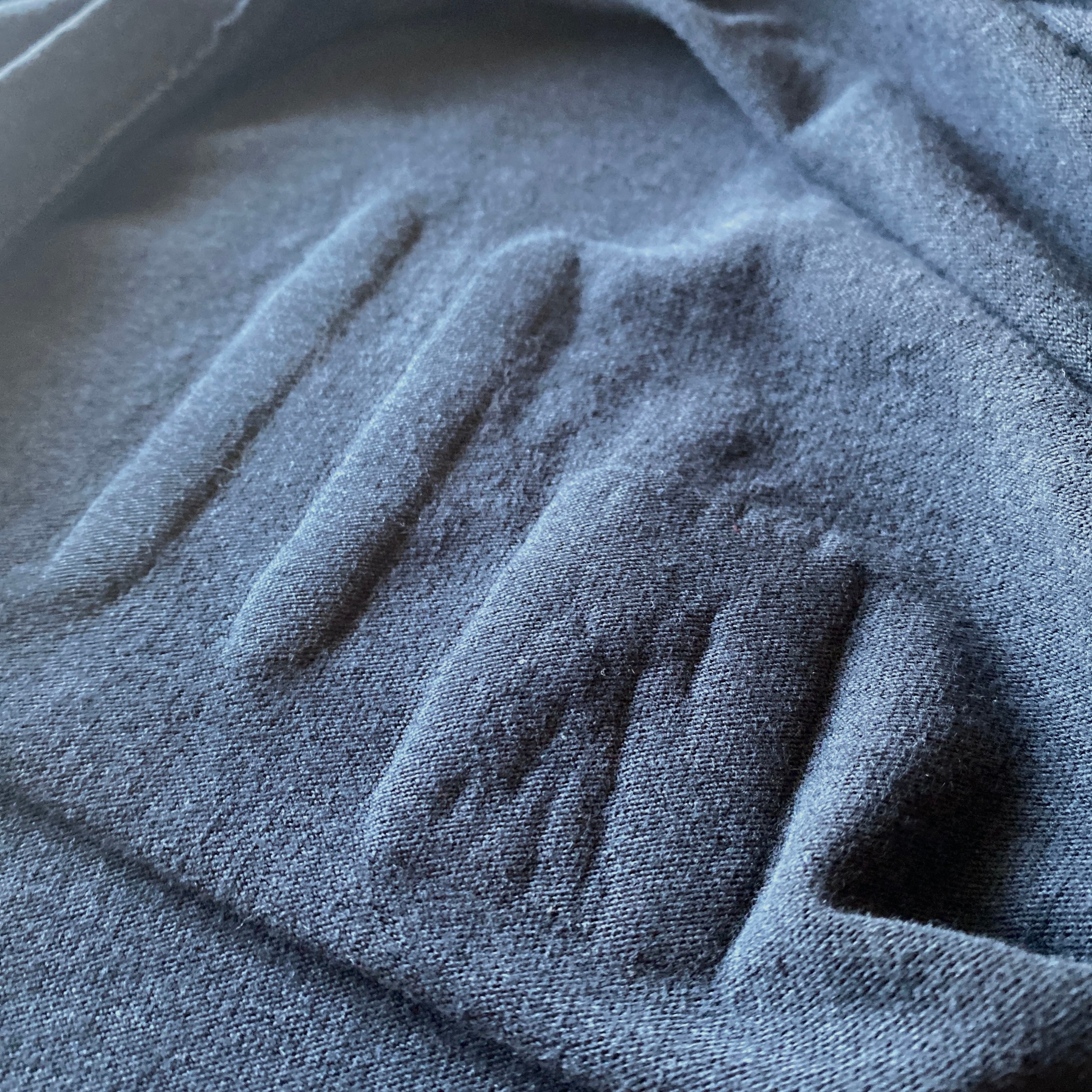 程よくフェードの効いたブラックボディにブルー×ホワイトのアート感のあるプリントが素晴らしい一着。