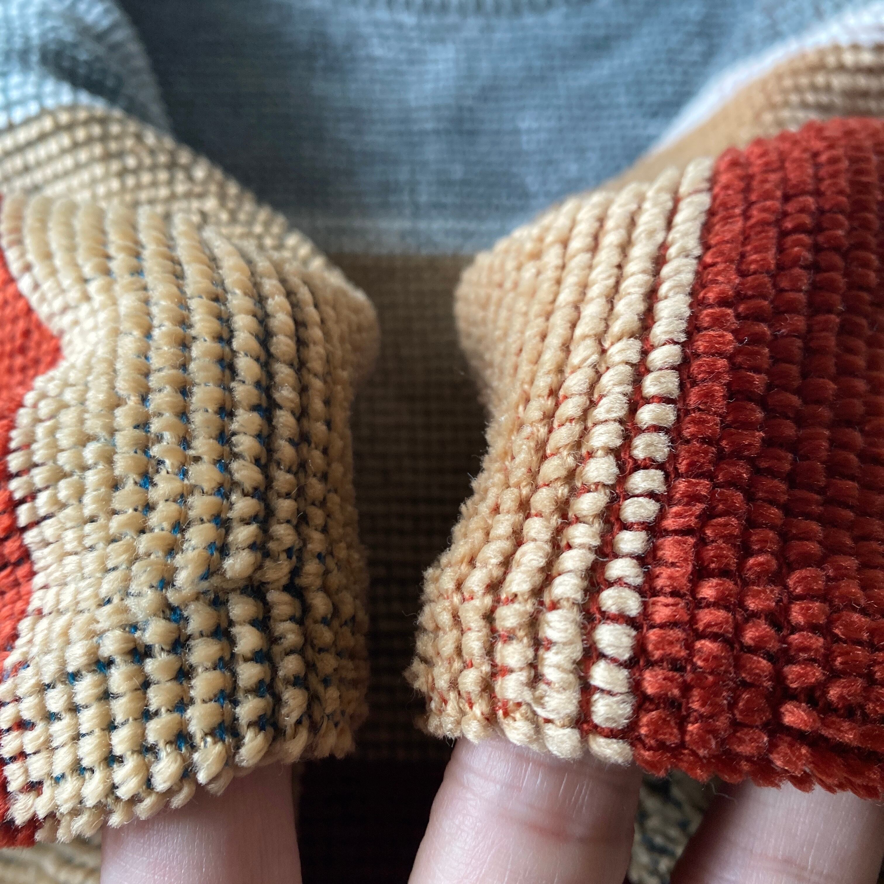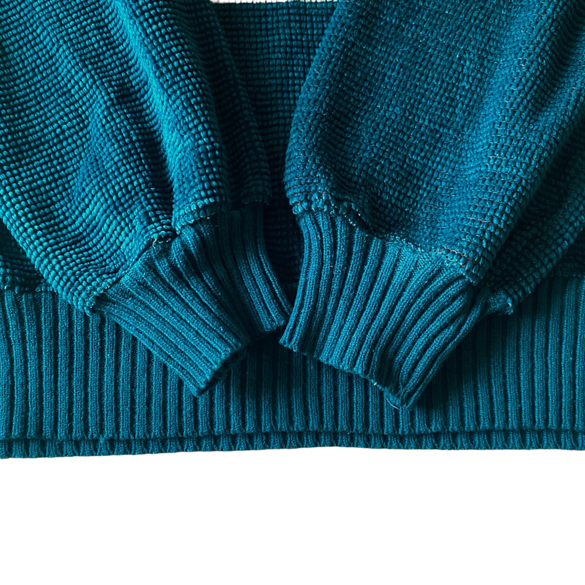 マルチボーダーでカジュアルな雰囲気がありつつも、どこか上品さを感じる絶妙なカラーリング(ブルーの部分は画像5を参考にしてください)に、タオルのようなループ編みでベロア素材と個性のある風合い、ゆったりとした丸みのあるボックスシルエットが非常に格好良い一着。