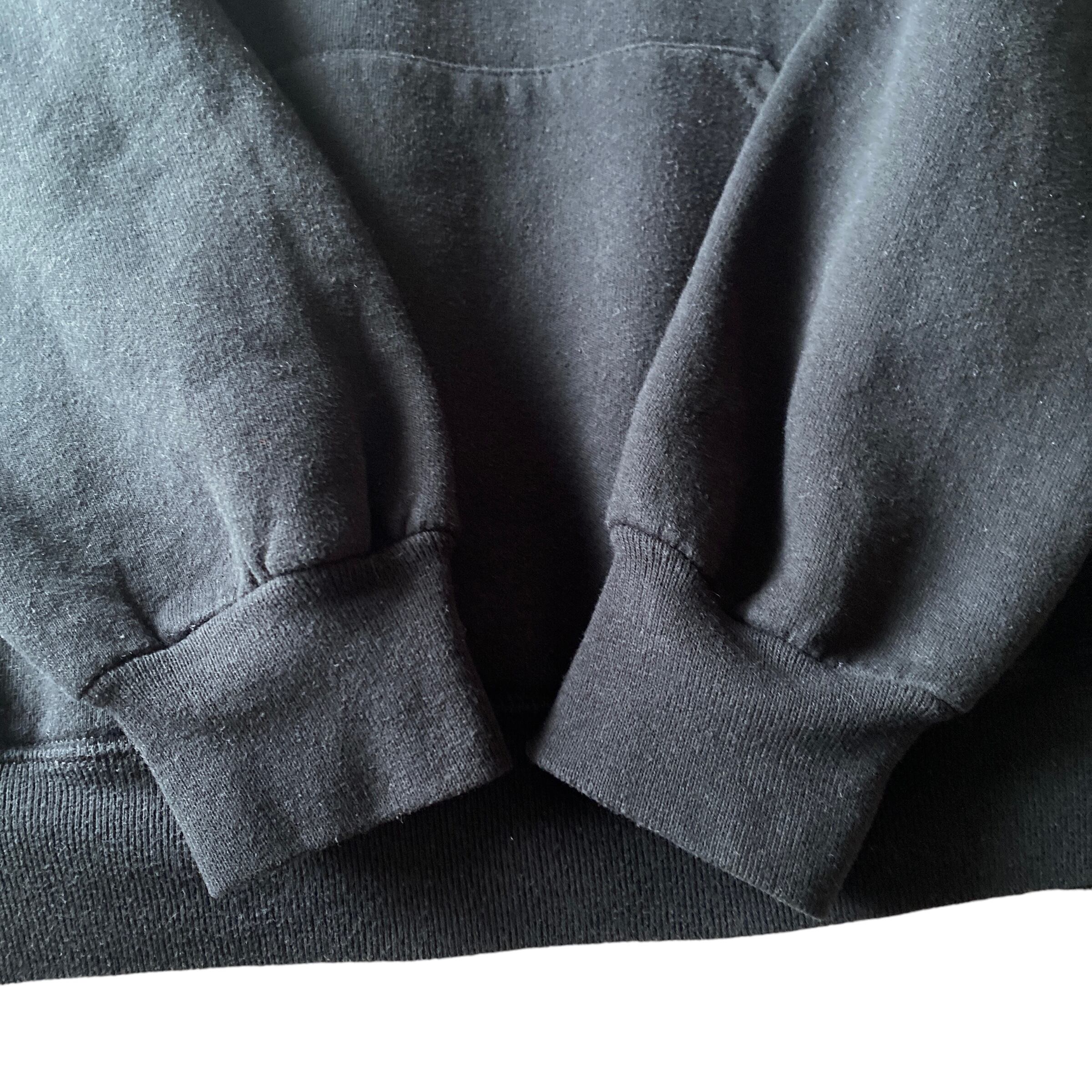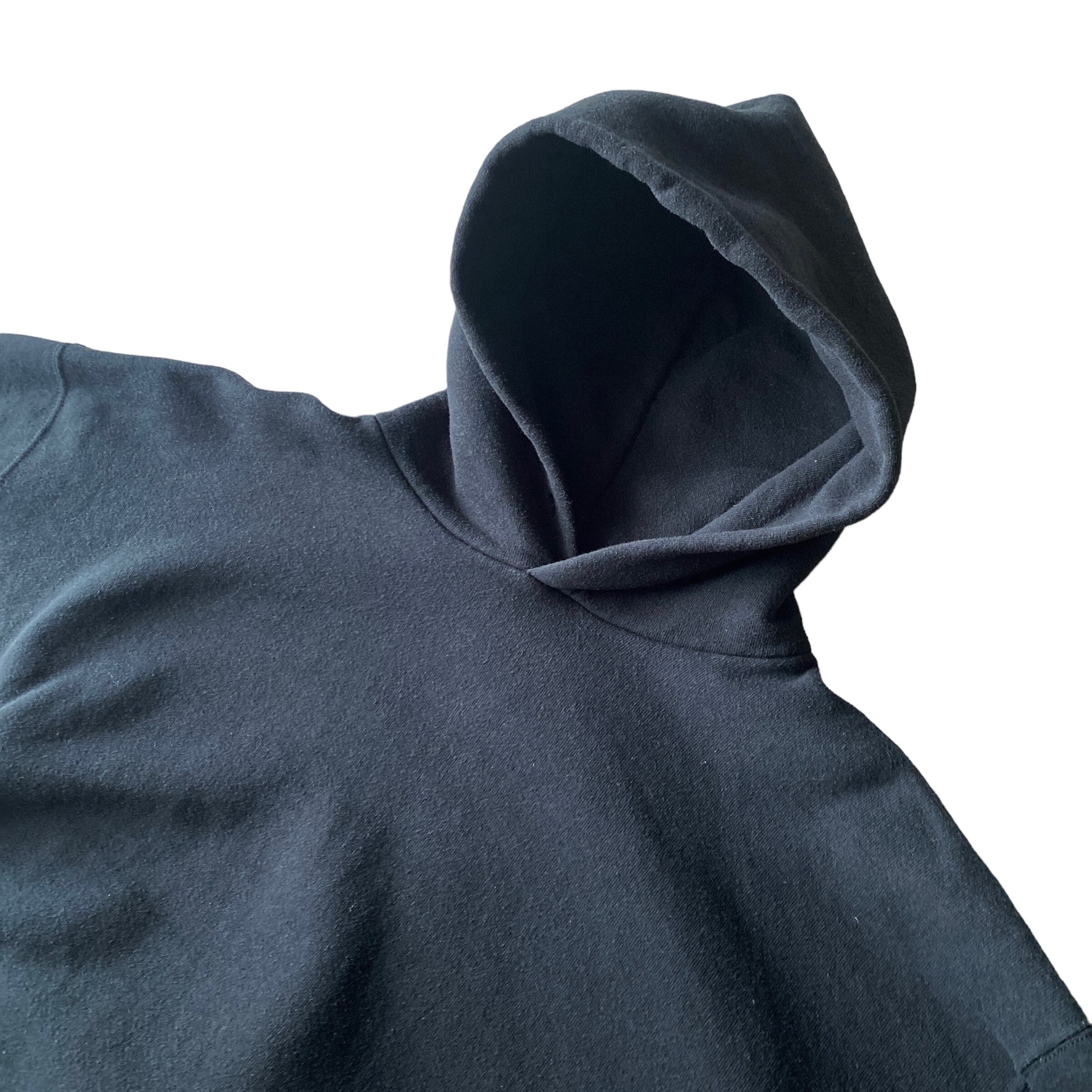 この年代のラッセル特有のハリのあるコットンポリの質感、やや色褪せた黒の色目、アメリカらしいコロンとした短丈ボックスシルエットに、しっかりと立ち上がるフードが非常に格好良い一着。