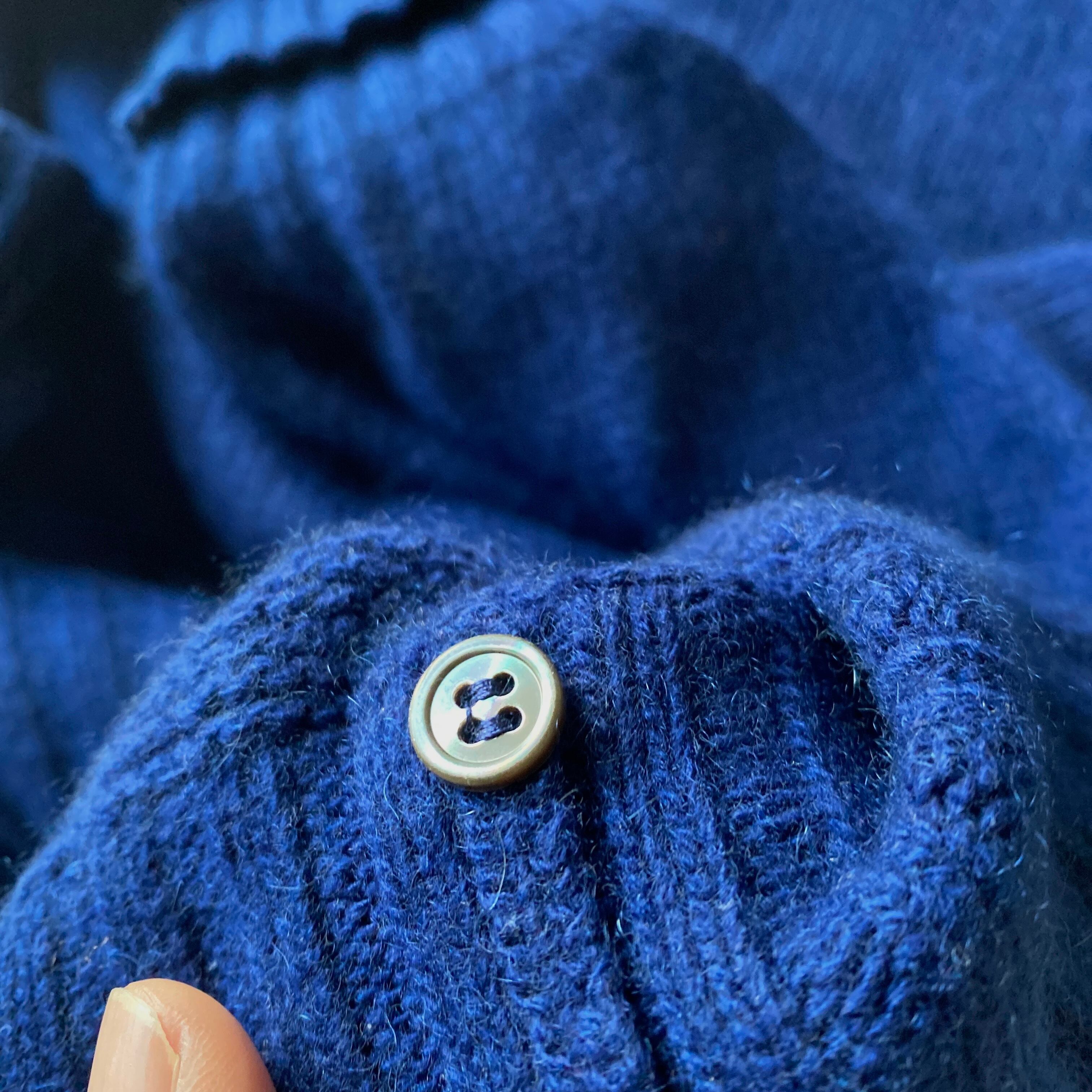 超肉厚でトロフワな質感の極上カシミヤ素材に、美しいダークブルーカラー(画像9が割と近いです)が大変素晴らしい一着。(バランタインなどの硬めの質感とは違い、ジェラートピケのパジャマのようなフワフワな質感。過剰表現ではなくとんでもなく質が良いです。)