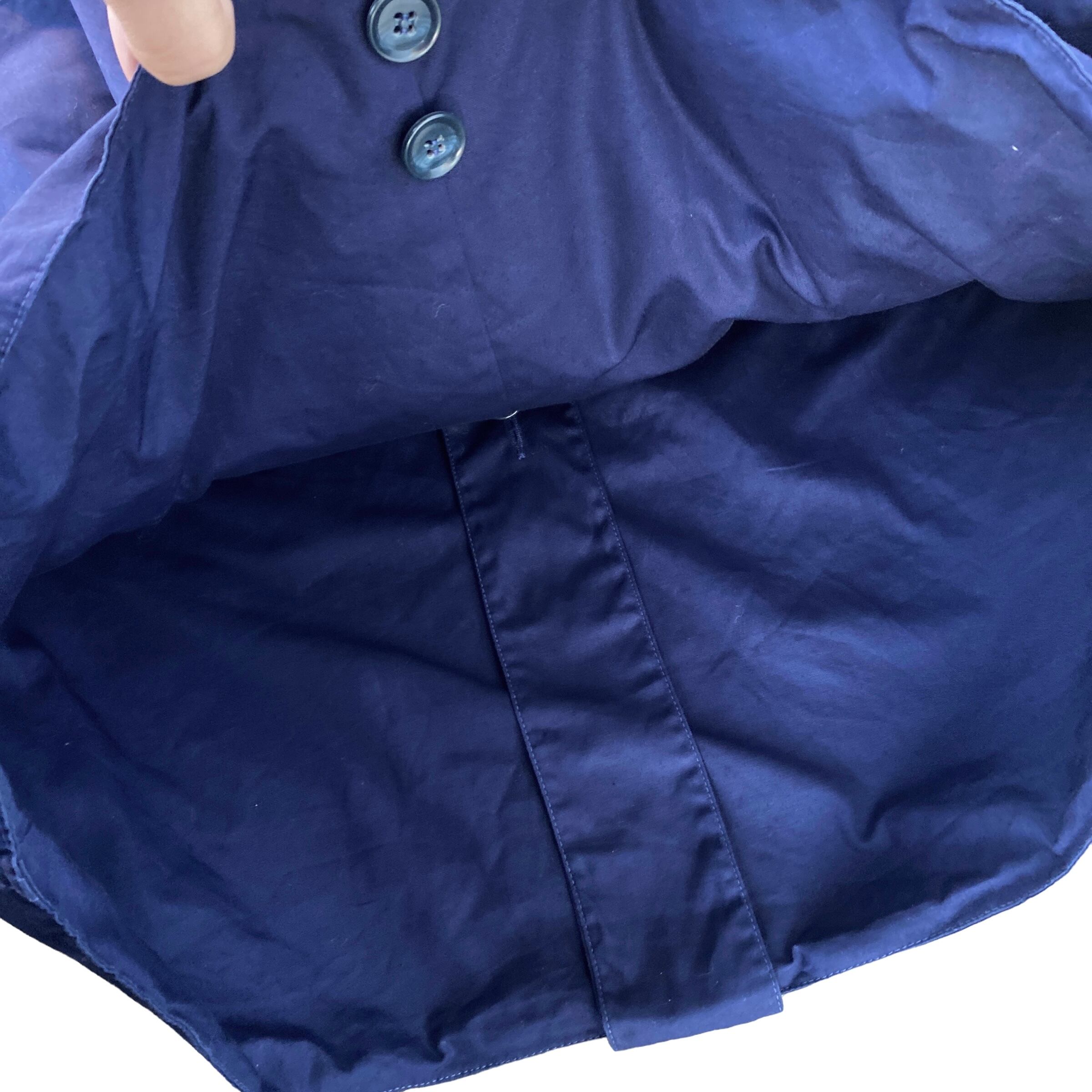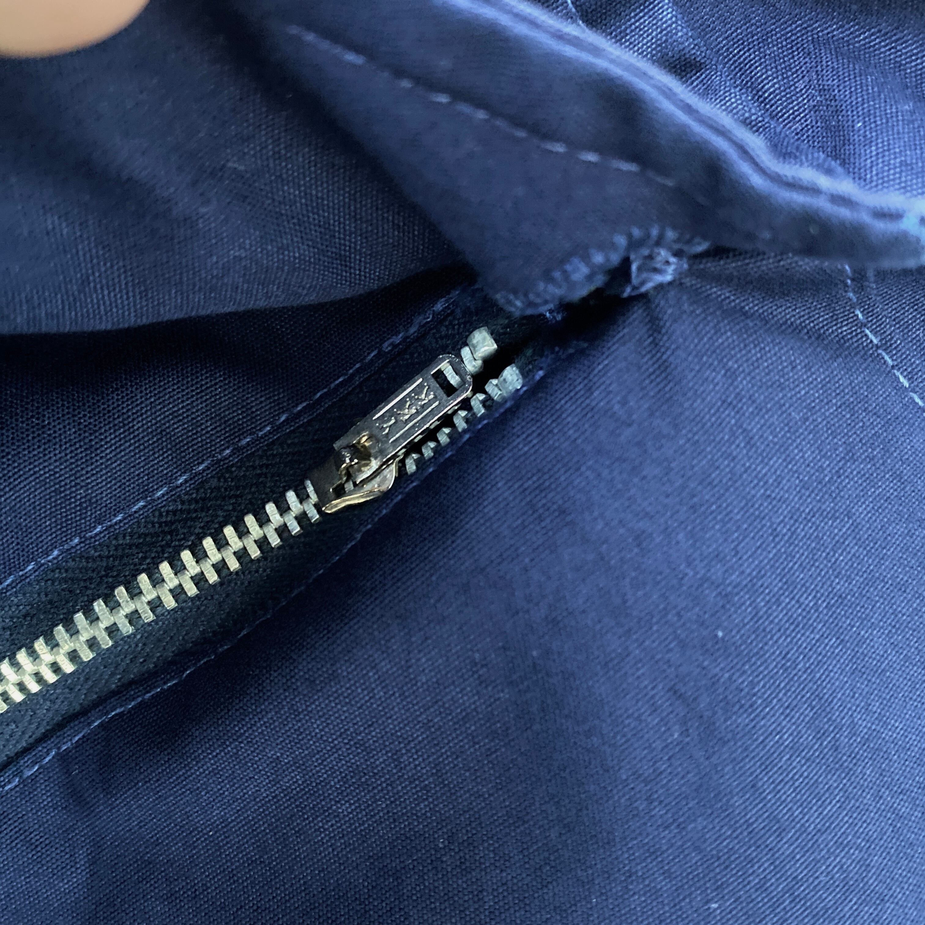 おそらくコットン100 (多少ポリがかんでいるかも)のやや地厚でハリ感のあるポプリン生地に、茄子紺みのある上品な色目が非常に格好良い一着。