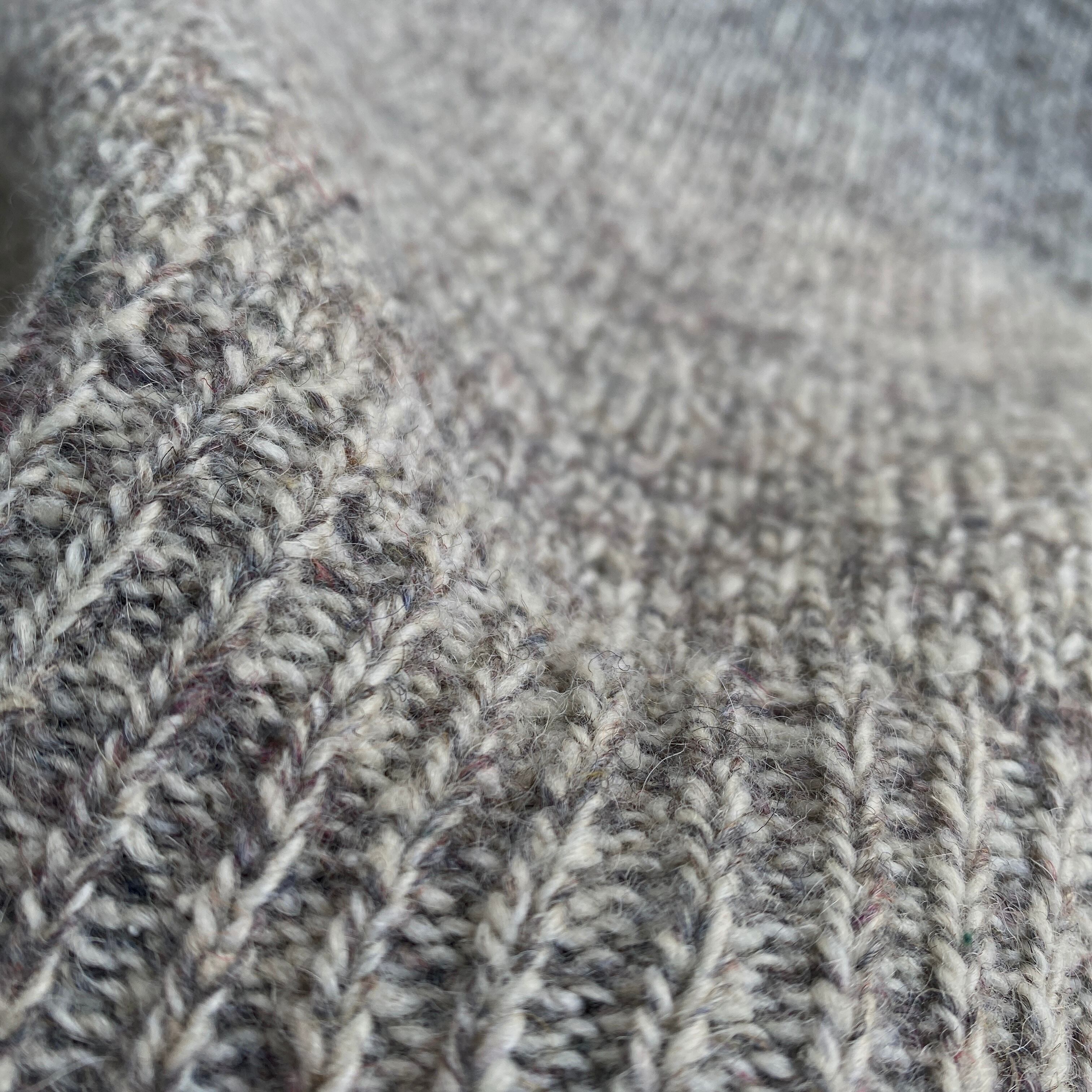 サクフワな質感の上質なニット地に、ナチュラル×グレーにほんのりと赤系の糸が入った、奥行きのある非常に上品な雰囲気の一着。