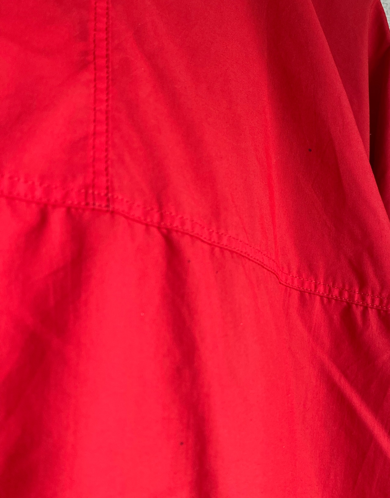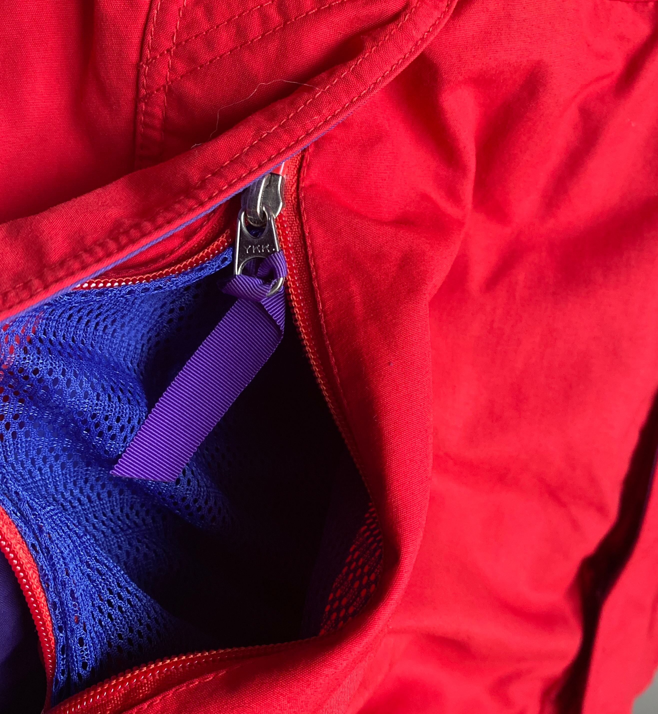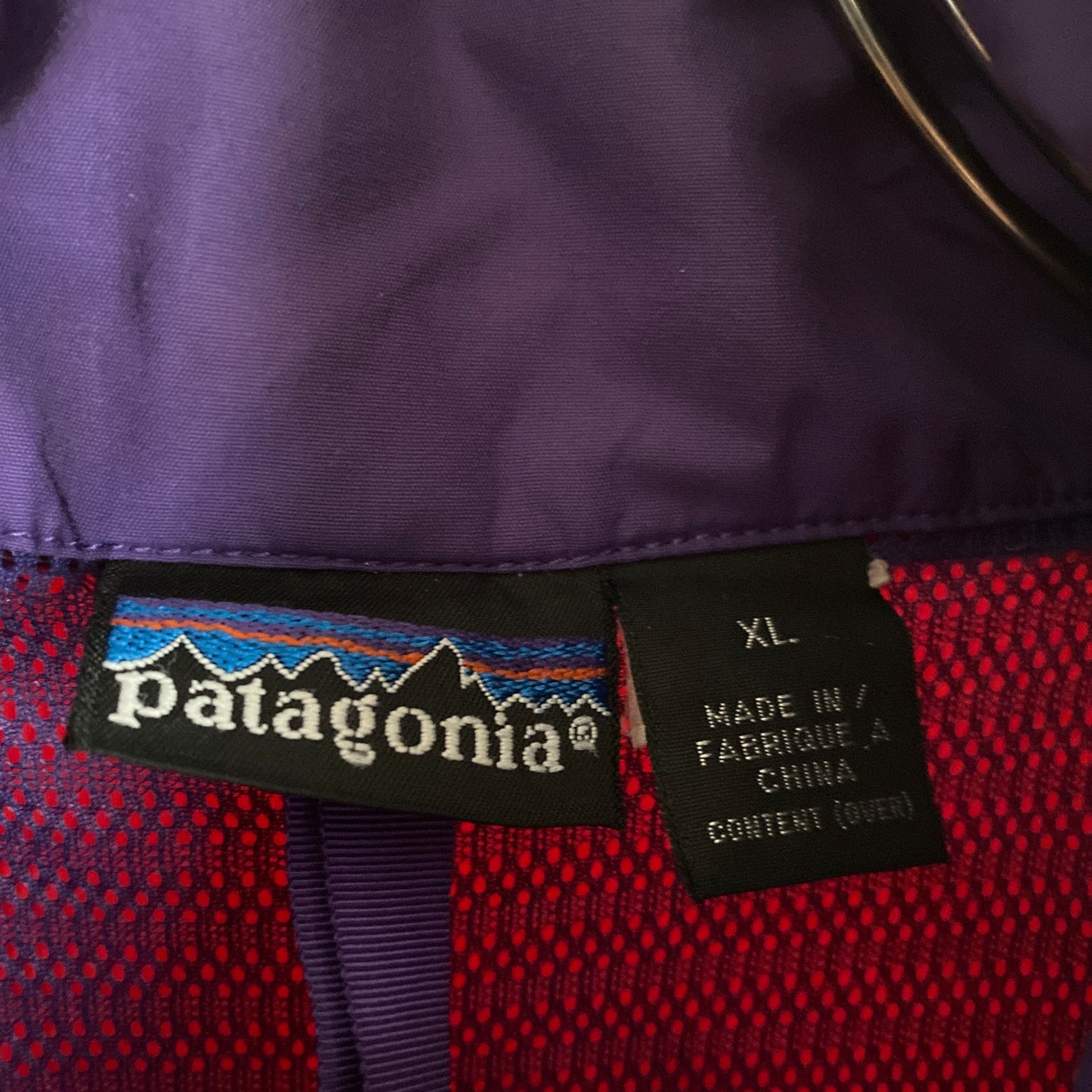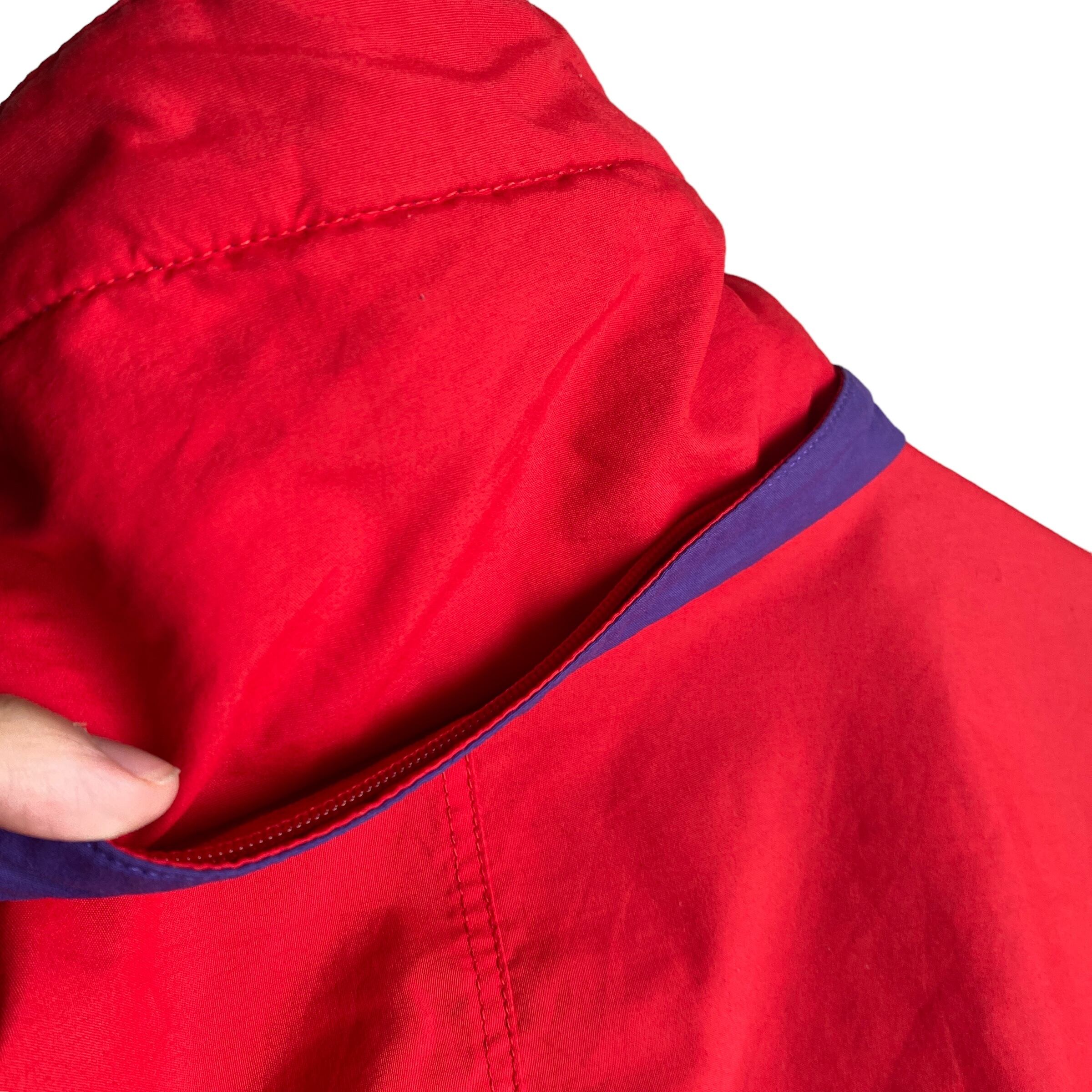 この年代のパタゴニアらしい、レッド×パープルのレトロな配色に、イナタイ雰囲気のシルエットがかわいい一着。