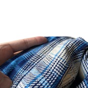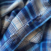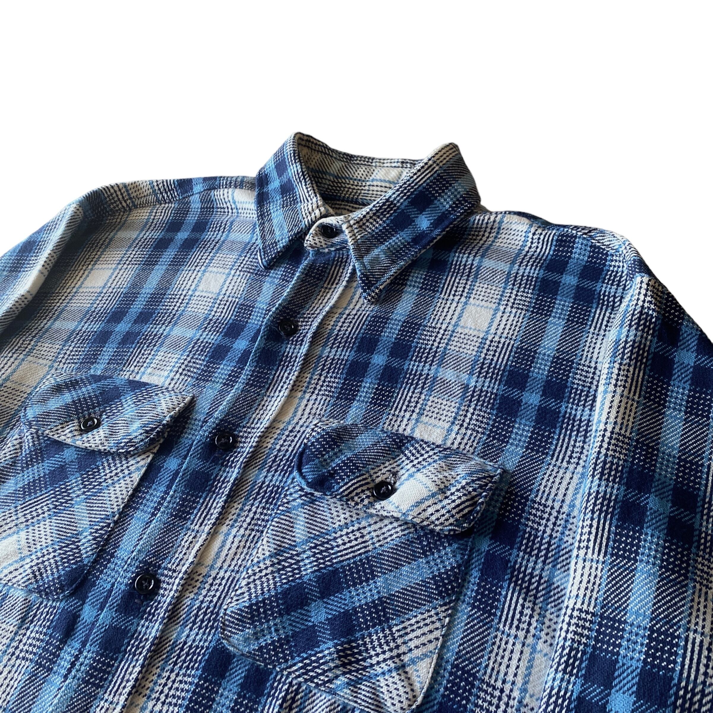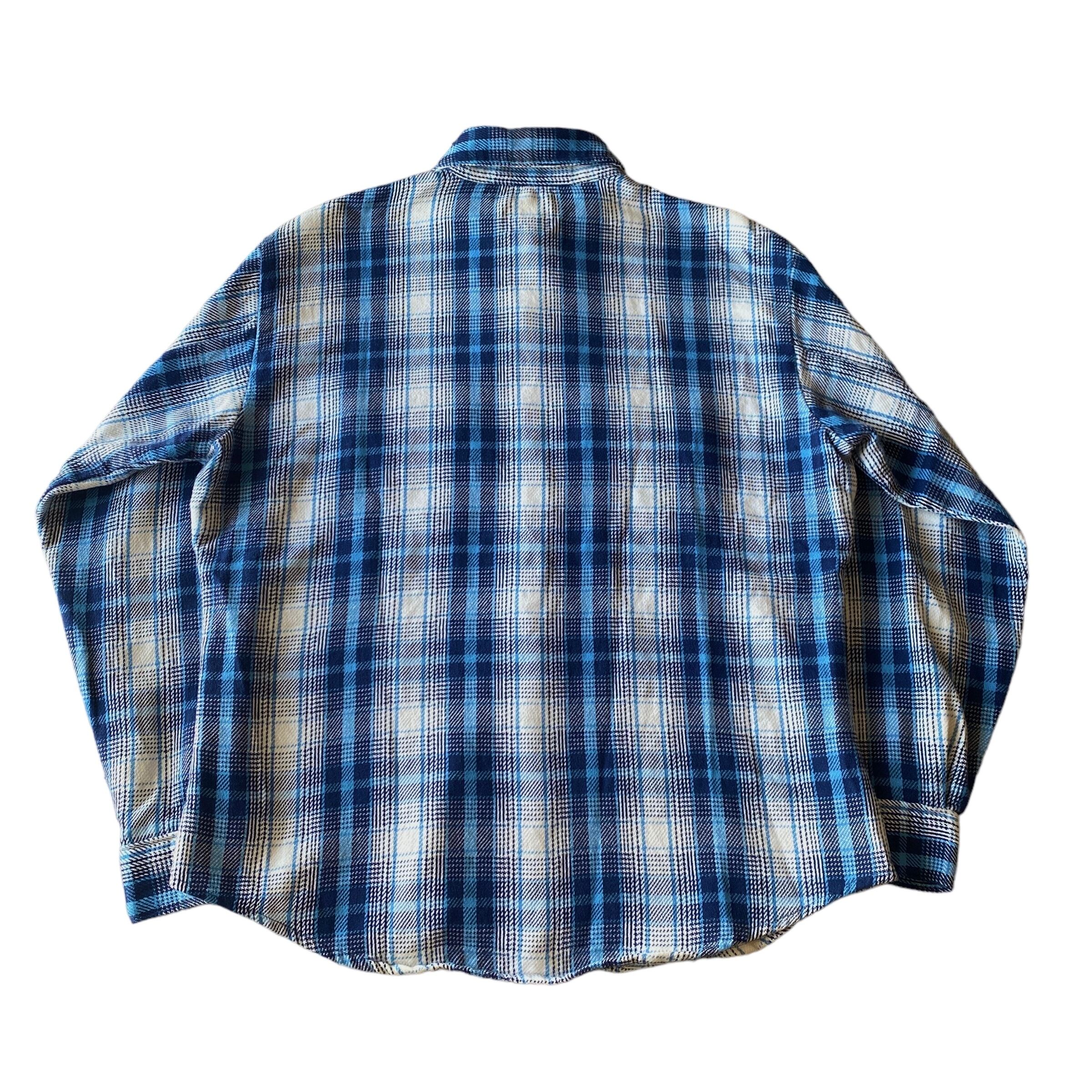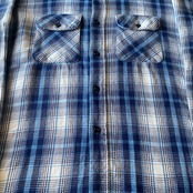 肉厚でモチっとしたコットンネル素材に、ネイビー×ブルー×ホワイトのオンブレチェックパターンが非常に格好良い一着。