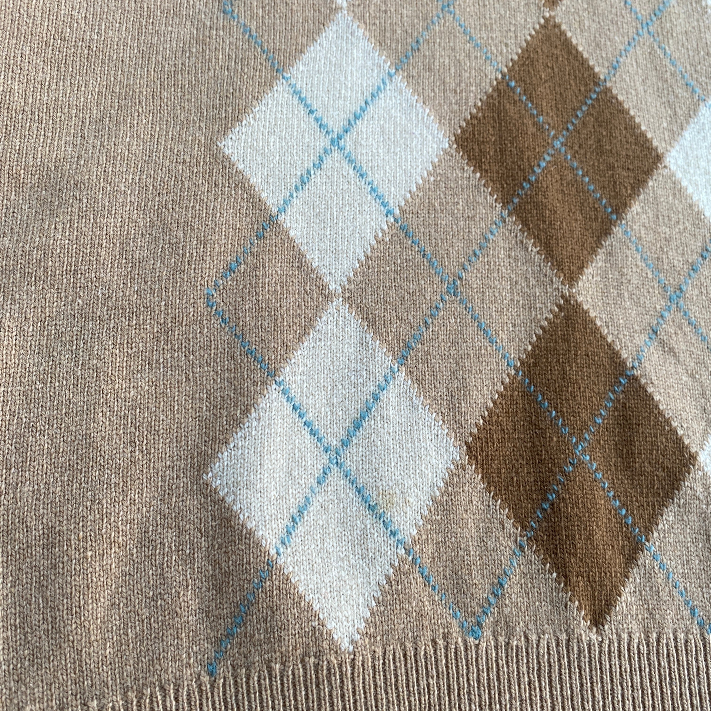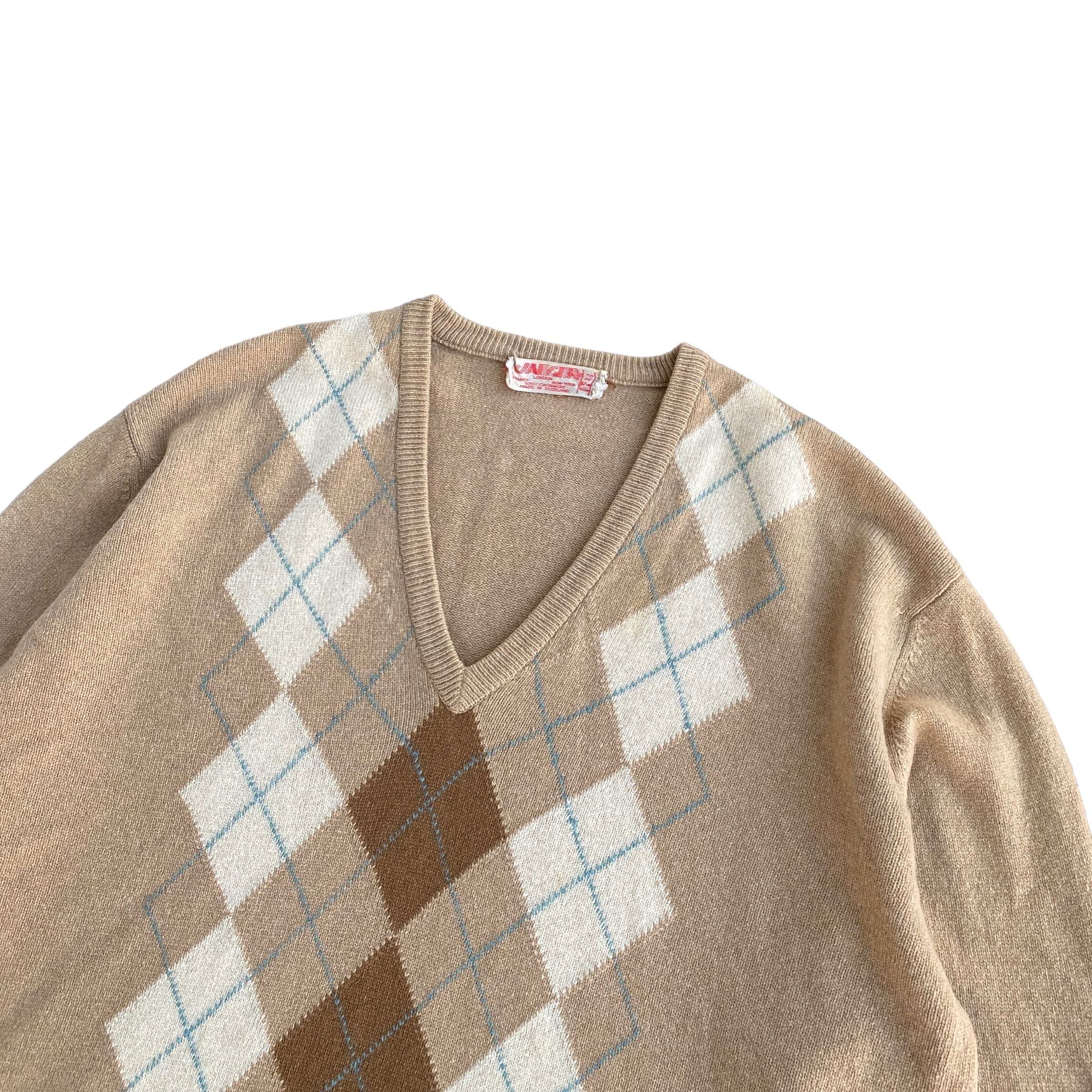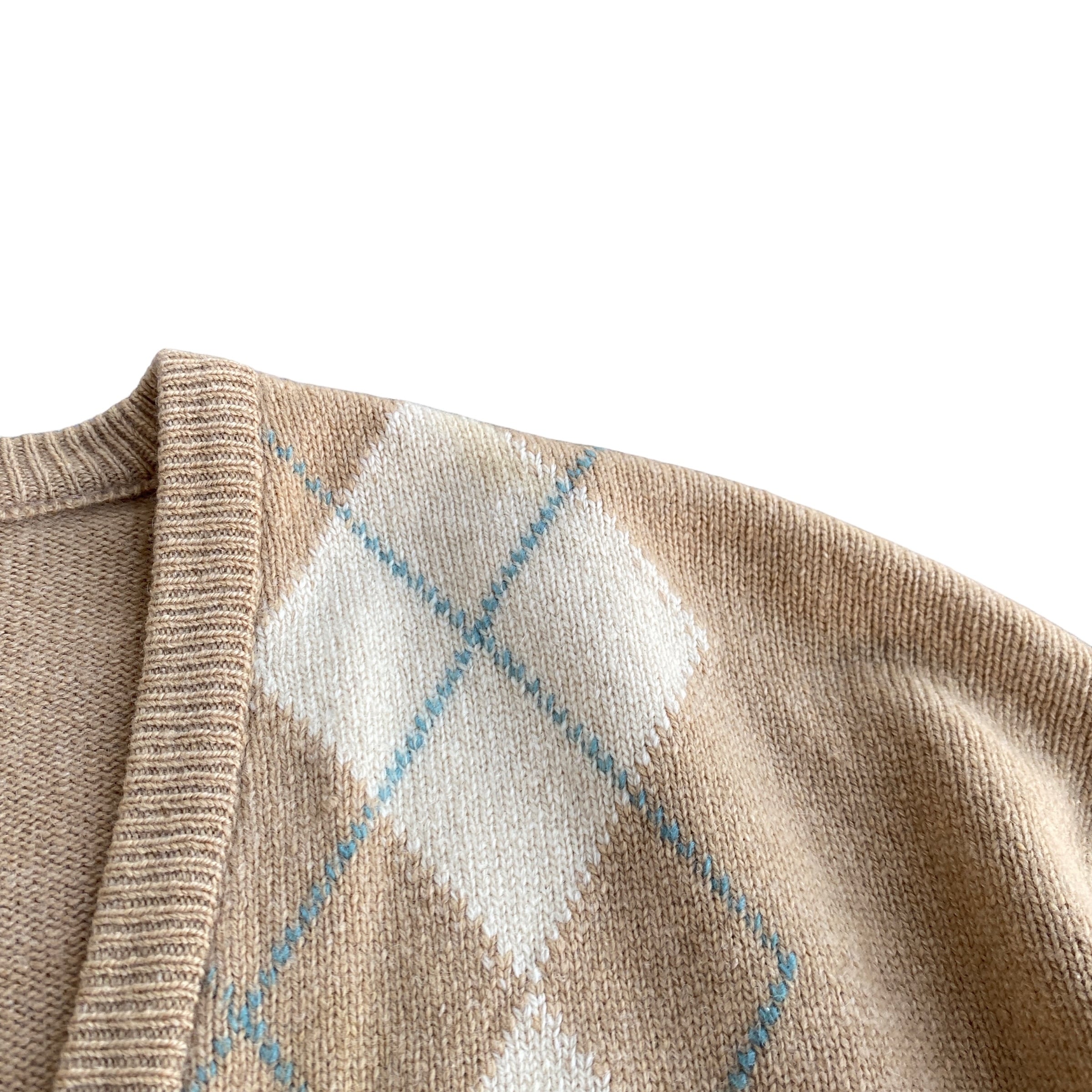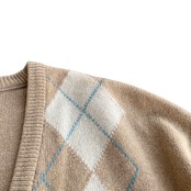 古いスコットランド製カシミヤ特有の、目の詰まった肉厚で柔らかい極上の質感に、ベージュ系で柔らかい配色の上品なアーガイル柄が素晴らしい一着。