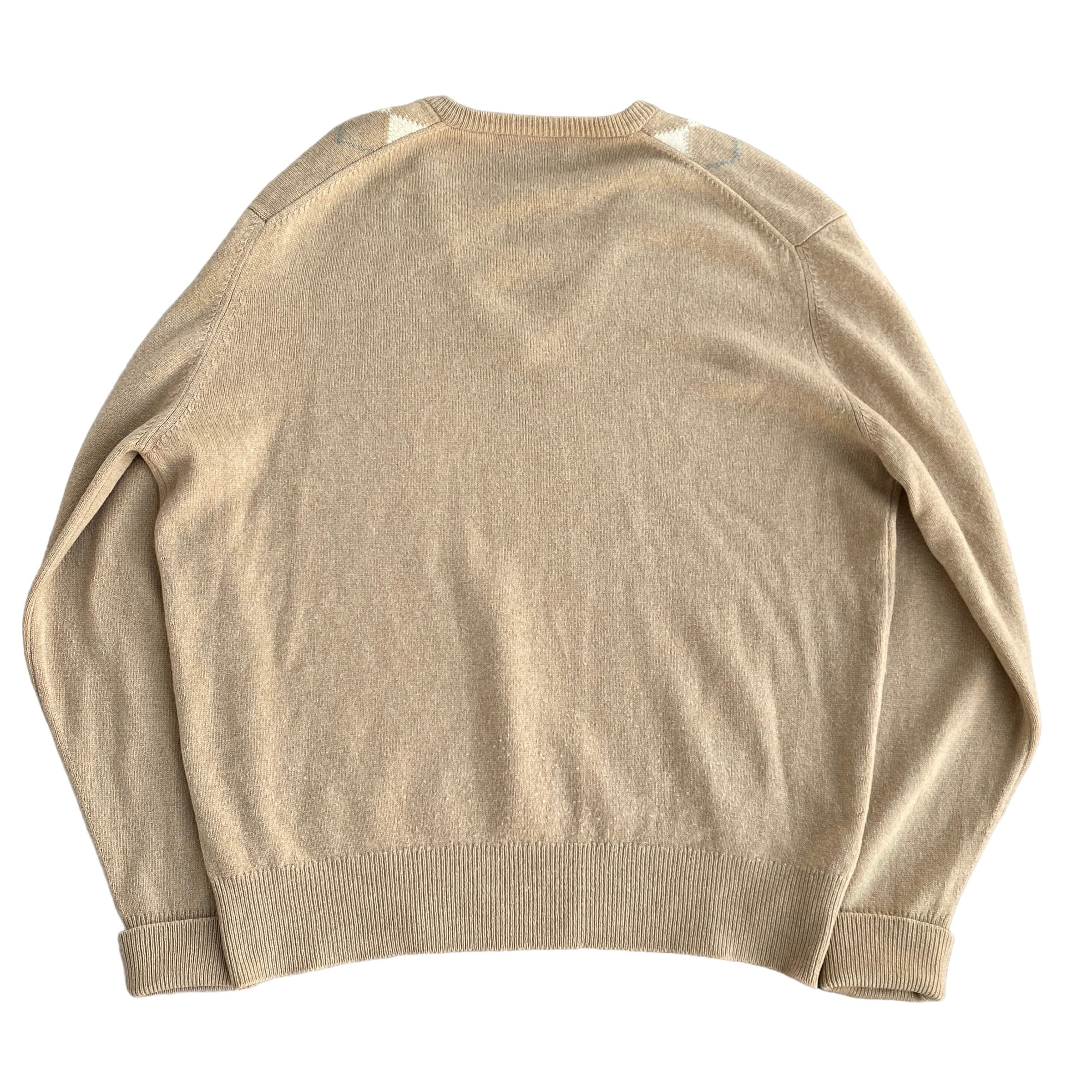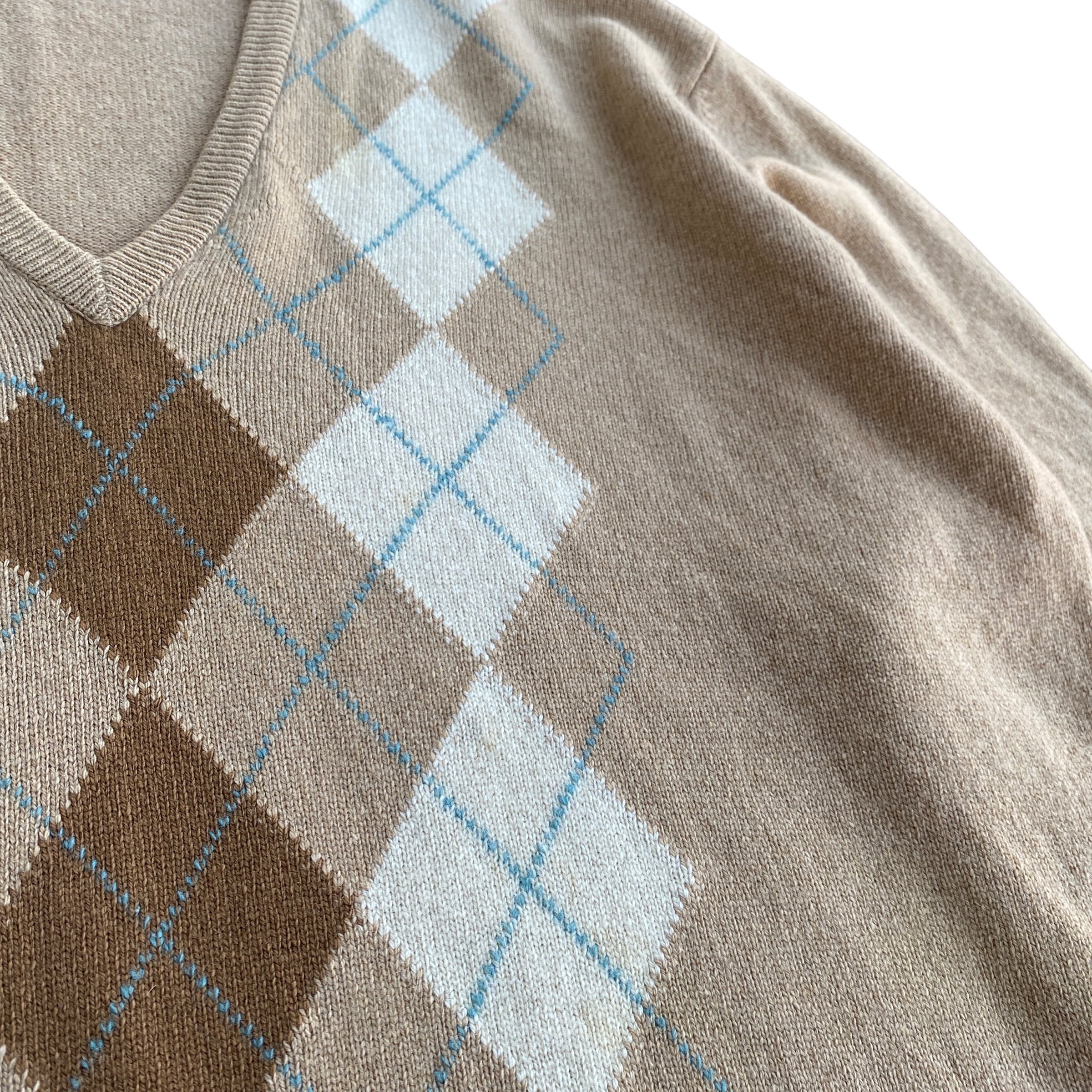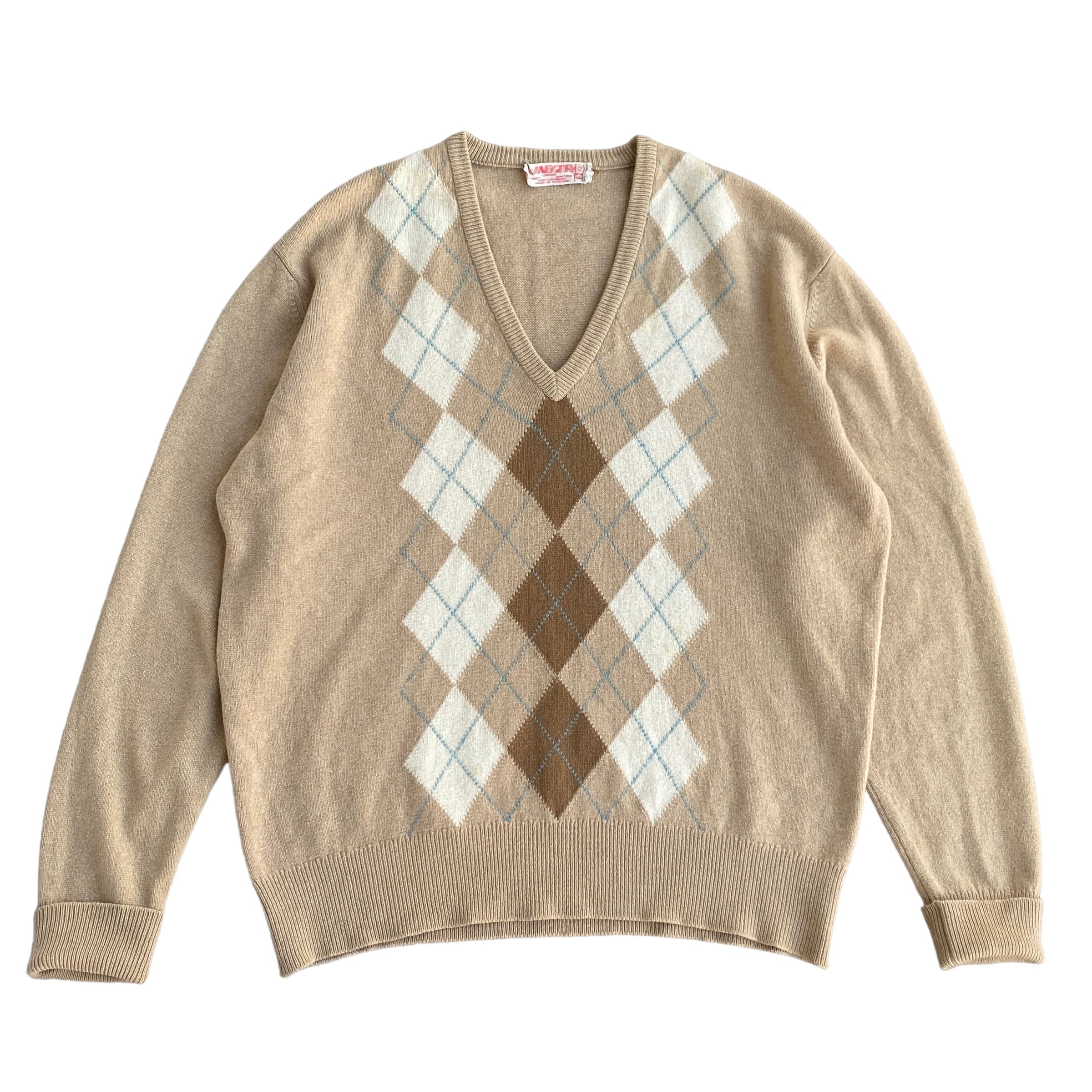 古いスコットランド製カシミヤ特有の、目の詰まった肉厚で柔らかい極上の質感に、ベージュ系で柔らかい配色の上品なアーガイル柄が素晴らしい一着。