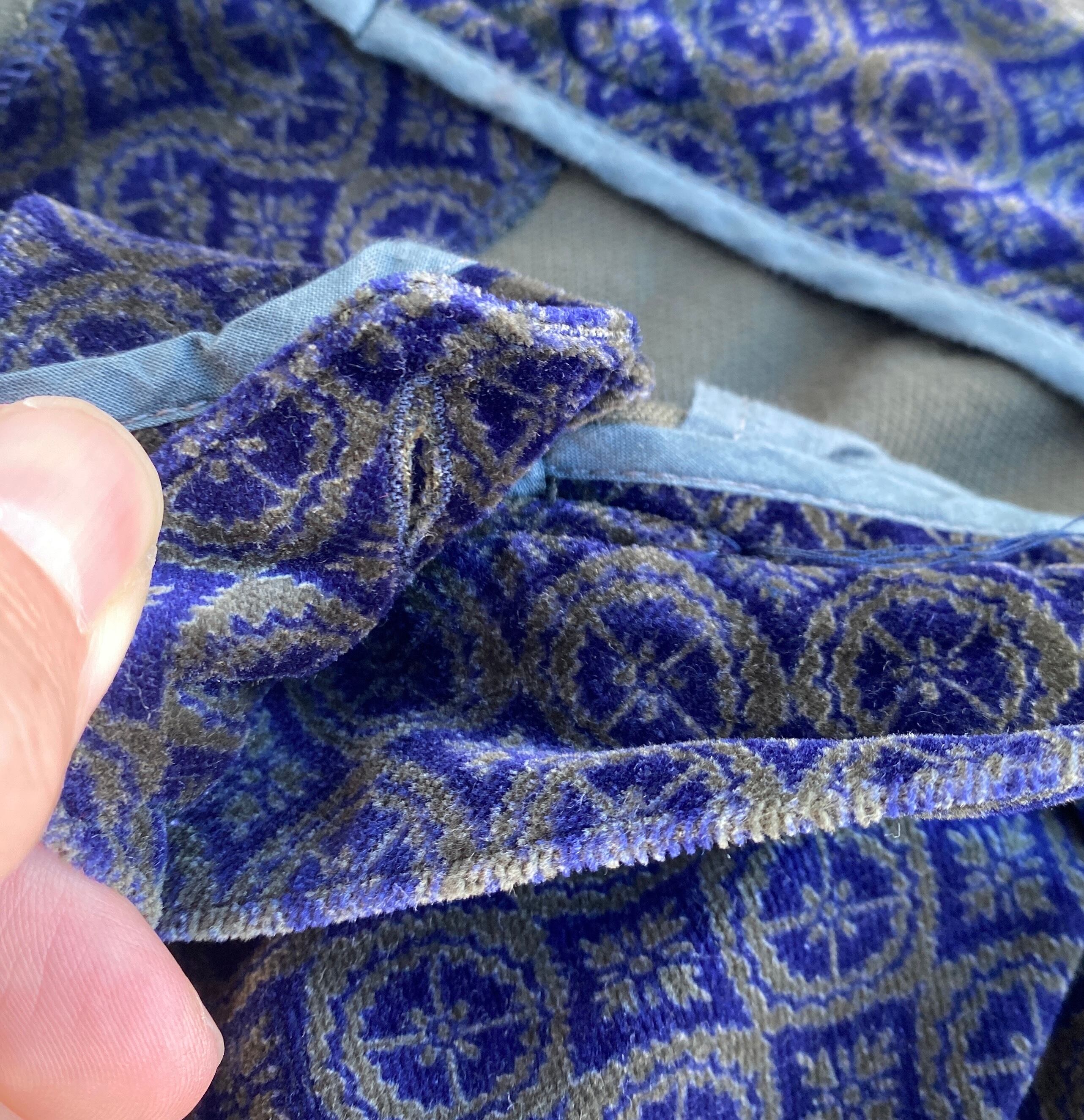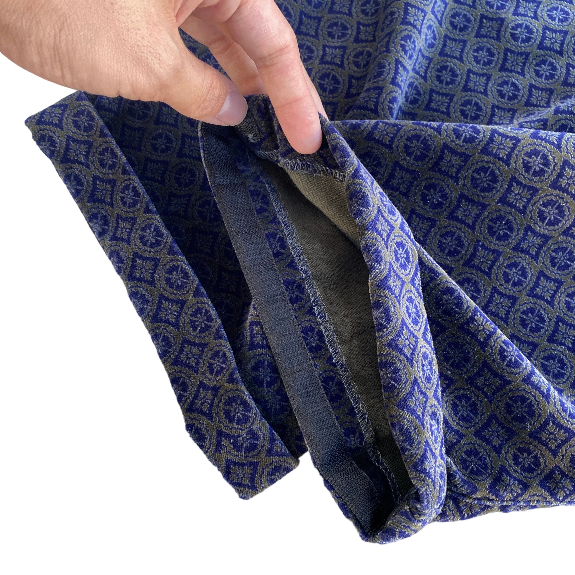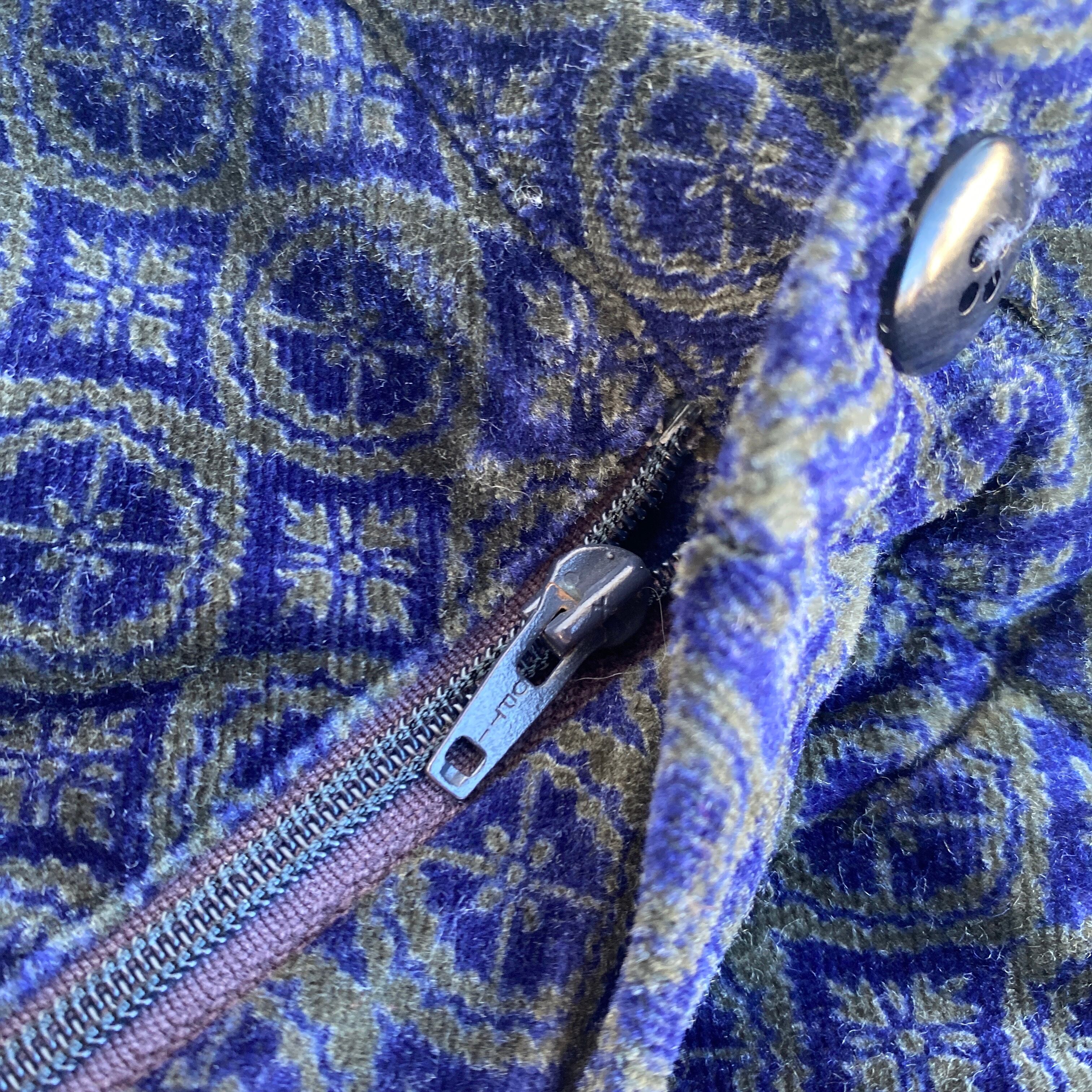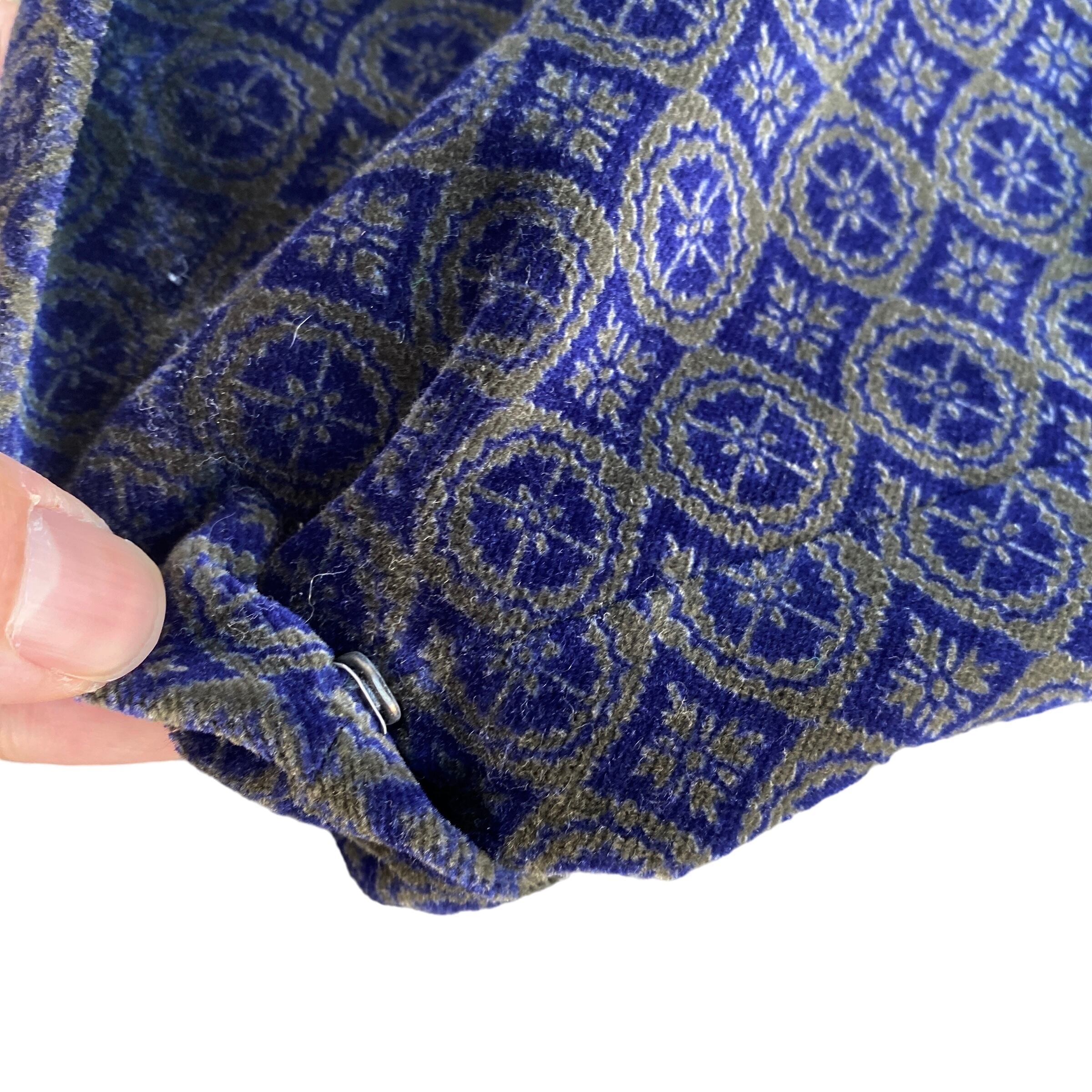 往年のヴェルサーチェのような2タックのワイドシルエットに、ダークネイビーを基調とした小紋柄のような総柄のベロア生地が抜群に格好良いです。