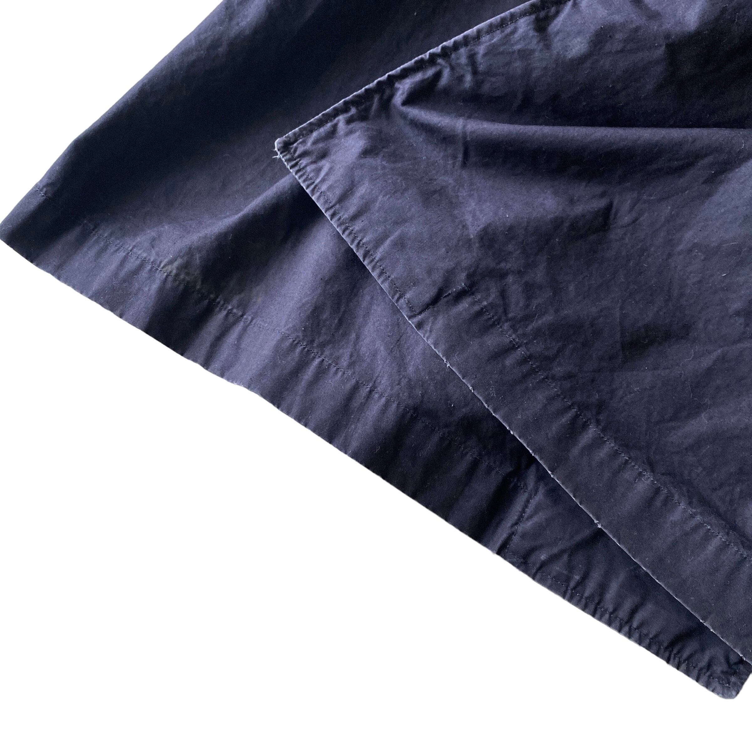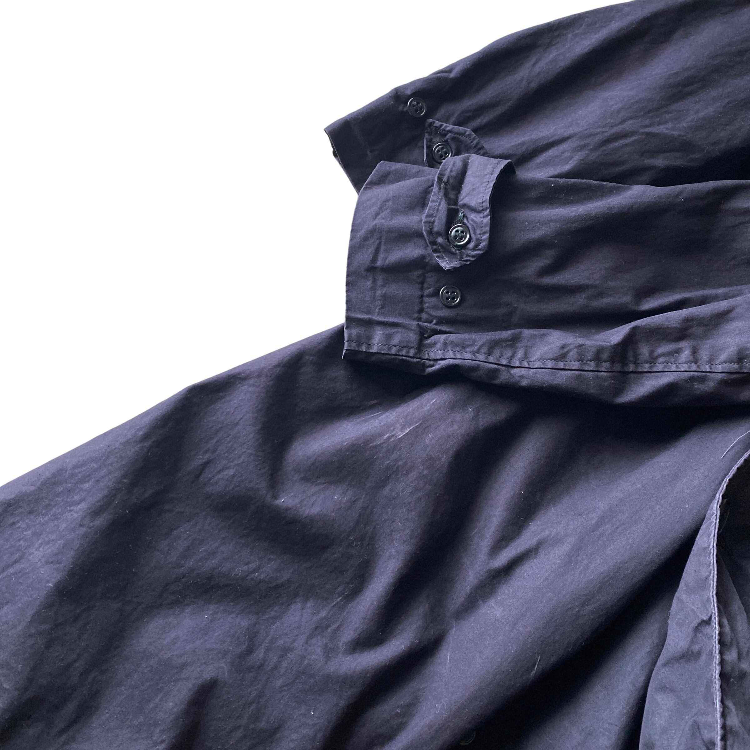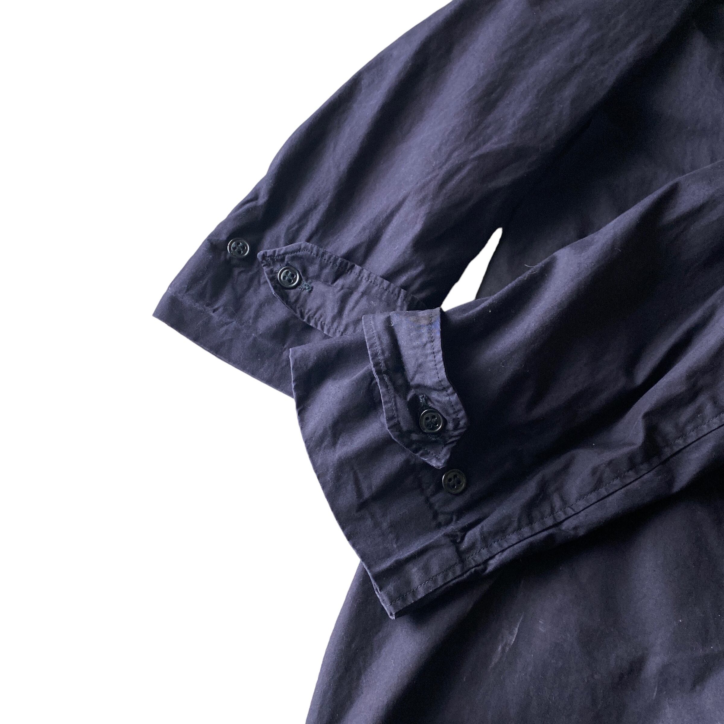 打ち込みの強いベンタイルのようなコットンポプリン素材、深い茄子紺の色目、エポレットのつかないミニマルなデザインが非常に格好良い一着。