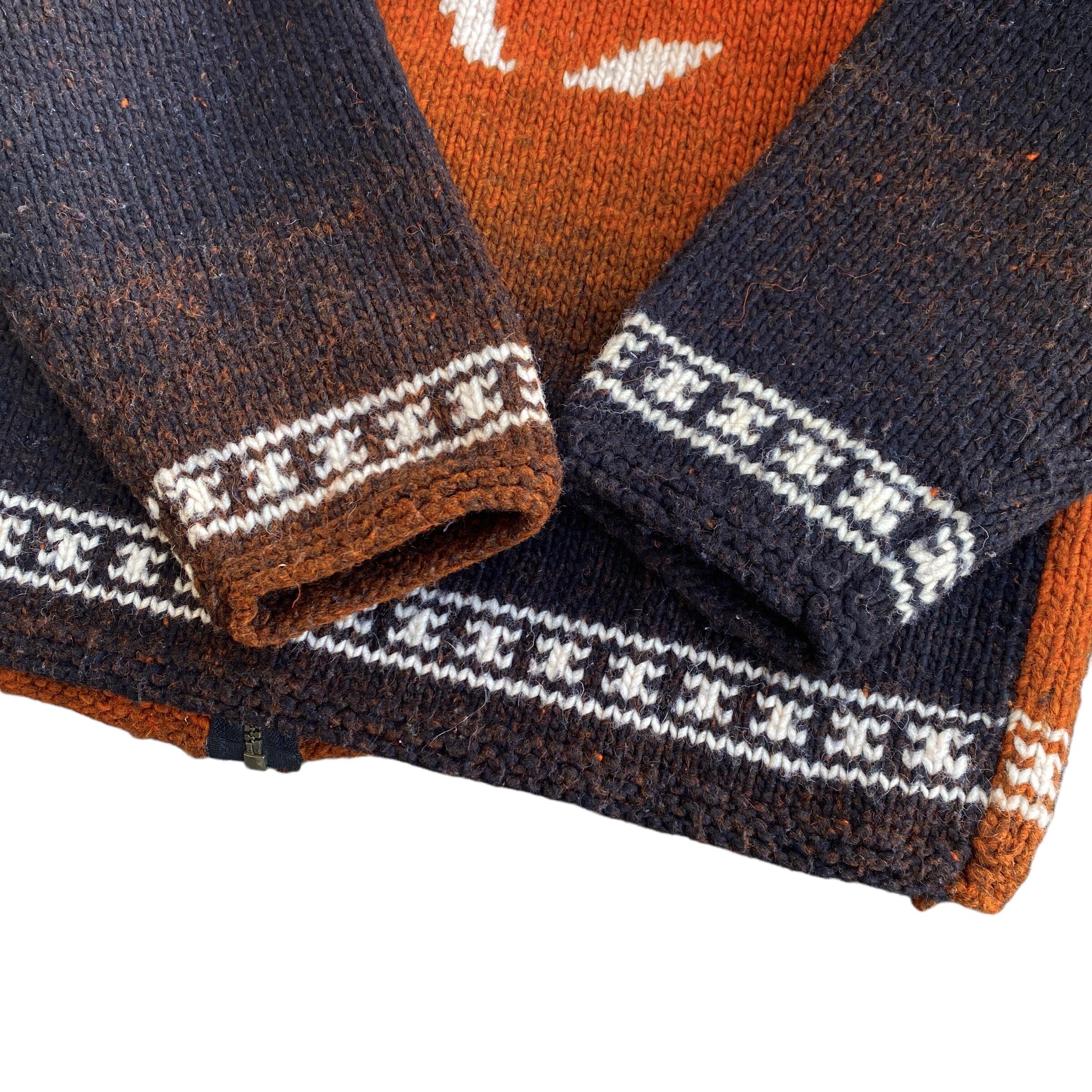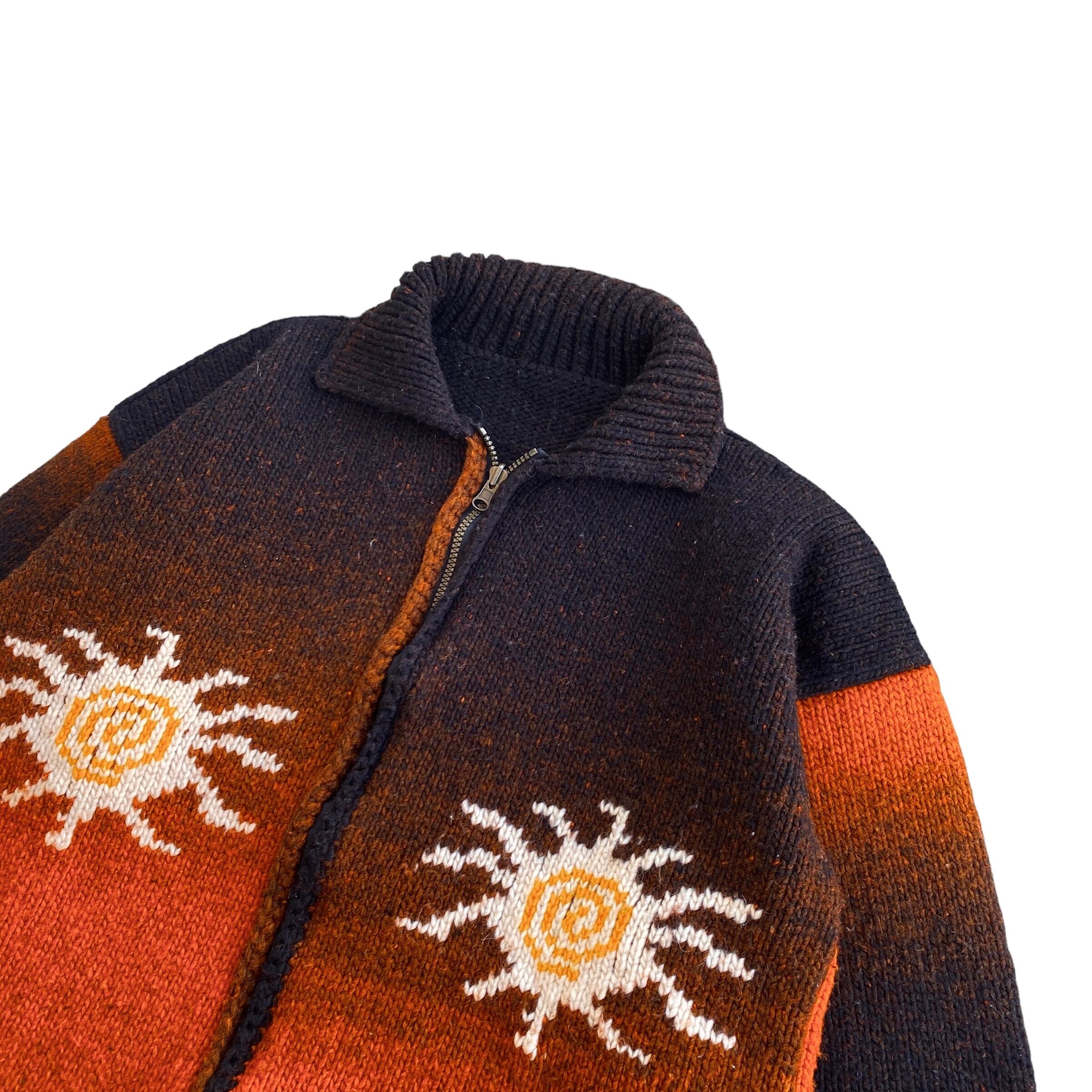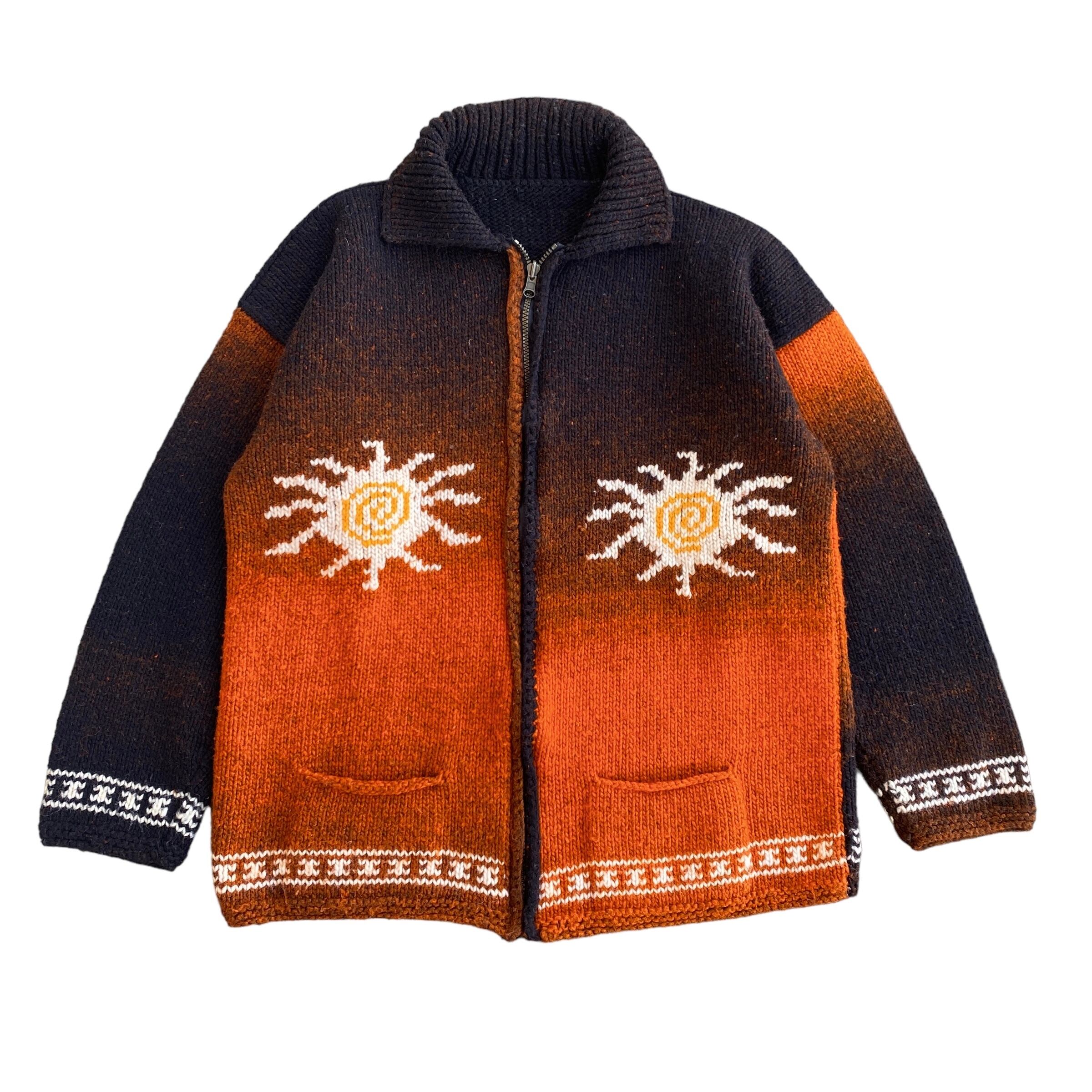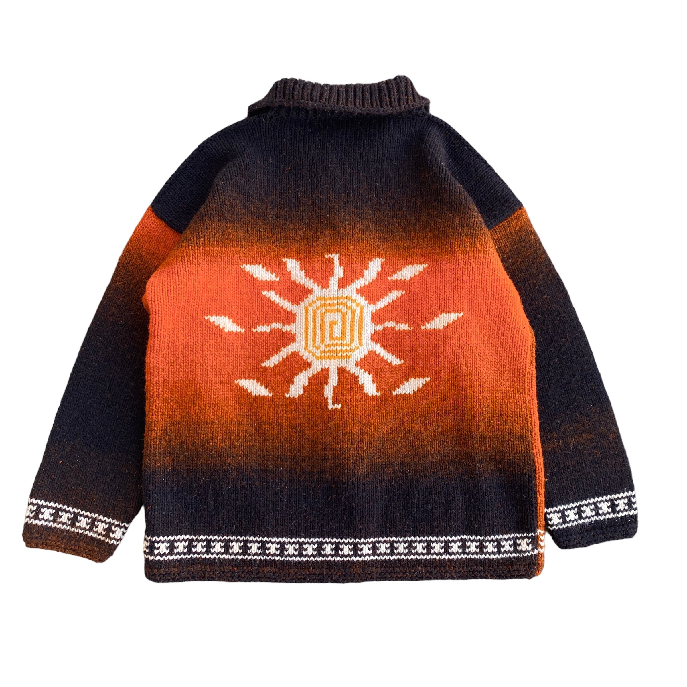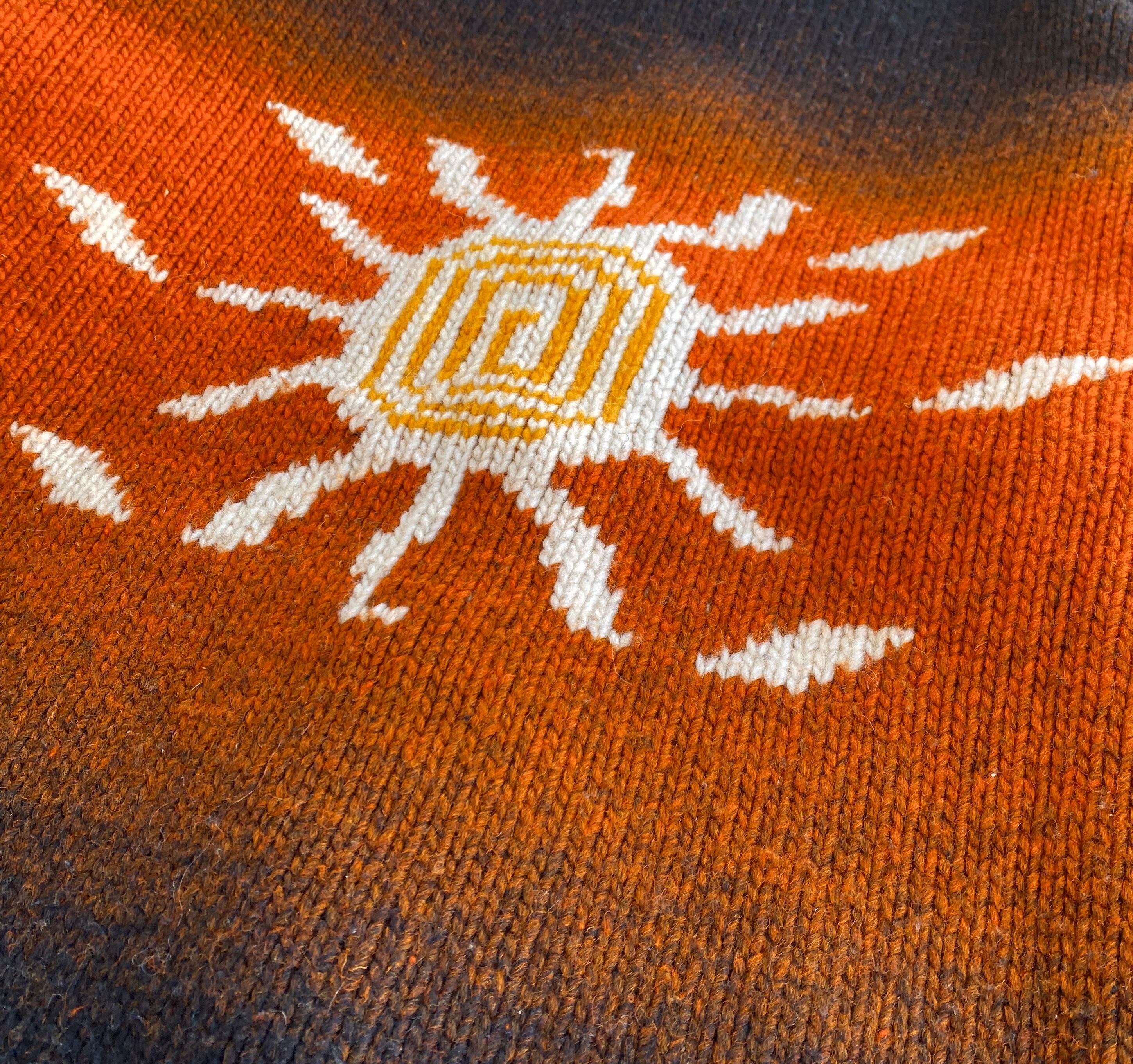 この手のニットの中でも、陰陽、デイジー(フラワーモチーフ)に並び非常に人気の高い太陽モチーフがデザインされた非常に格好良い一着。