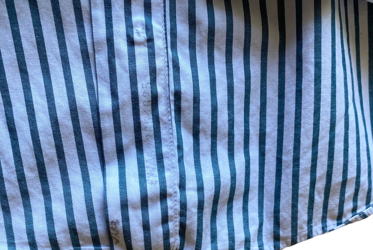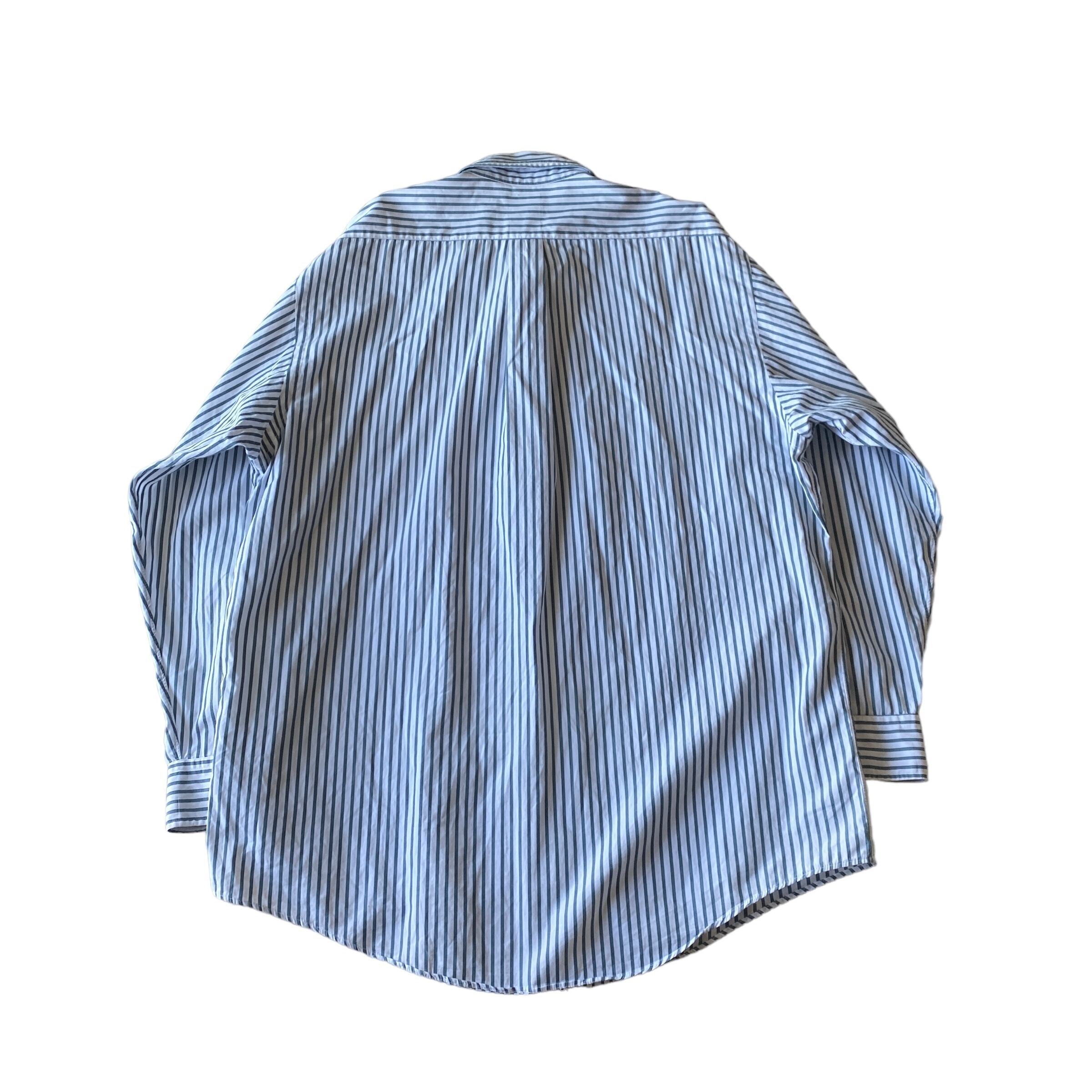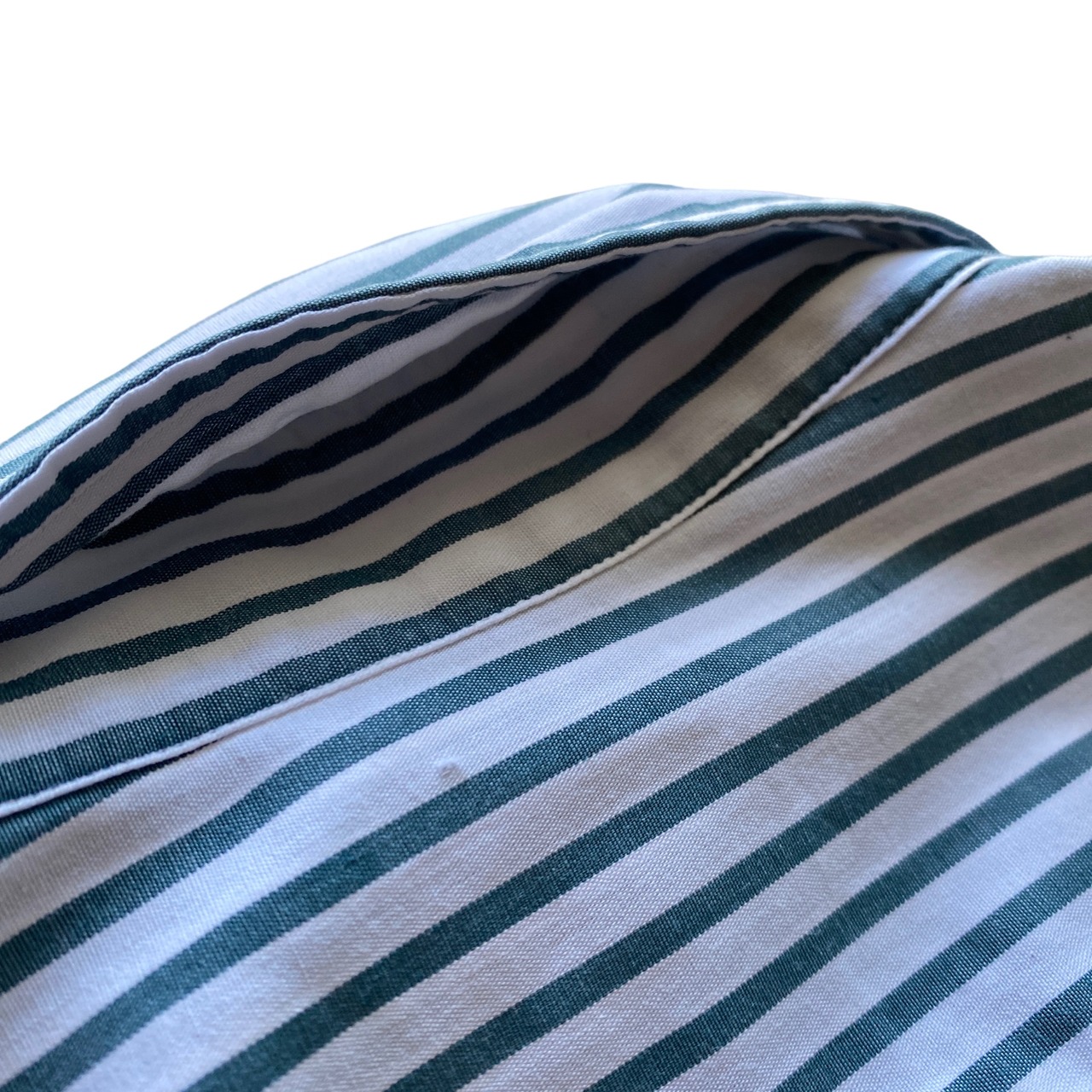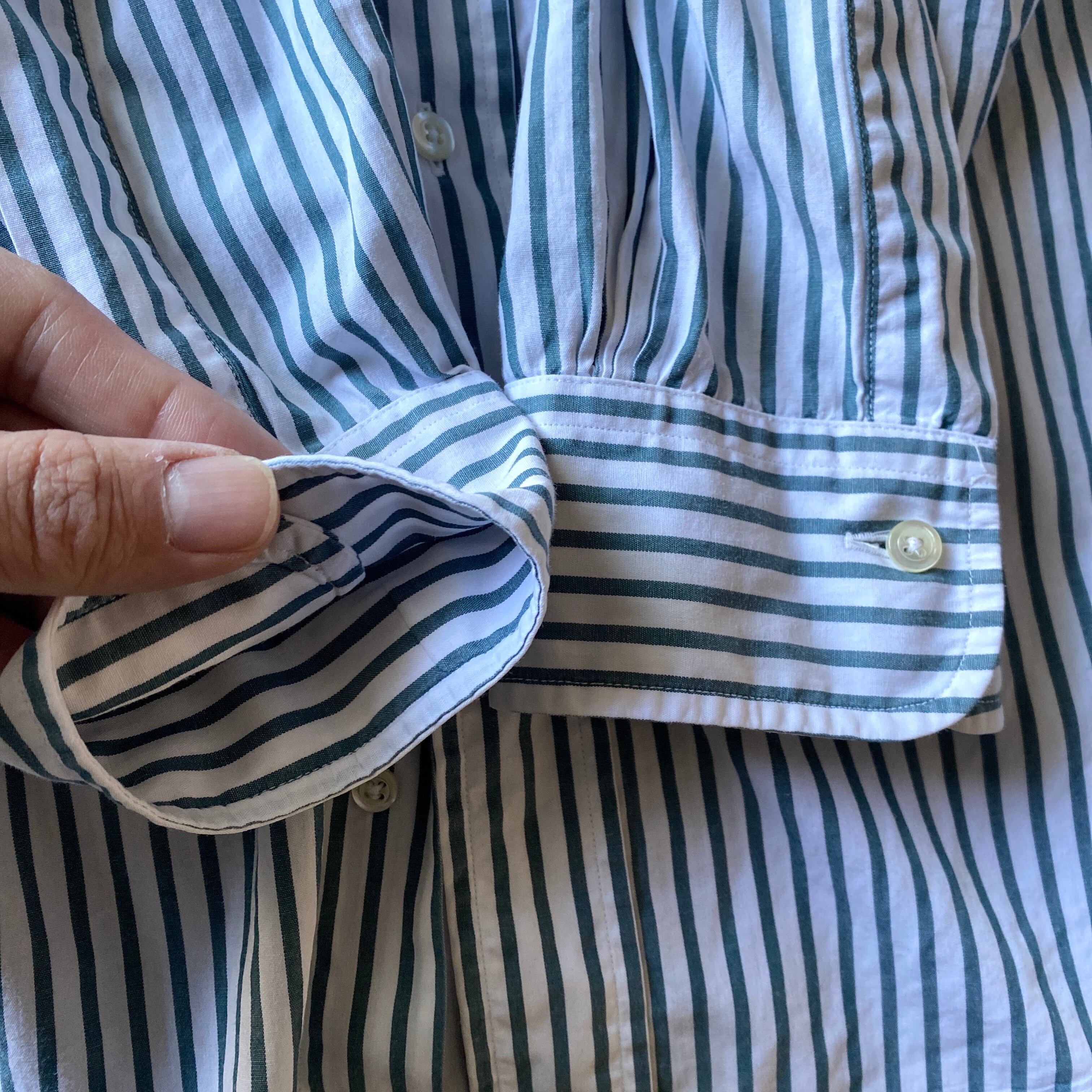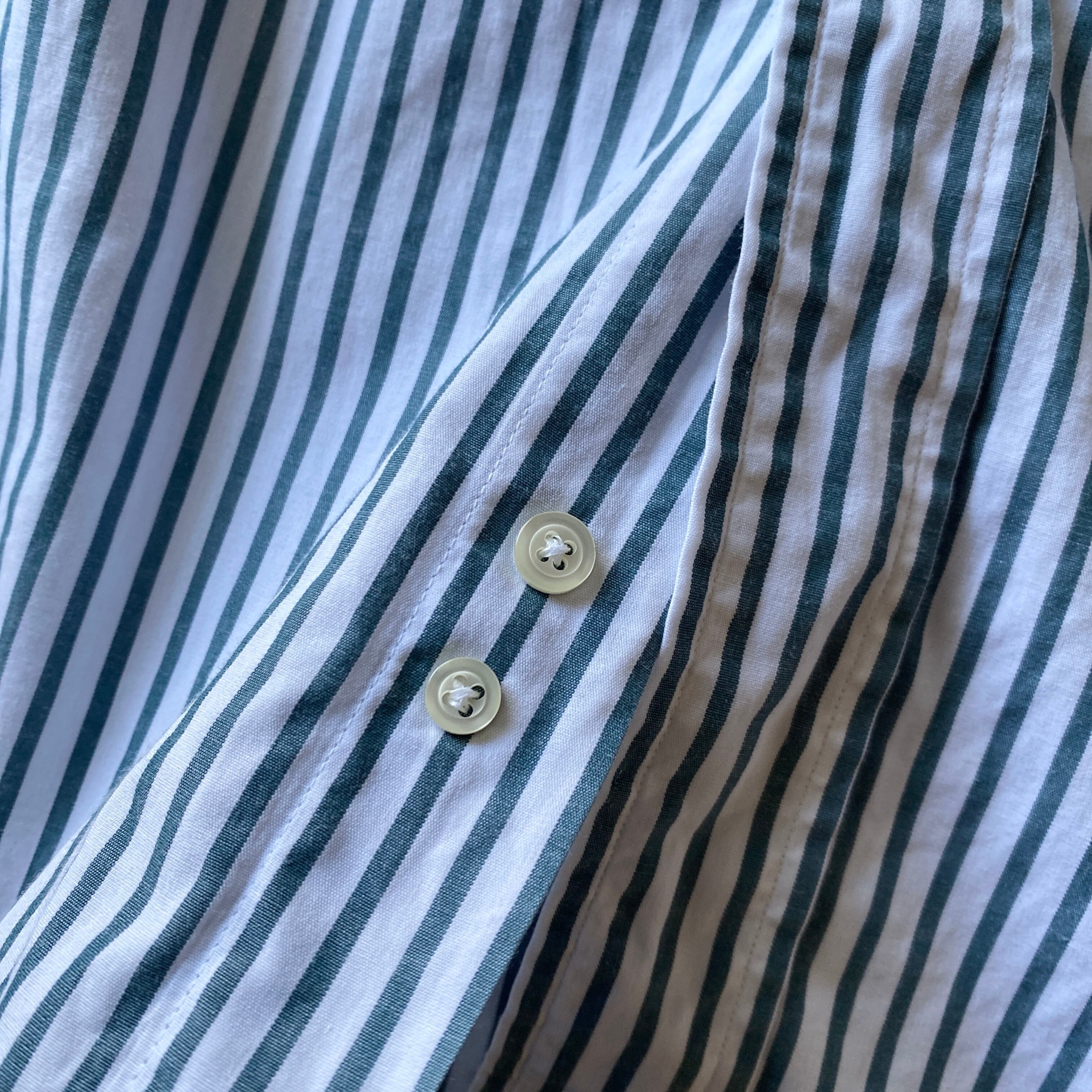 コットン100の上質なピンオックスフォード生地に、ホワイトと褪せたようなグリーンのストライプカラー、クセのないベーシックなシルエットが非常に格好良い一着。
