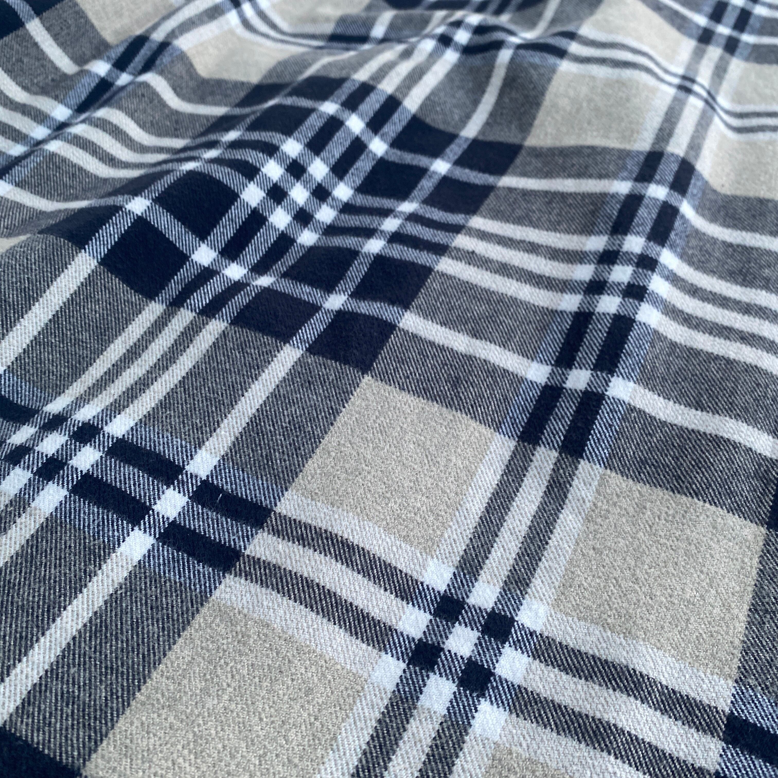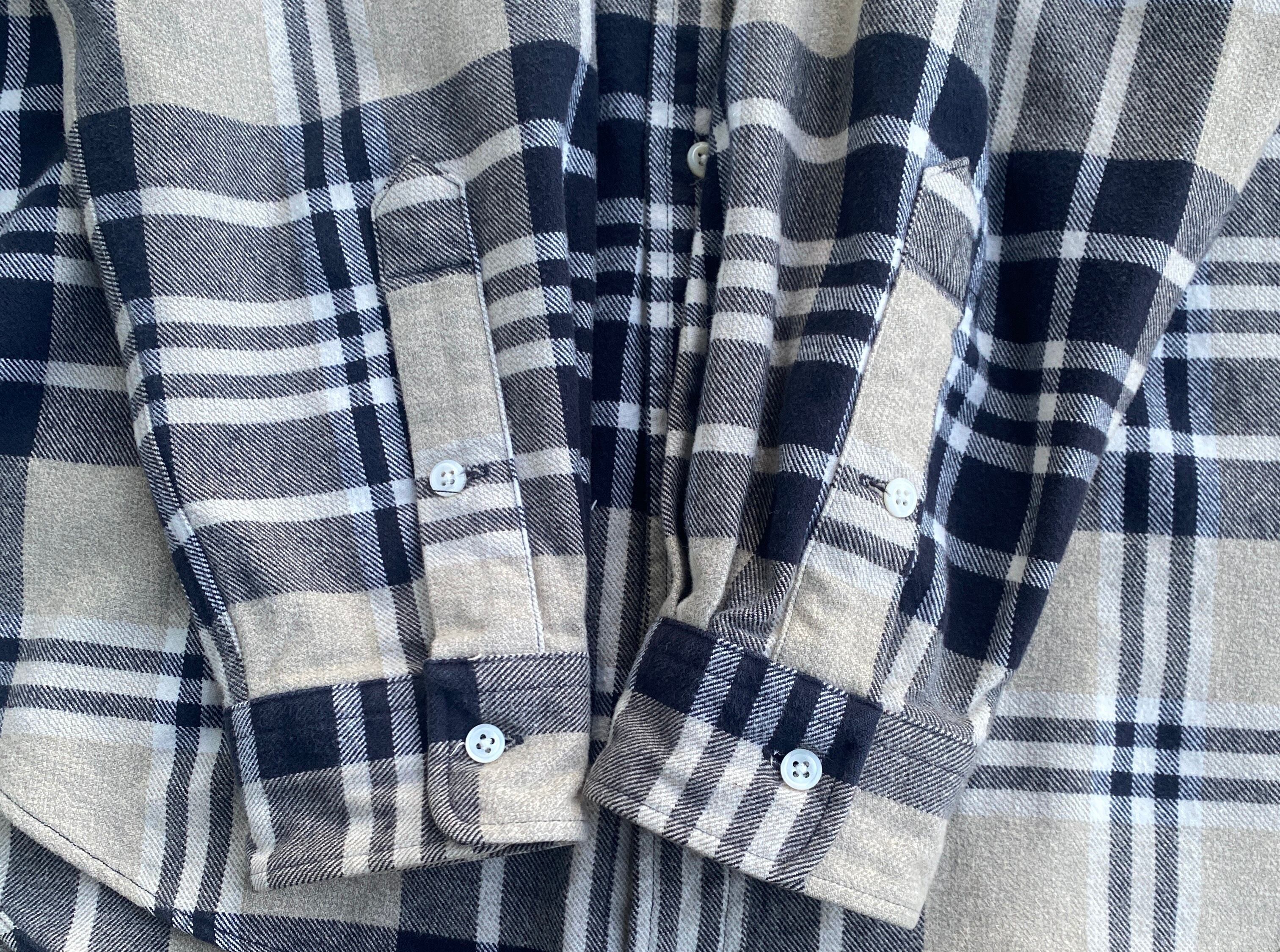 肉厚でモチっとしたコットンネル素材に、ブラック×グレー×ホワイト×ベージュの上品な配色、ゆったりとしたサイズ感が非常に格好良い一着。