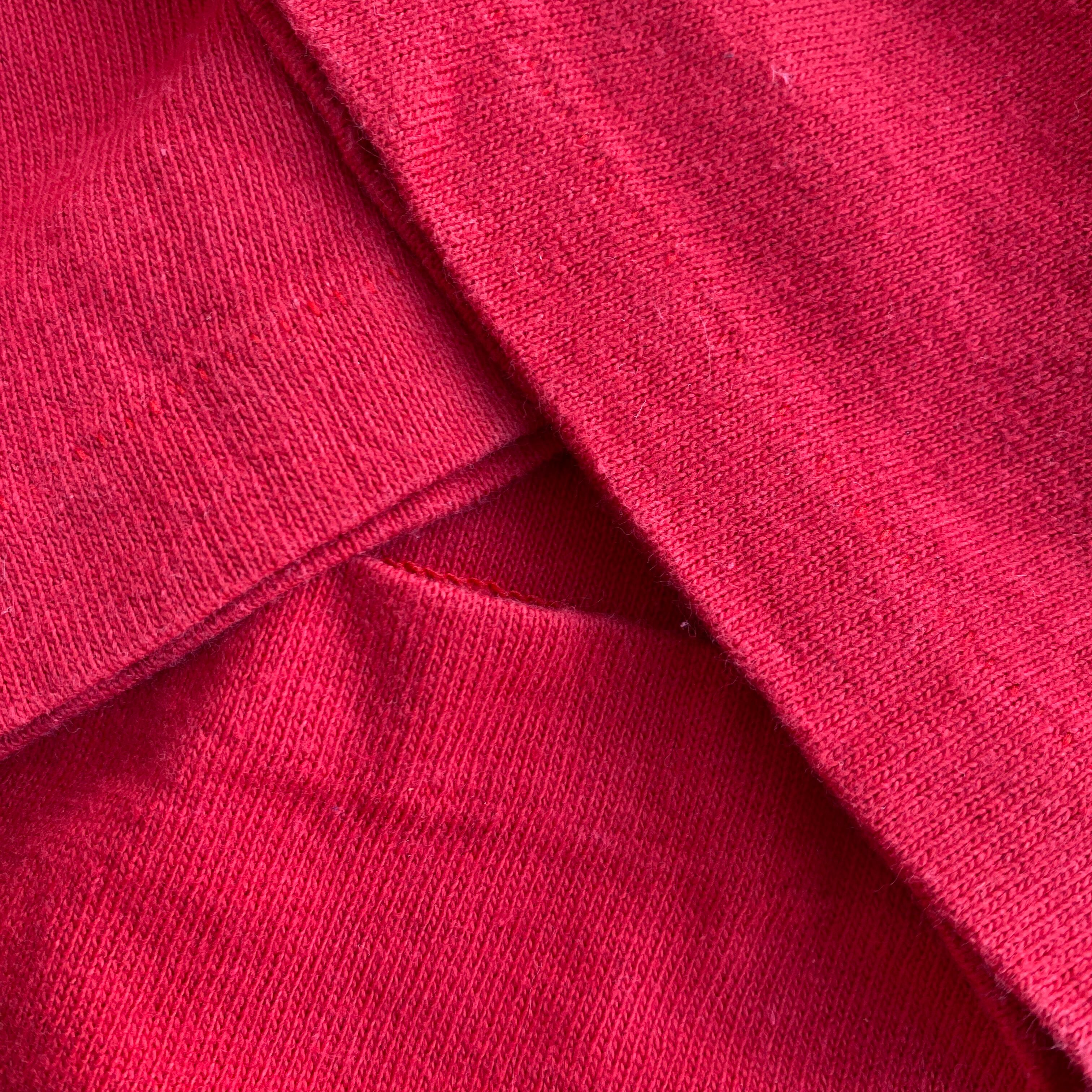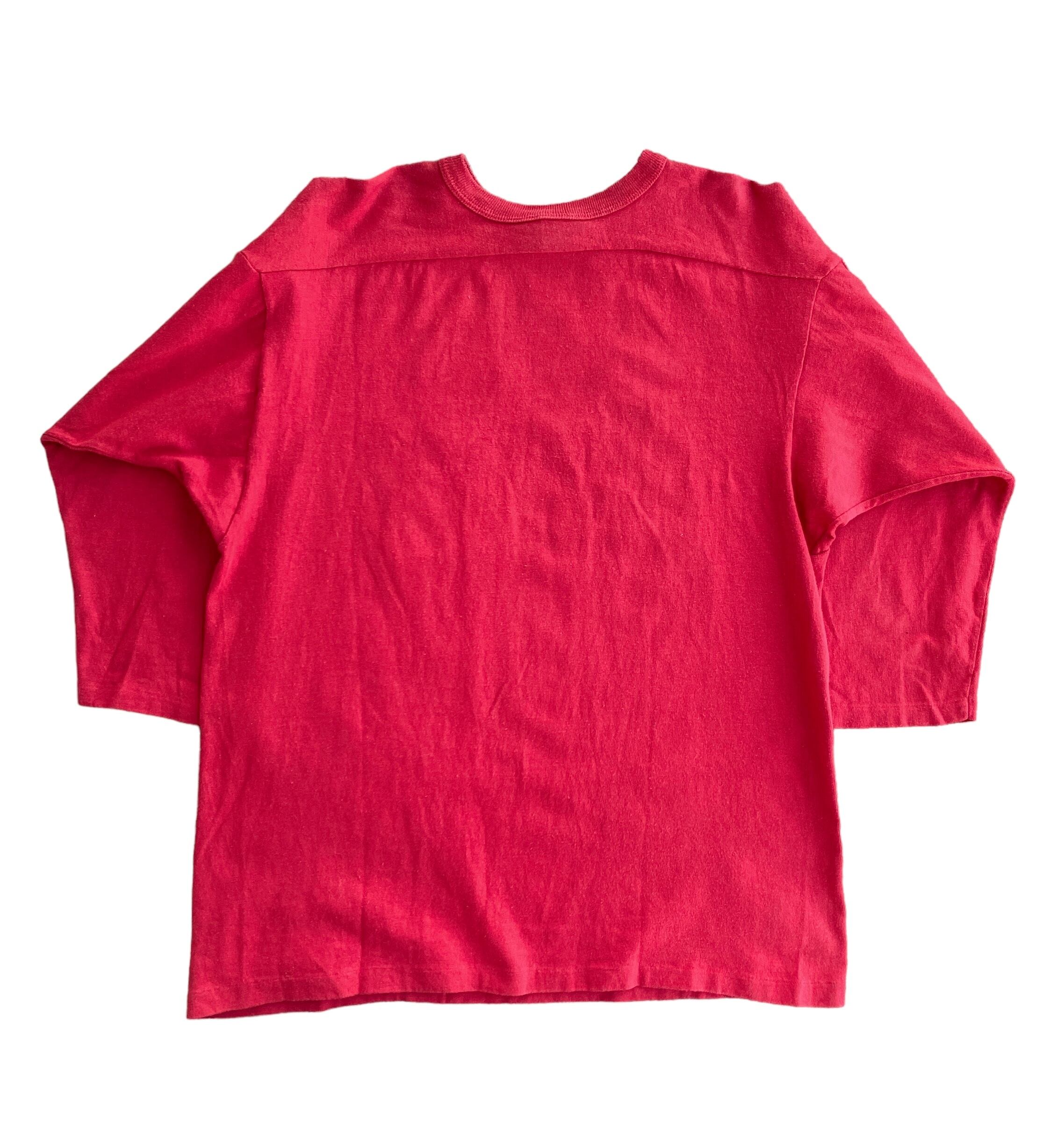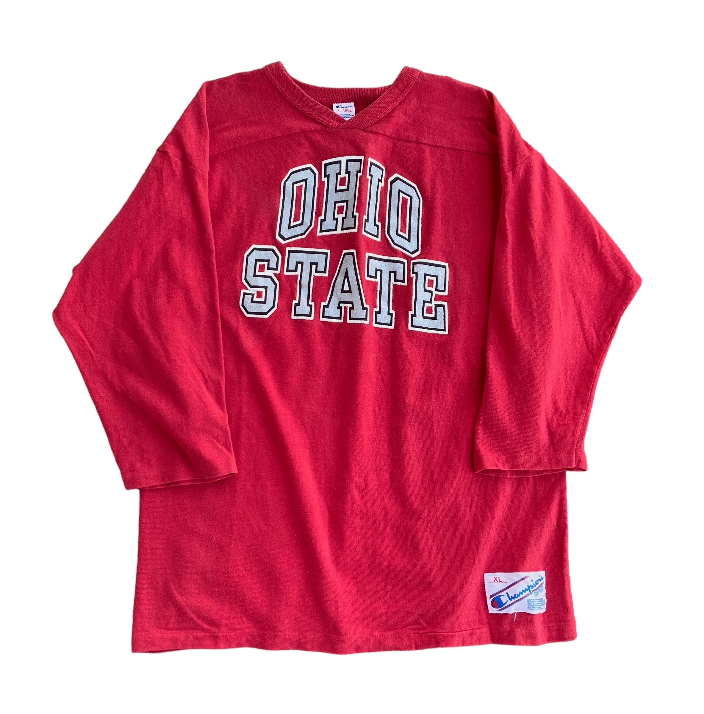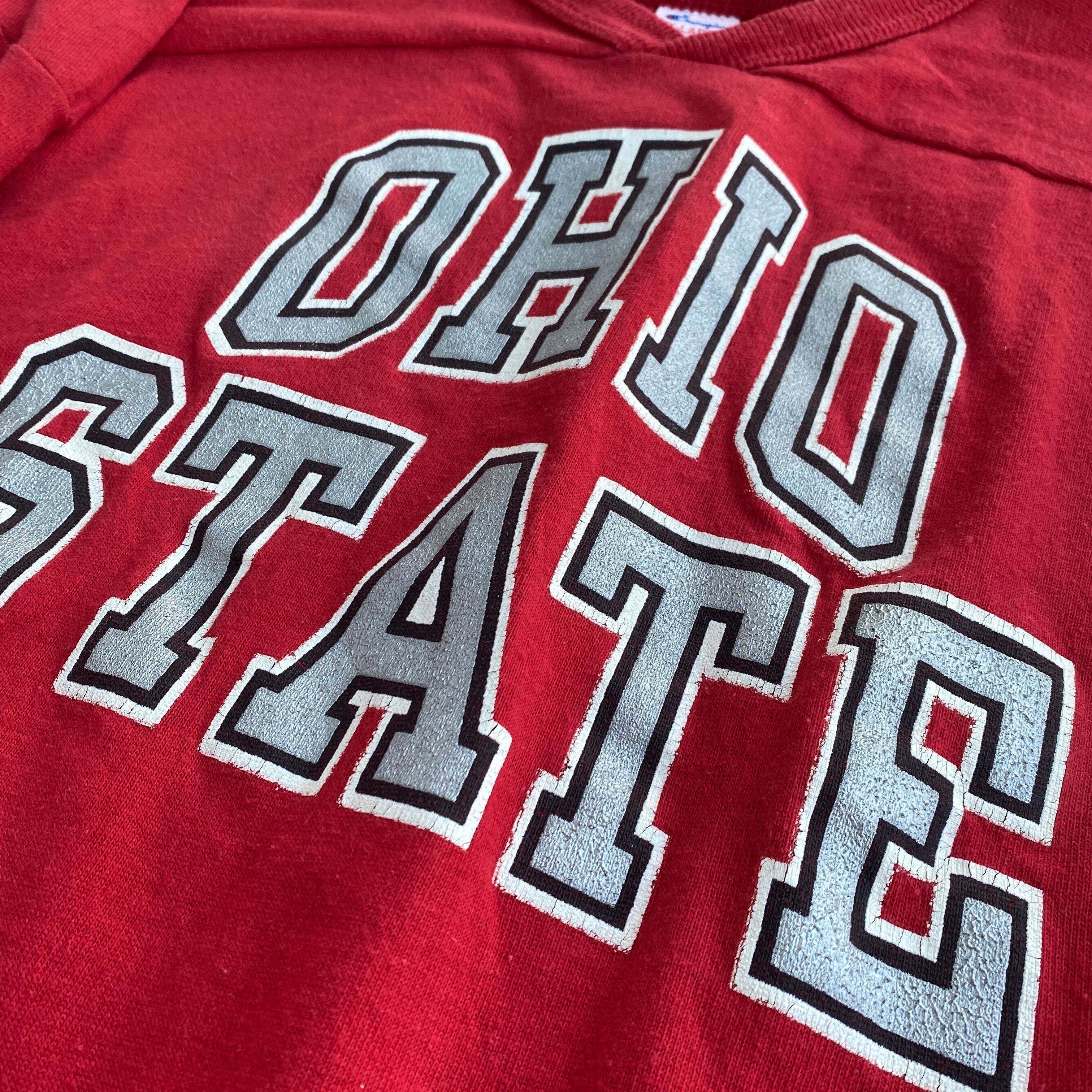 コットン100でほんのり褪せた雰囲気の良いレッドカラーに、厚みのあるプリントで入ったオハイオ州立大学のロゴが格好良い一着。