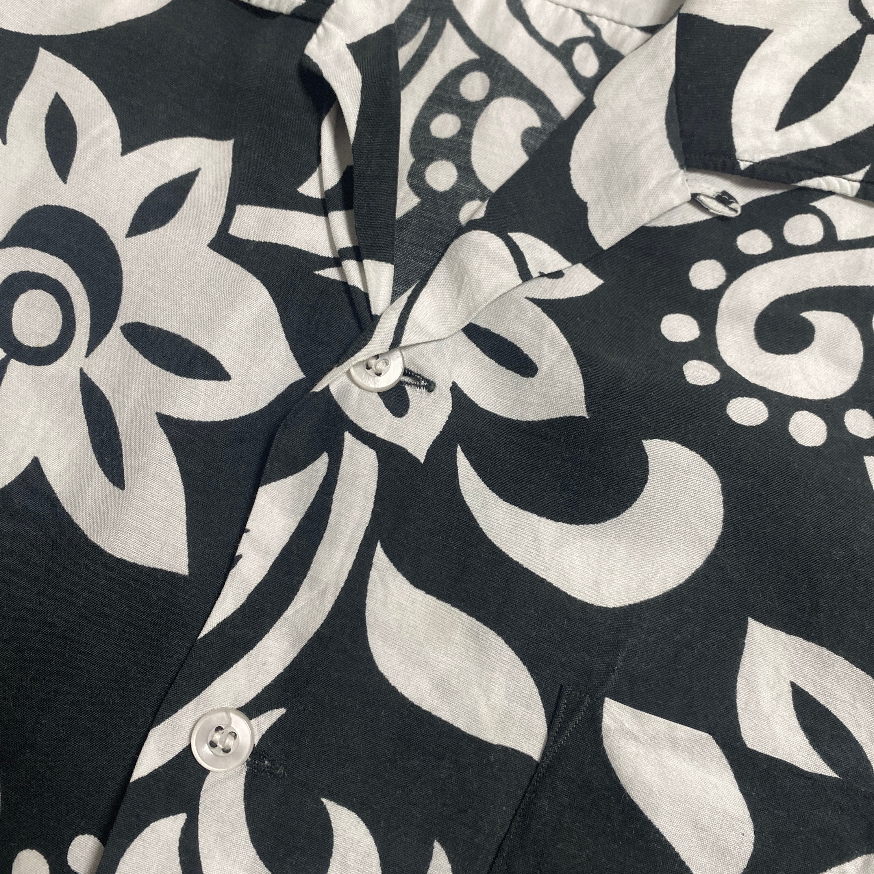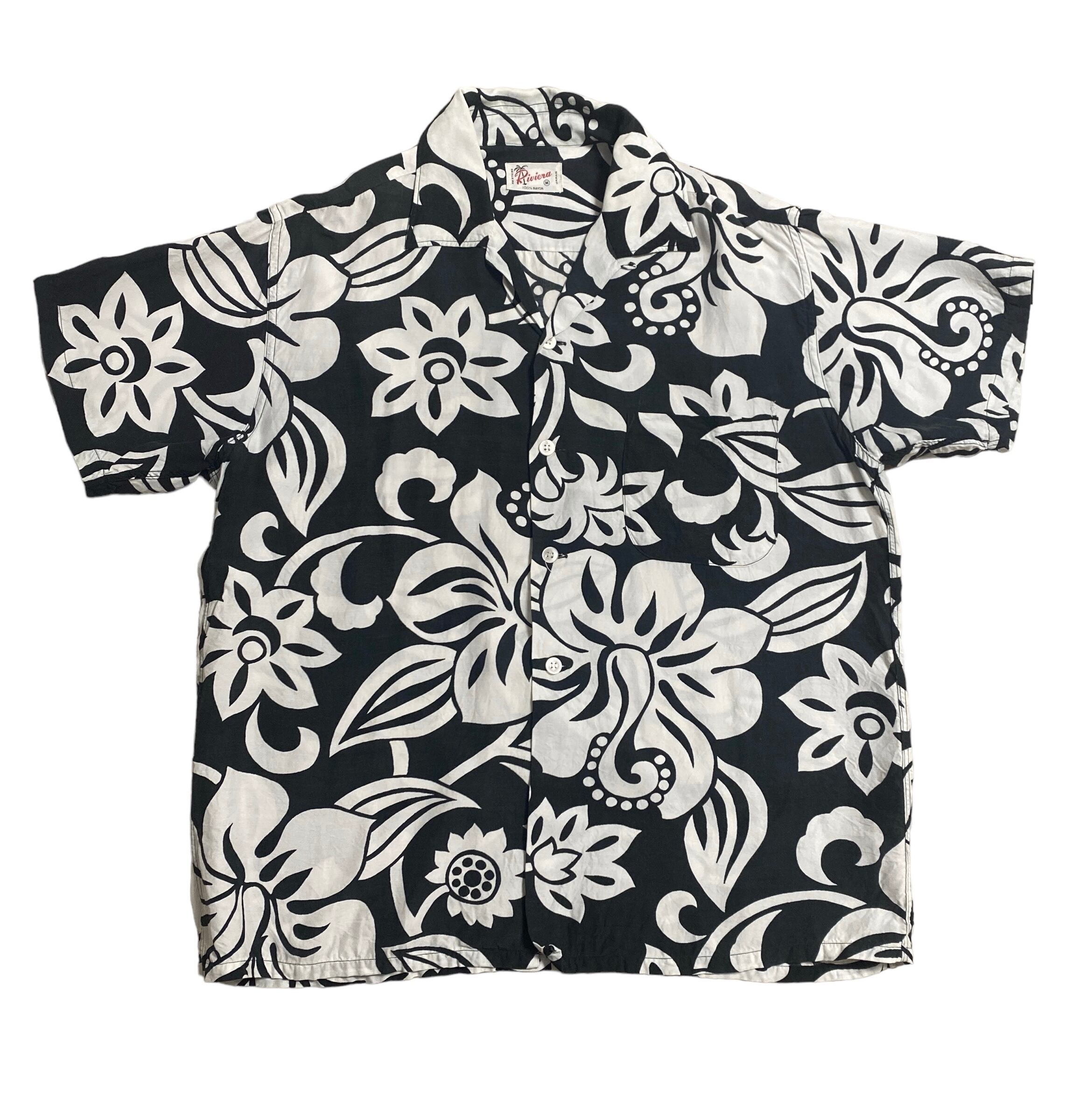 この年代らしいドライでシャリ感のあるレーヨン生地に、ブラック×ホワイトの花柄オーバープリントが非常に格好良い一着。