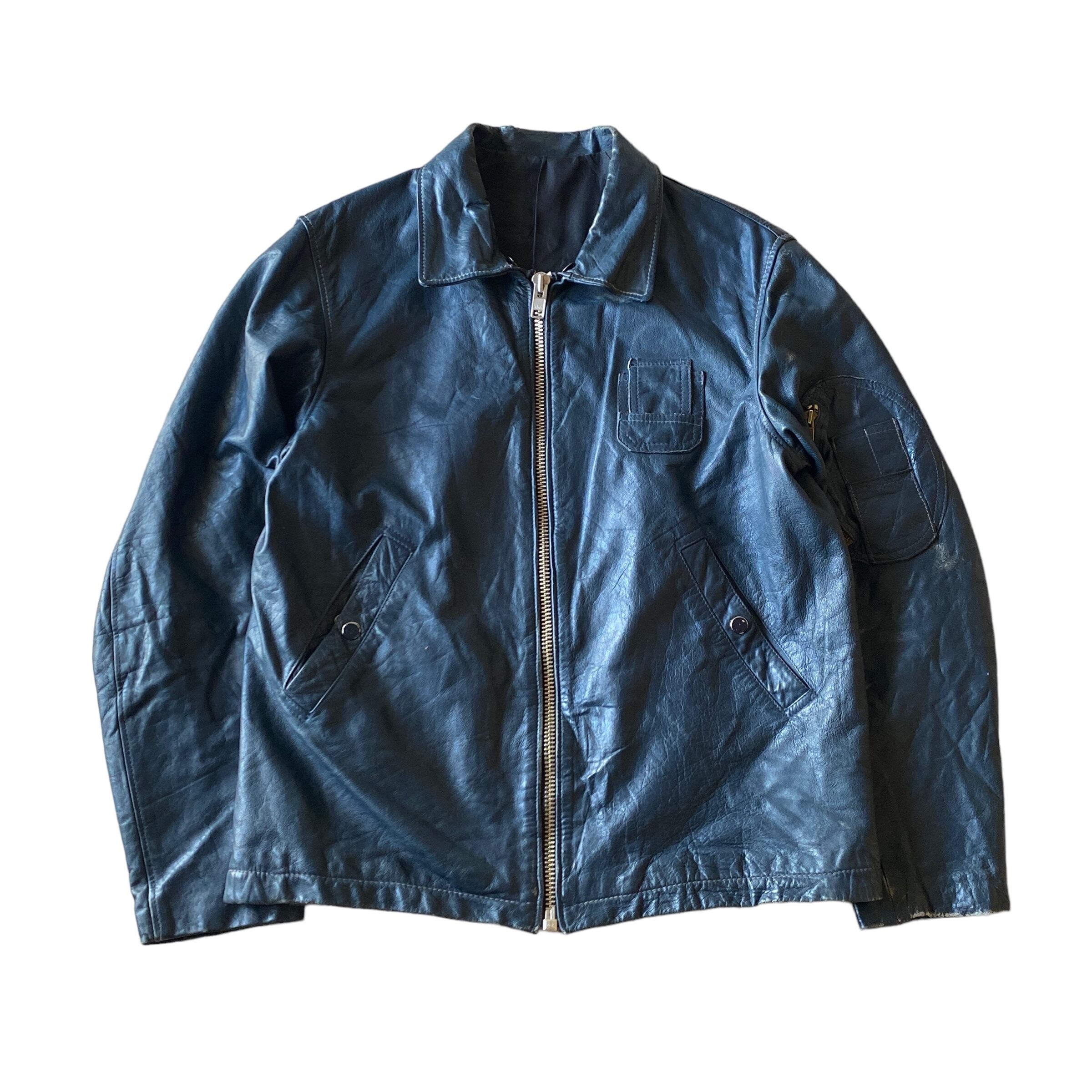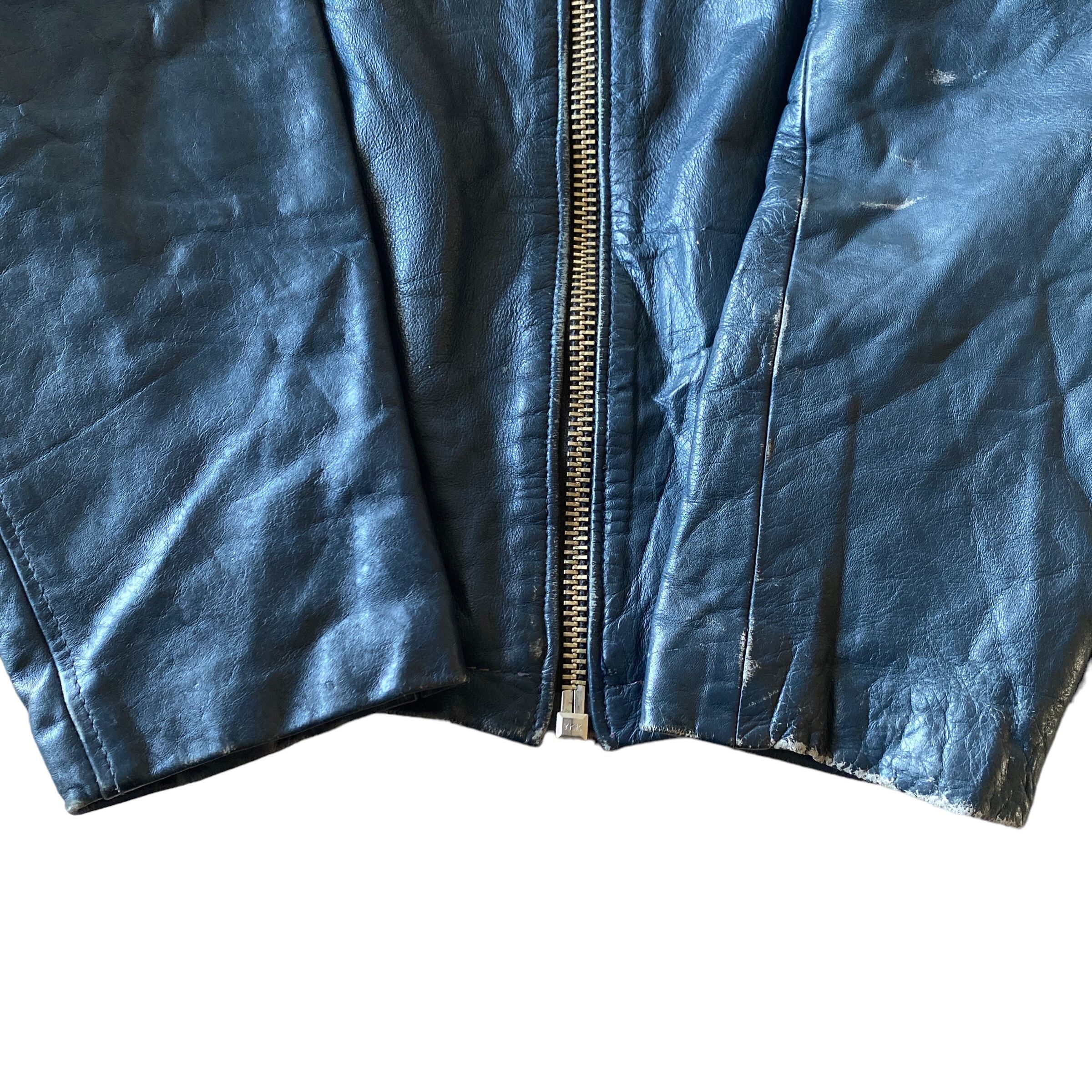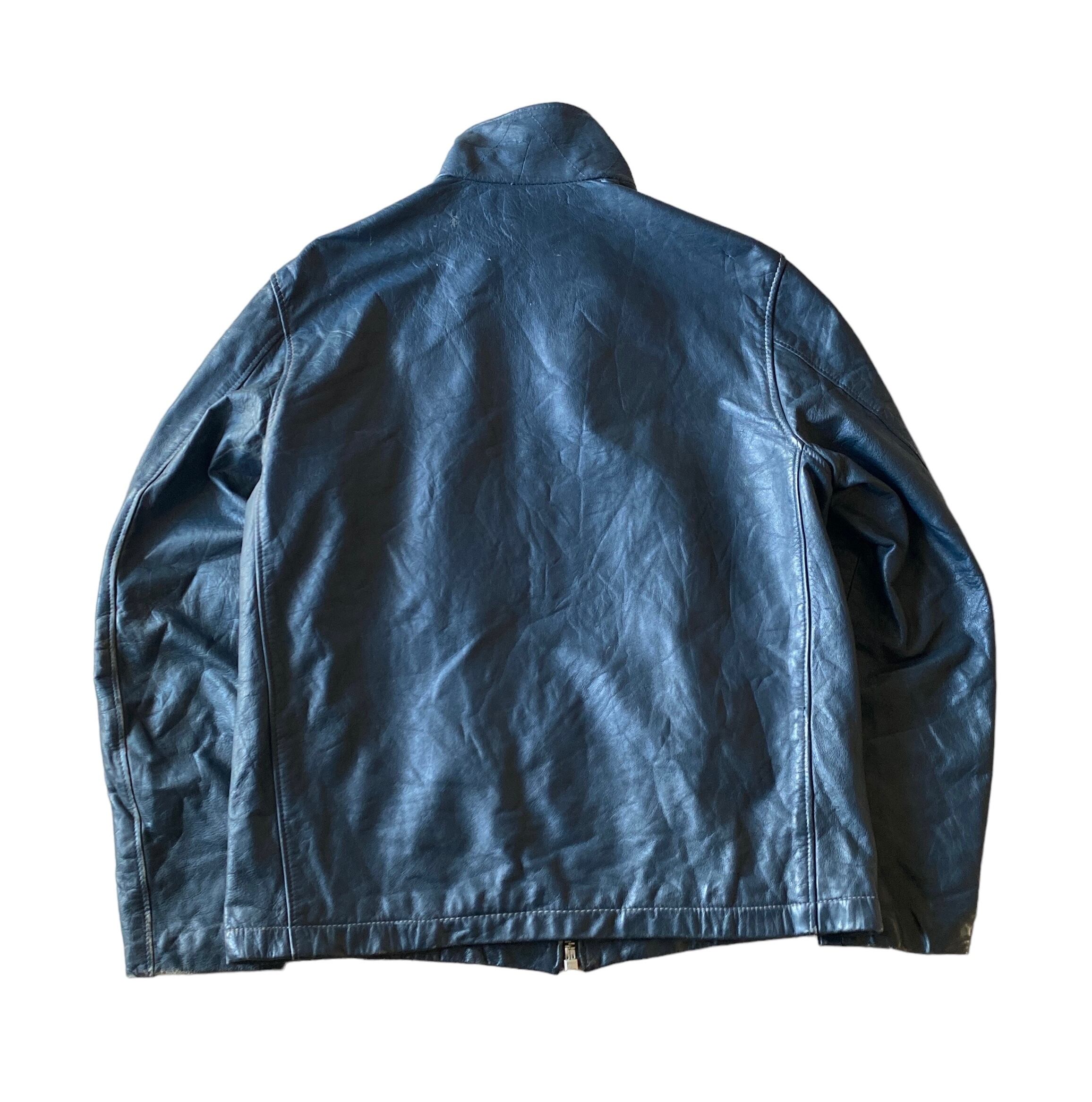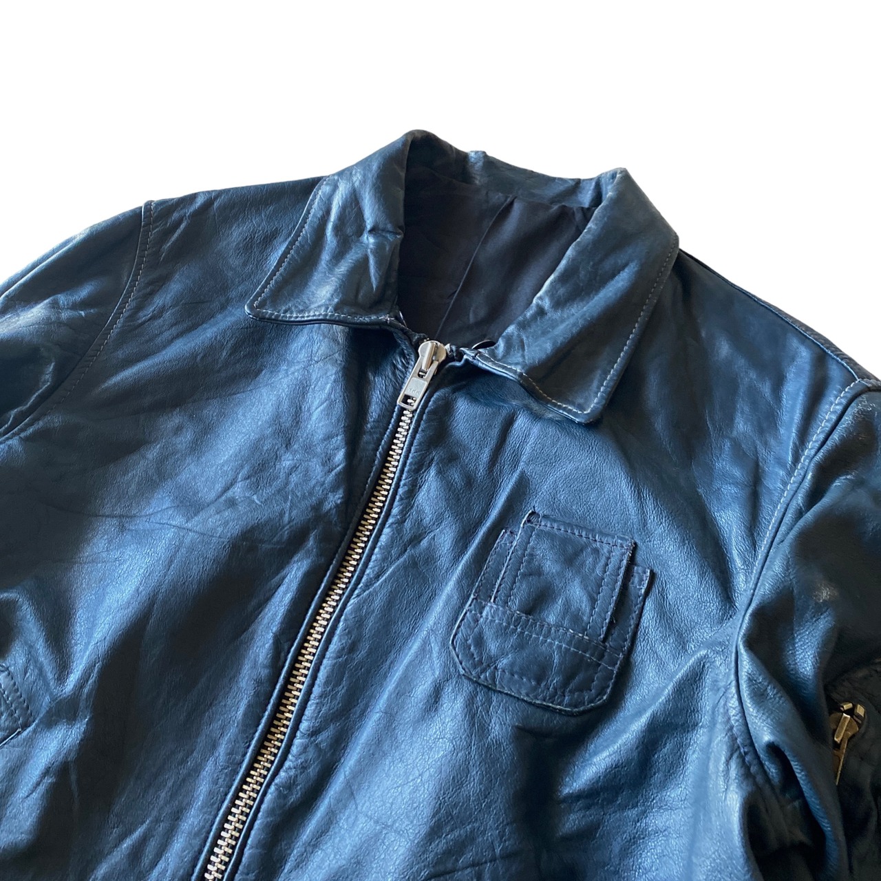 暗めのネイビーブルーレザー(おそらく牛革)に、短丈ボックスな丸みのあるシルエットが非常に格好良い一着。