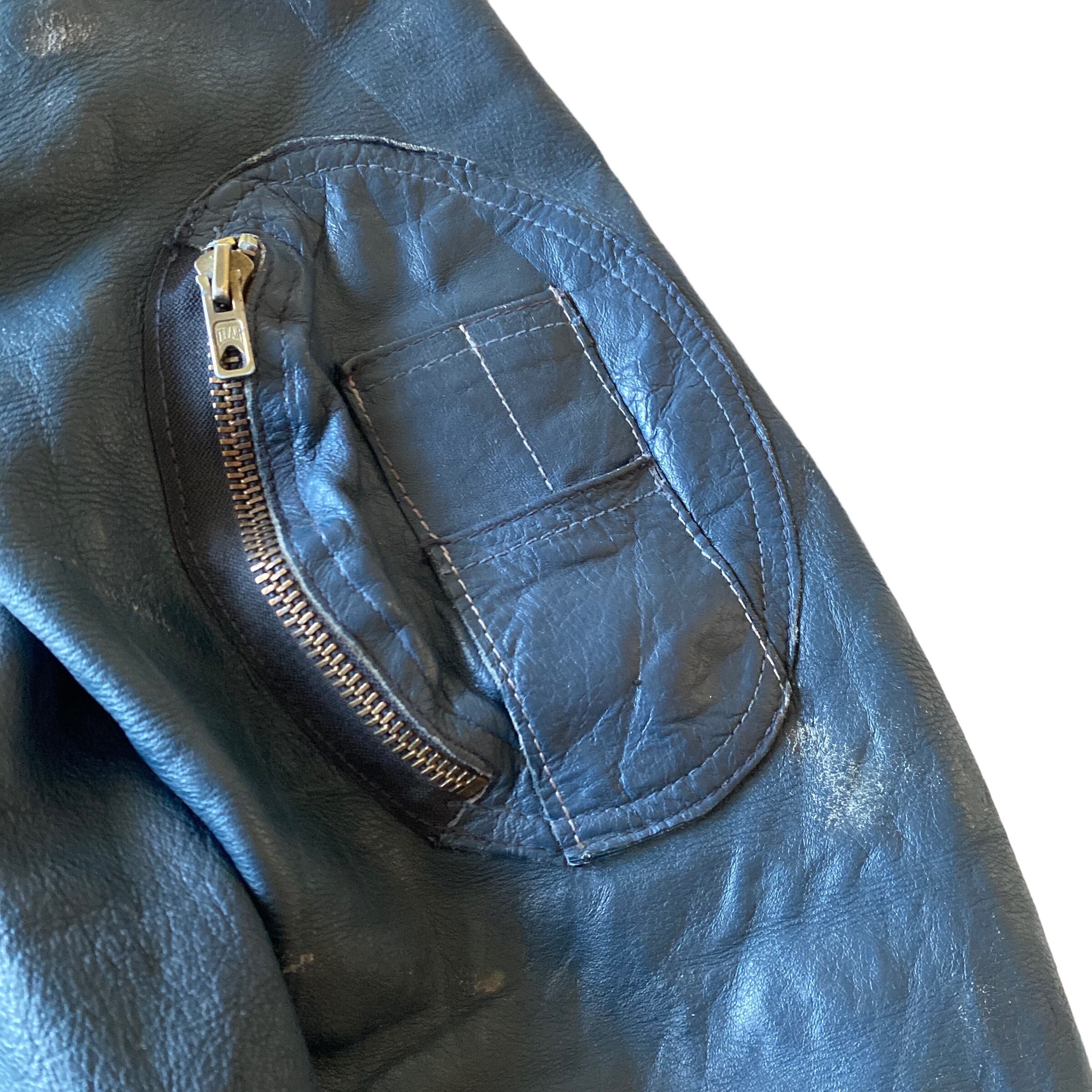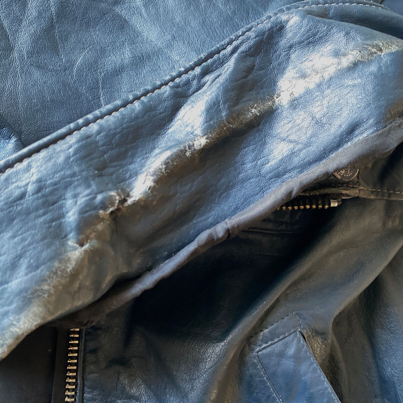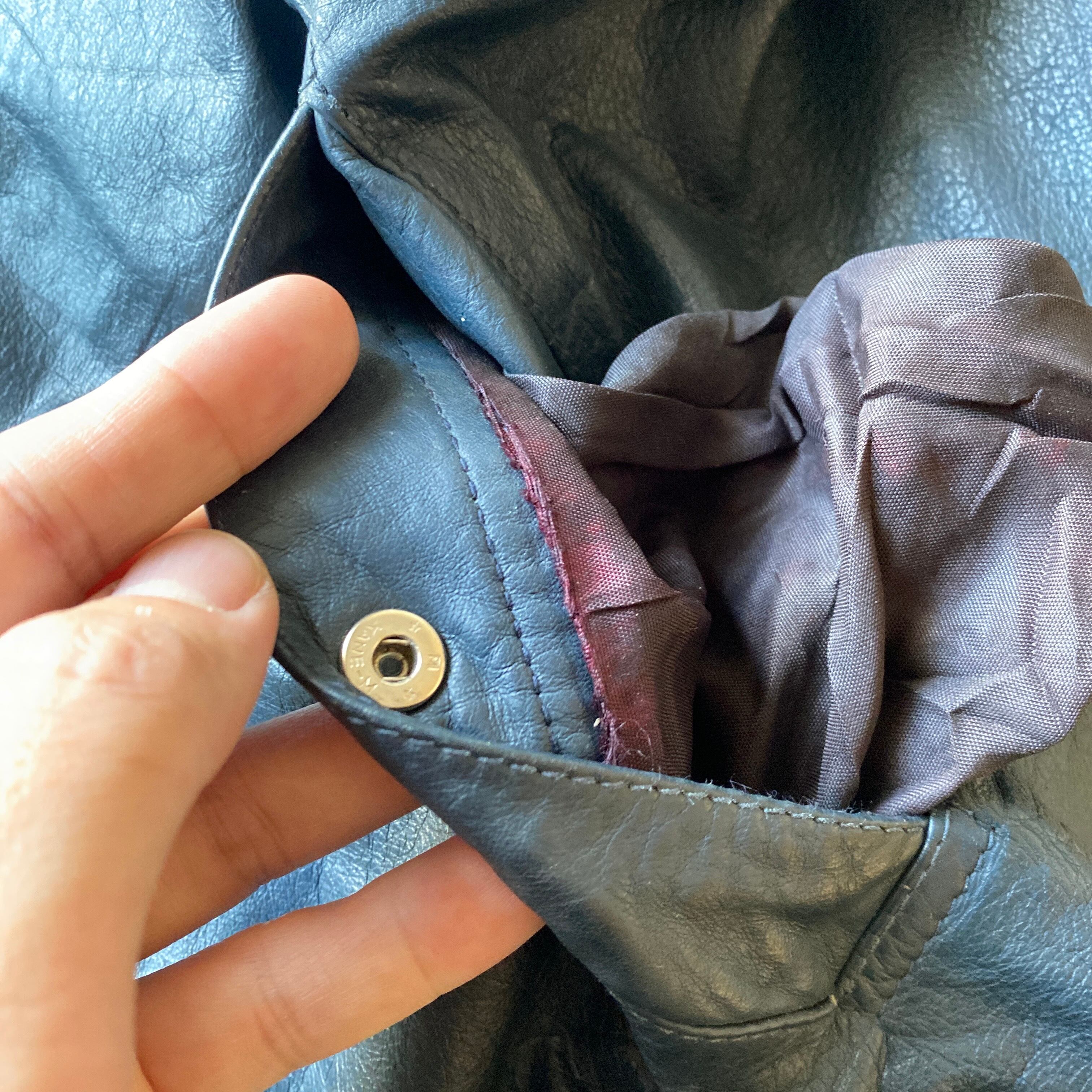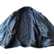 暗めのネイビーブルーレザー(おそらく牛革)に、短丈ボックスな丸みのあるシルエットが非常に格好良い一着。