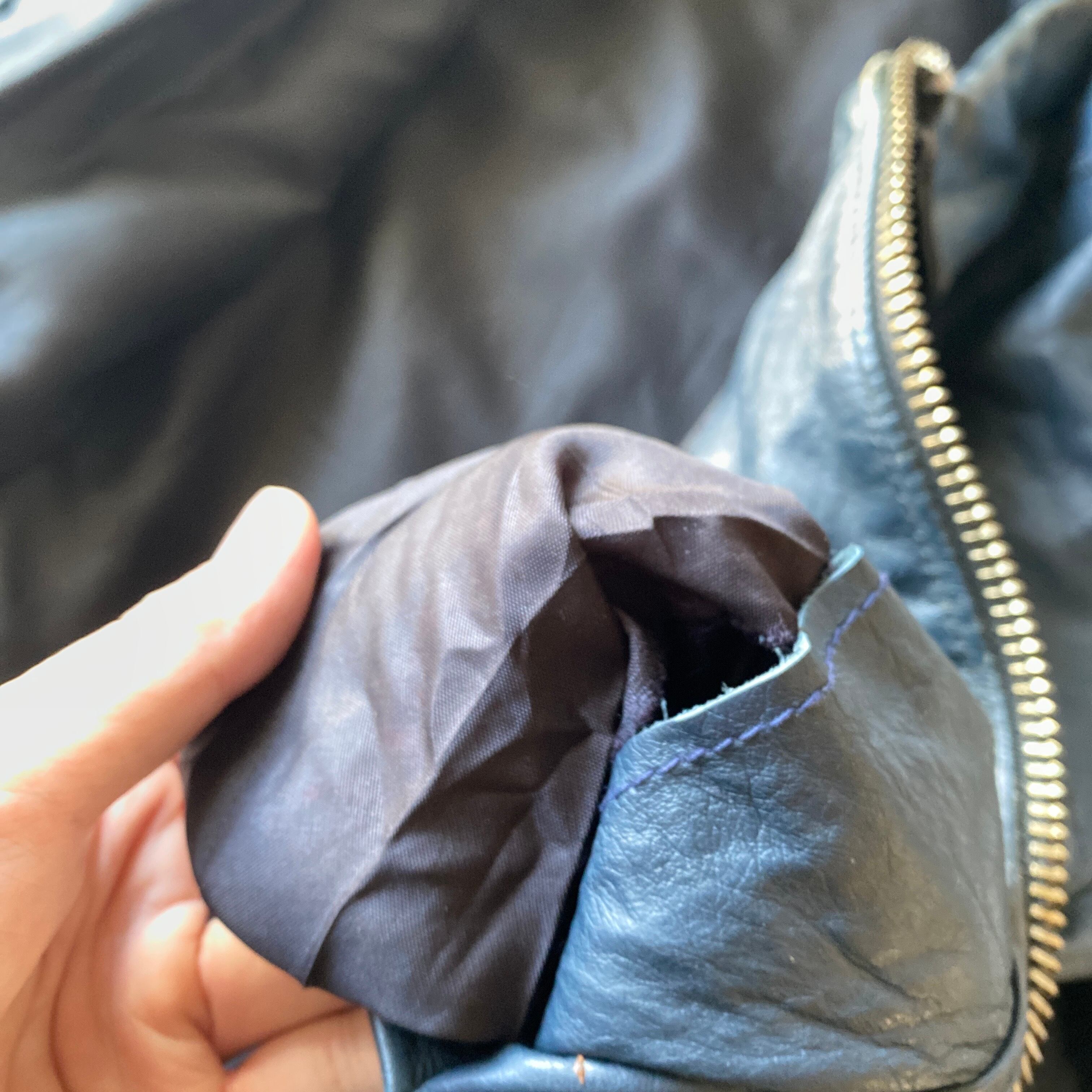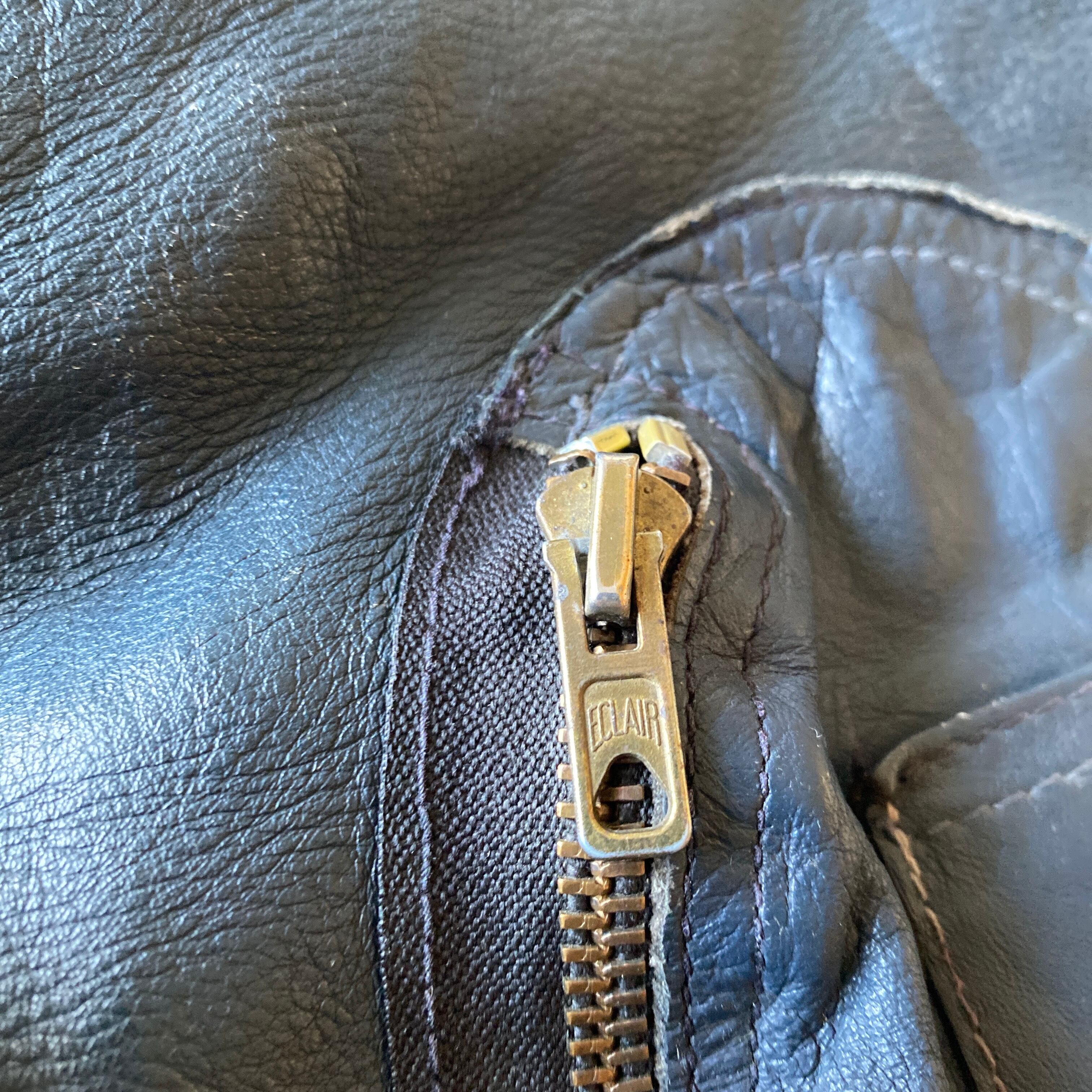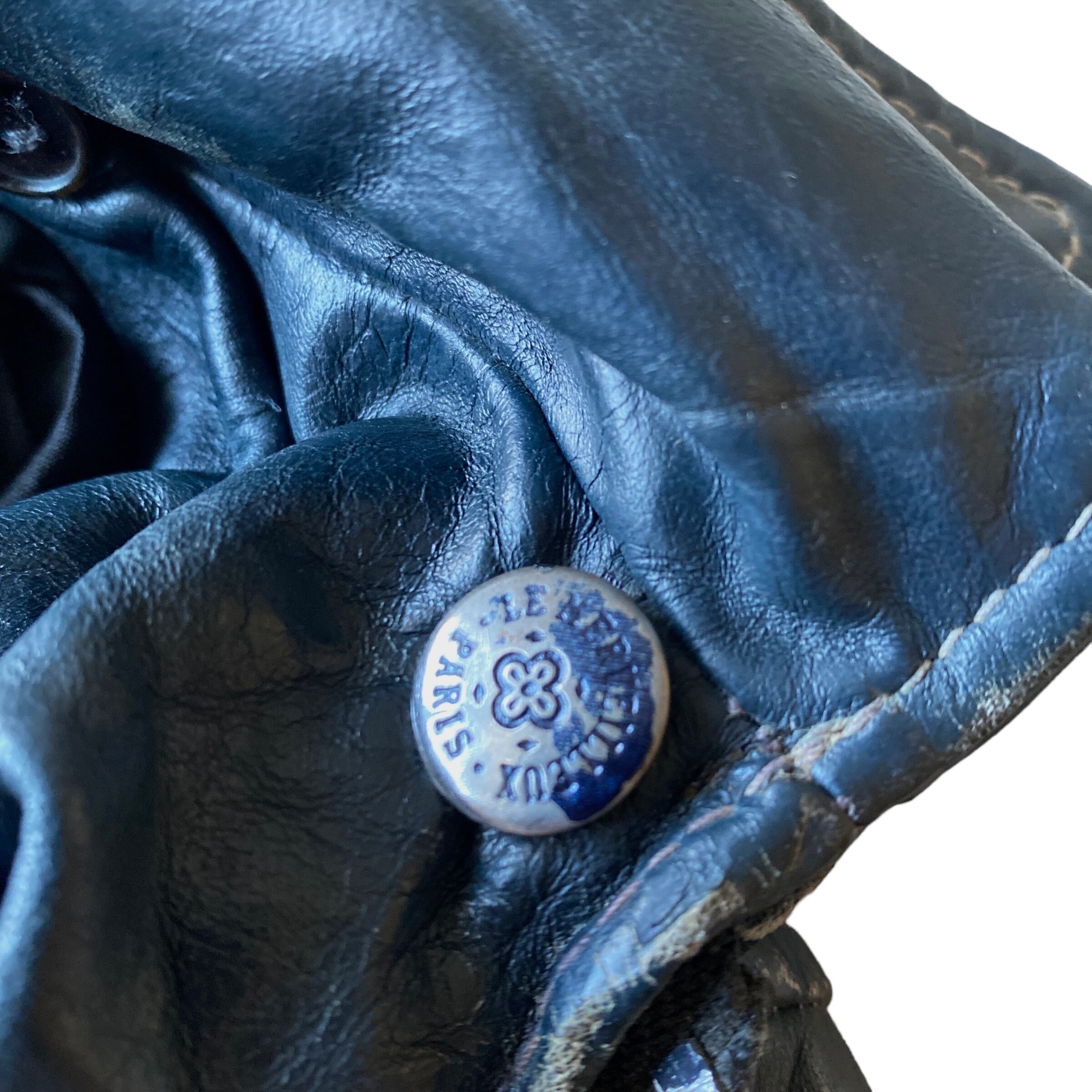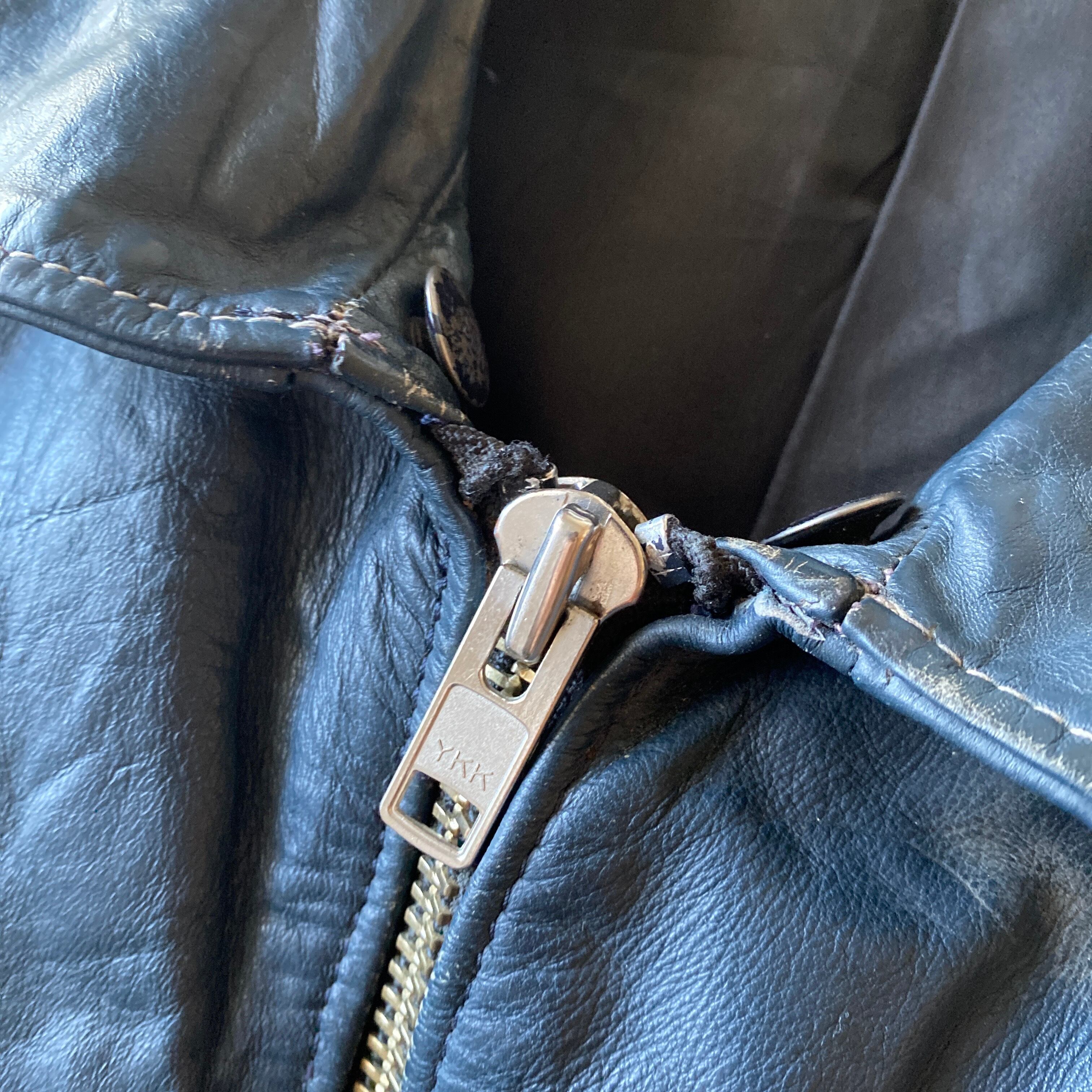 暗めのネイビーブルーレザー(おそらく牛革)に、短丈ボックスな丸みのあるシルエットが非常に格好良い一着。