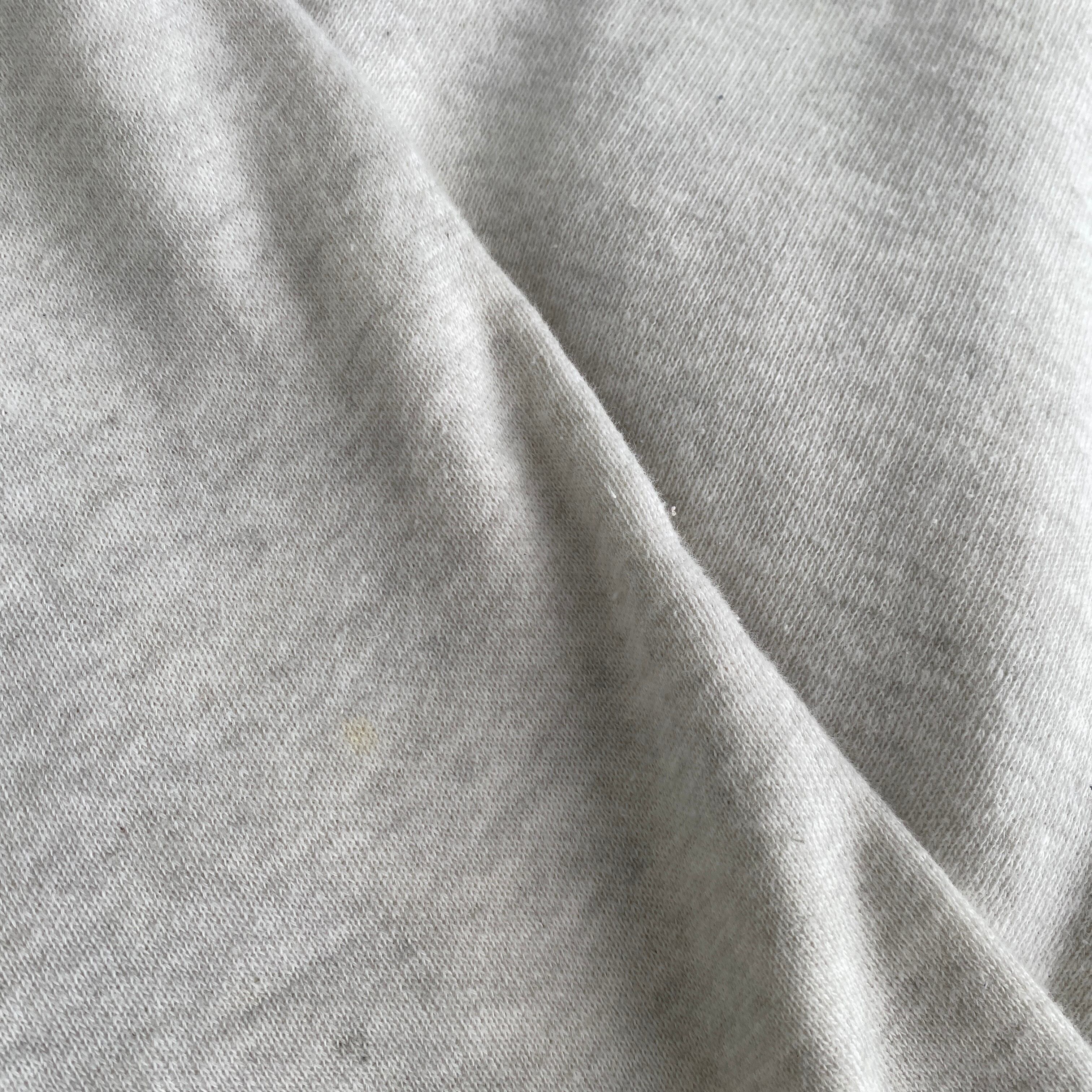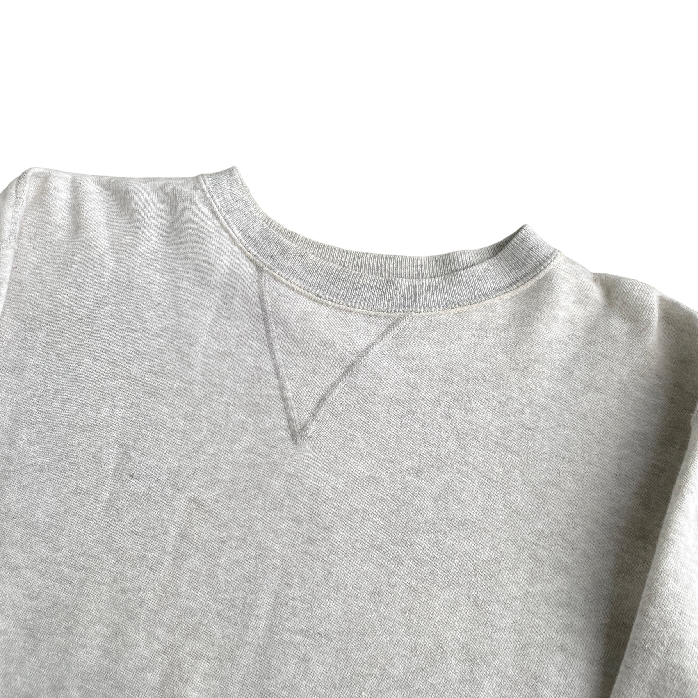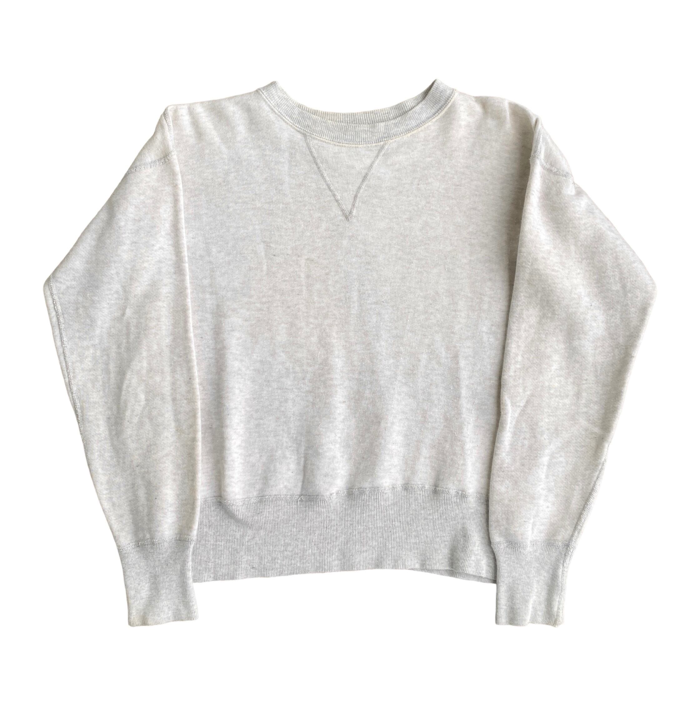 オートミール×グレーのツートン、前V、長リブ、4本針フラットシーマ、吊編みの丸胴ボディとヴィンテージらしい要素が詰まった一着。