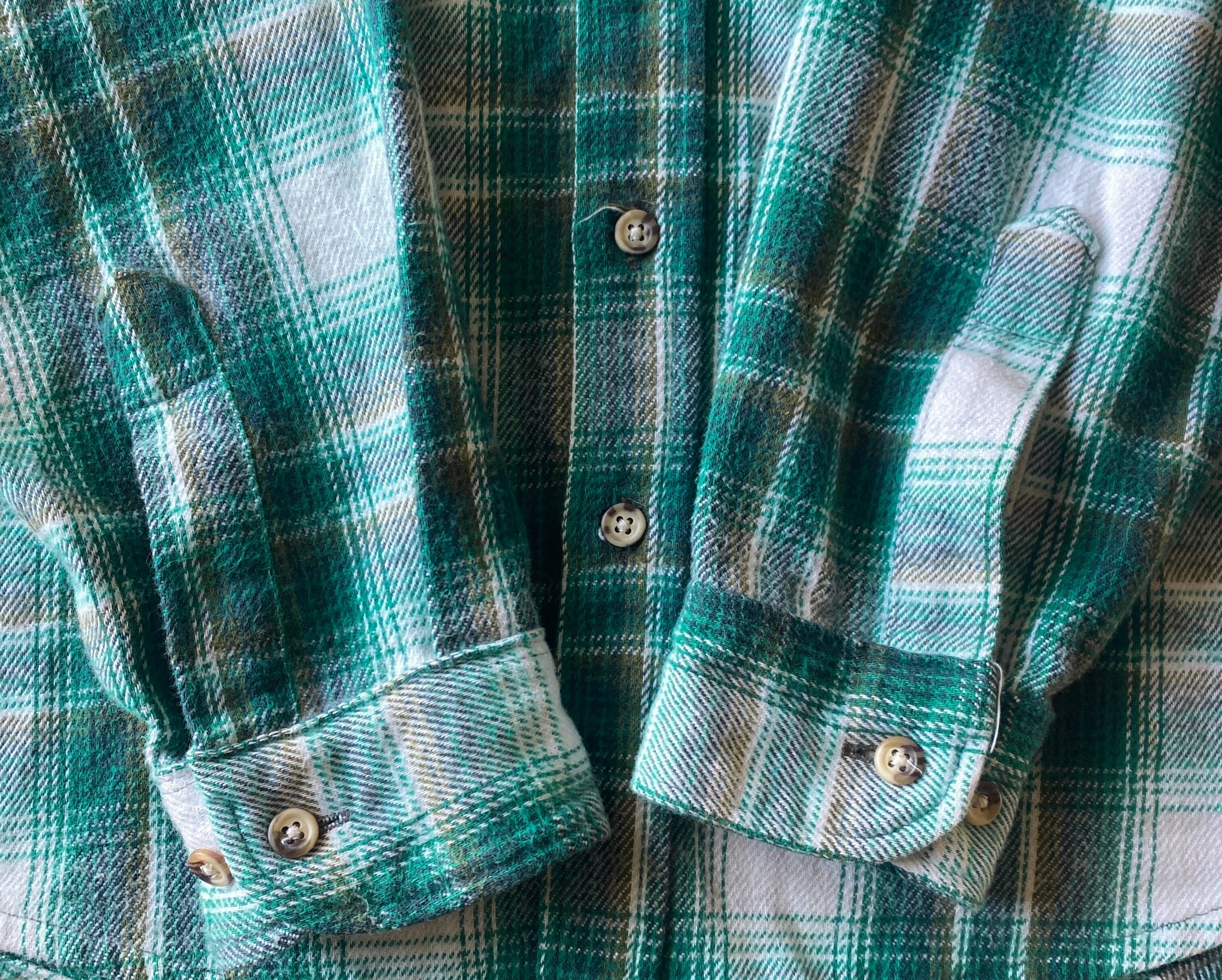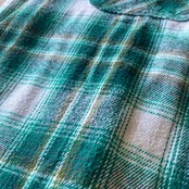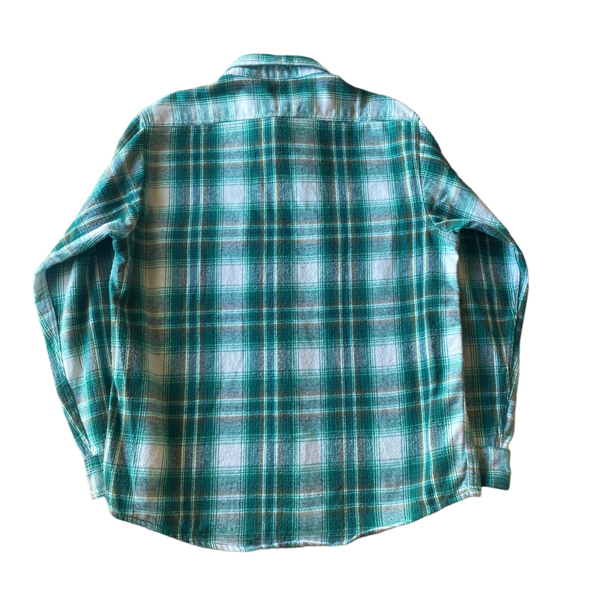 肉厚でモチっとしたコットンネル素材に、グリーン×ホワイトのオンブレチェックが非常に格好良い一着。(実物はもうすこし青みのない柔らかいグリーンです)