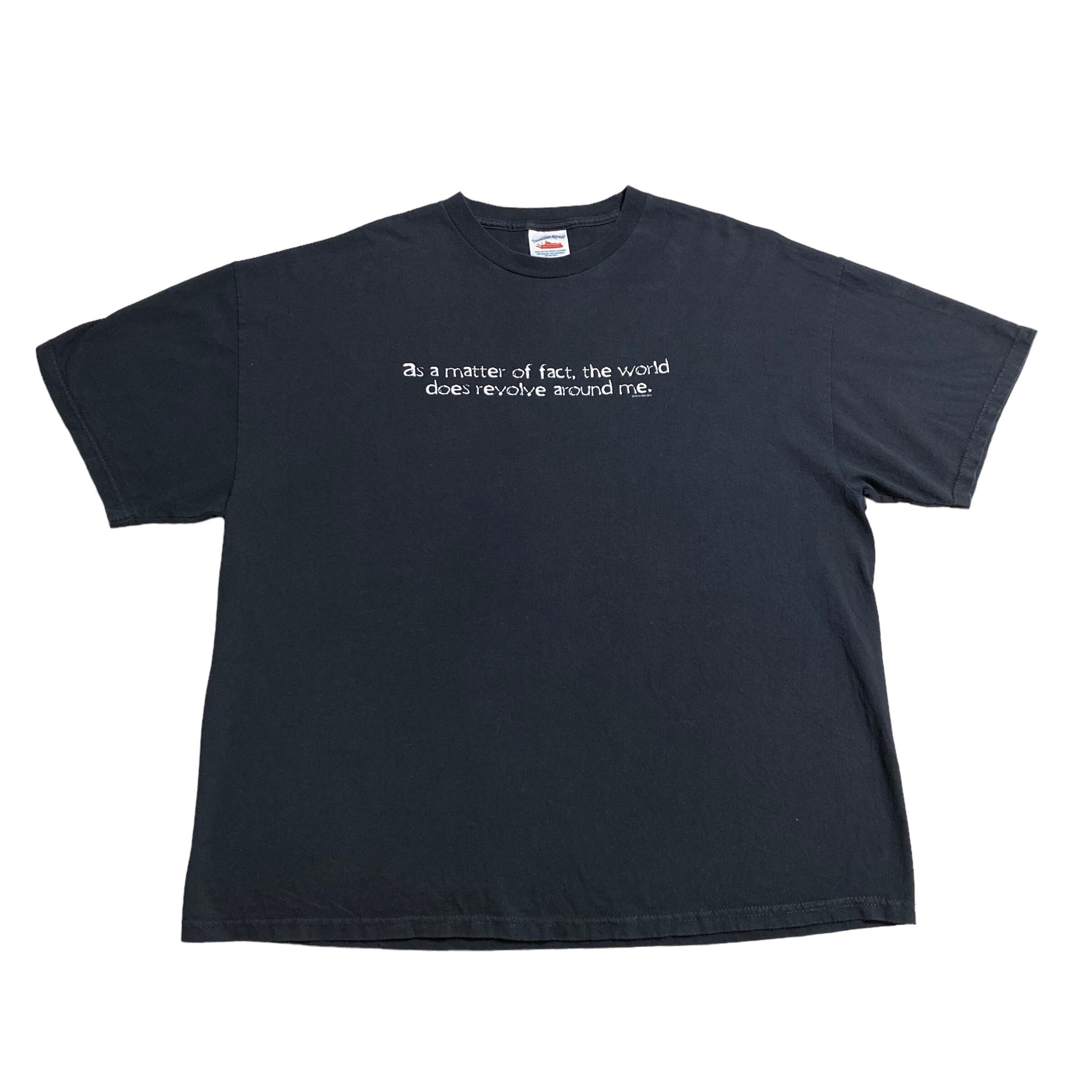 ブラックボディにホワイトの文字プリントとスタイリッシュなデザインですが、その実As a matter of fact,the world does revolve around me.(実際のところ、世界は俺中心にまわってる)と中々ふざけ倒した意味が書かれた良い塩梅の一着。