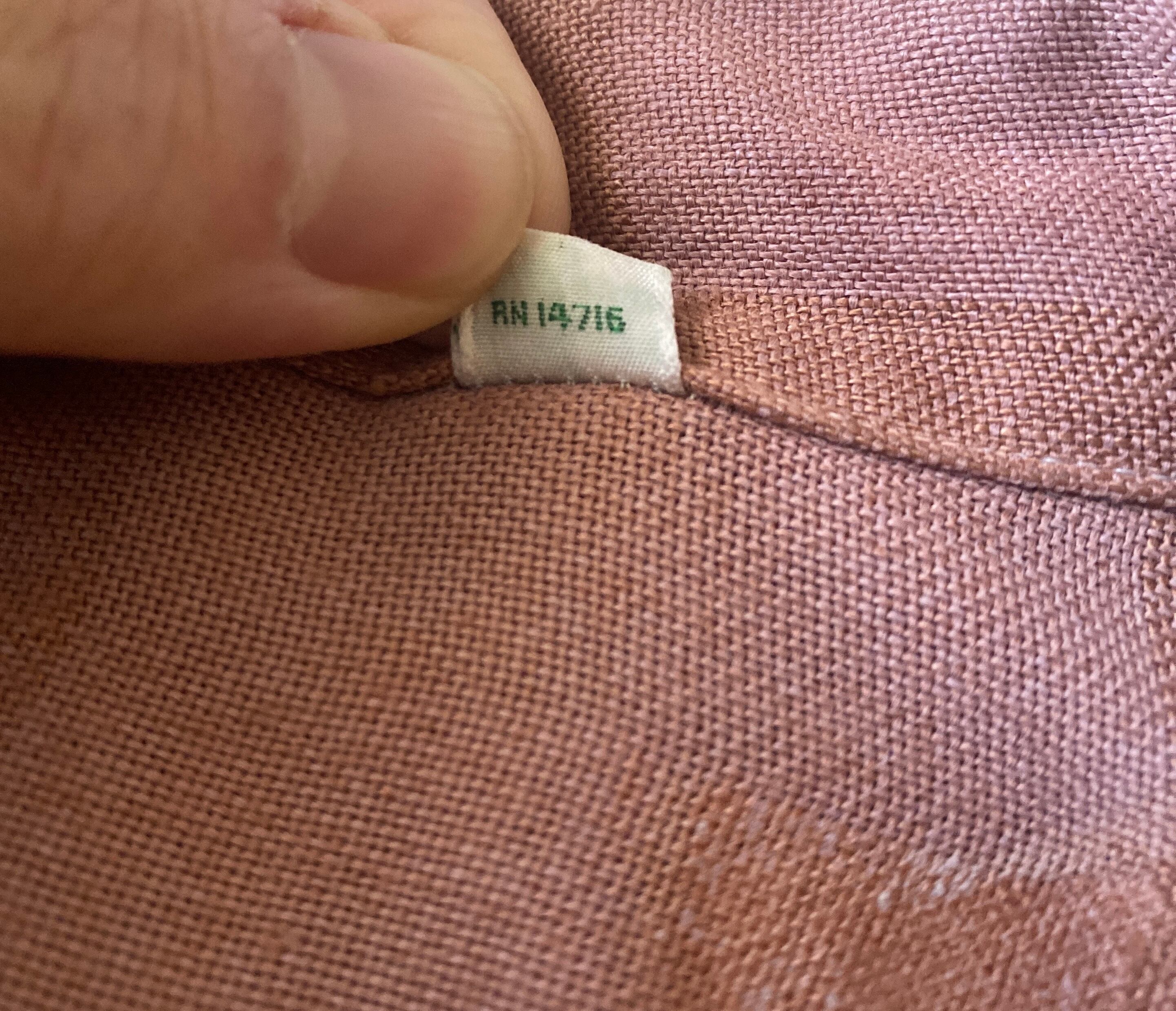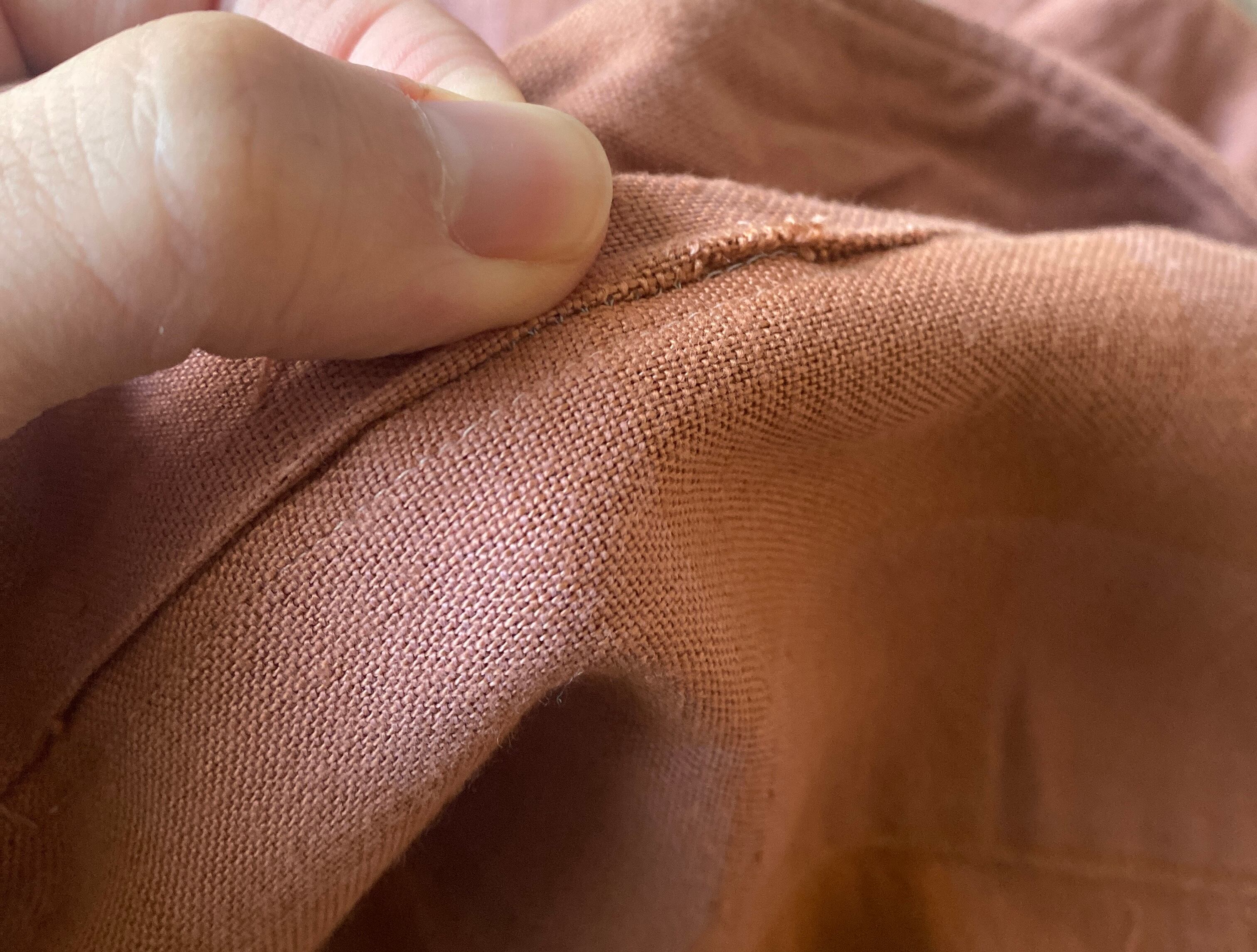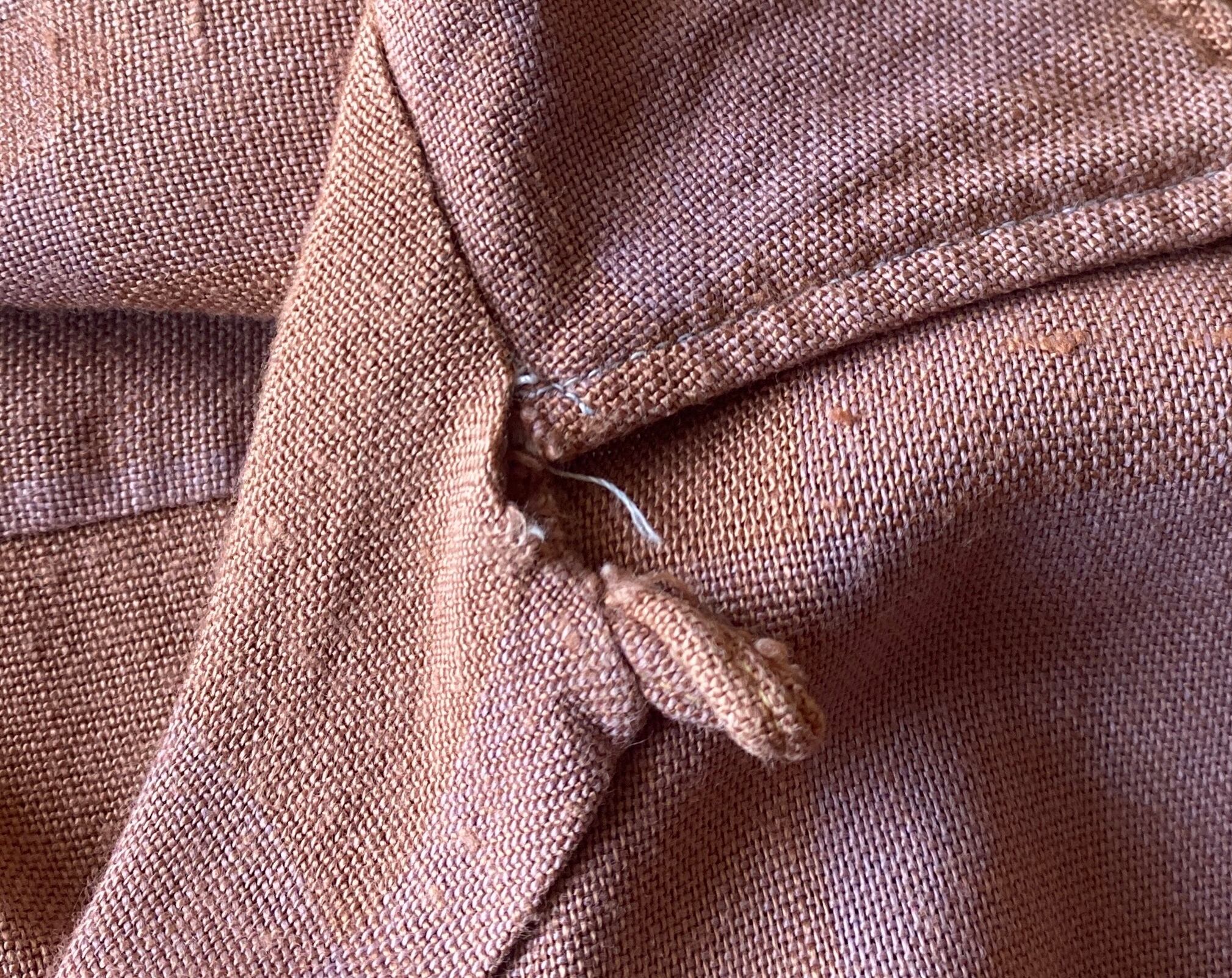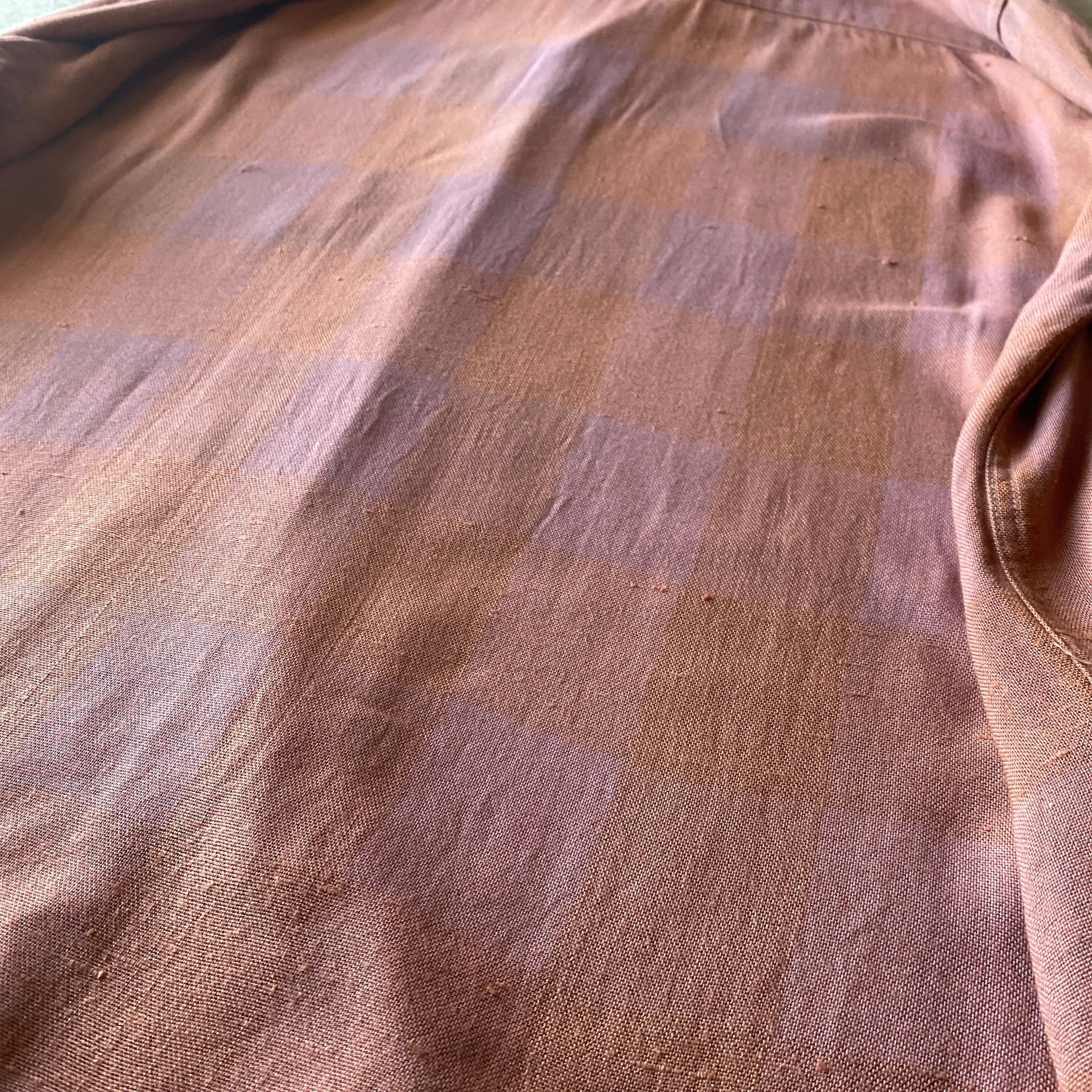 くすんだサーモンピンクと一部にほんのりくすんだブルーが混ざったような絶妙な色目に、肉厚な生地のドレープ感が大変素晴らしい一着。