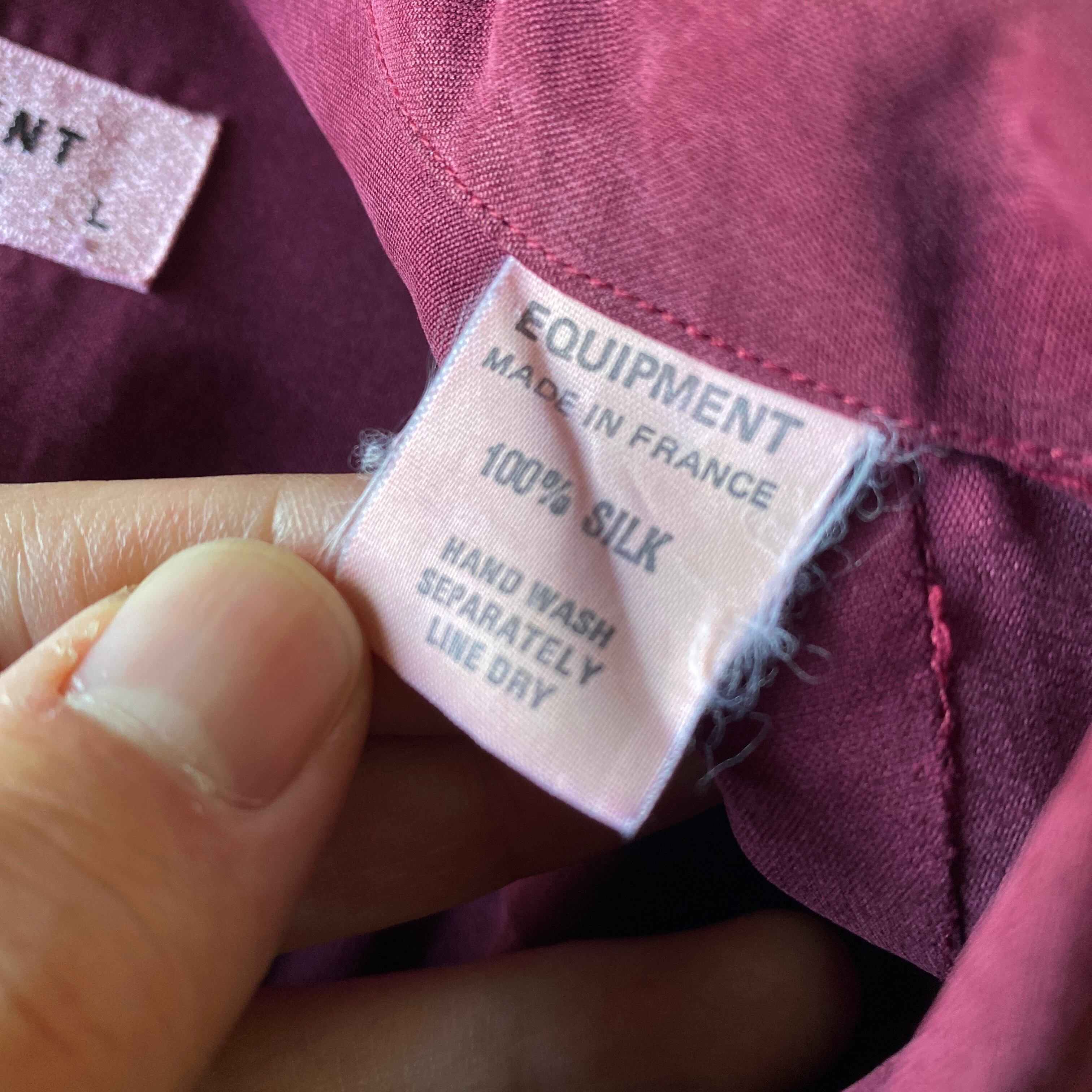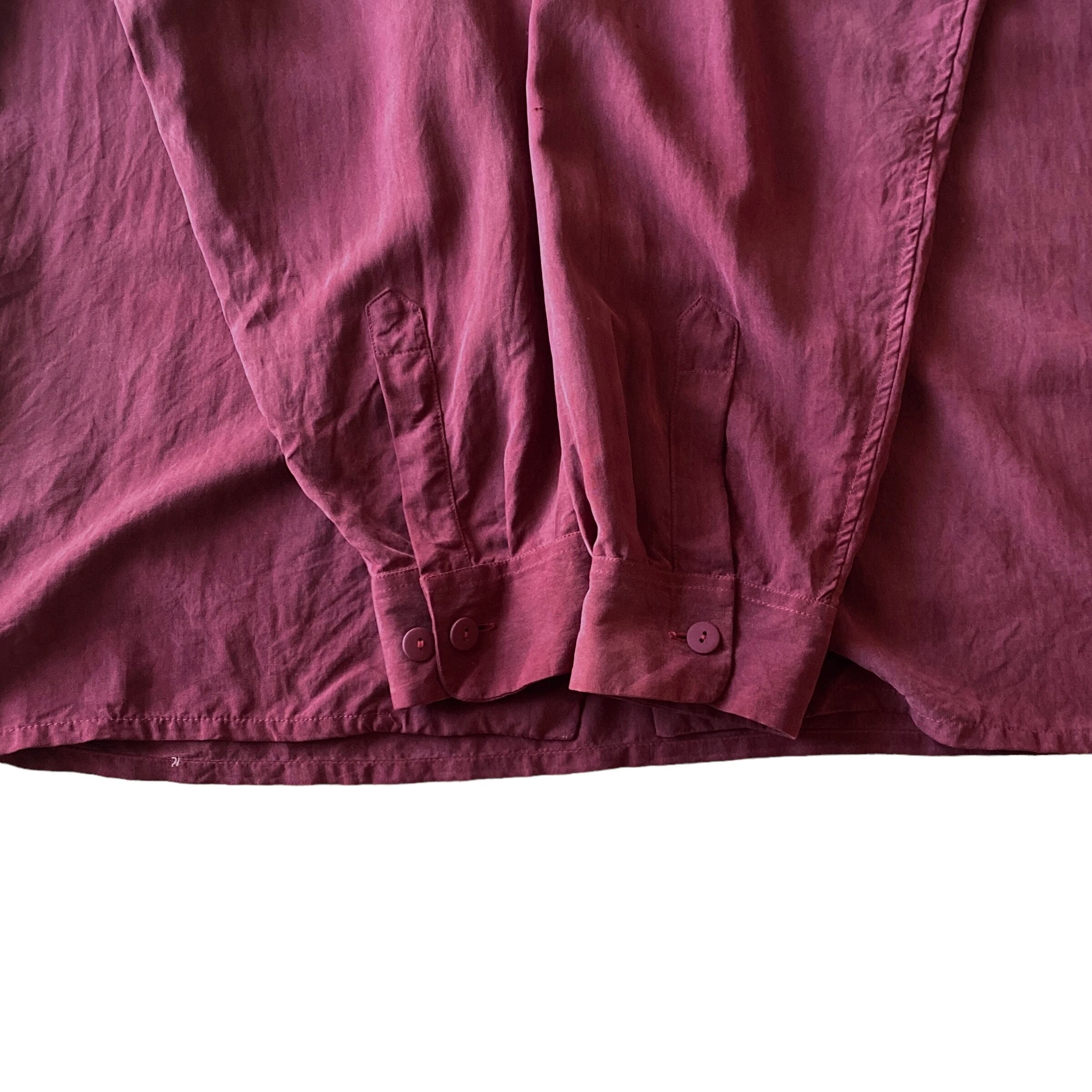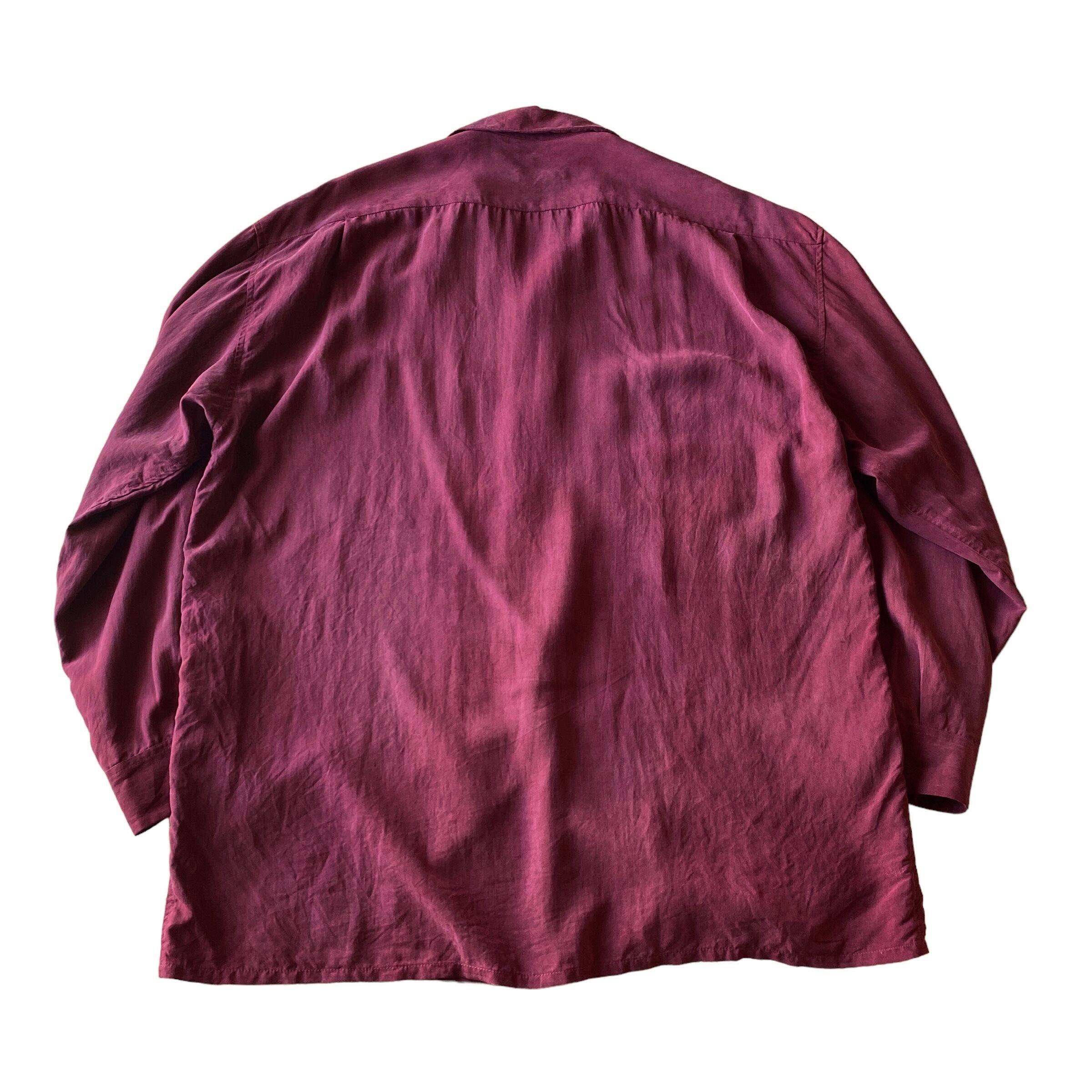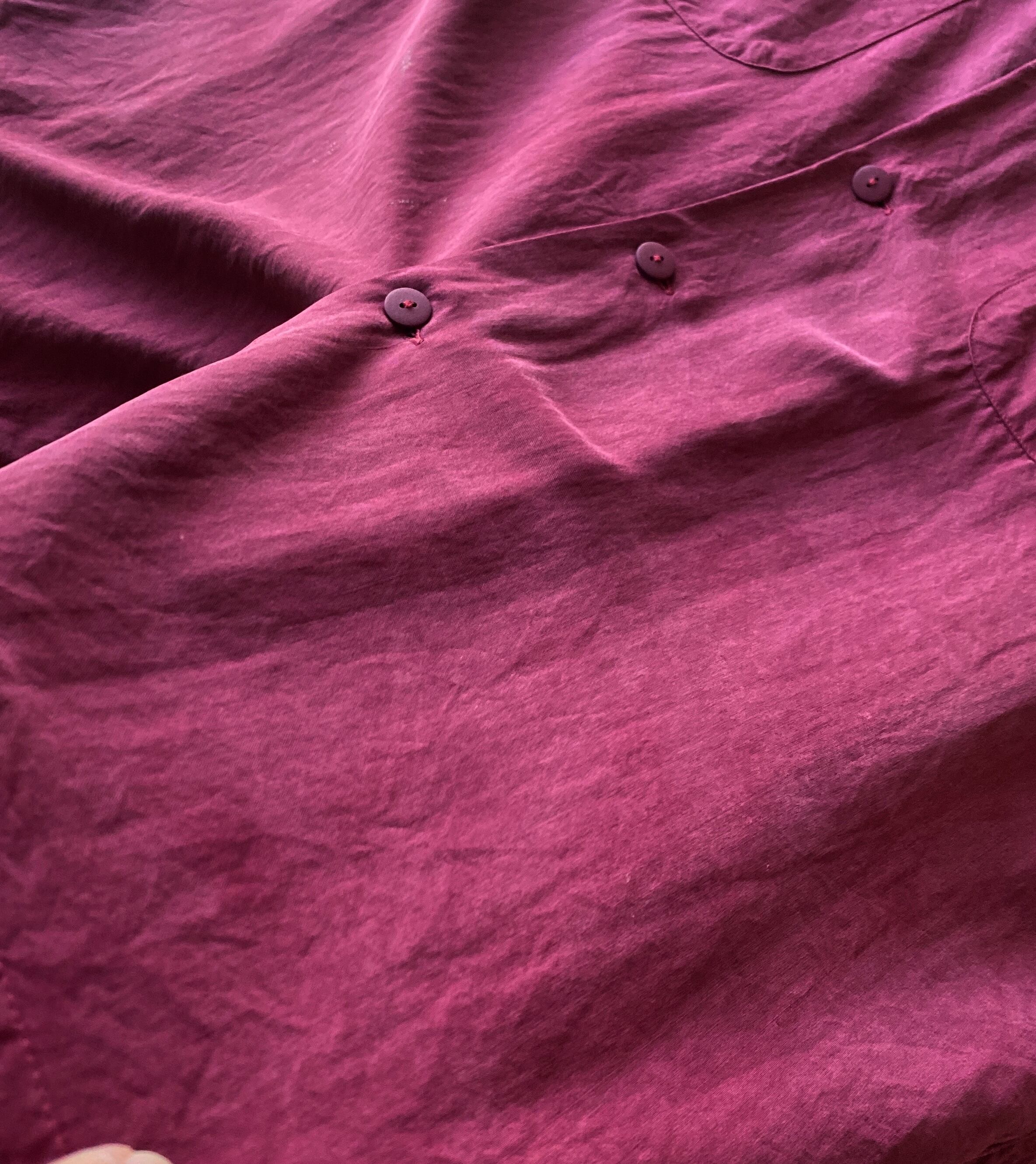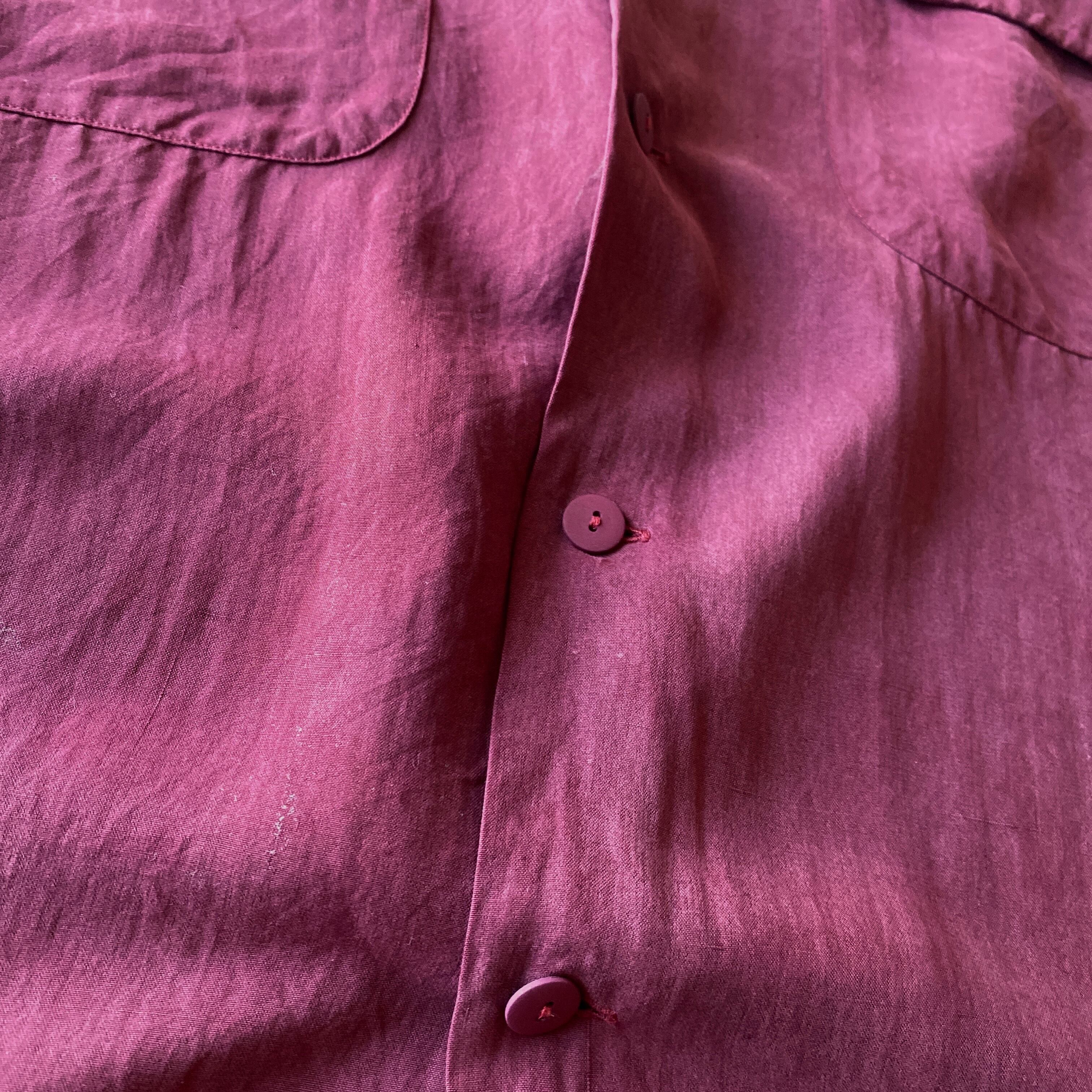 ややくすみがかったダークバーガンディ(実物はもう気持ち暗いです)の色目に、ウォッシャブルシルク特有の、白くモヤがかかるような陰影のある風合いが非常に良い雰囲気を出しております。