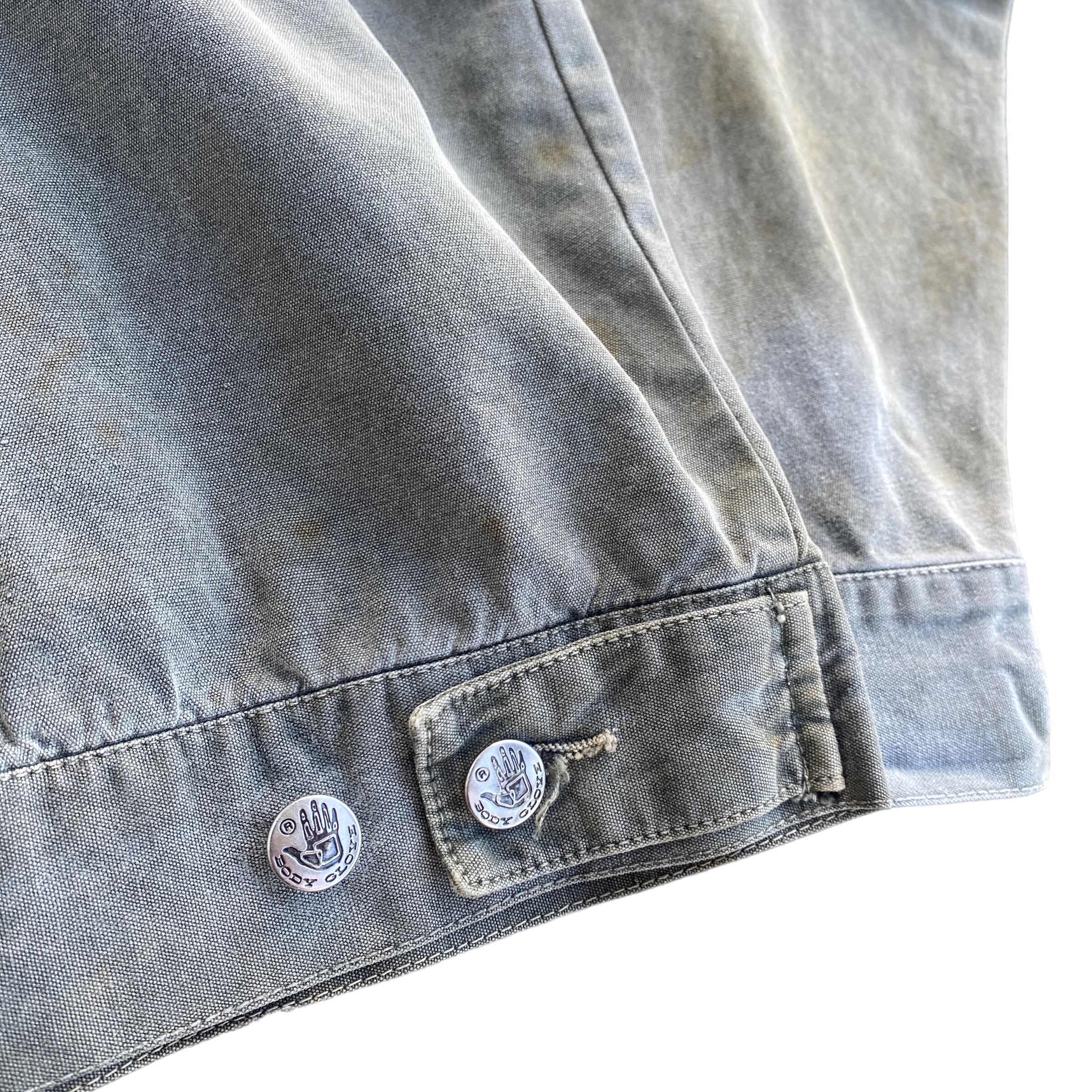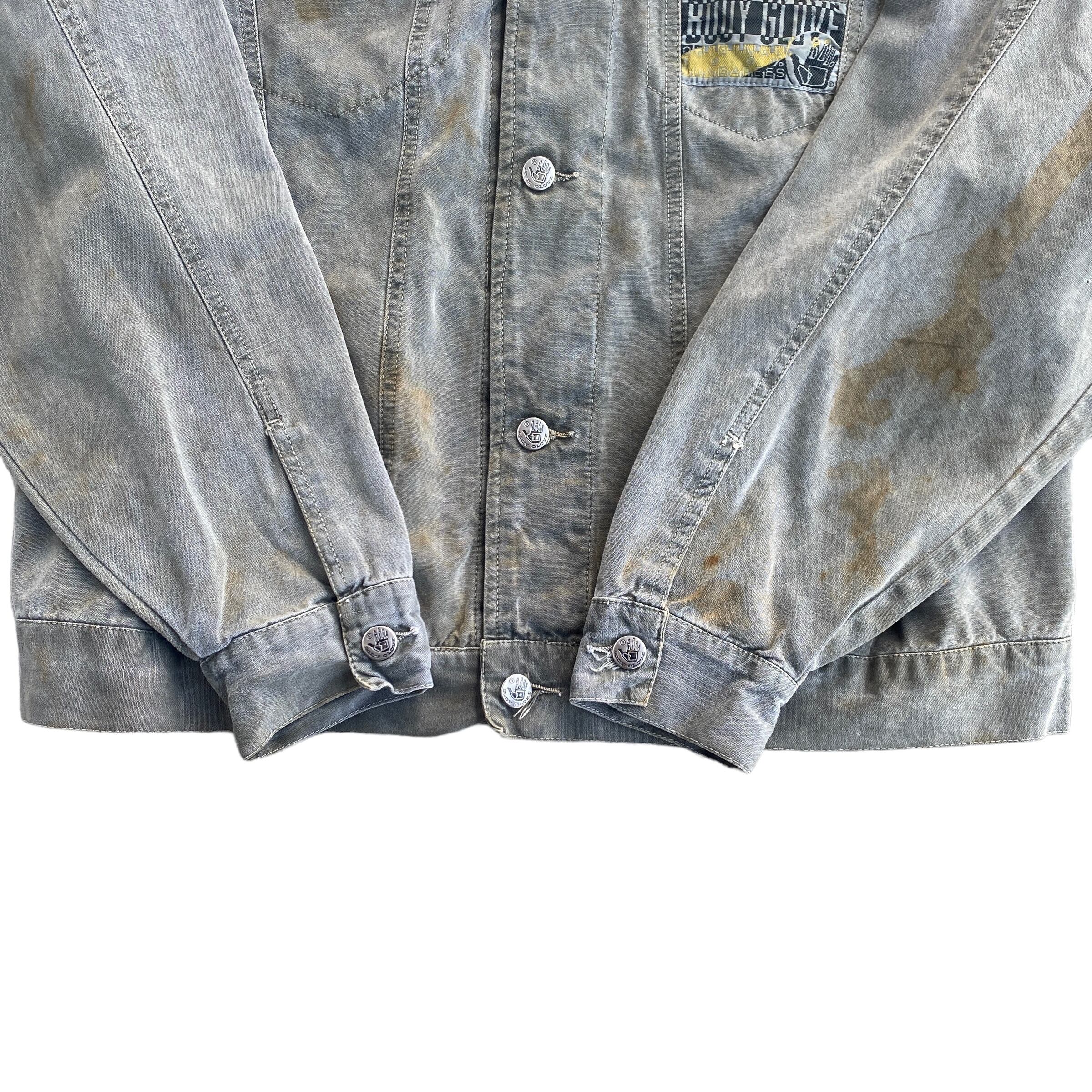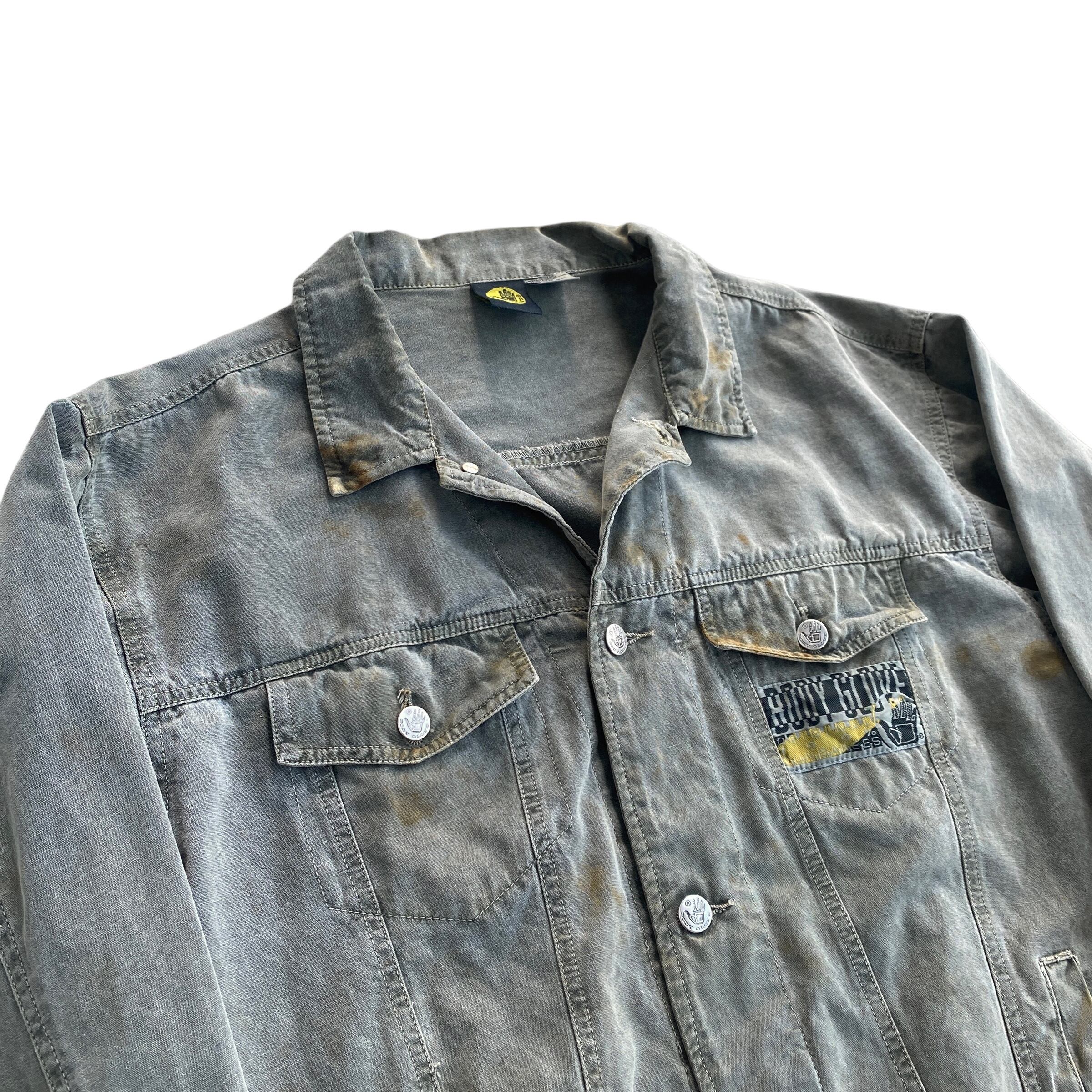 目の詰まったコットン100のライトキャンバス地に、短丈ボックスな今っぽいシルエット、全体的に入ったオイル、サビっぽい汚れがめちゃくちゃ格好良い一着。