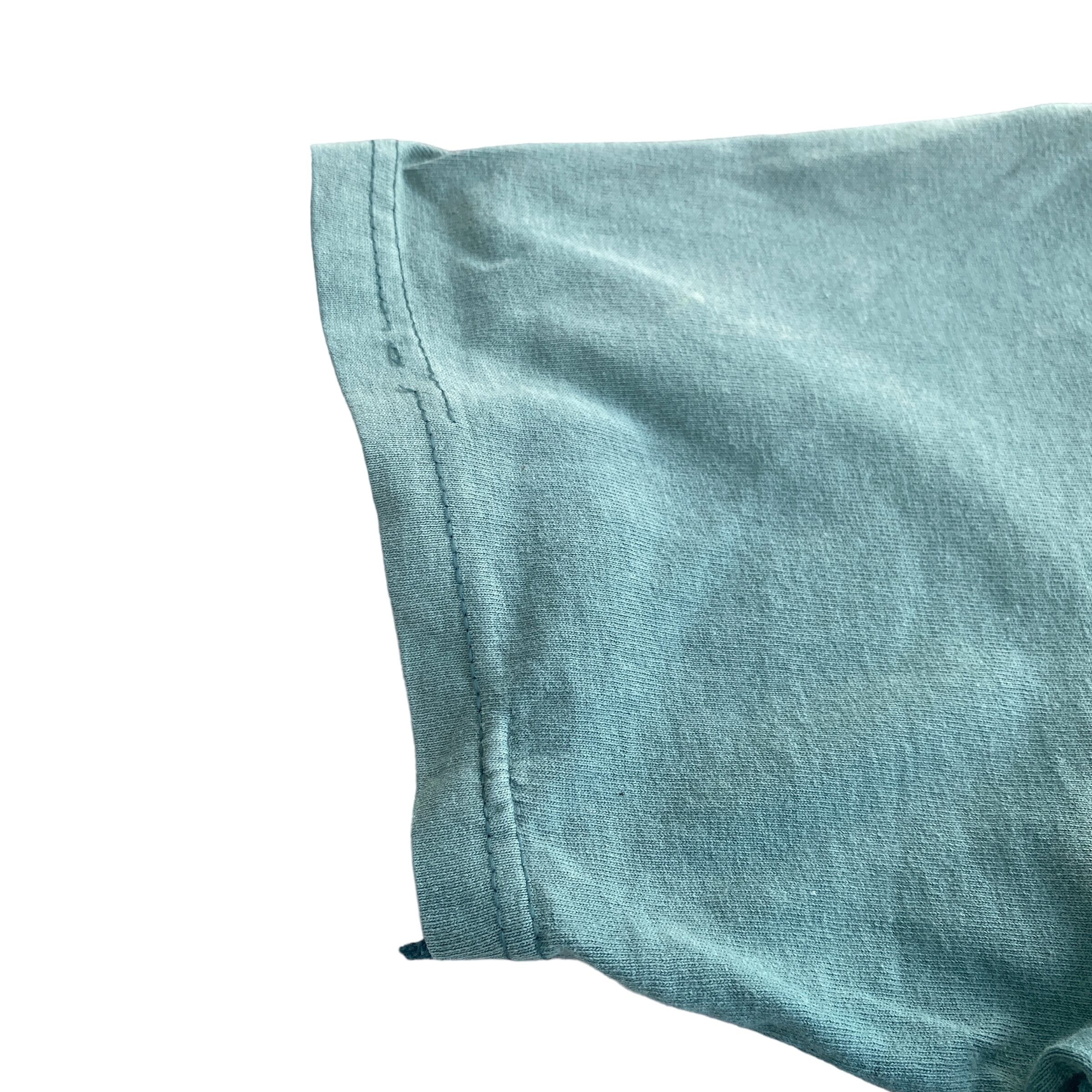 フェードしたサーフグリーンのような色目に、太陽?のシュールなプリントが非常にかわいい一着。