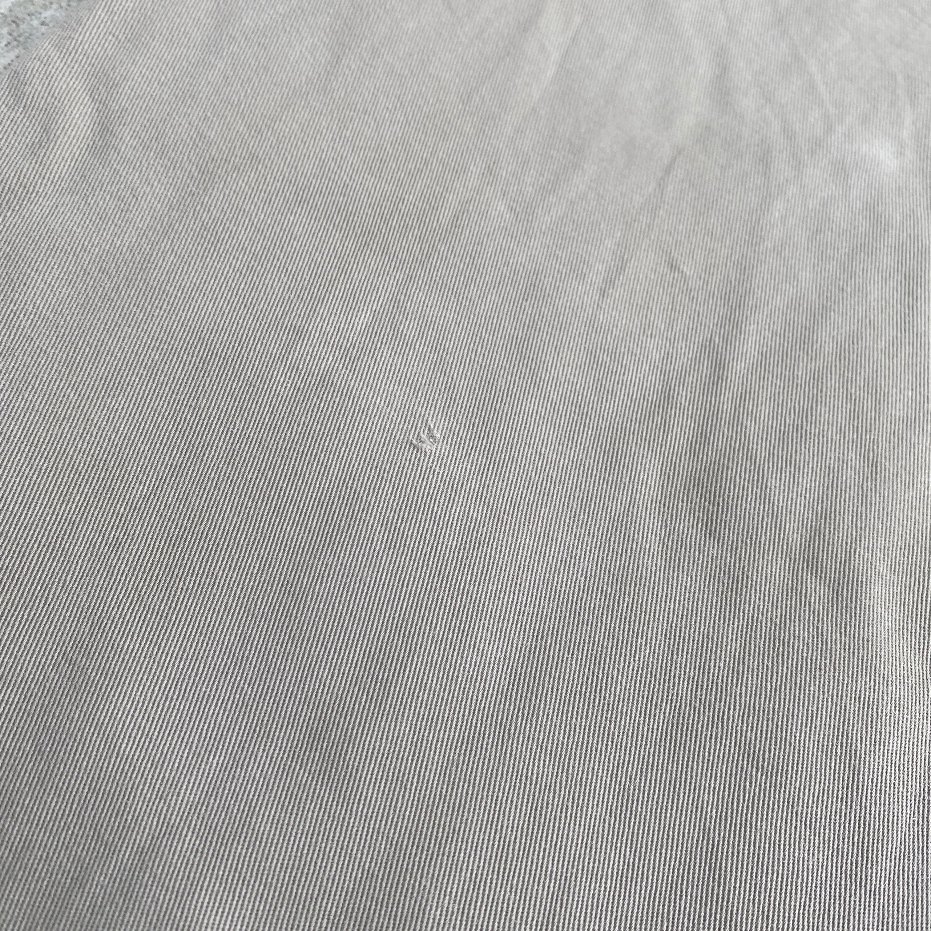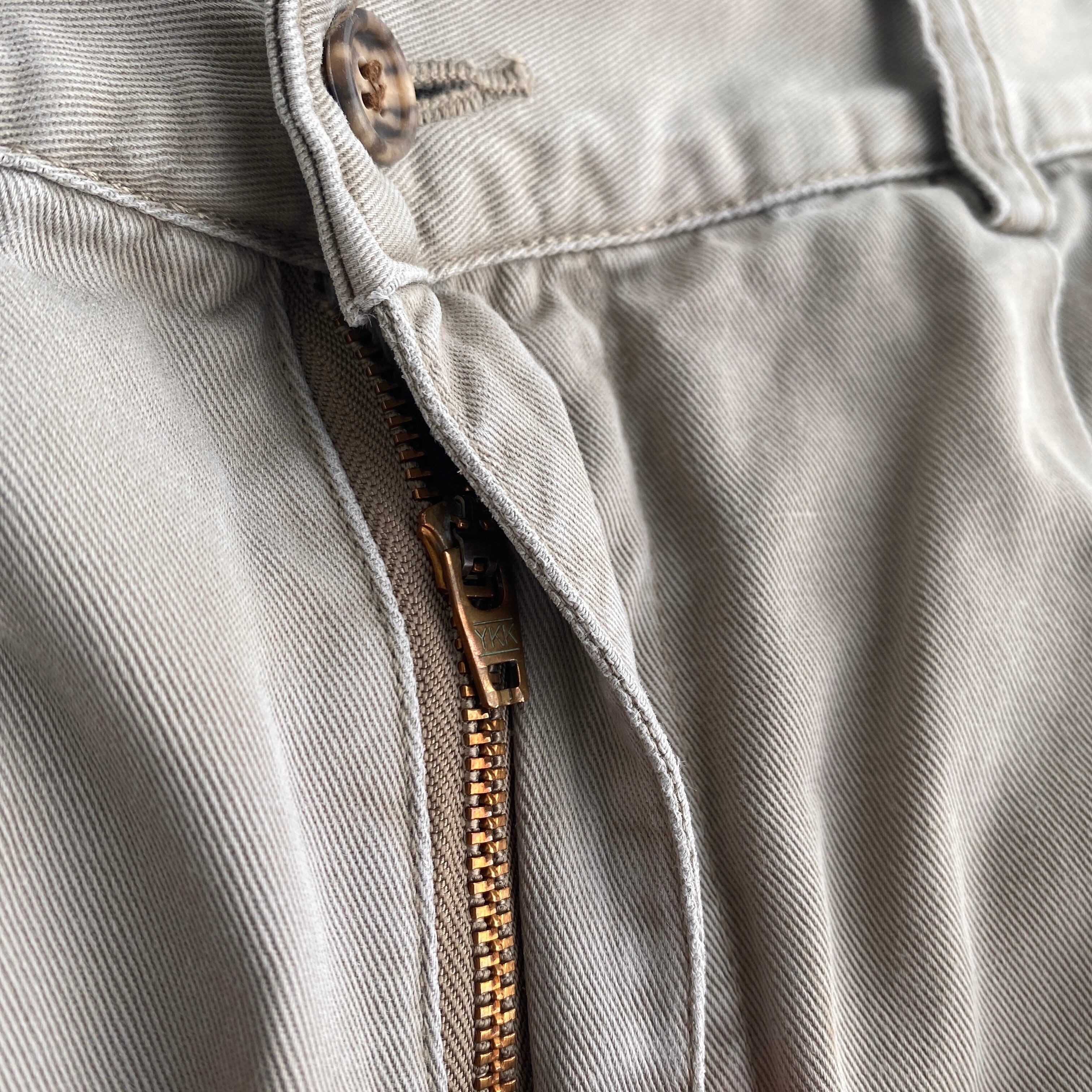 程よい厚みで風合いの良いコットンツイル素材に、柔らかで上品な色目のカーキベージュカラー(外光だと比較的画像1.2が近いかと)、程よくテーパードの効いたワイドシルエットが非常に格好良い一着。