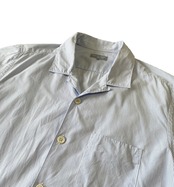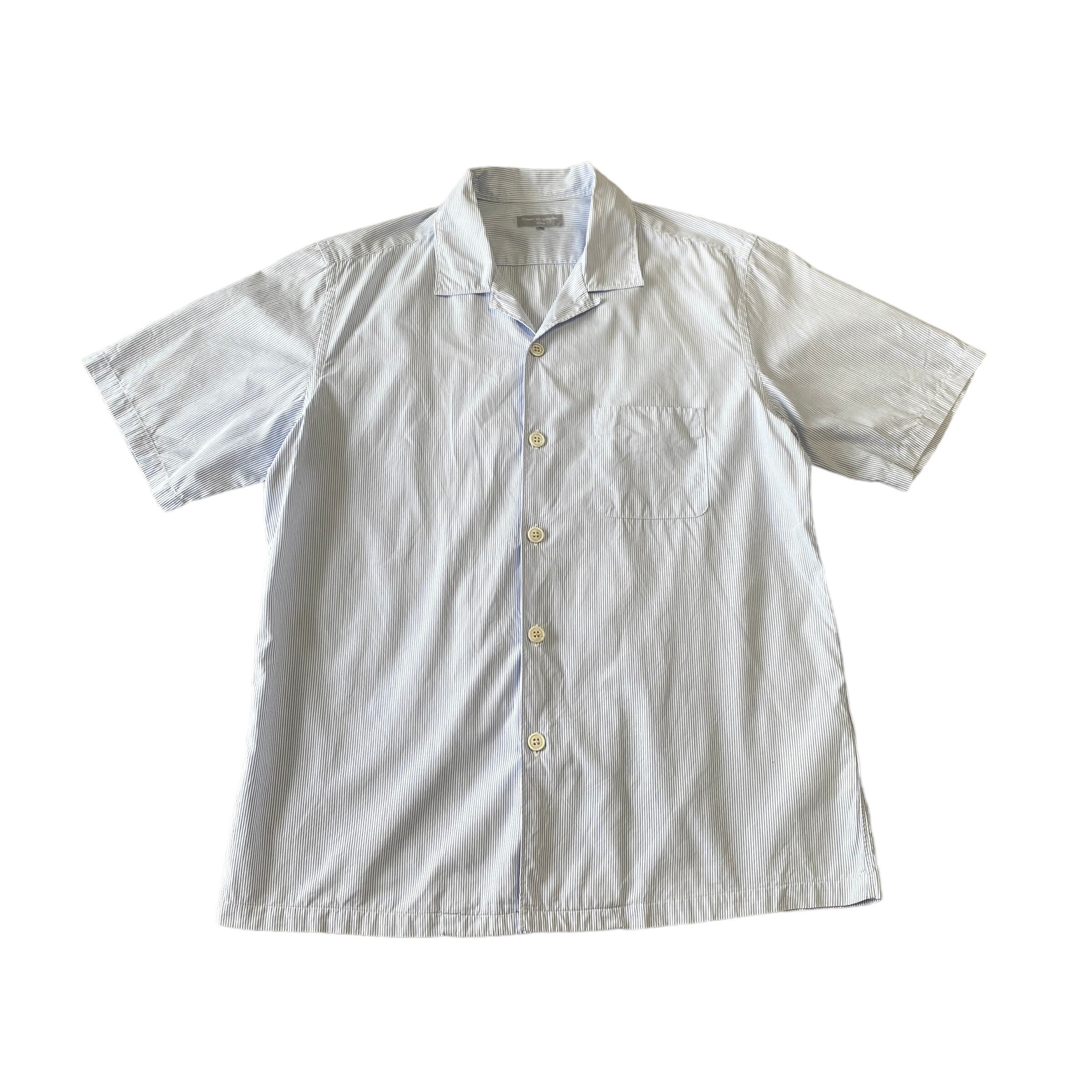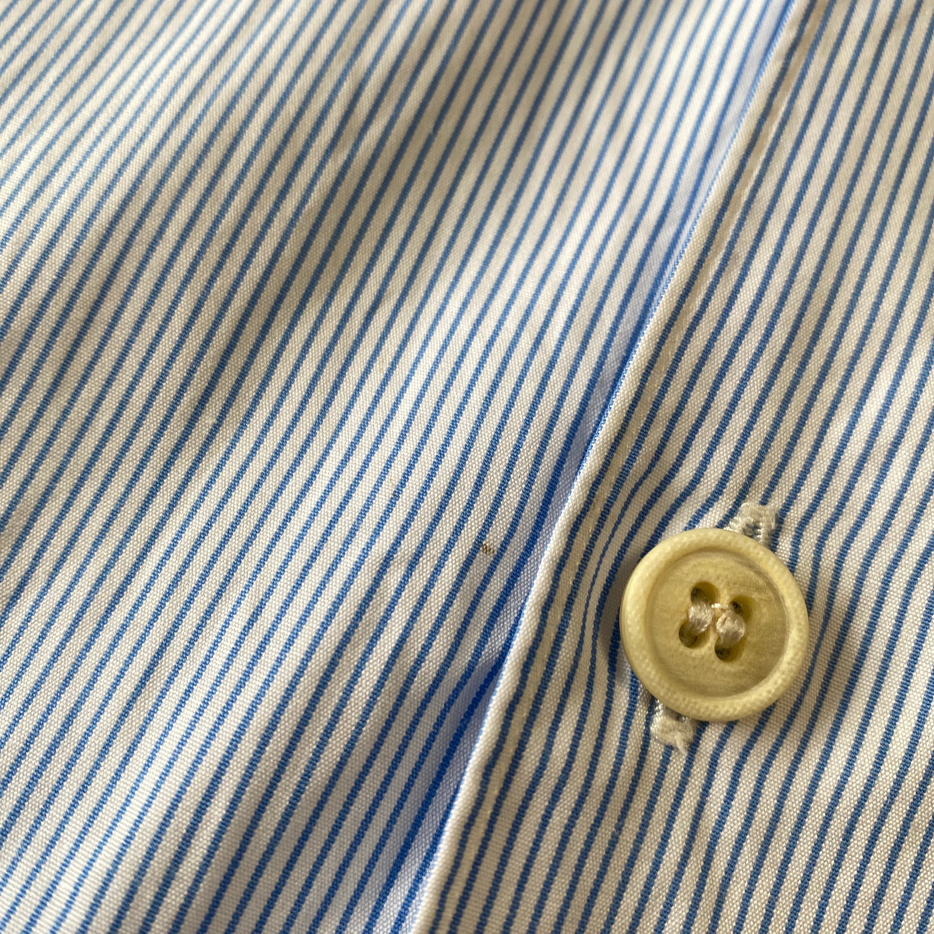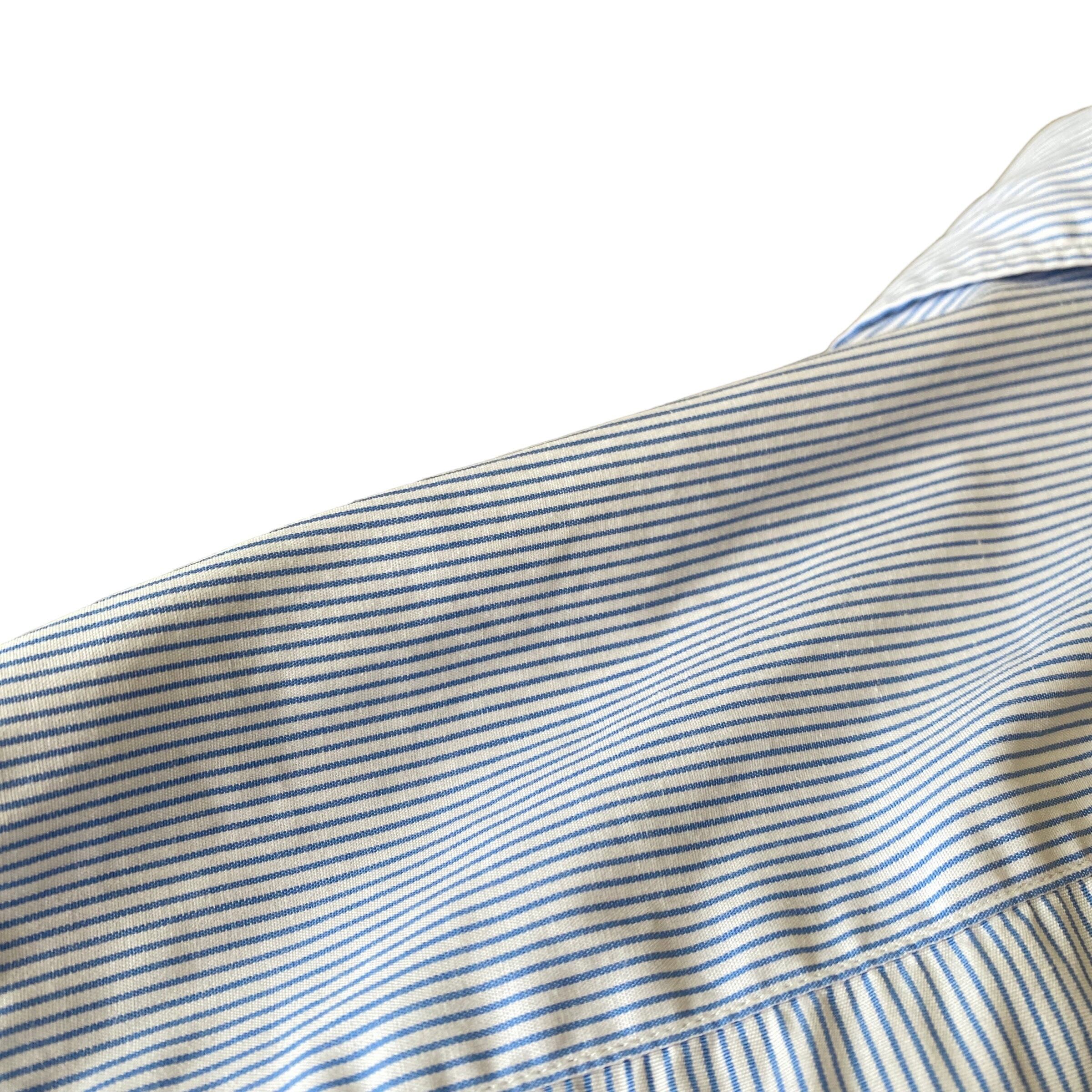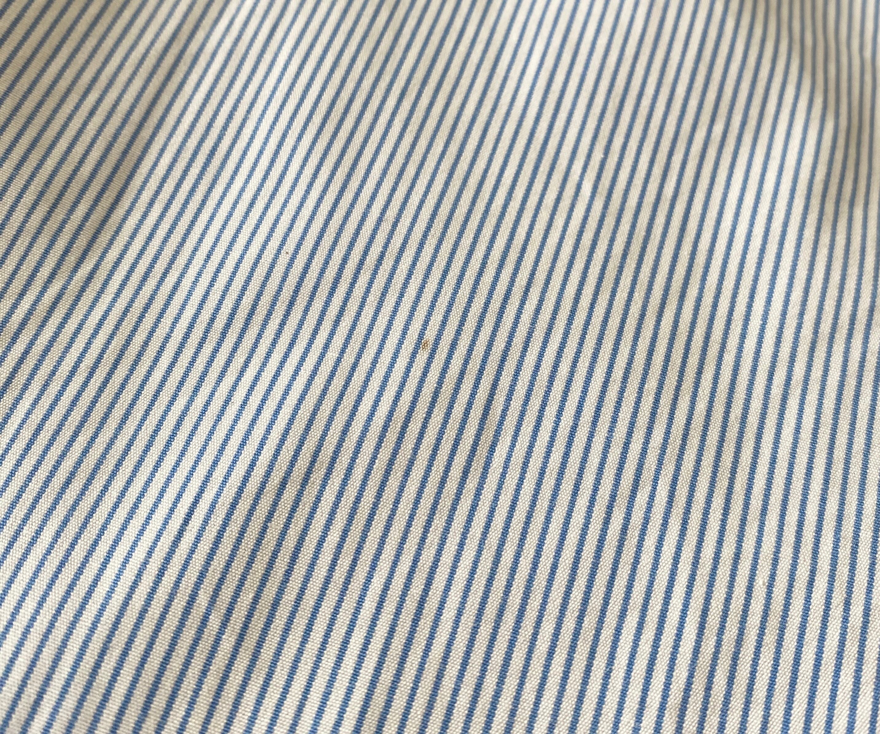上質なブロードクロスに上品なホワイト×サックスブルーのストライプ、プリミティブなホーンの削り出しボタン、ピッチの細かい丁寧な縫製、ベーシックで癖のないレギュラーシルエットが非常に格好良い一着。