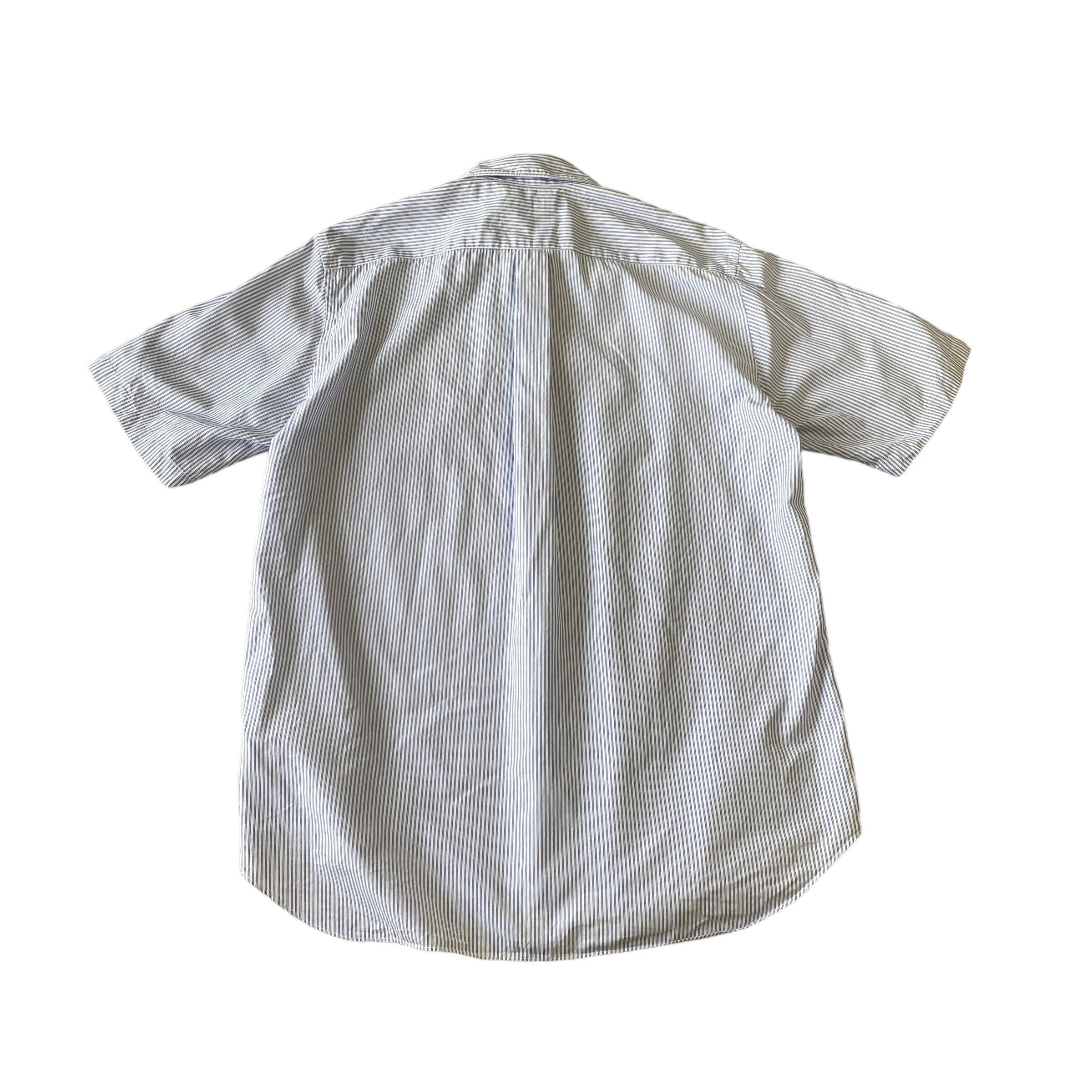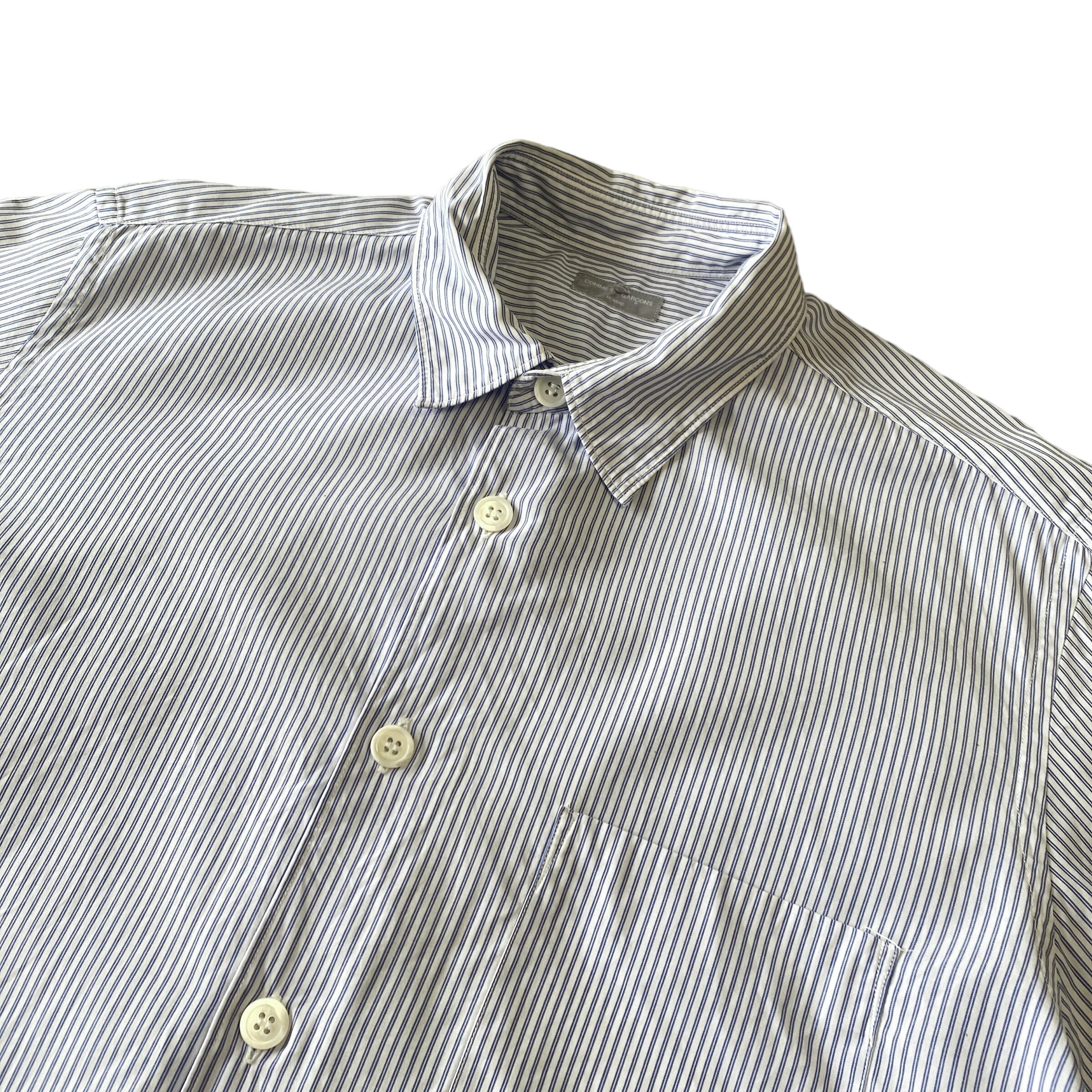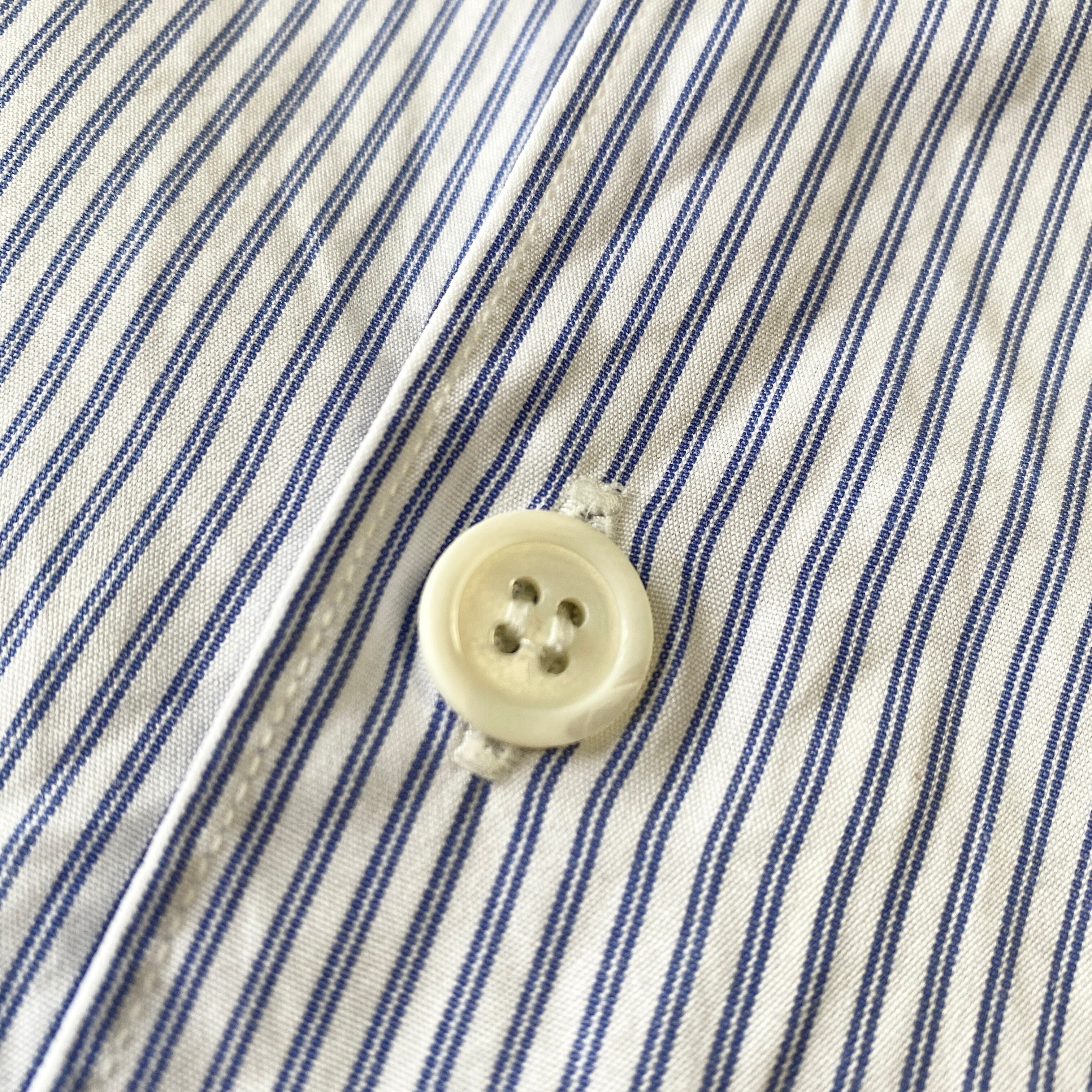 上質なブロードクロスに上品なホワイト×ブルーのストライプ、大きめのシェルボタン、ピッチの細かい丁寧な縫製、shirt foreverのワイドのシルエットに近いようなゆとたりとしたシルエットが非常に格好良い一着。