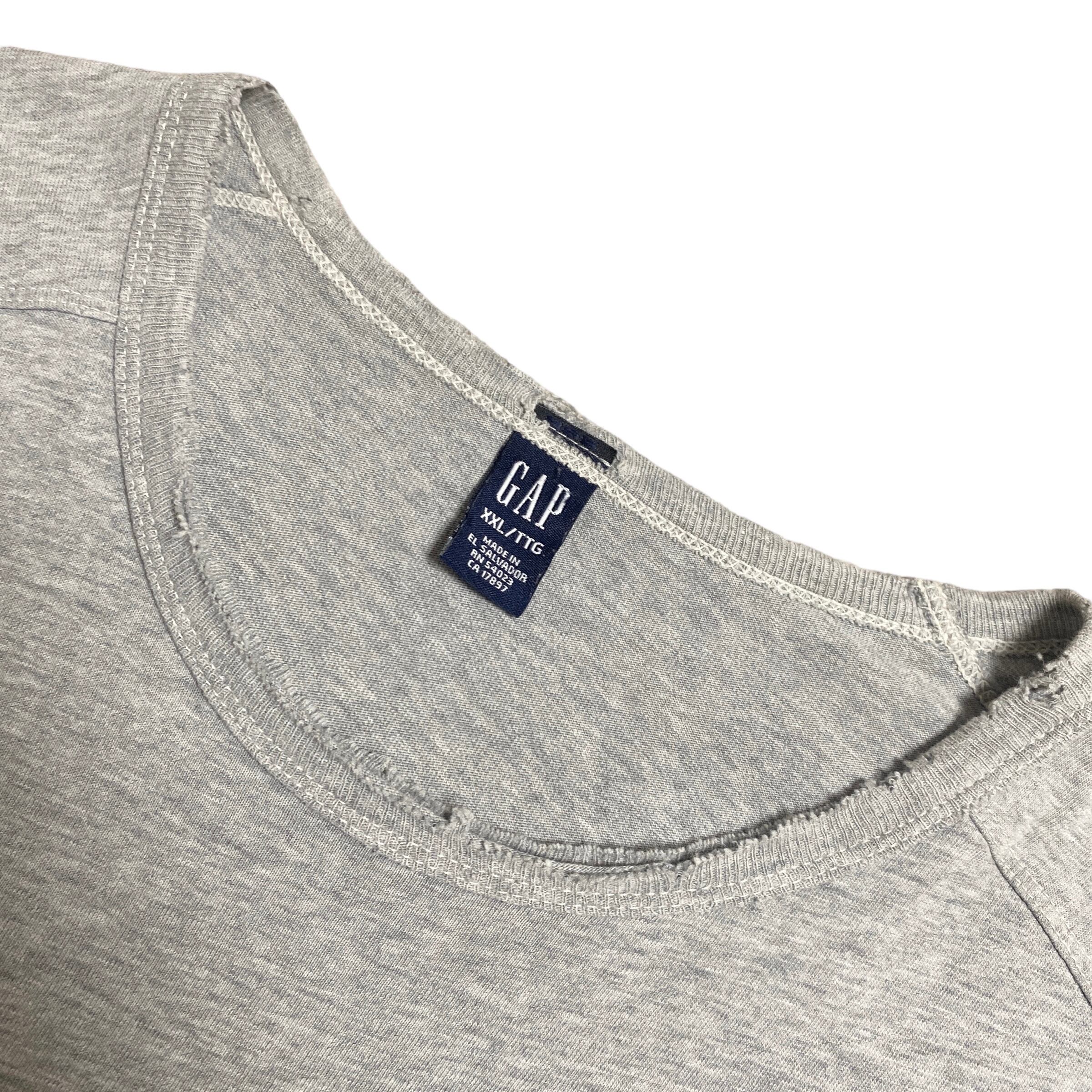 短丈ボックスめなシルエットに、細めのリブ、加工したかのようなダメージ具合が最高です。