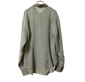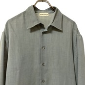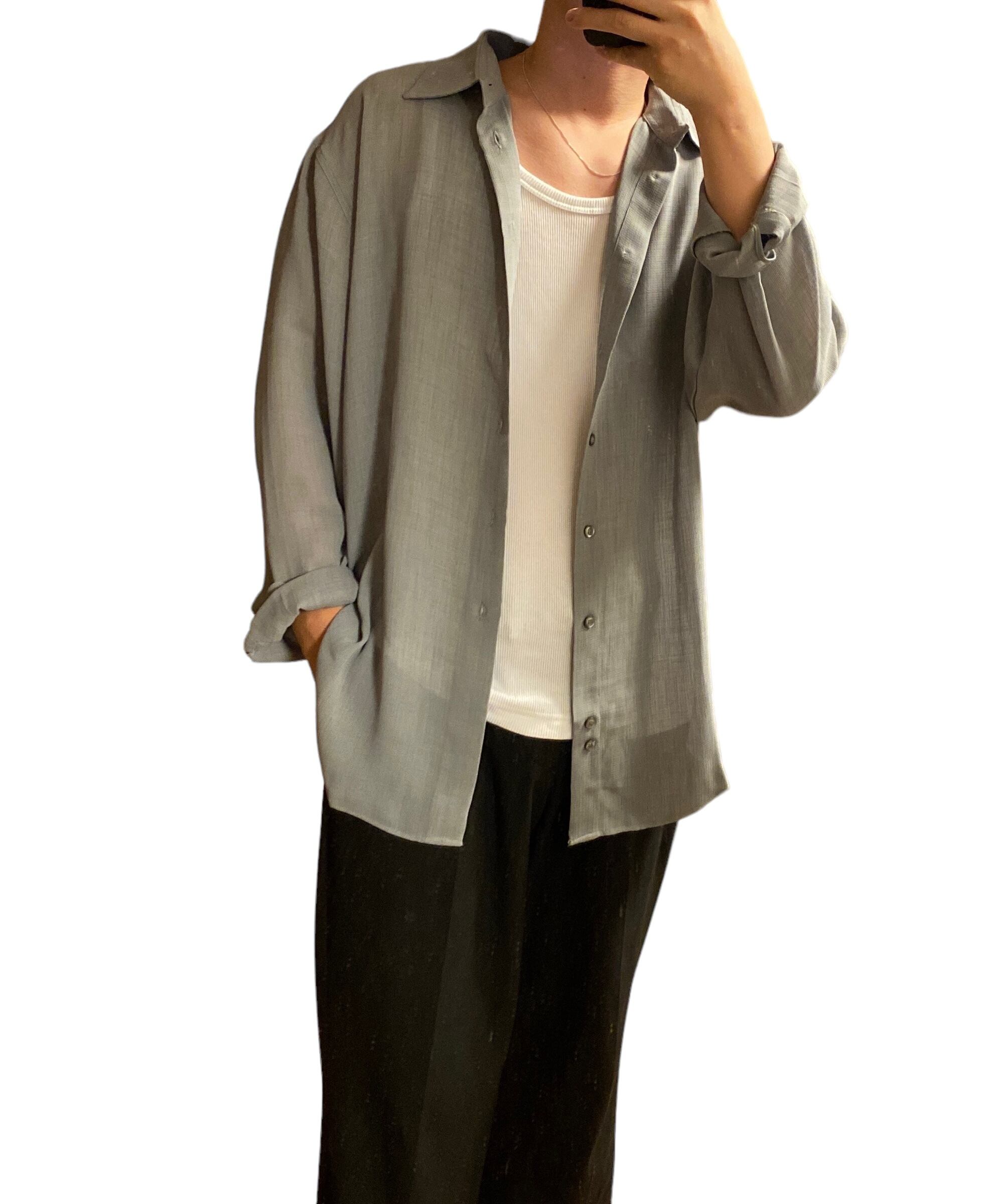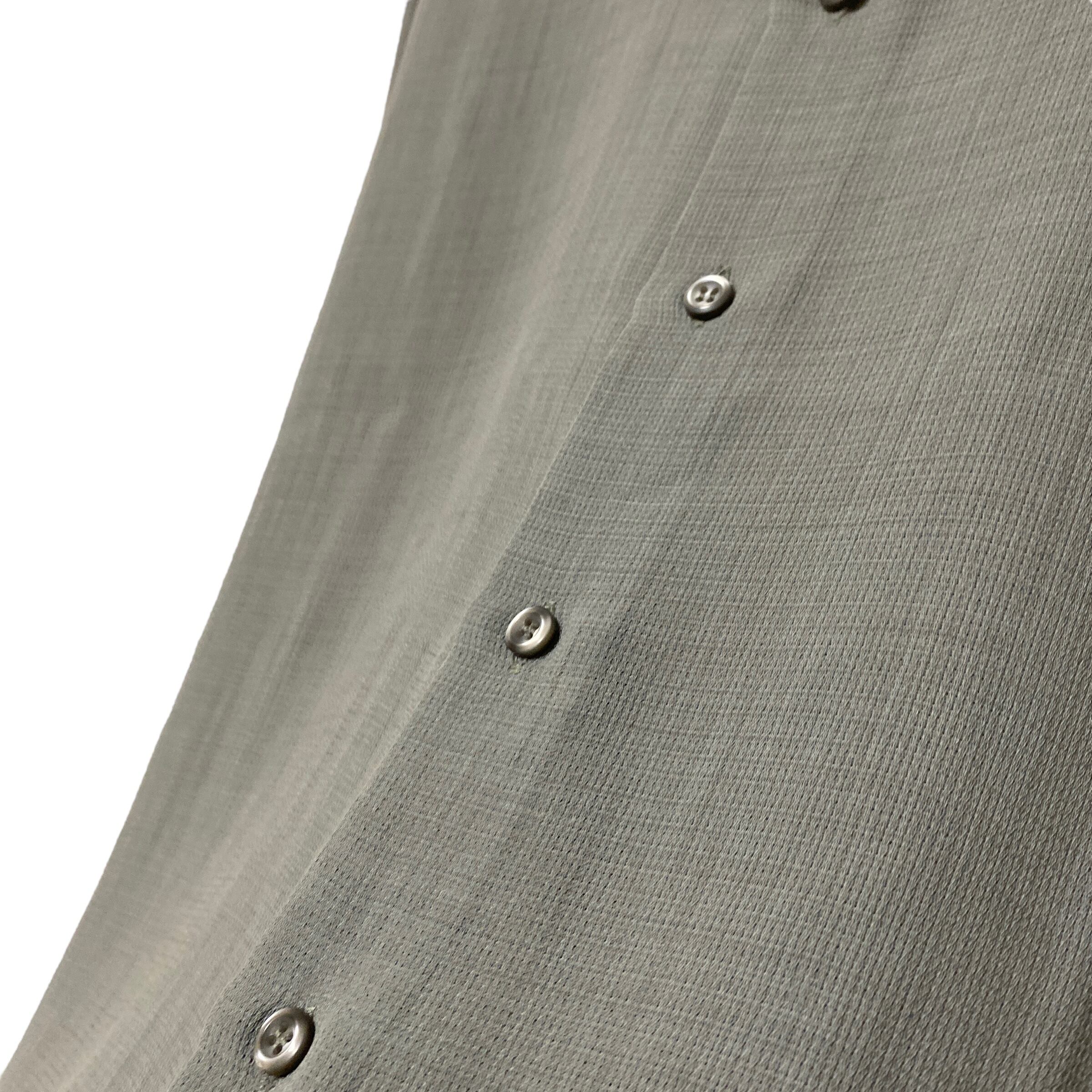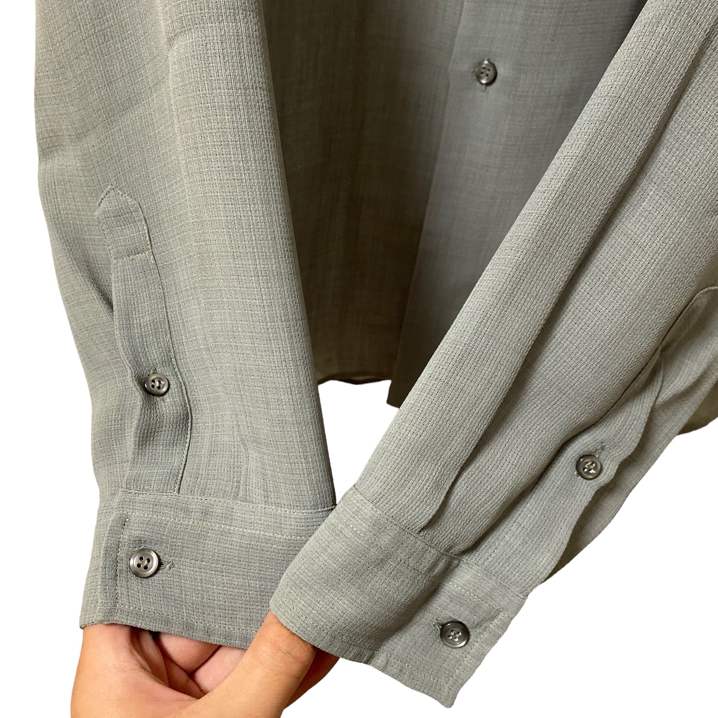 シャリ感のあるポリエステルシアー素材に、くすんだグレーグリーン系のニュアンスカラーが非常に格好良い一着。