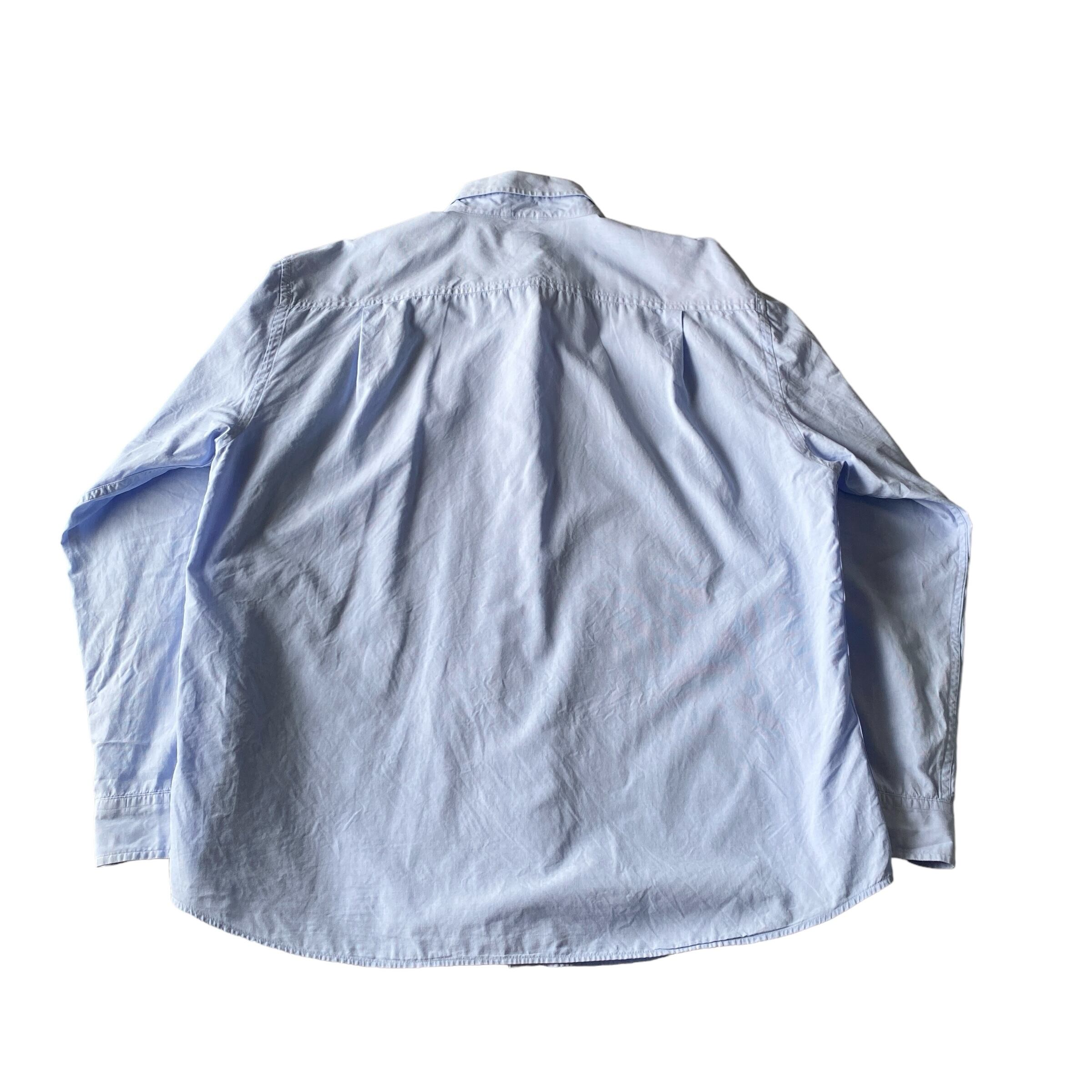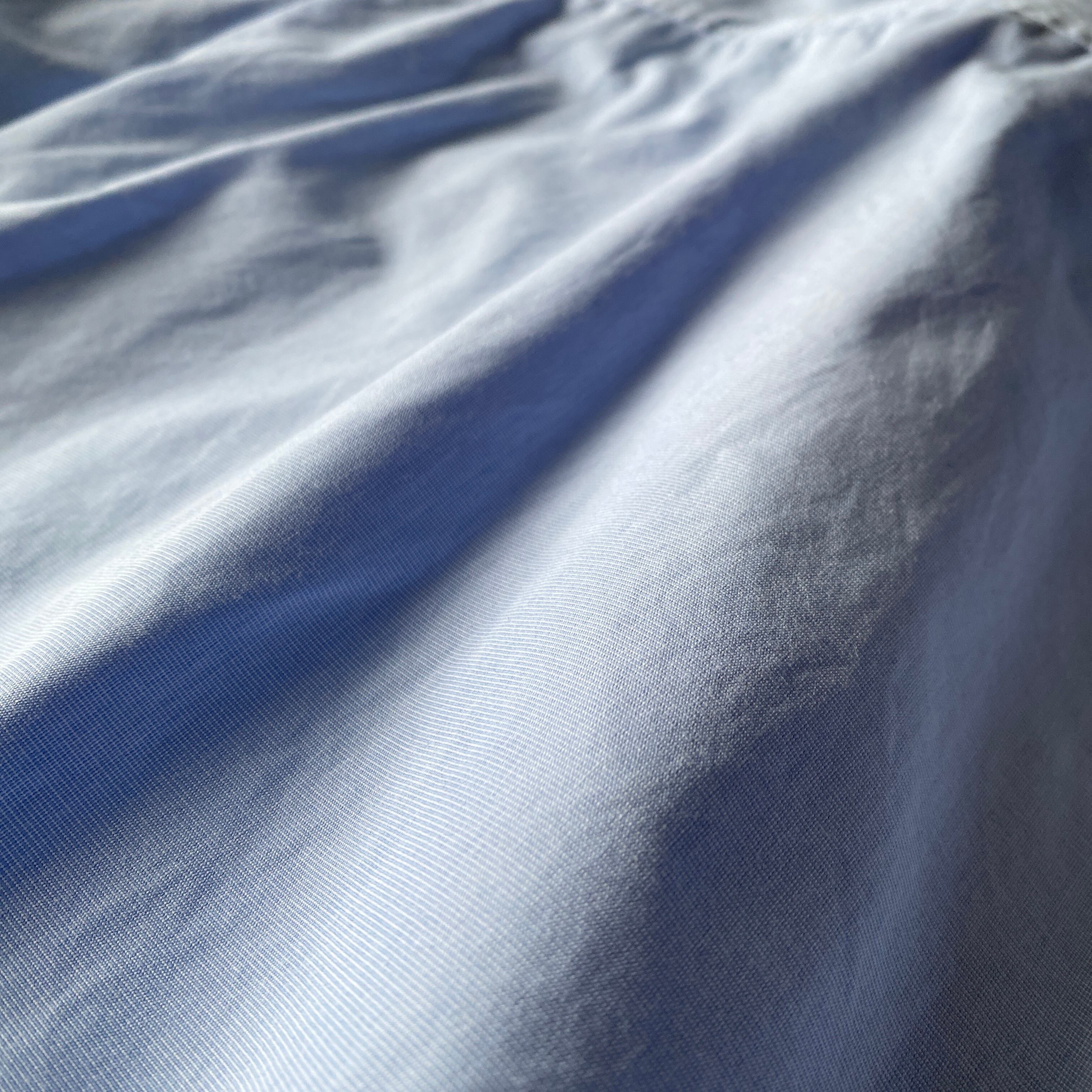 目の詰まったブロード生地に、上品なサックスブルーカラー、着丈短めのボックスシルエットが非常に格好良い一着。