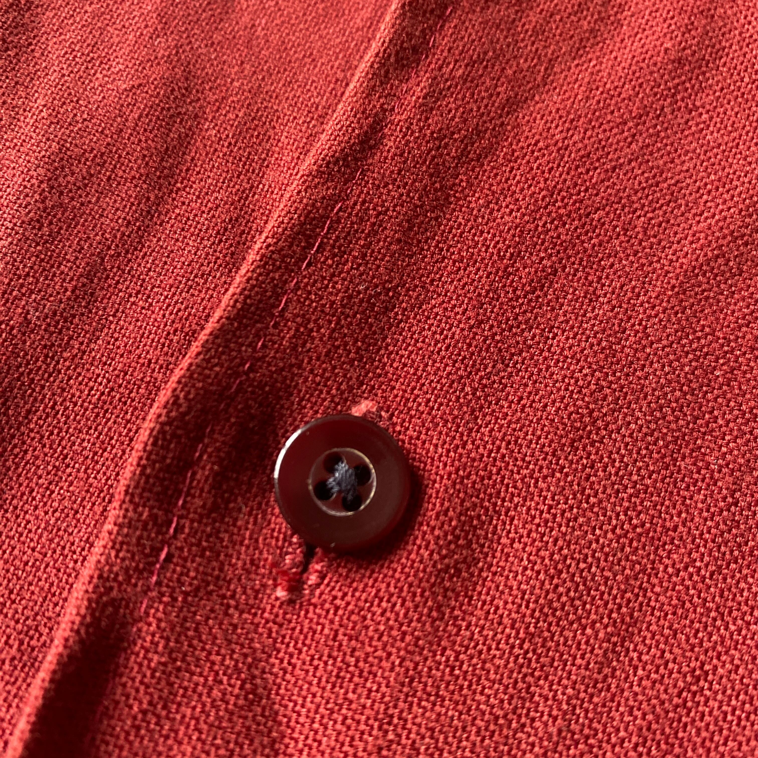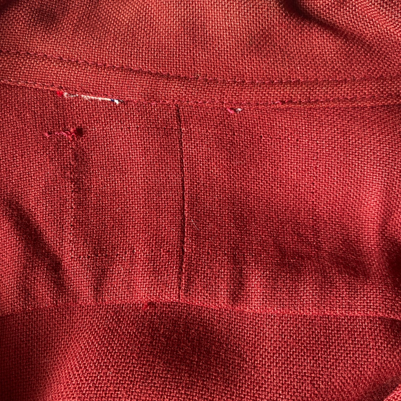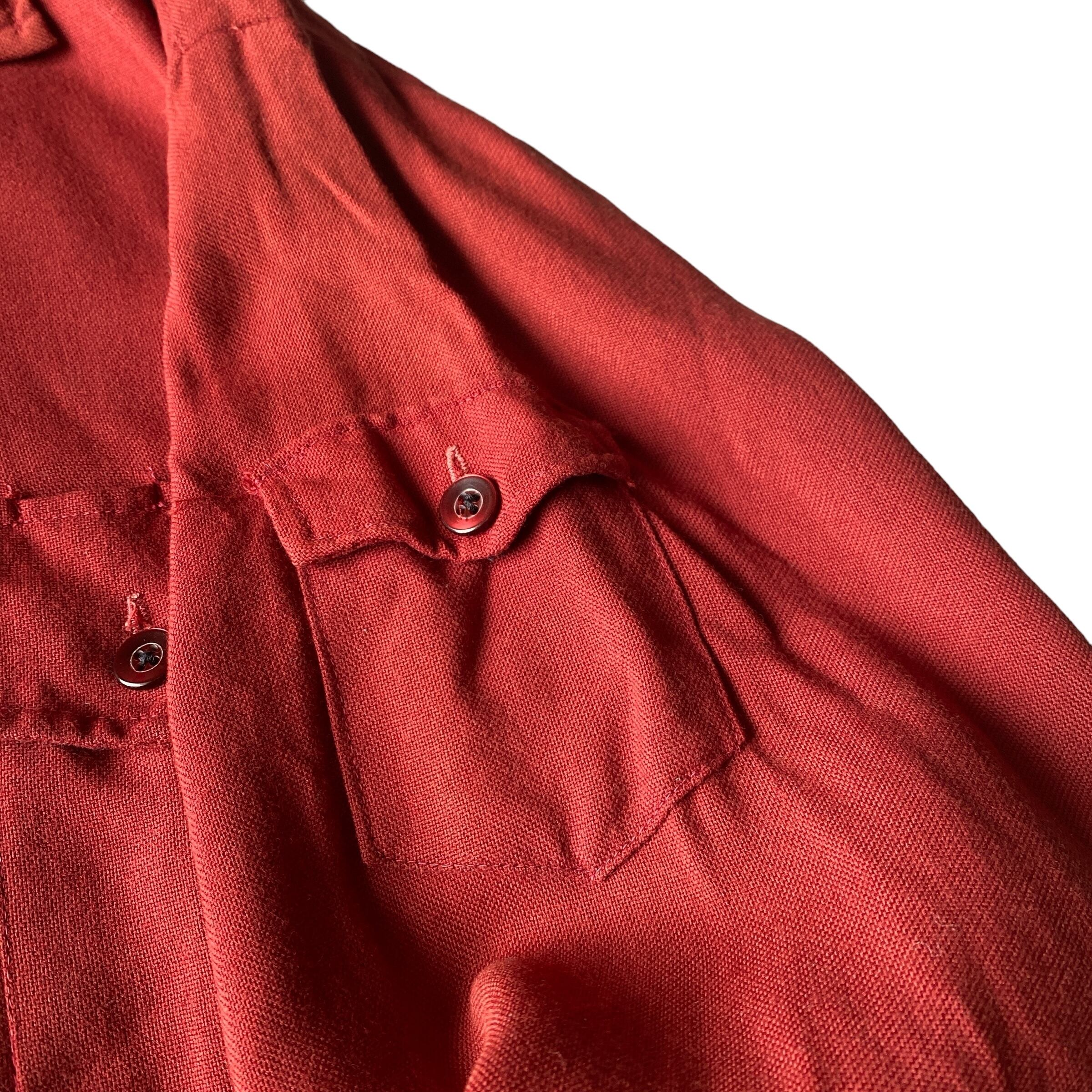 肉厚でとろみのあるややカサッとしたレーヨン生地(若干コットンがかんでいるかもしれません)に、ほんのりフェードし朱色がかった赤の色目が非常に格好良い一着。