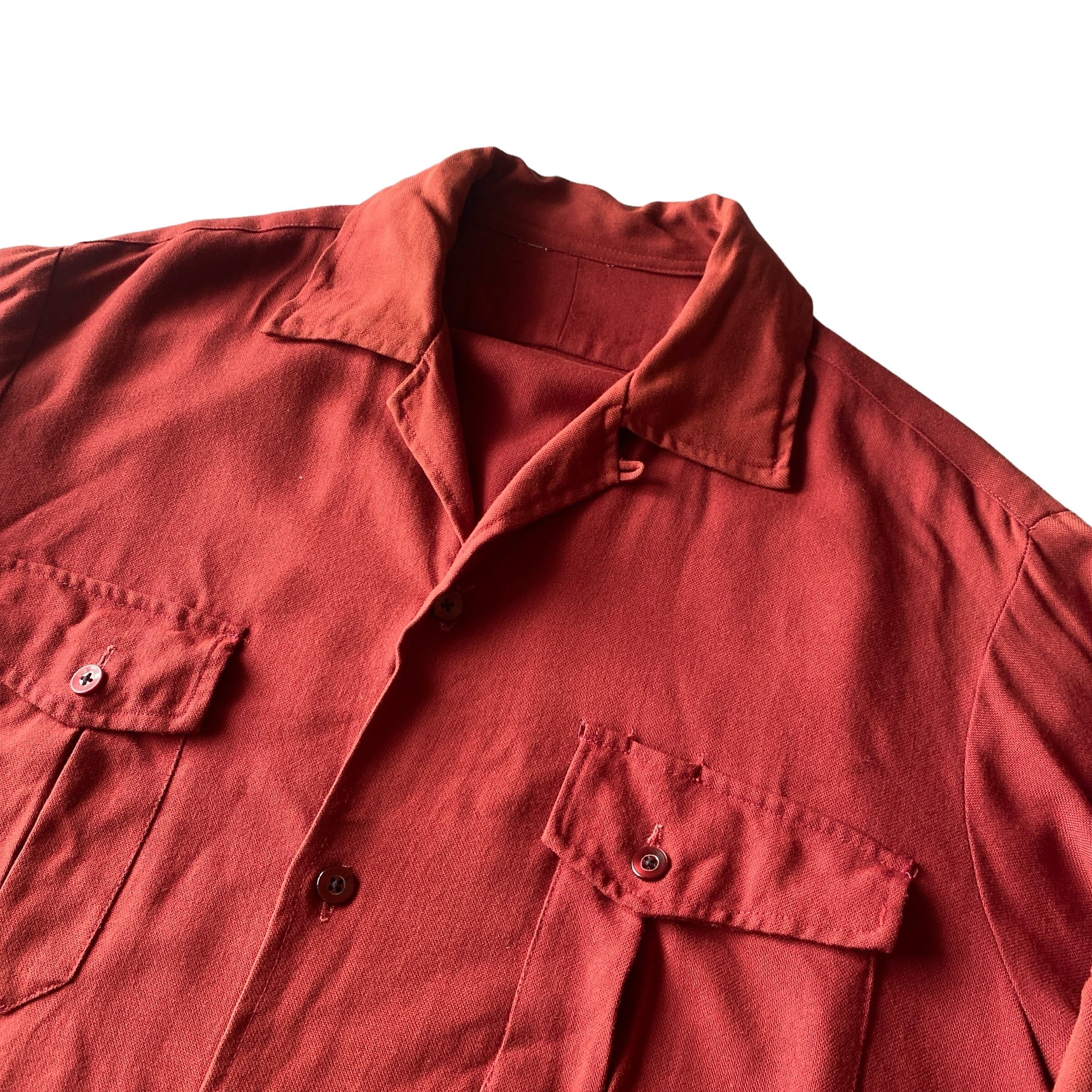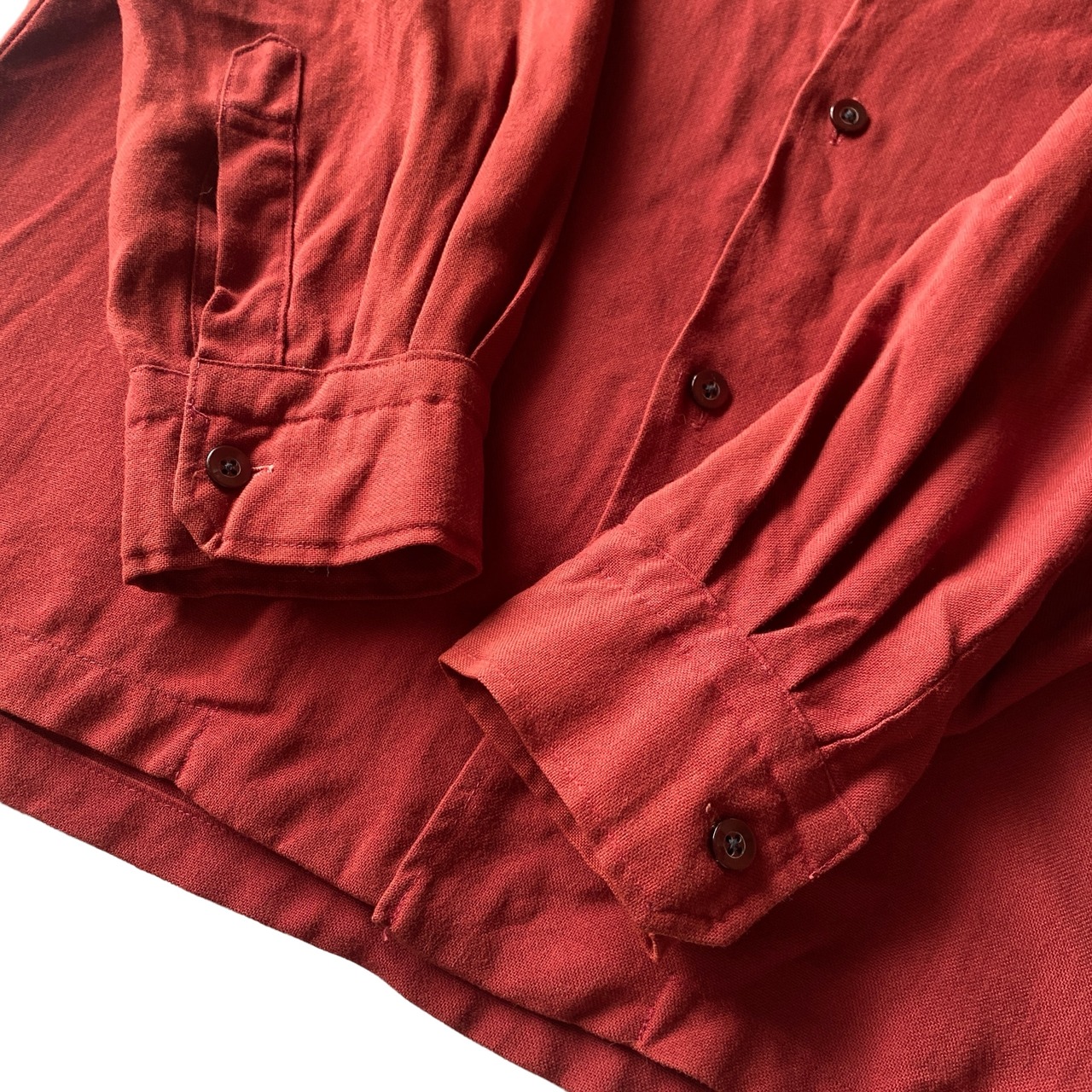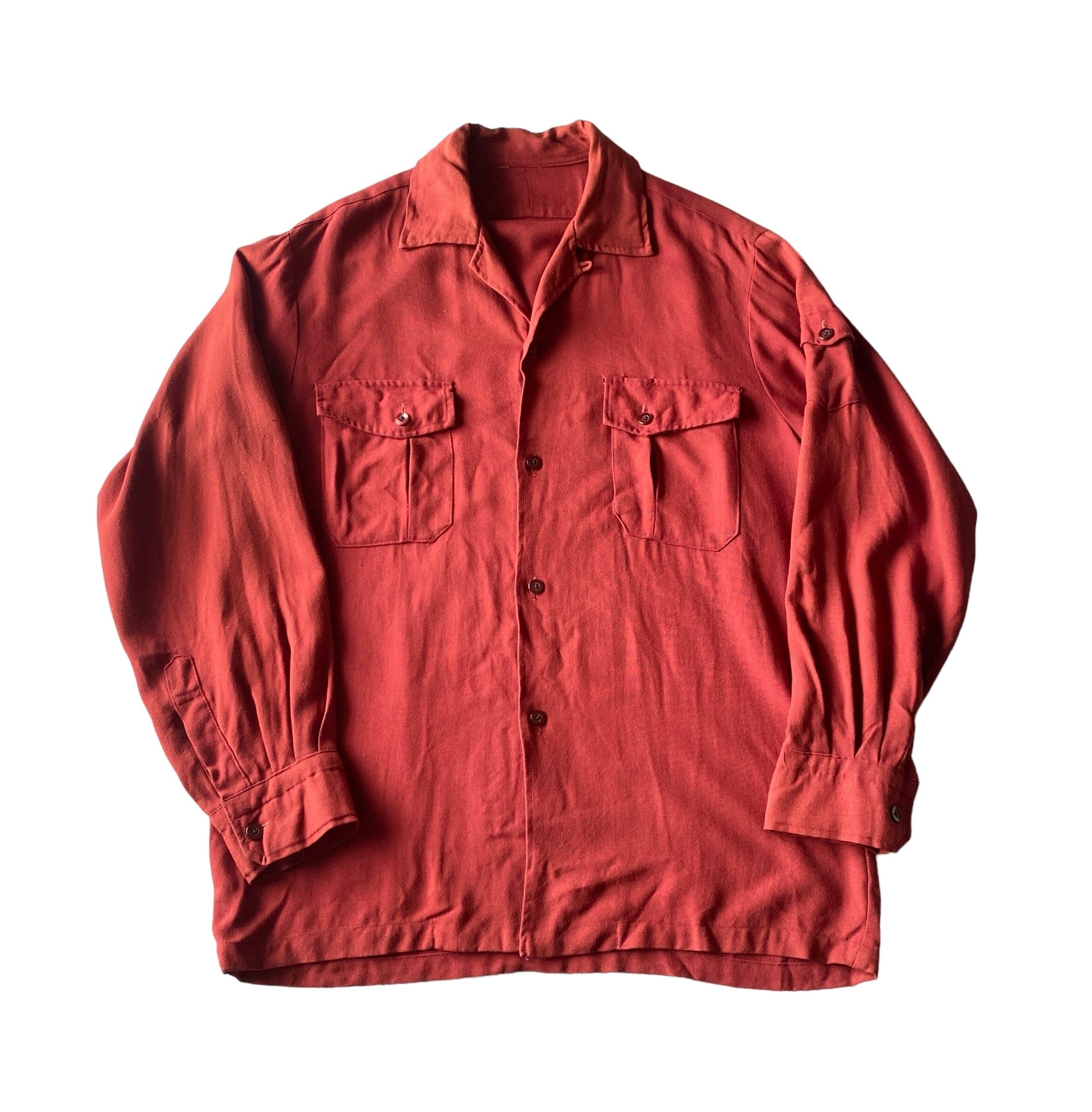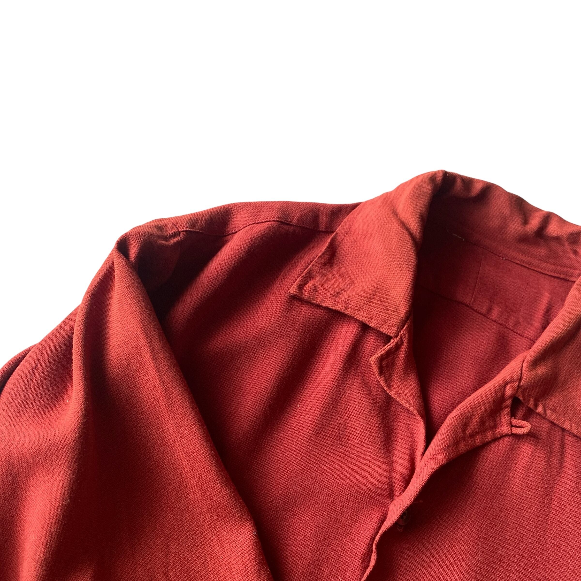 肉厚でとろみのあるややカサッとしたレーヨン生地(若干コットンがかんでいるかもしれません)に、ほんのりフェードし朱色がかった赤の色目が非常に格好良い一着。