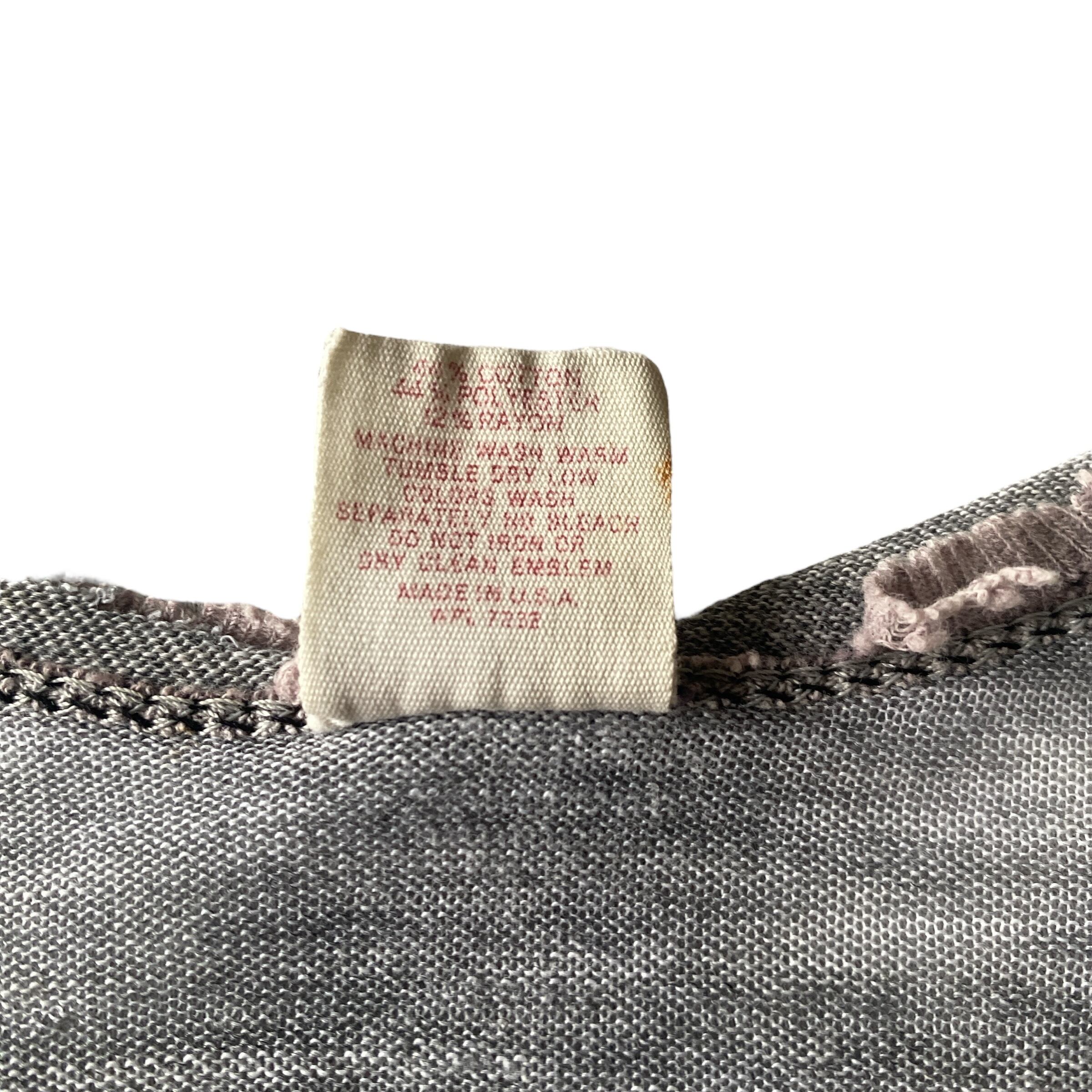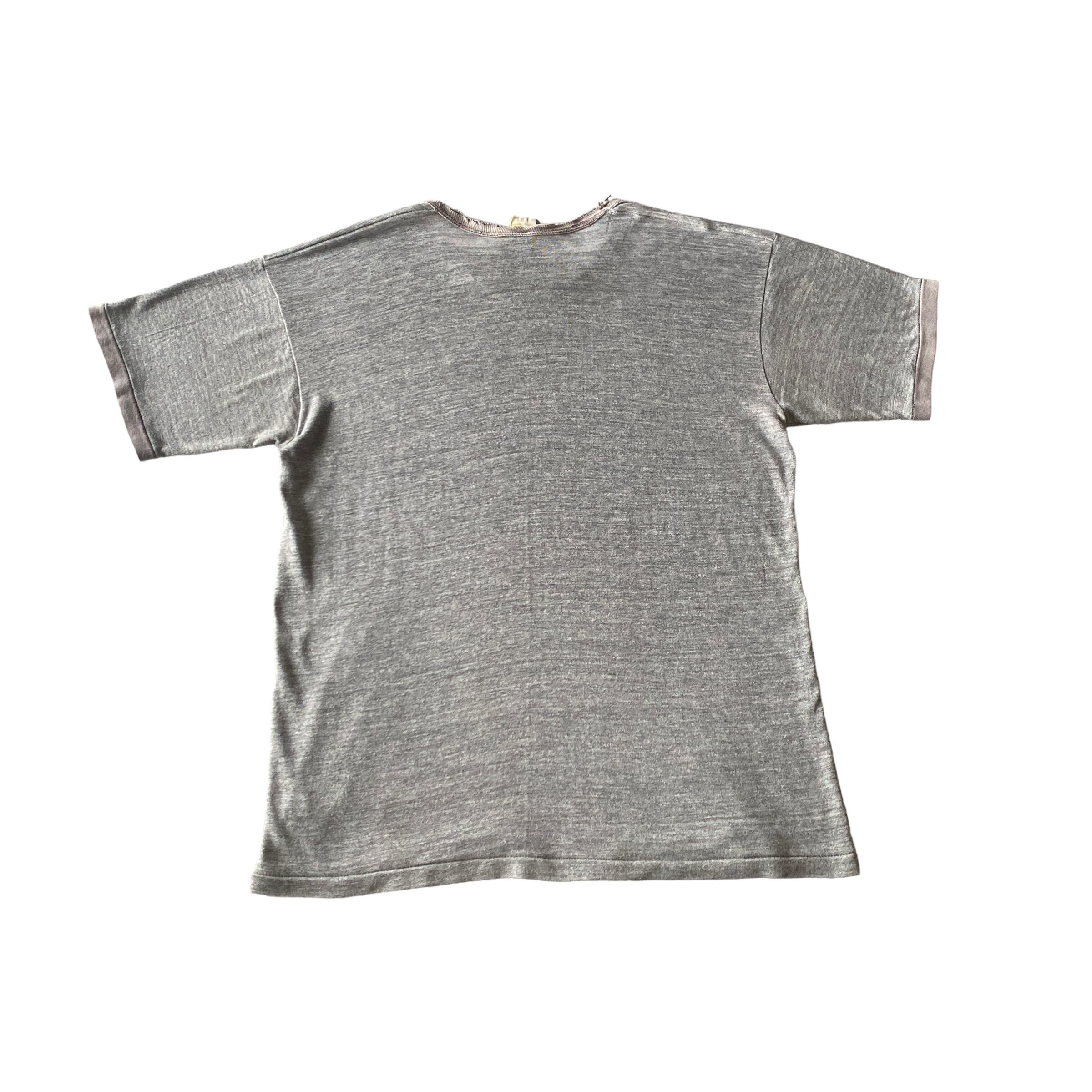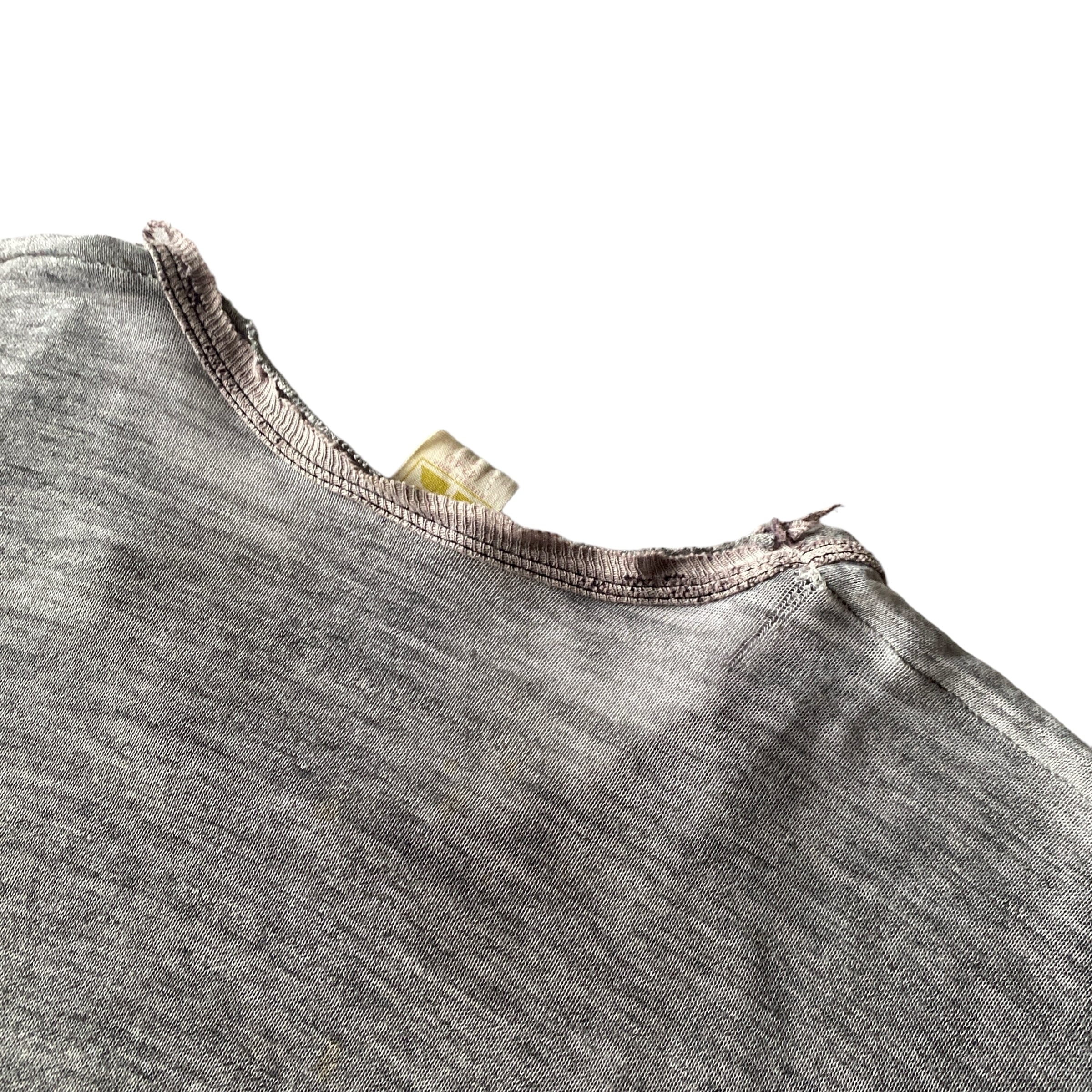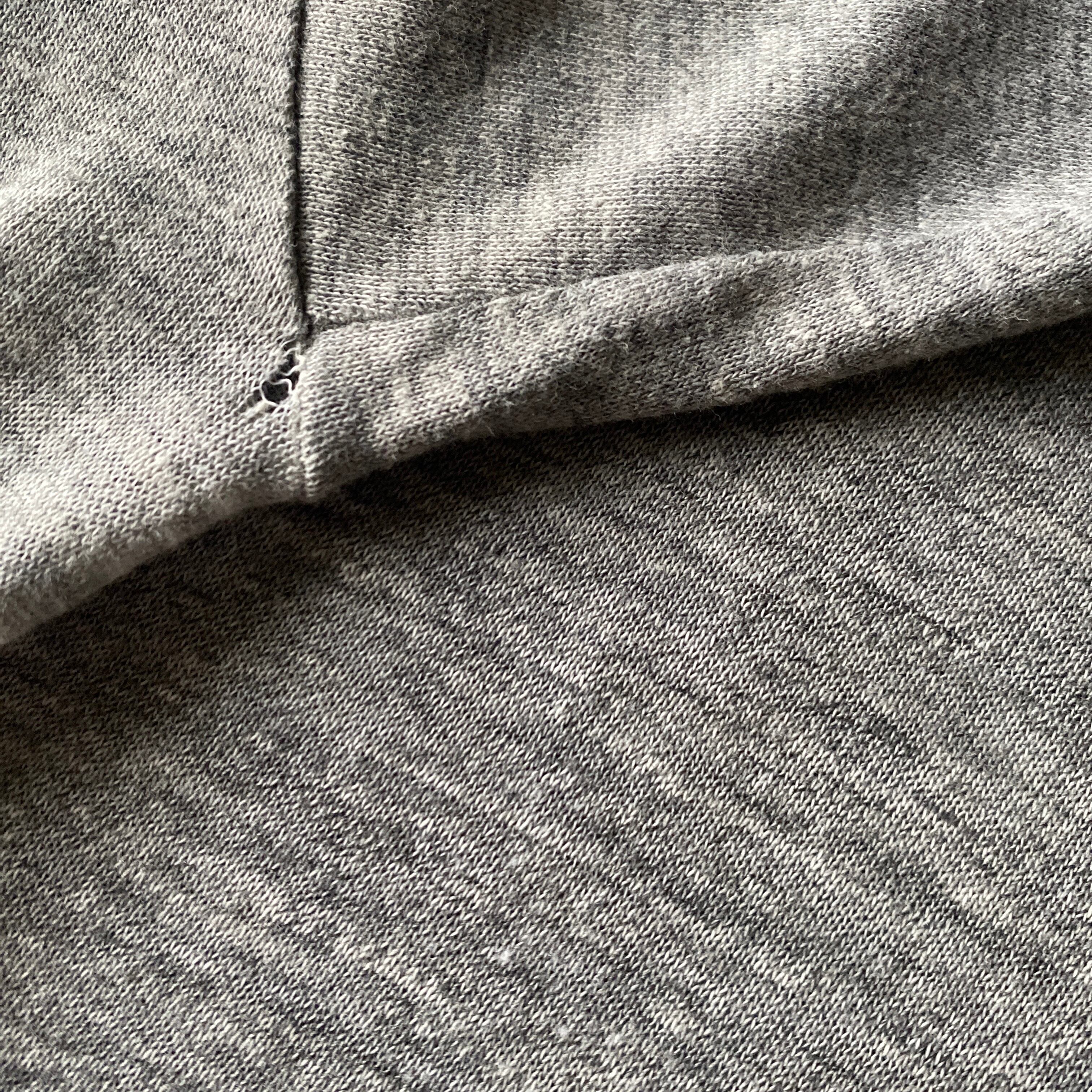 杢グレーのボディに、もはや元の色がわからないぐらいフェードしたパープル系のリブ、首周りを中心に入ったダメージ感が非常に格好良い一着。