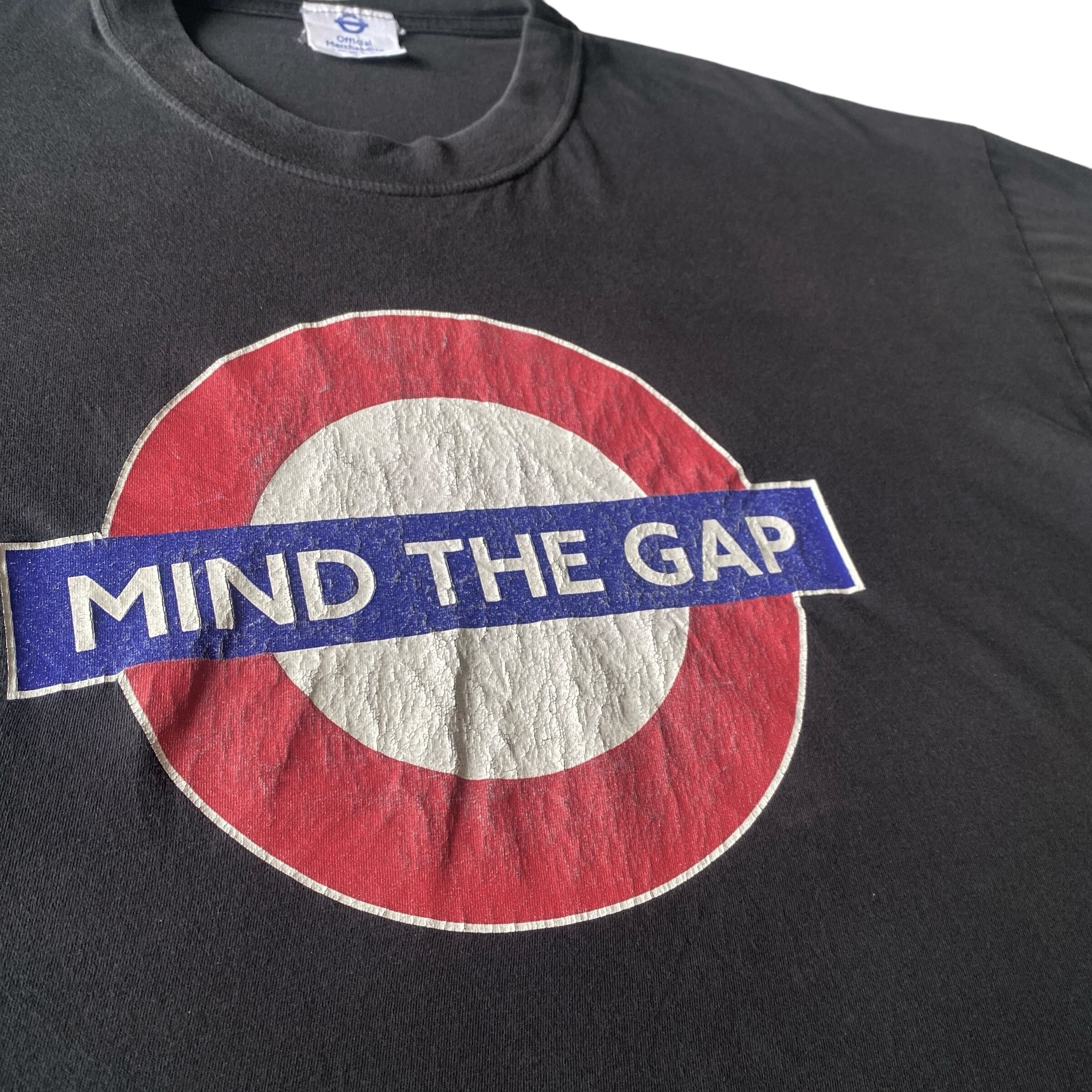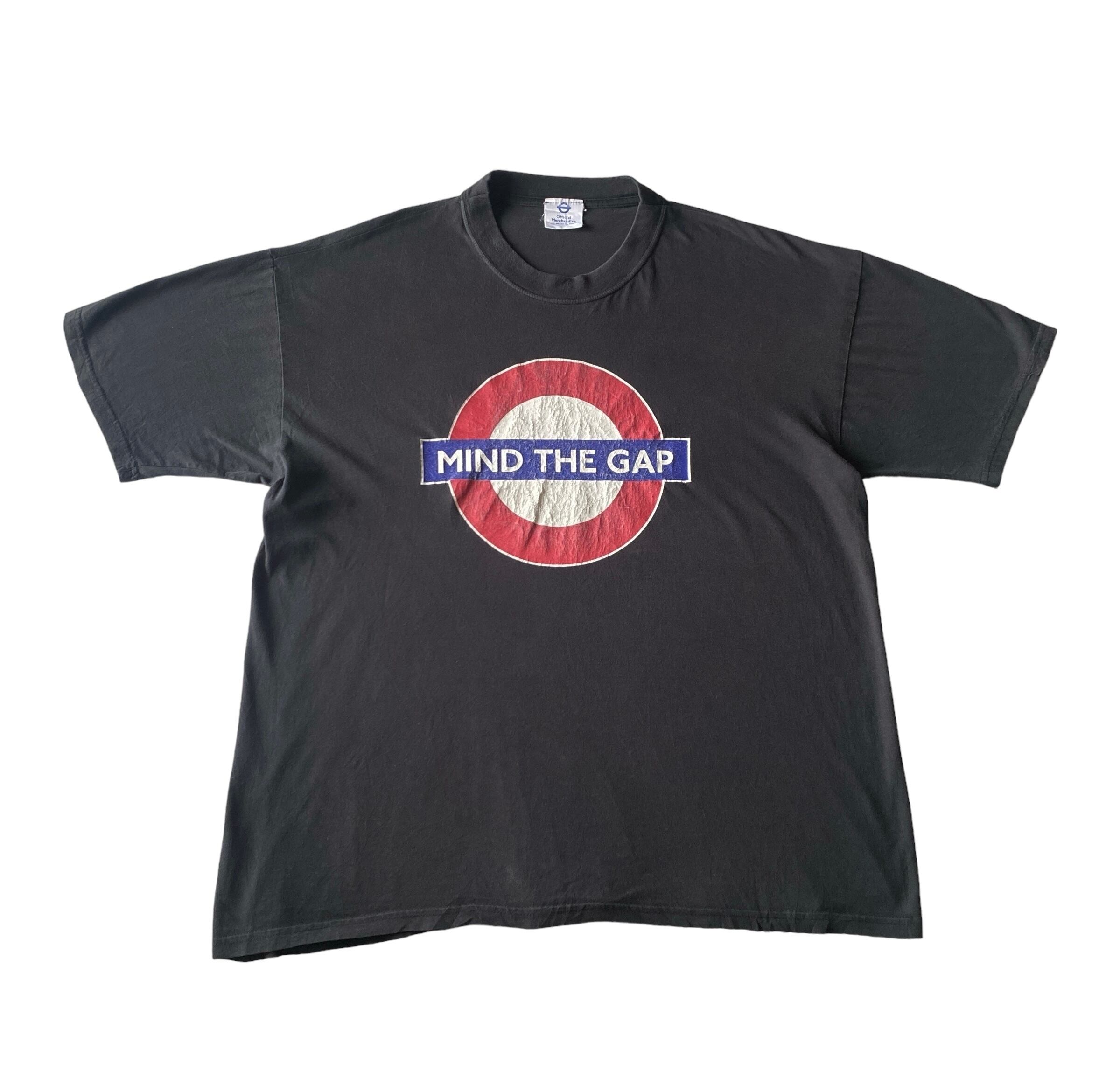 通常はLONDON UNDER GROUNDとかかれたロゴなのですが、実在するアナウンス「MIND THE GAP」(隙間に気をつけての意)に置き換えたセルフパロディがユニークな一着。